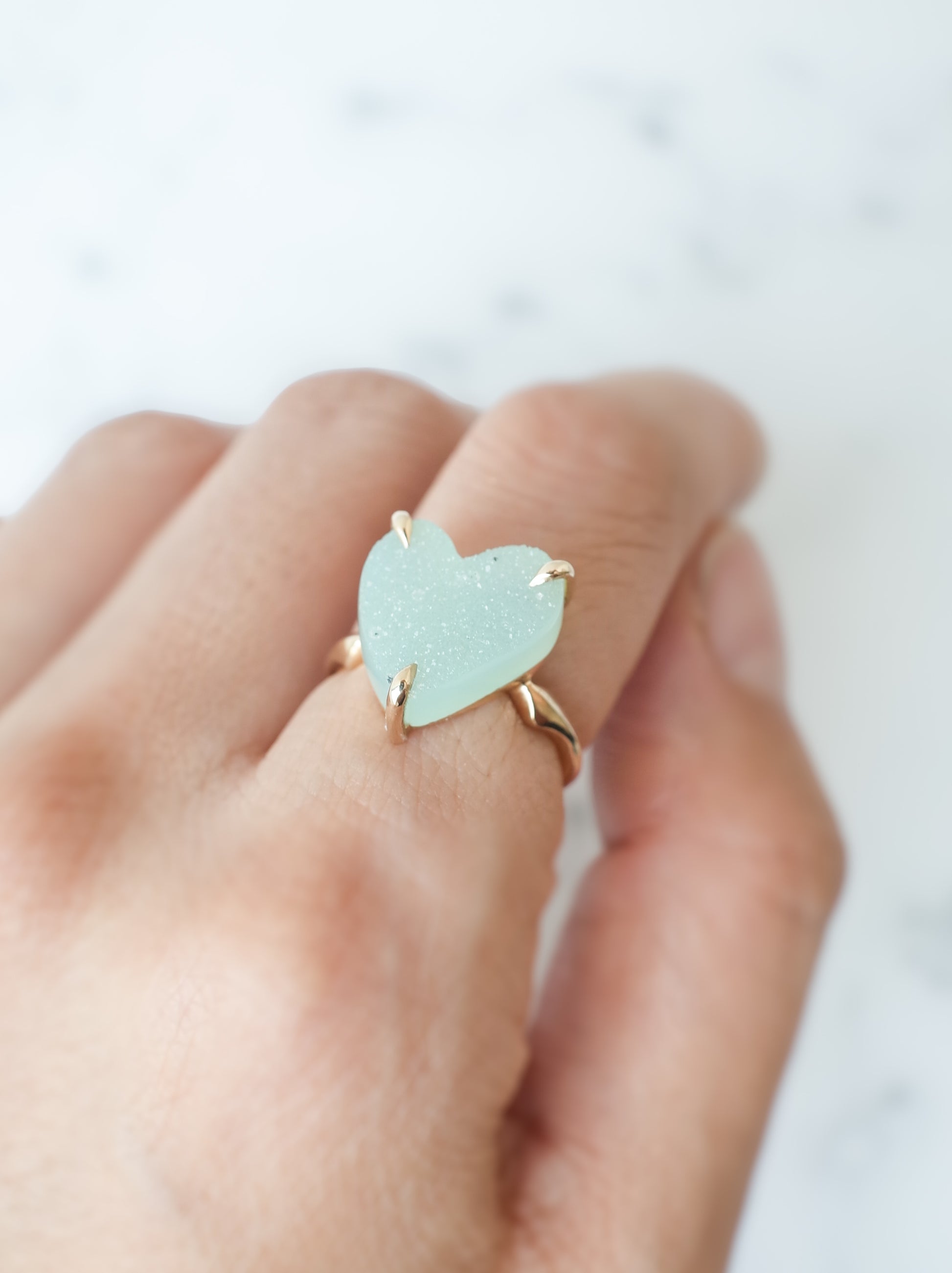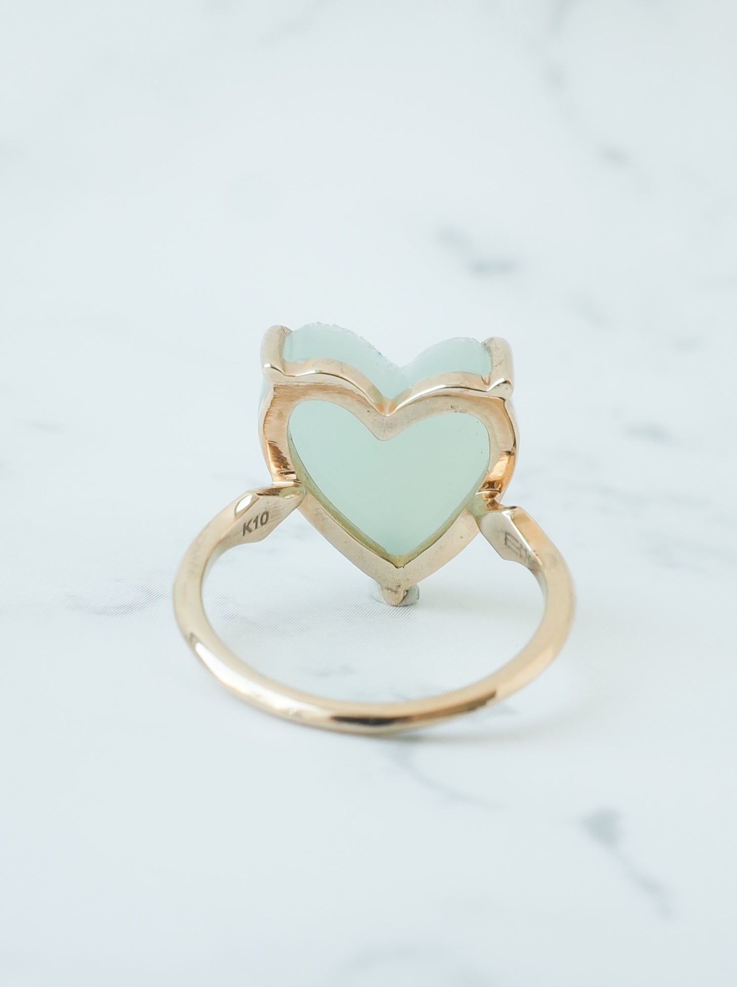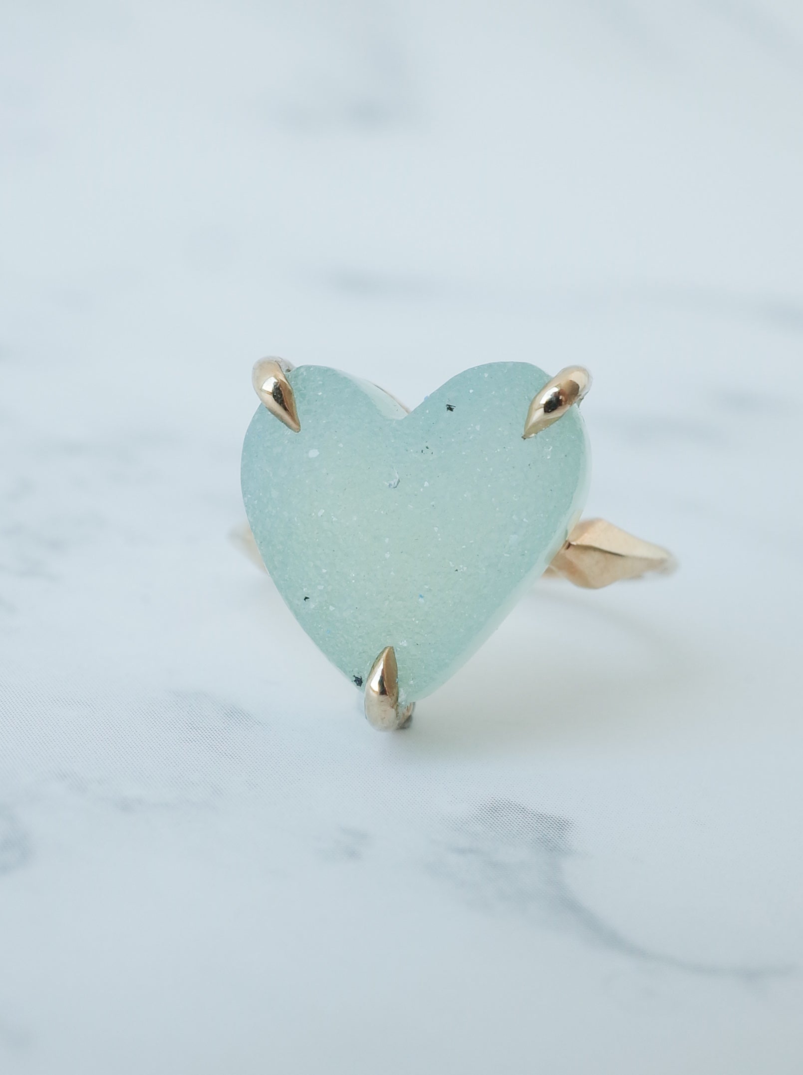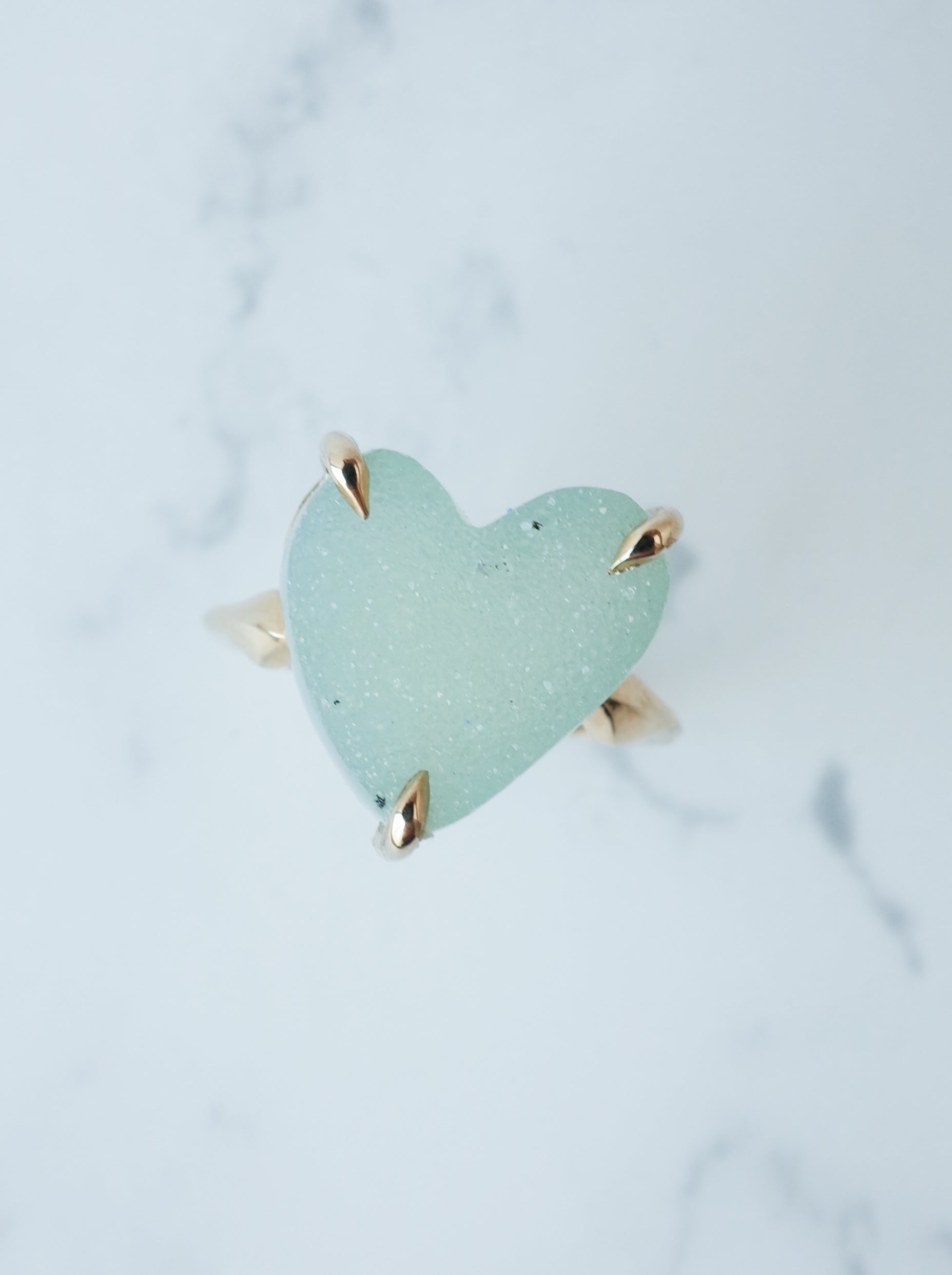 自然の "キラキラ" をそまま生かしてハート型にカットしたドゥルジーアゲート。石座もルースに合わせてハート型にくり抜かれていますので、裏側からみても可愛らしい一点です。