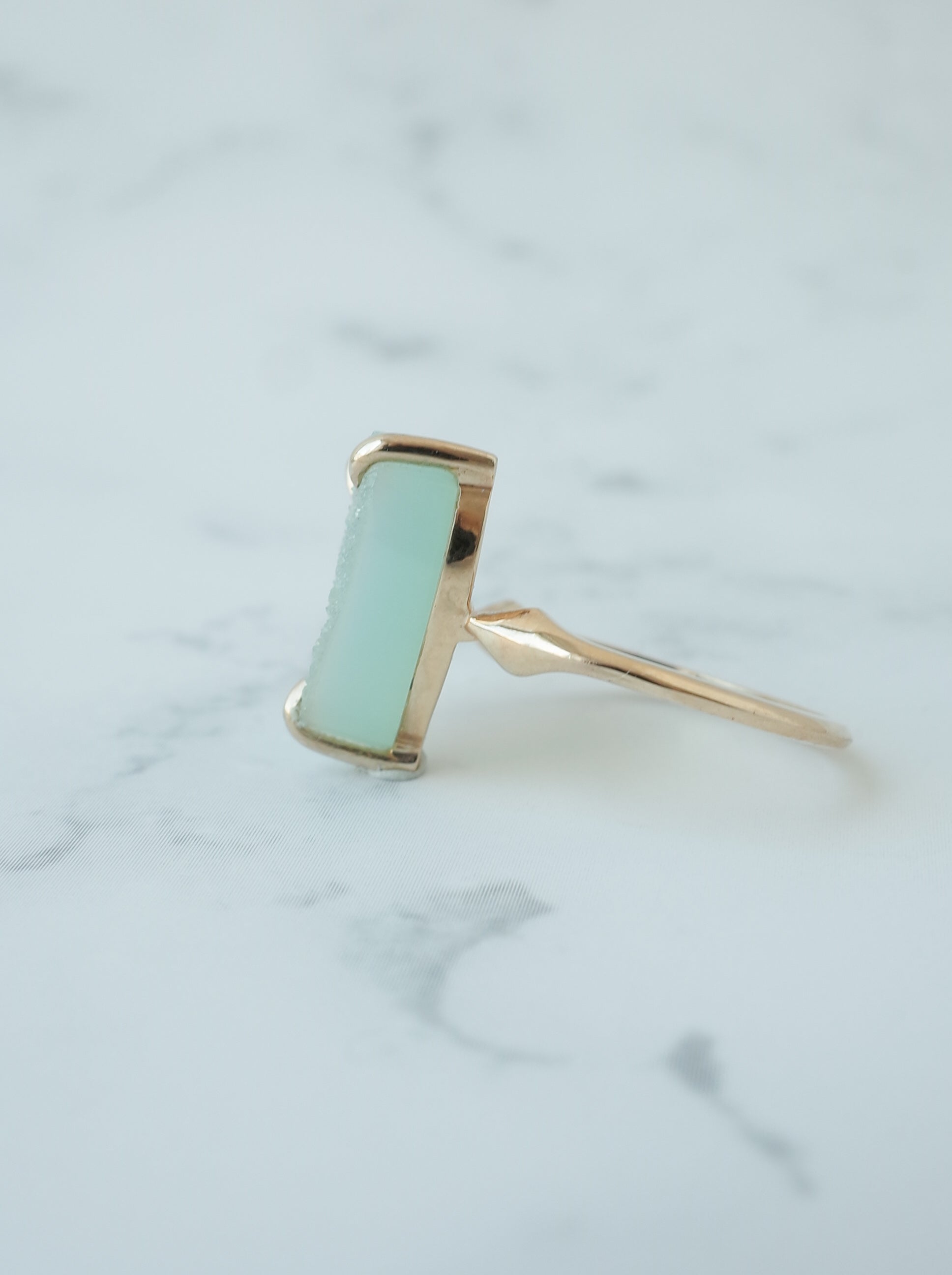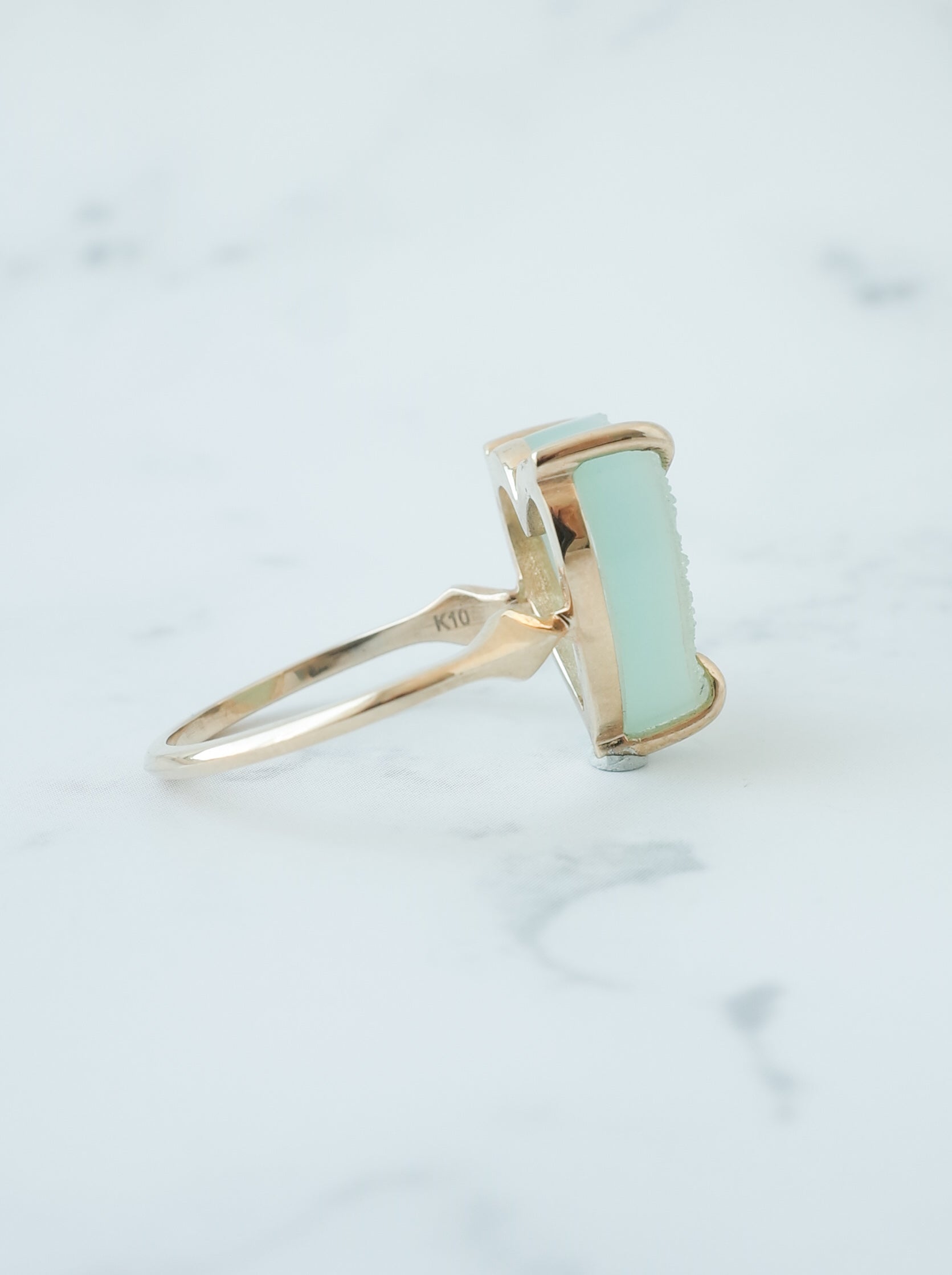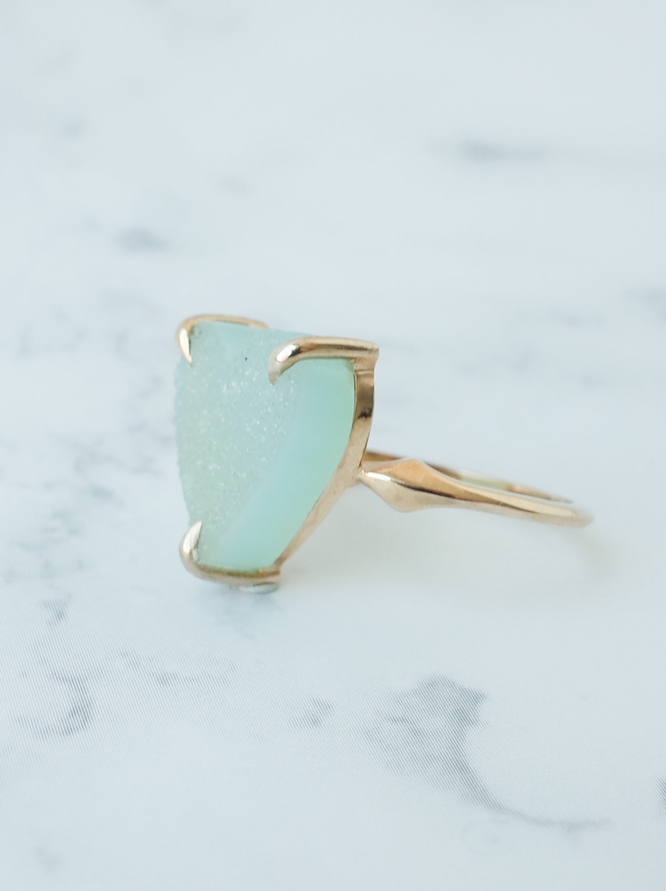 ドゥルジーとはキラキラとした細かい石英がアゲートやクォーツの表面に集まった天然石の総称。原石の状態ではジオード (晶洞) と、そのキラキラとした部分をドゥルジーと呼びます。かつては不要な部分として捨てられたいましたが、近年はその魅力が再認識されファッションジュエリーとして人気があります。