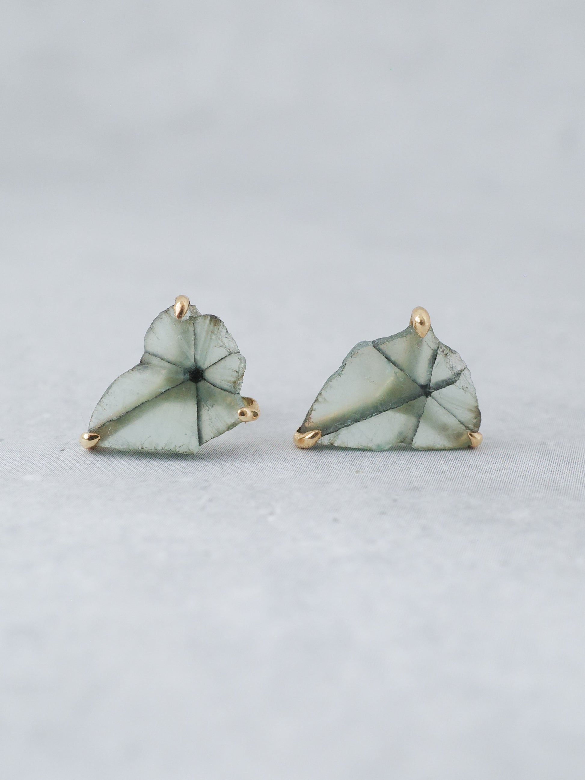 6状の放射模様が個性的な「トラピッチェエメラルド」の美しさをそのまま活かしたスタッドピアス。石そのもののナチュラルな風合いを、是非お楽しみください。