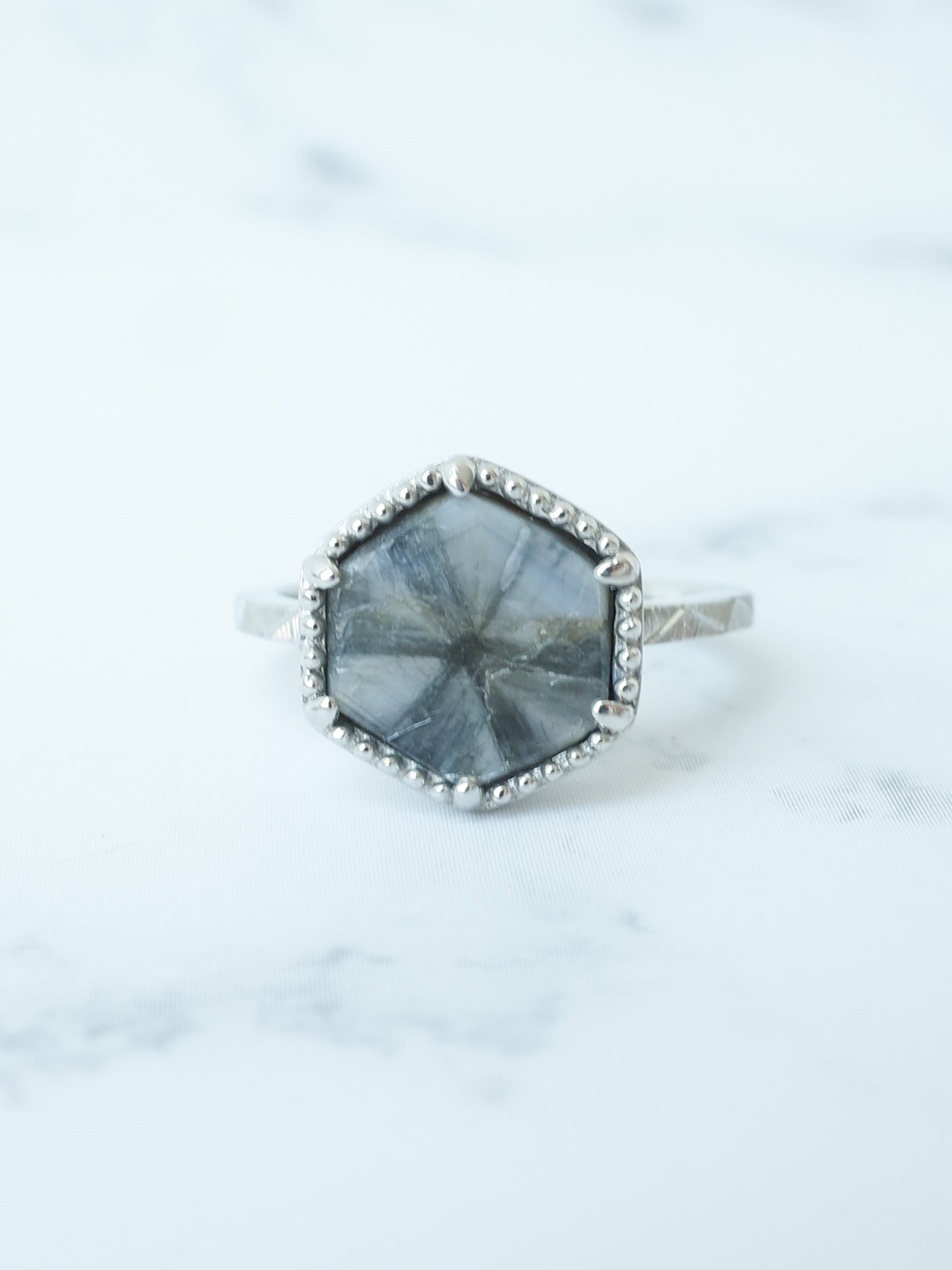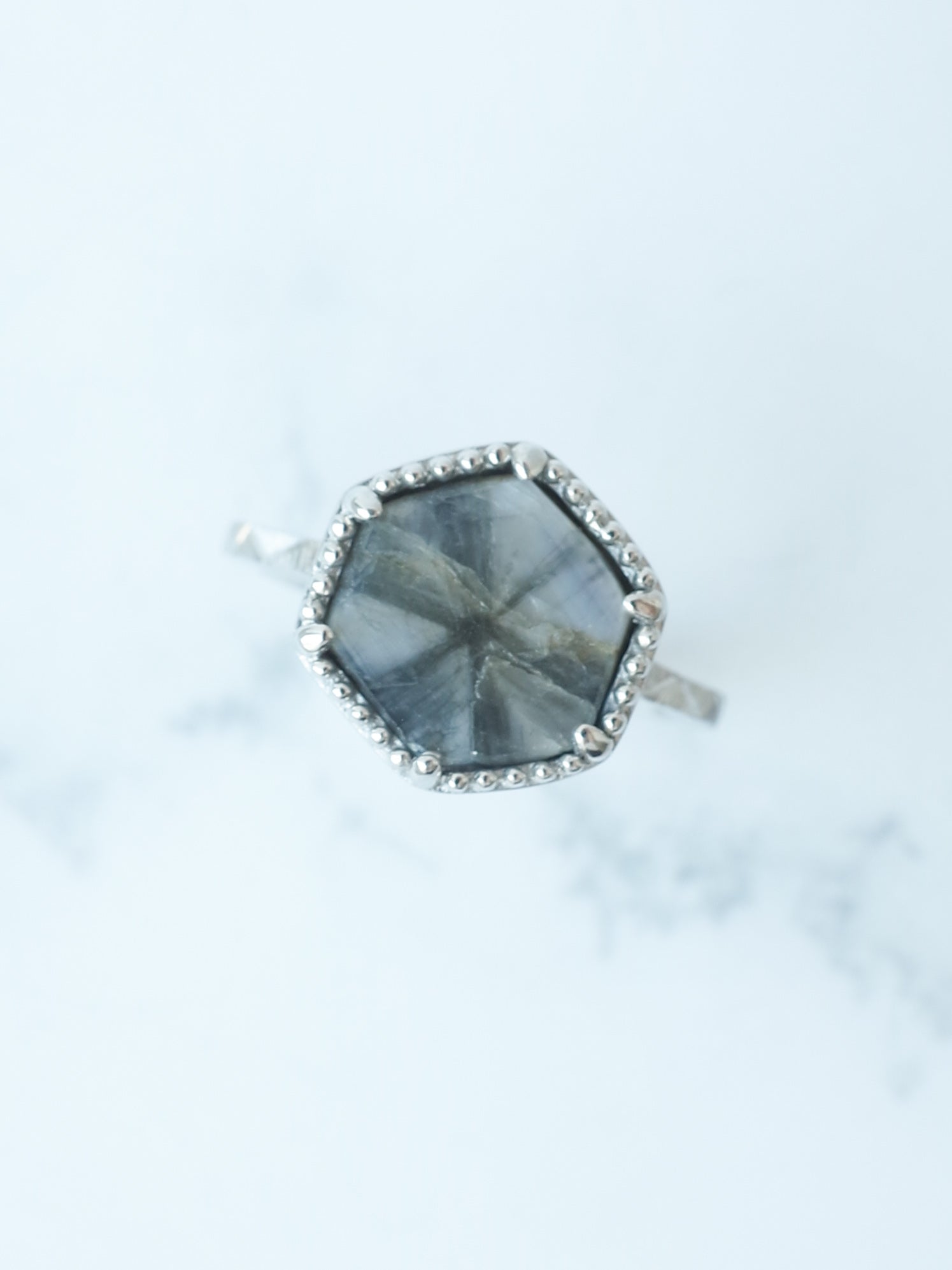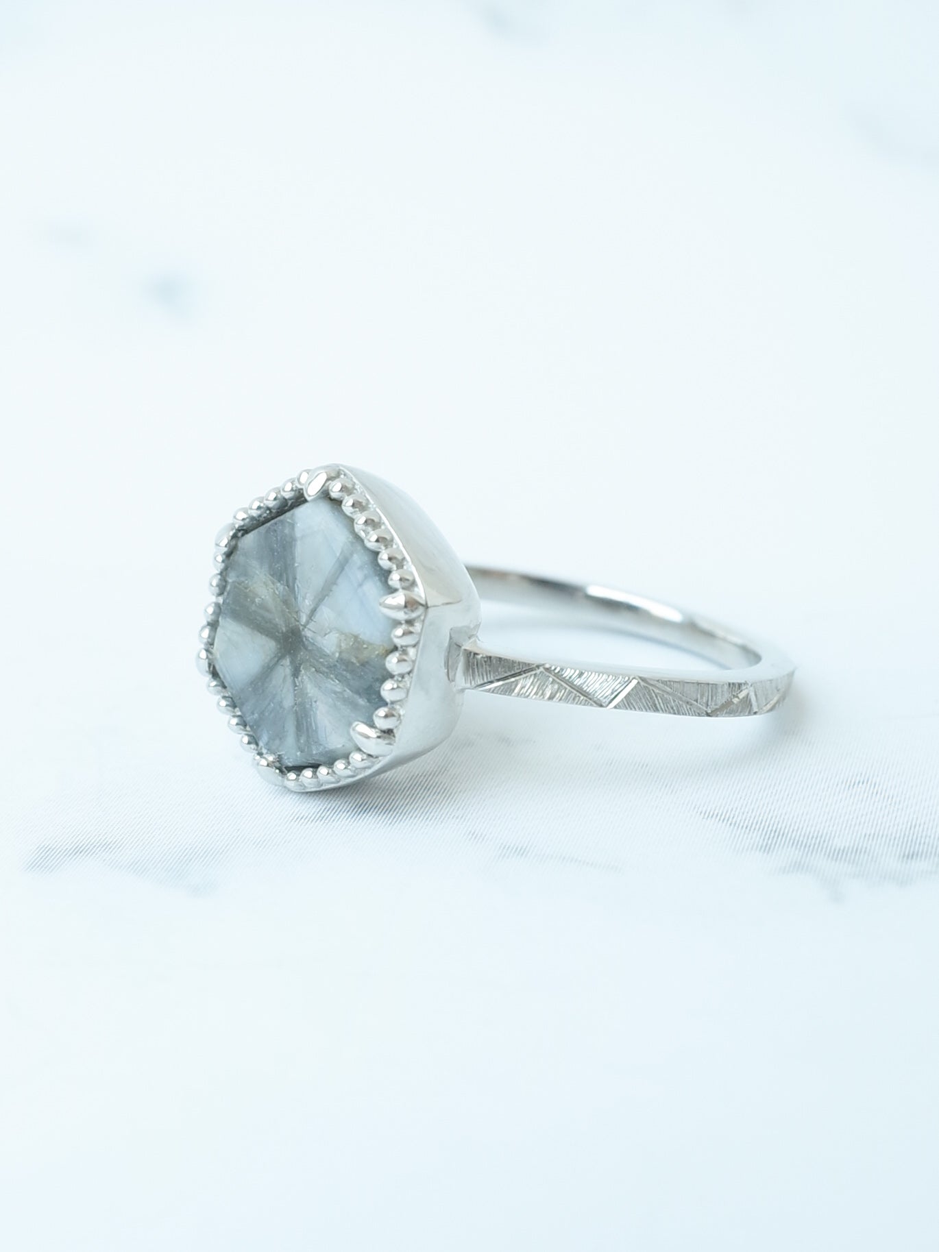 放射状に6条の星のような模様が見られる通称 ”トラピッチェサファイア” を使ったスペシャルな一点。コレクターが一つは持っていたい希少性の高い宝石です。