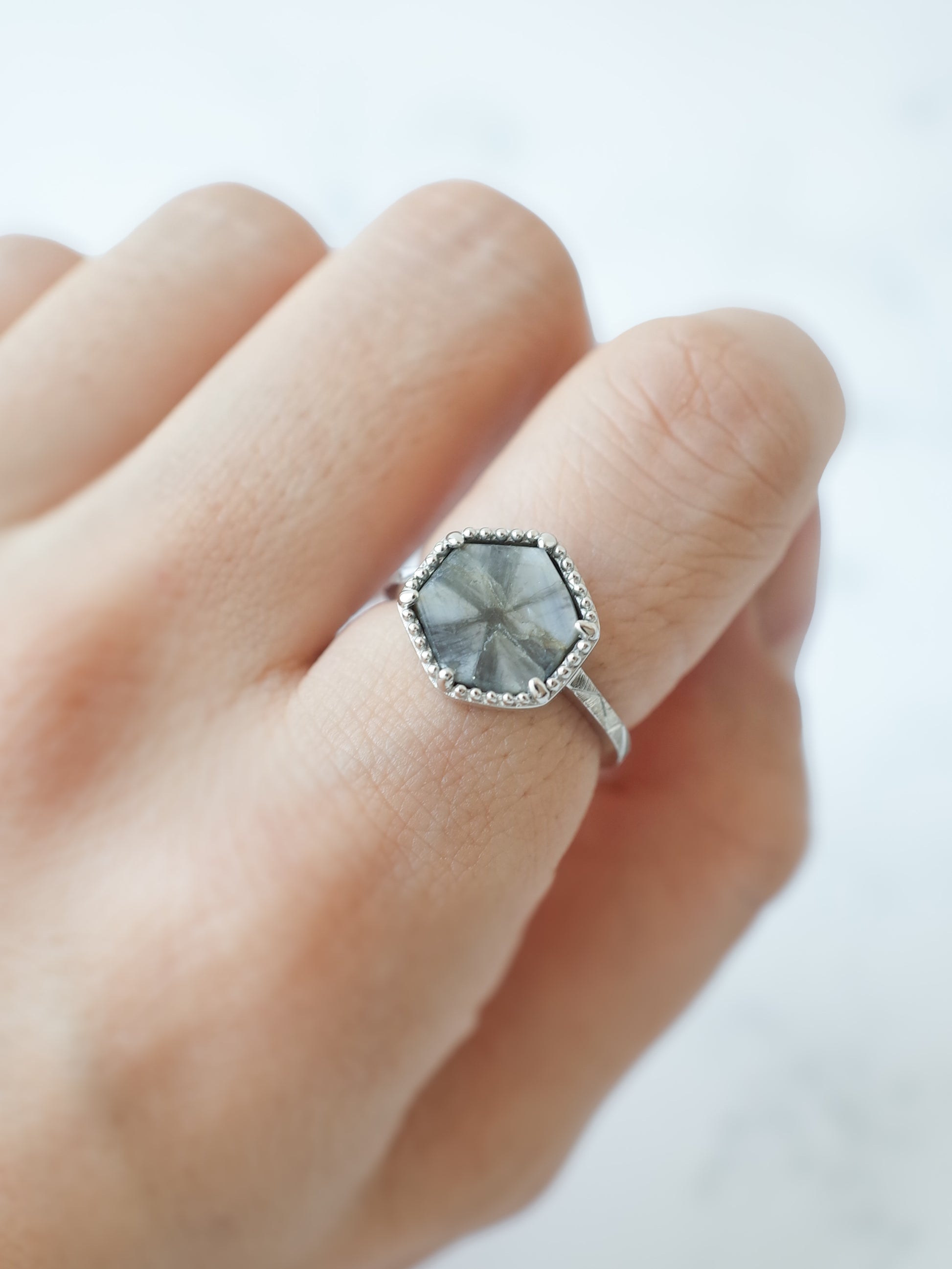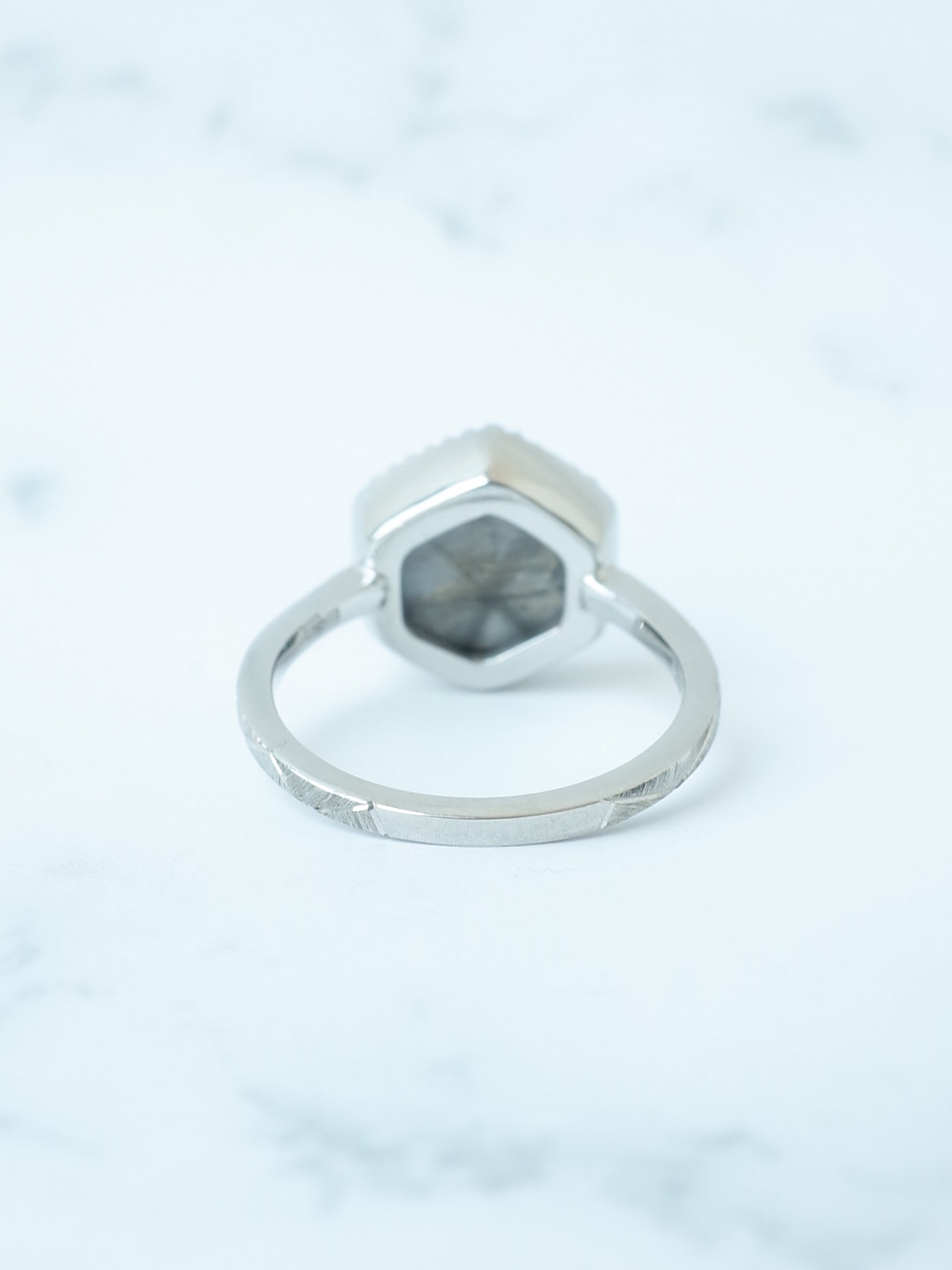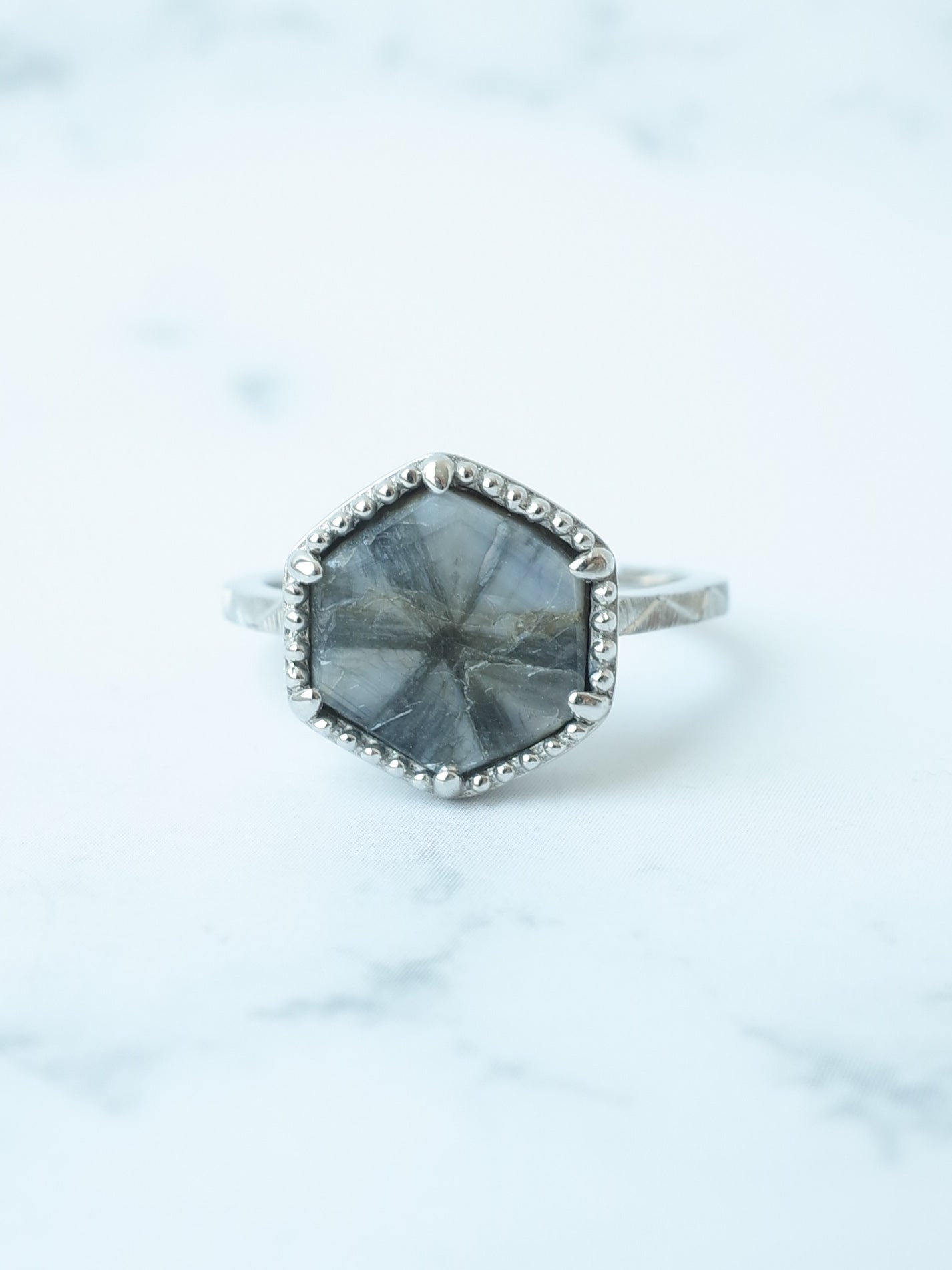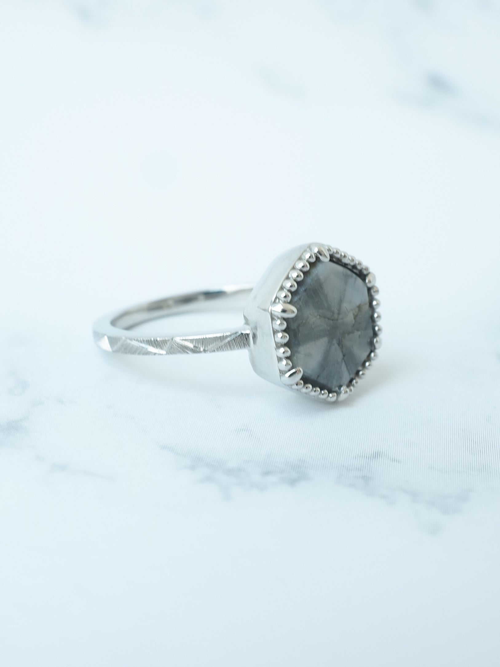 放射状に6条の星のような模様が見られる通称 ”トラピッチェサファイア” を使ったスペシャルな一点。コレクターが一つは持っていたい希少性の高い宝石です。