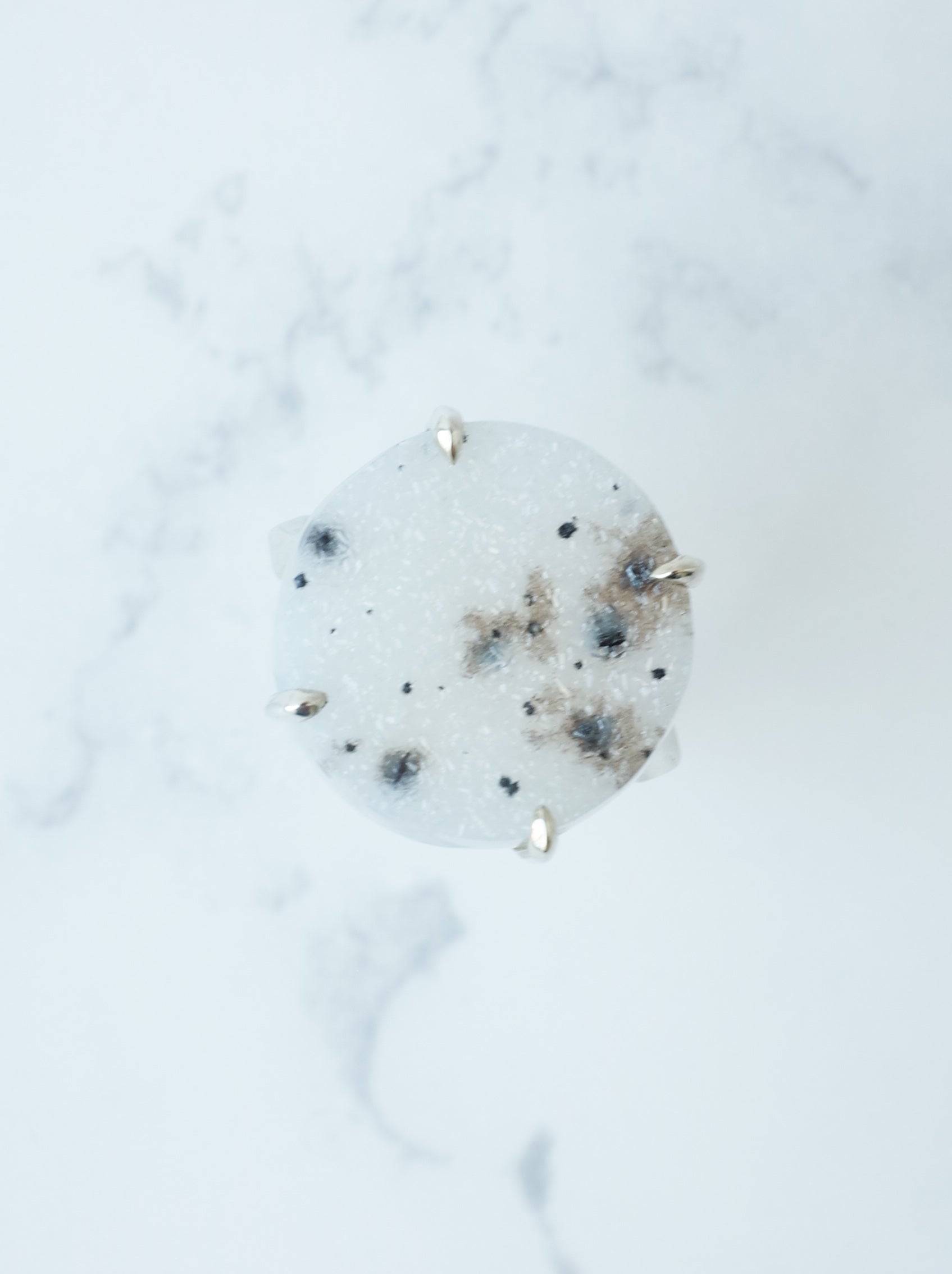 「ドゥルジー」とはキラキラとした細かい石英がアゲートやクォーツの表面に集まった天然石の総称。原石の状態ではジオード (晶洞) と、そのキラキラとした部分をドゥルジーと呼びます。かつては不要な部分として捨てられたいましたが、近年はその魅力が再認識されファッションジュエリーとして人気があります。