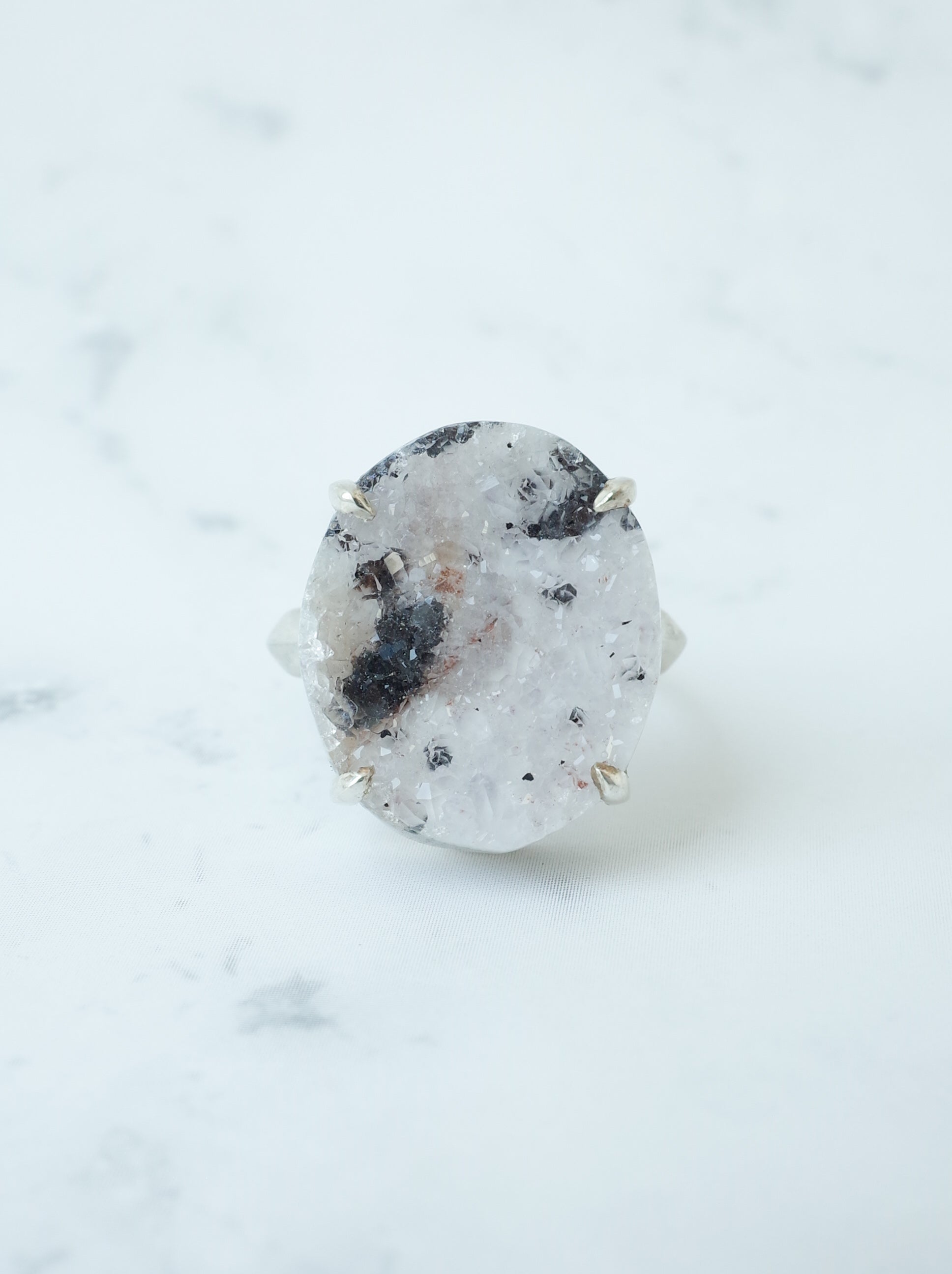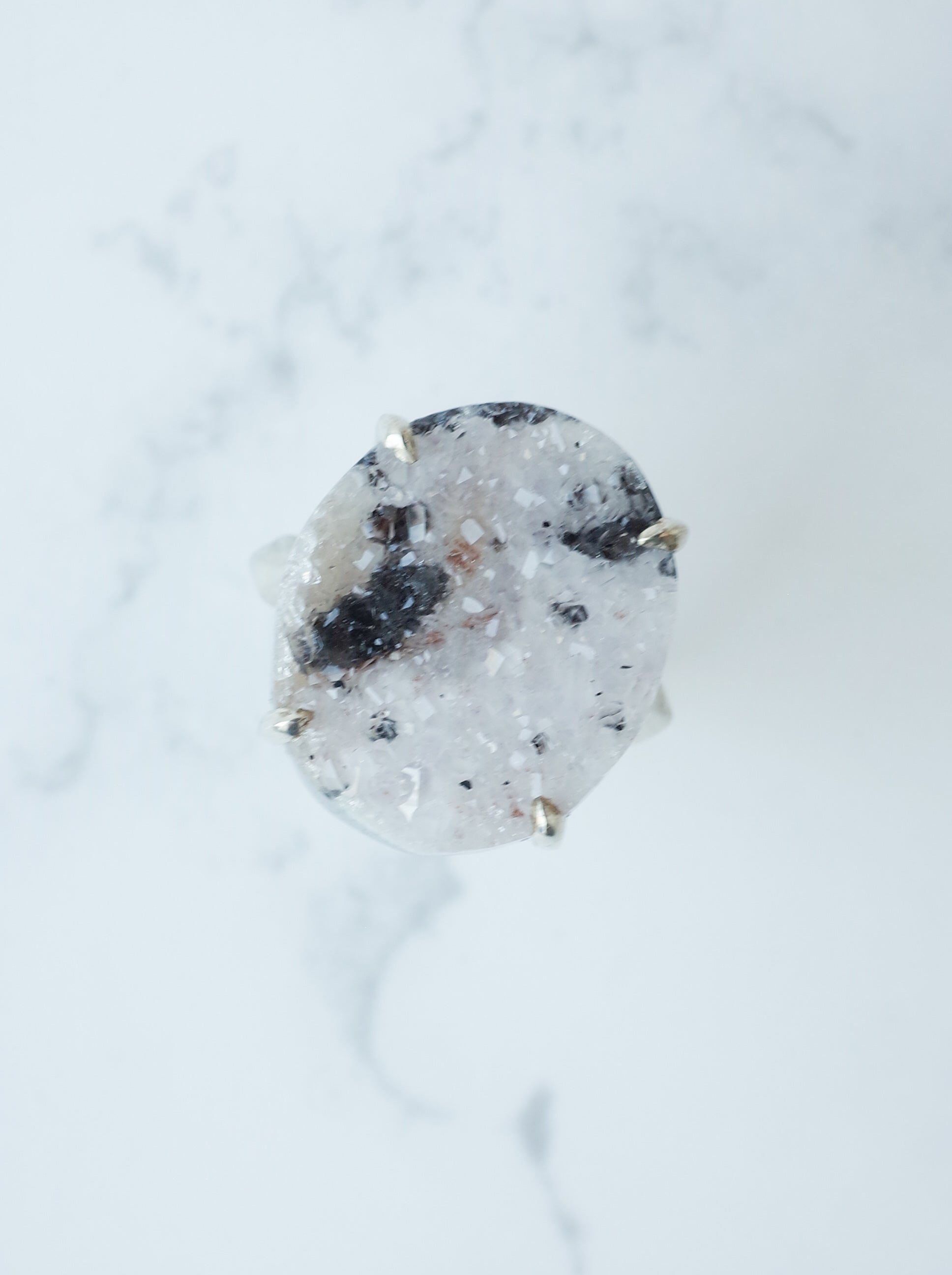 「ドゥルジー」とはキラキラとした細かい石英がアゲートやクォーツの表面に集まった天然石の総称。原石の状態ではジオード (晶洞) と、そのキラキラとした部分をドゥルジーと呼びます。かつては不要な部分として捨てられたいましたが、近年はその魅力が再認識されファッションジュエリーとして人気があります。