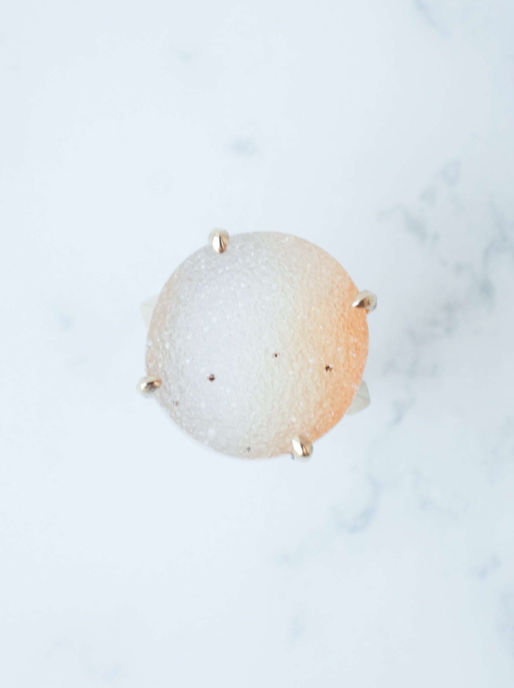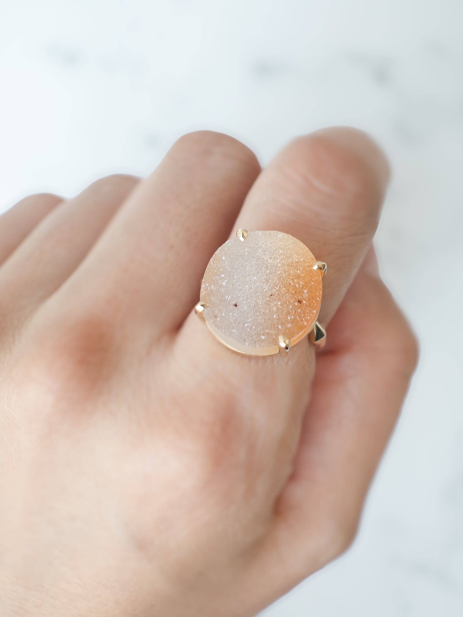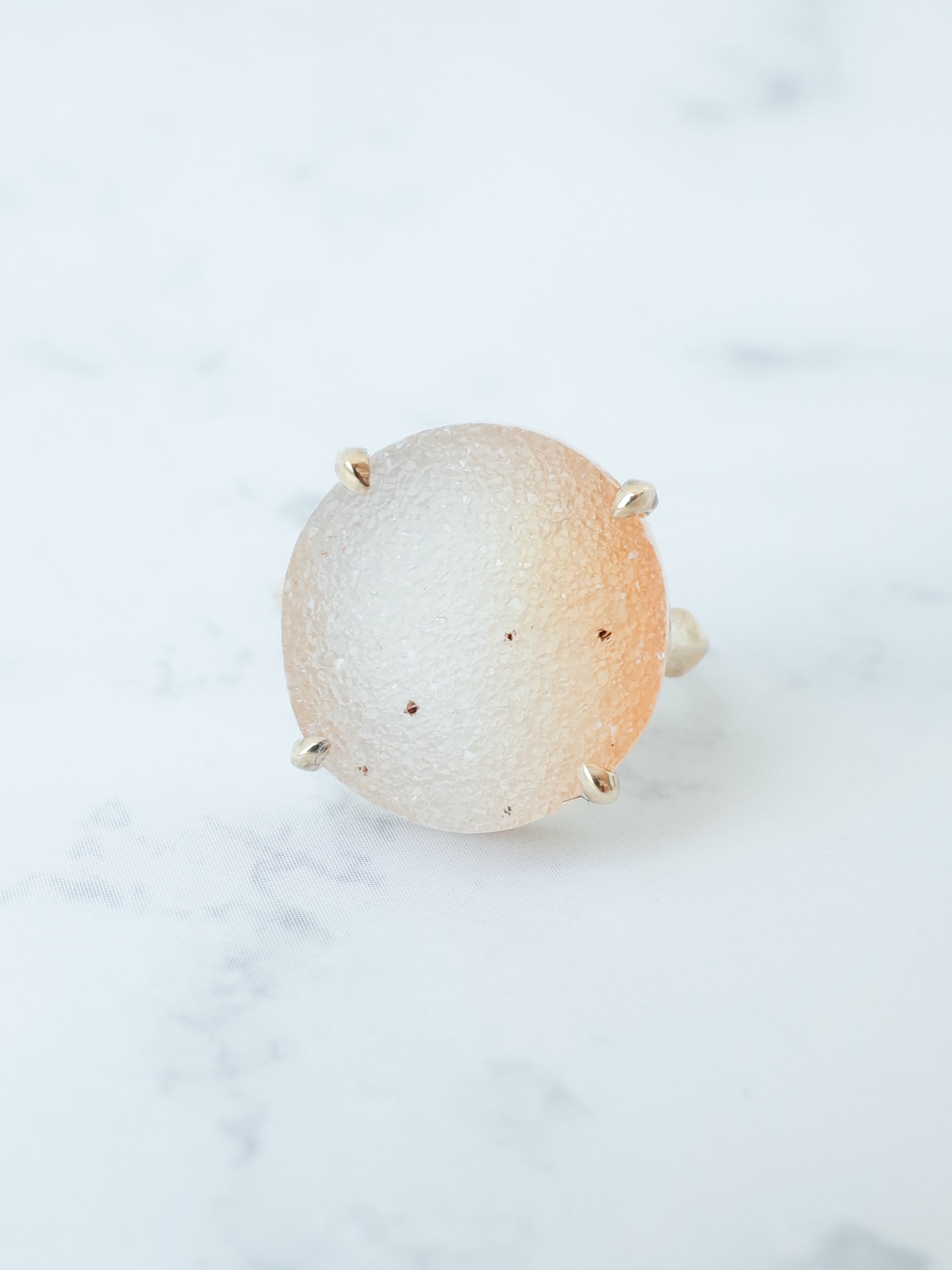 「ドゥルジー」とはキラキラとした細かい石英がアゲートやクォーツの表面に集まった天然石の総称。原石の状態ではジオード (晶洞) と、そのキラキラとした部分をドゥルジーと呼びます。かつては不要な部分として捨てられたいましたが、近年はその魅力が再認識されファッションジュエリーとして人気があります。