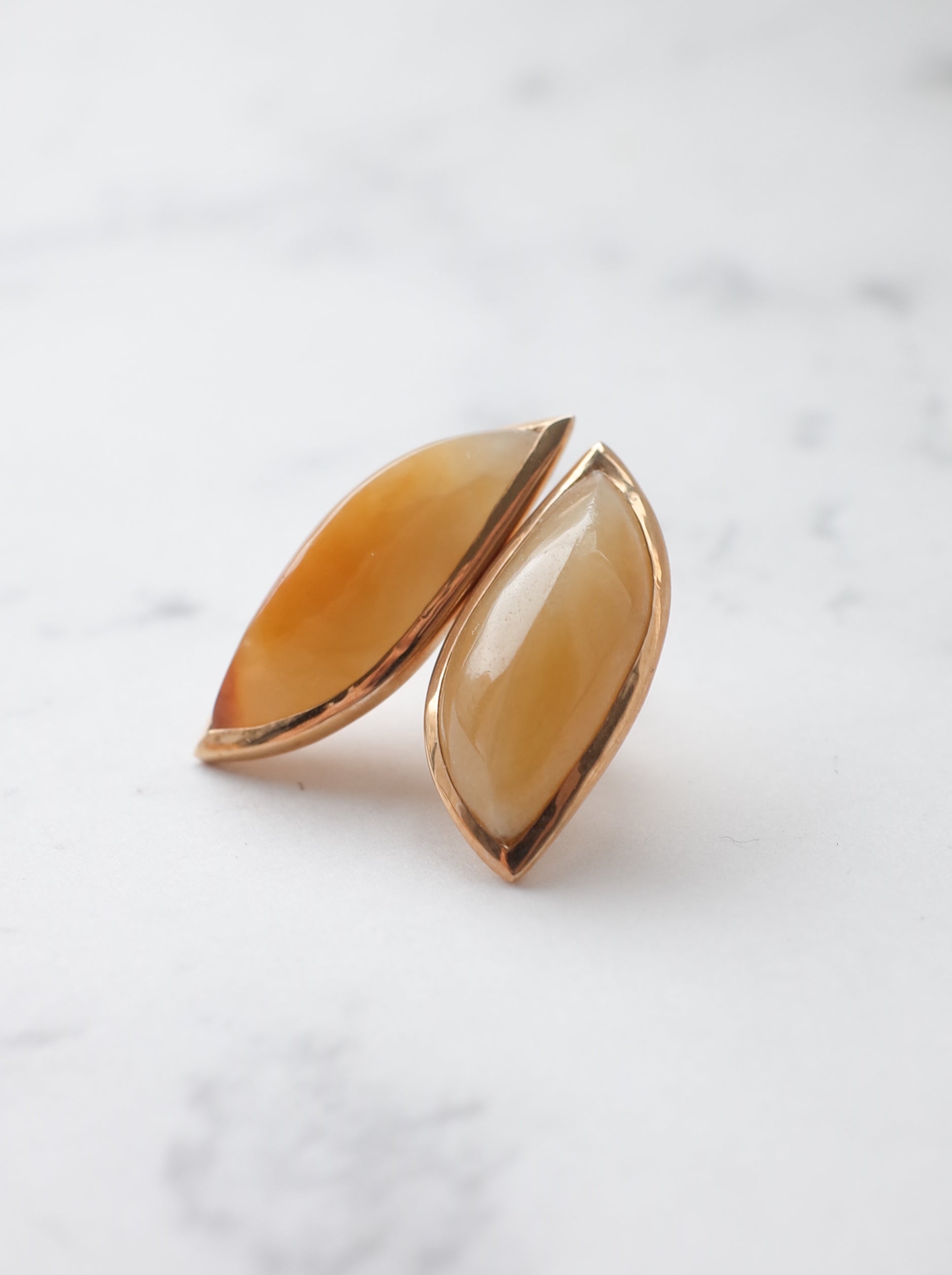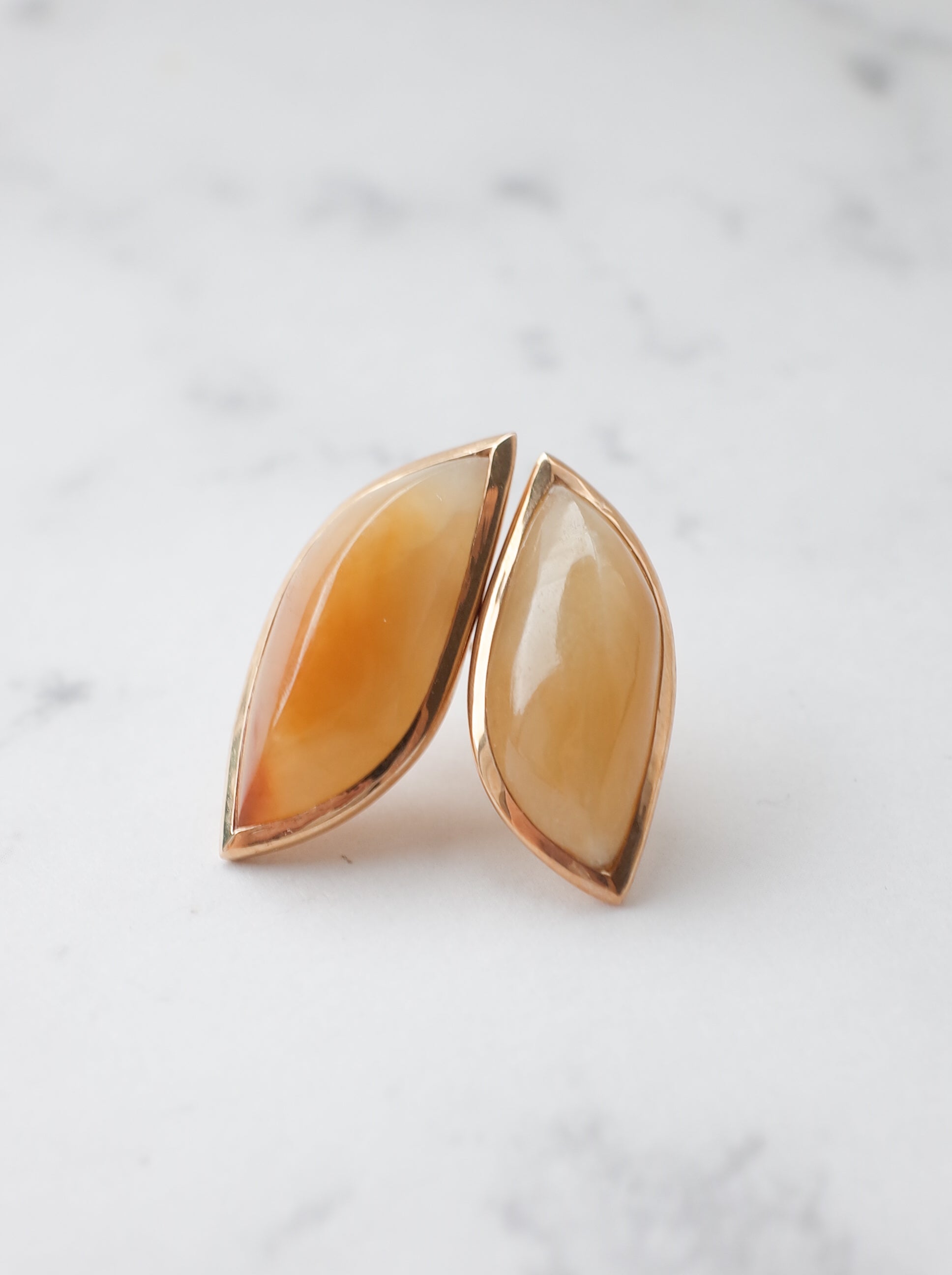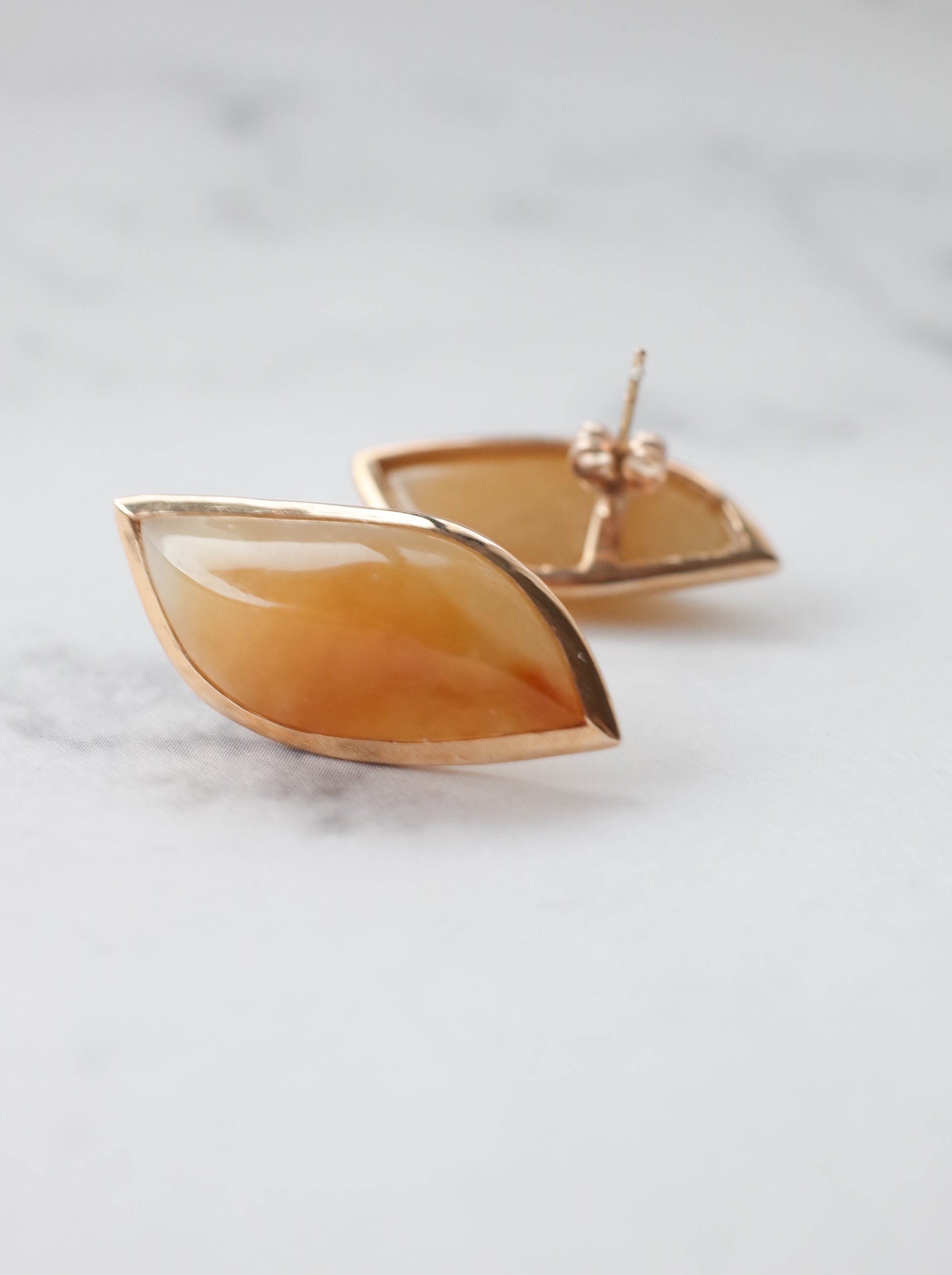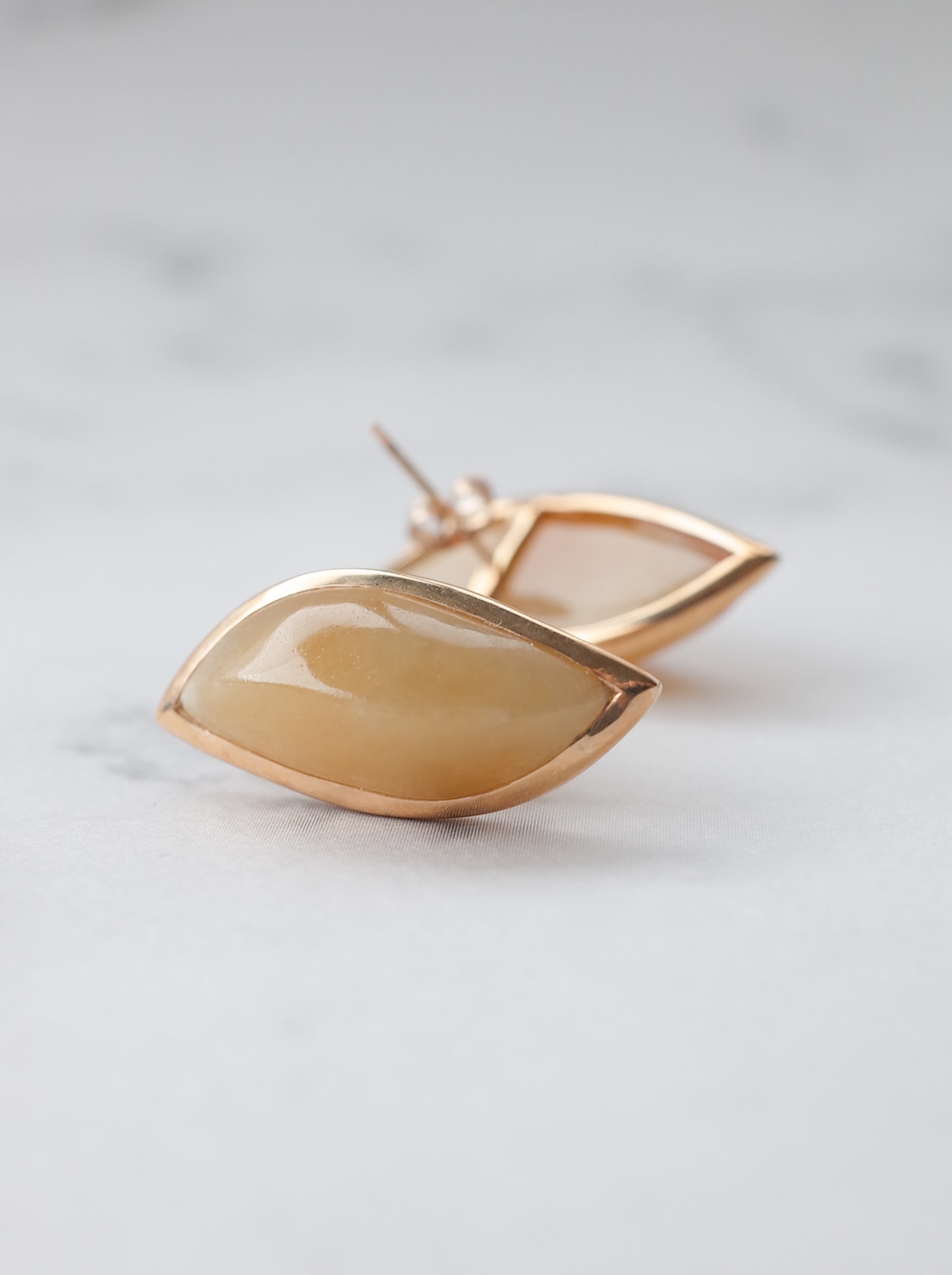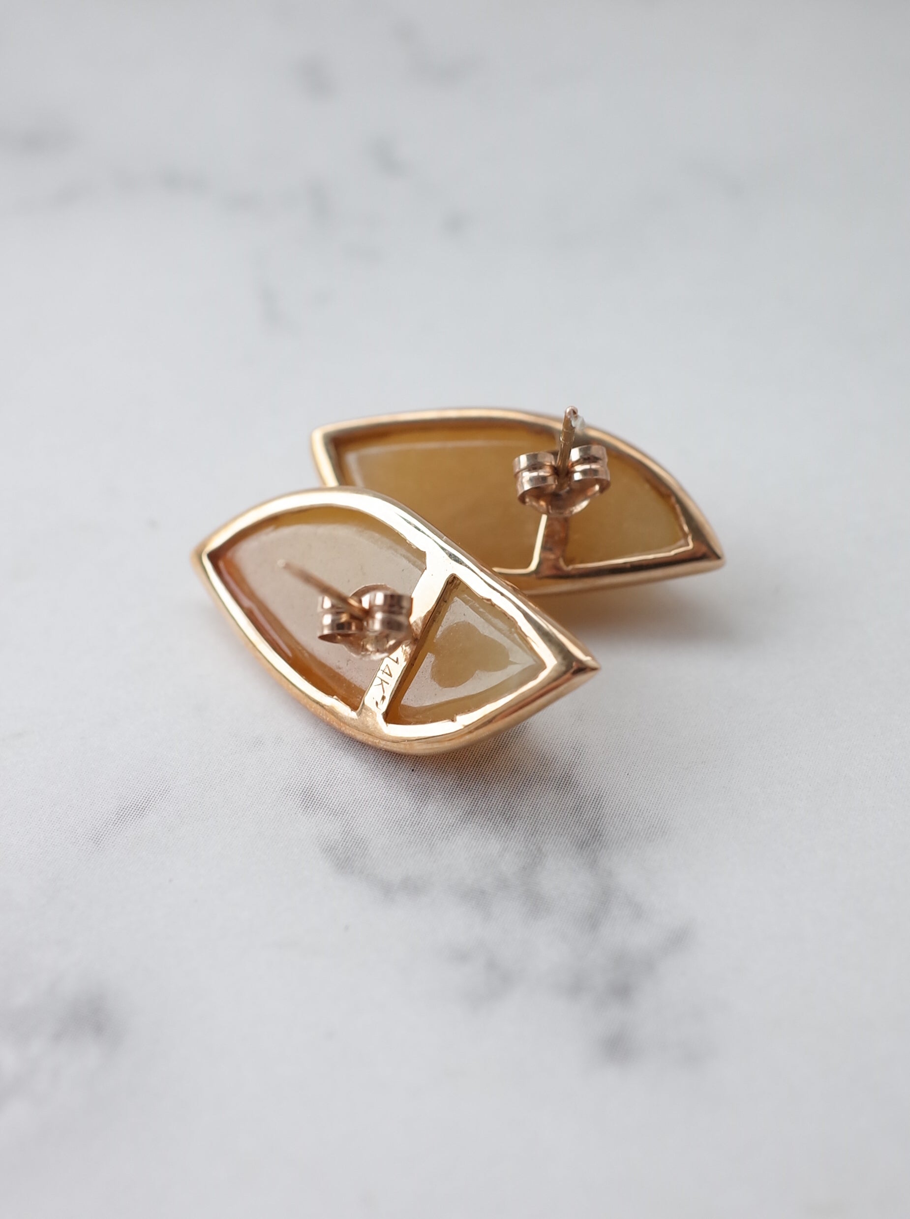 こちらはピアス用にペアでナツメ型に研磨されたハニージェイドを使用したピアスです。蝶の羽をイメージしたシンプルなスタッドタイプ。こっくりとした翡翠ならではのイエローカラーも魅力です。