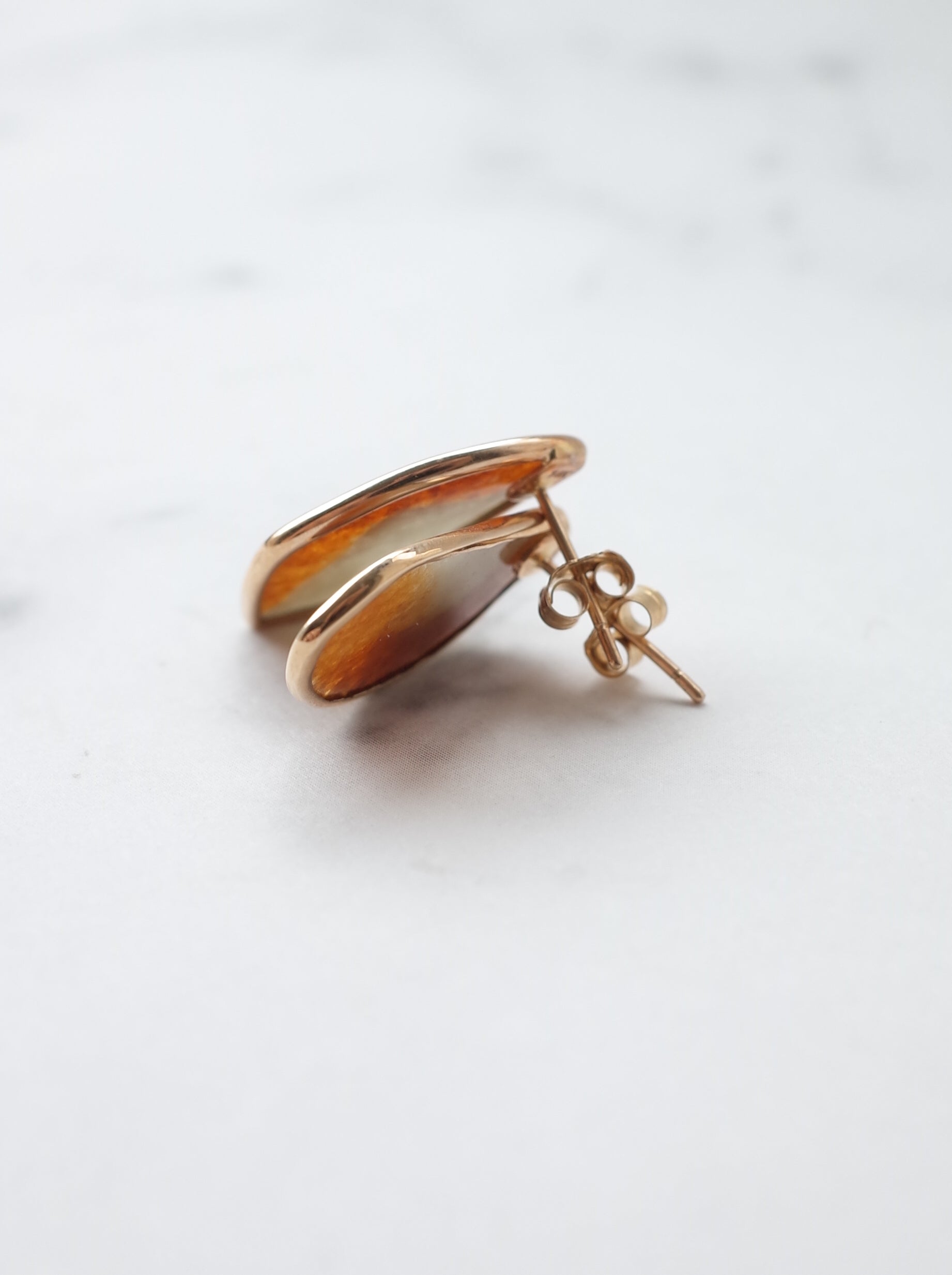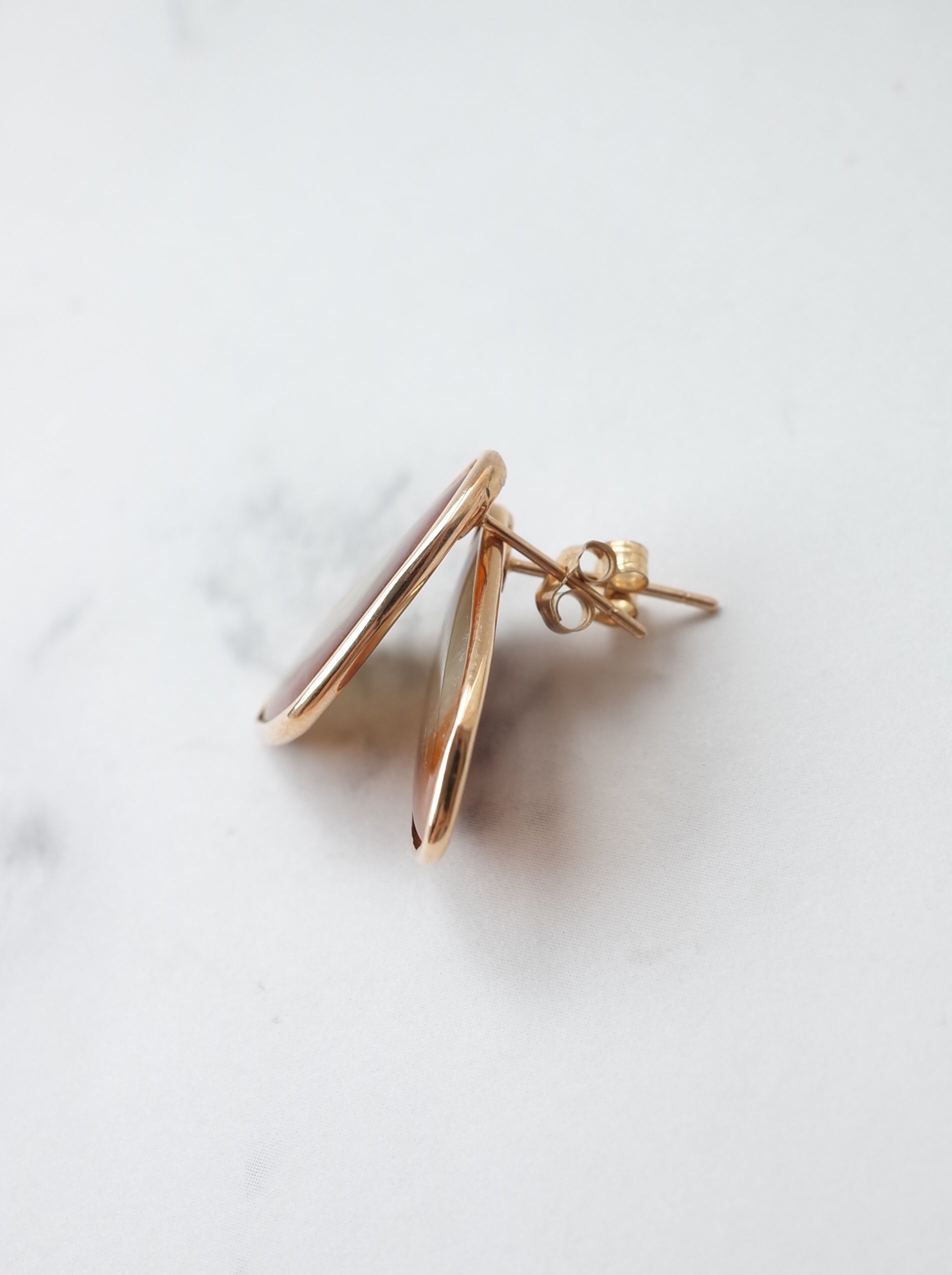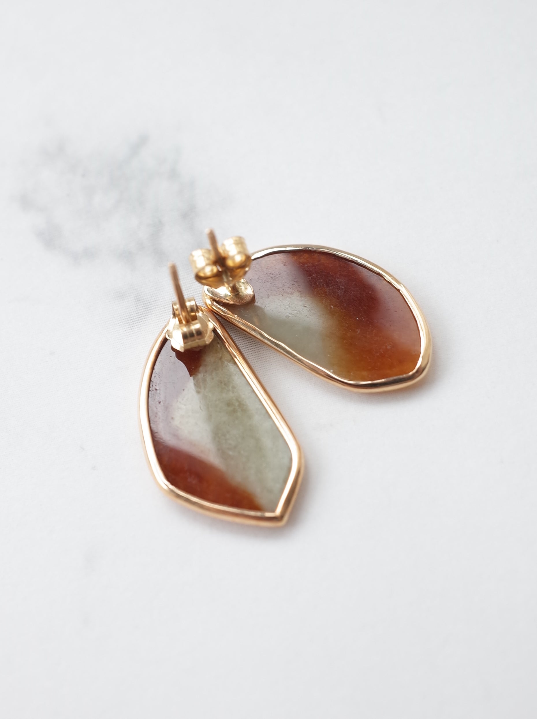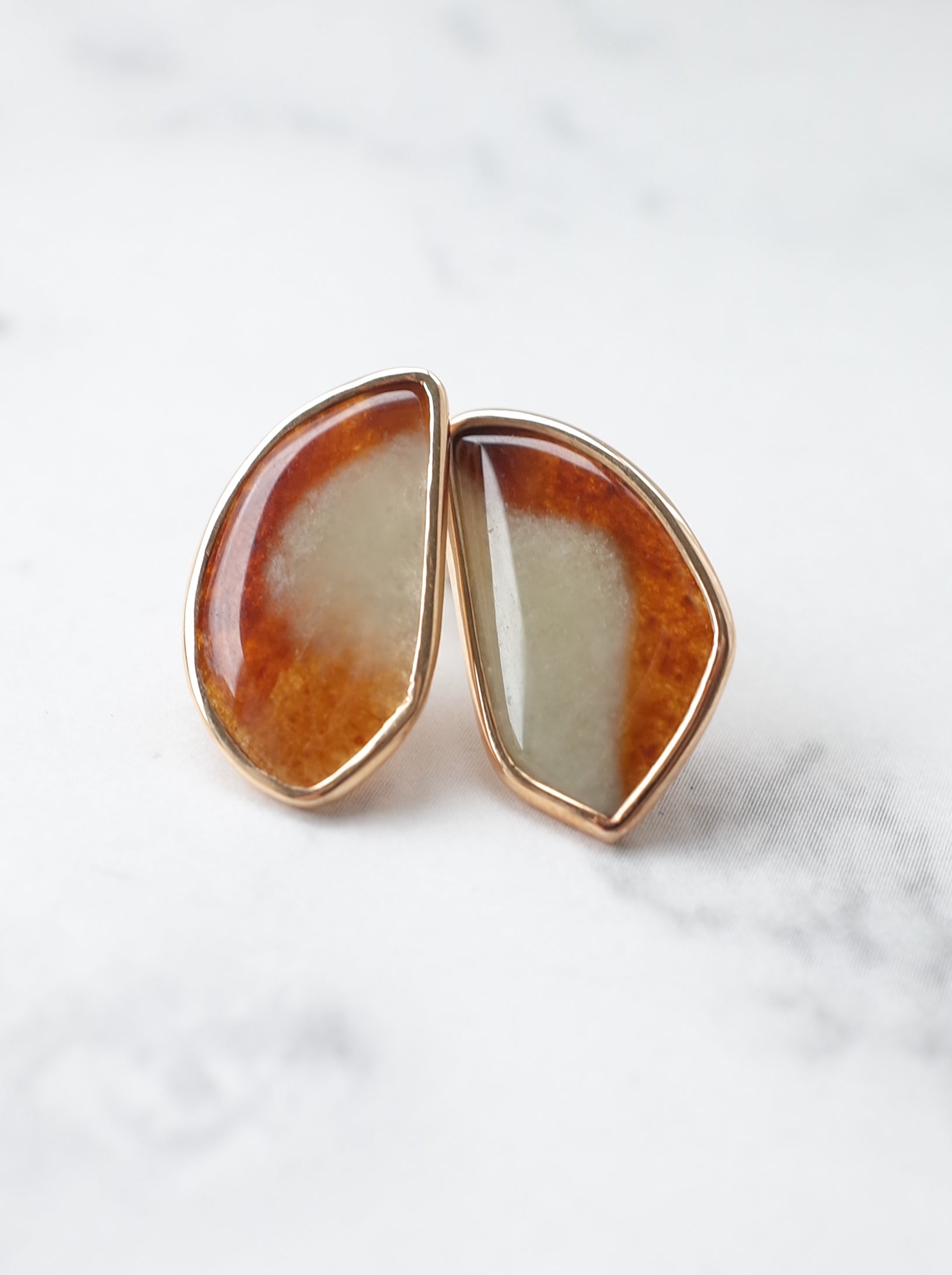 こちらはピアス用にペアに研磨されたハニージェイドを使用したピアスです。蝶の羽の用に薄く研磨されたバイカラー翡翠は、つけ心地もともて軽やかです。こっくりとした翡翠ならではのイエローカラーも魅力です。