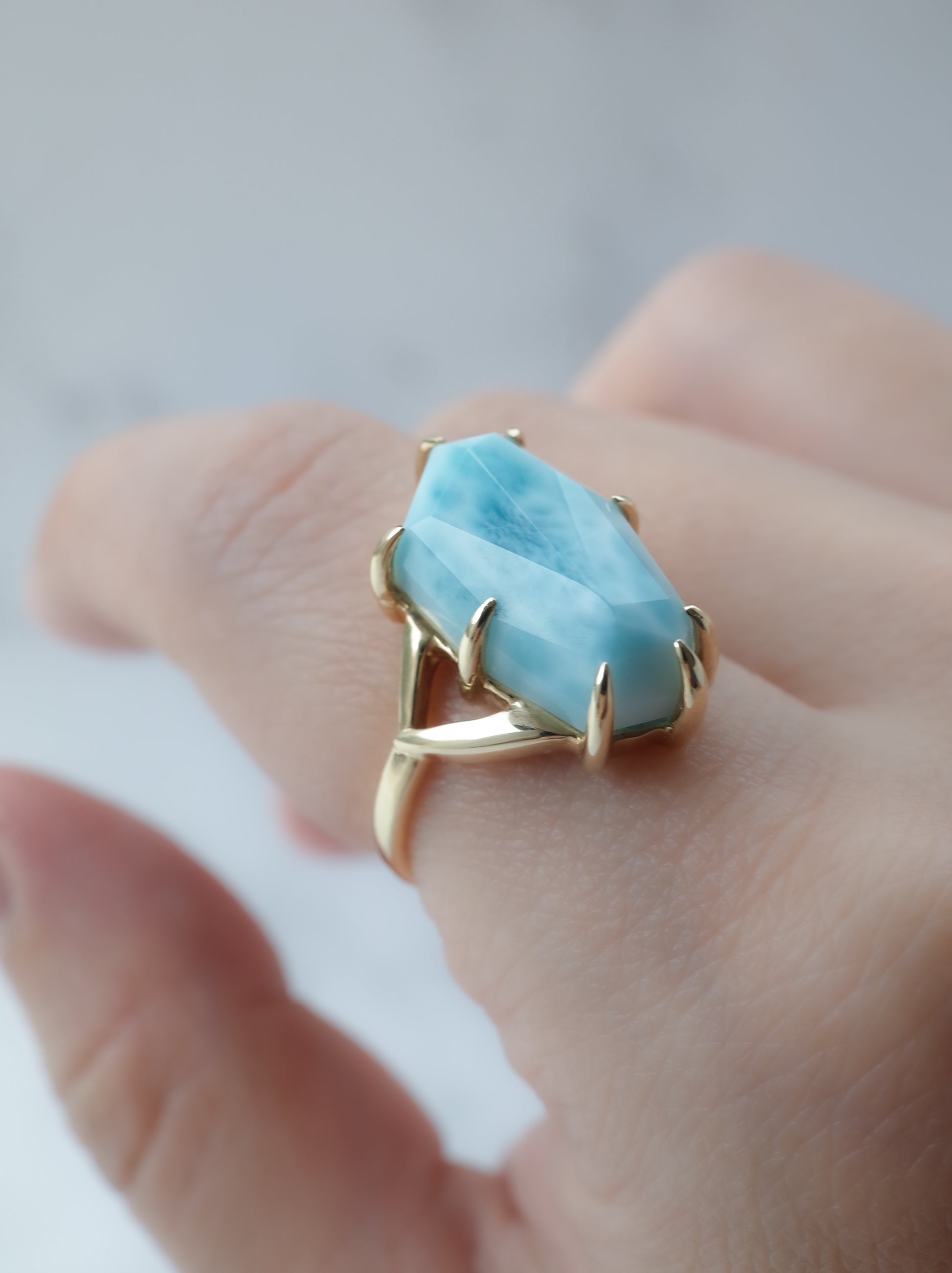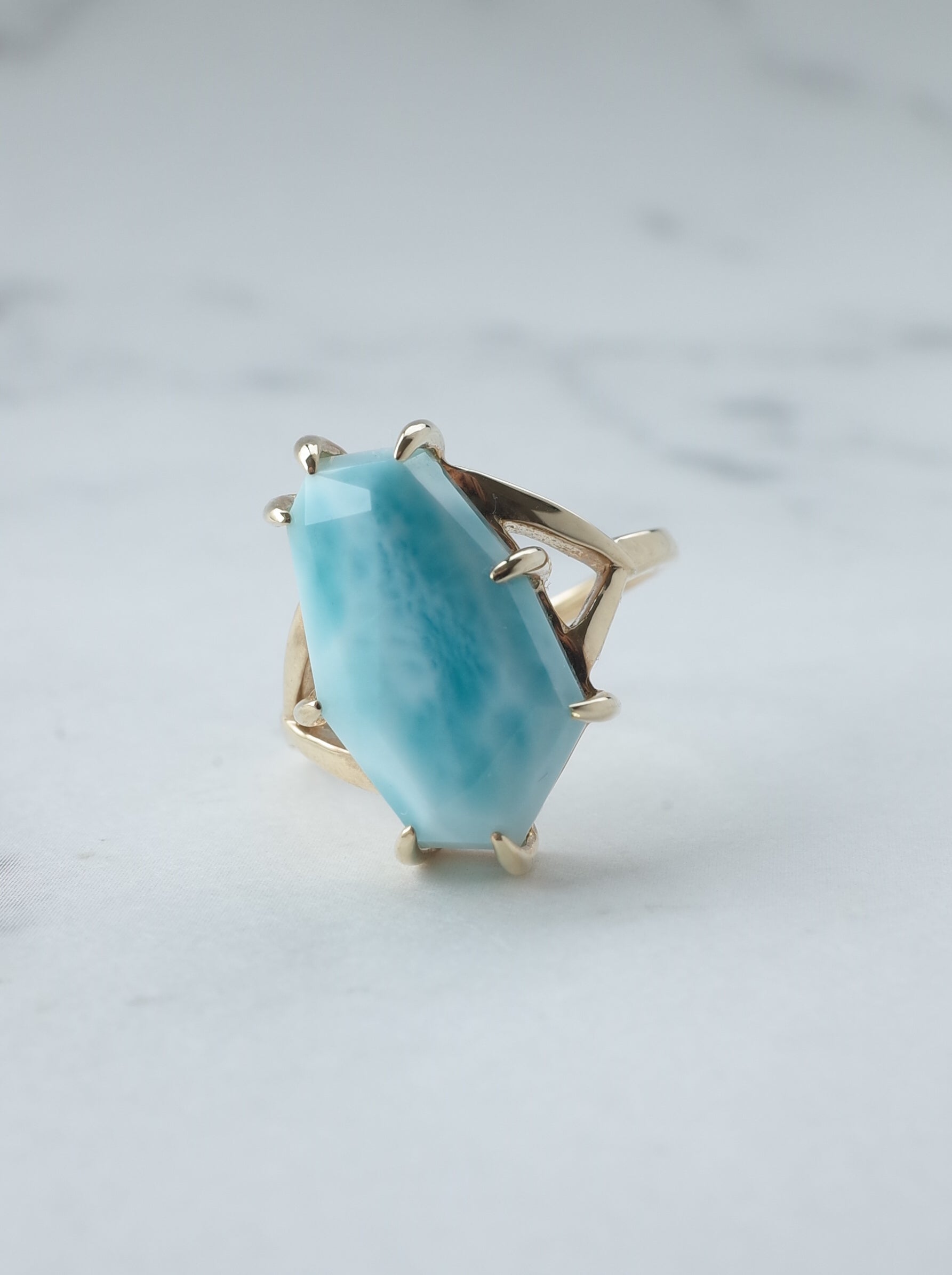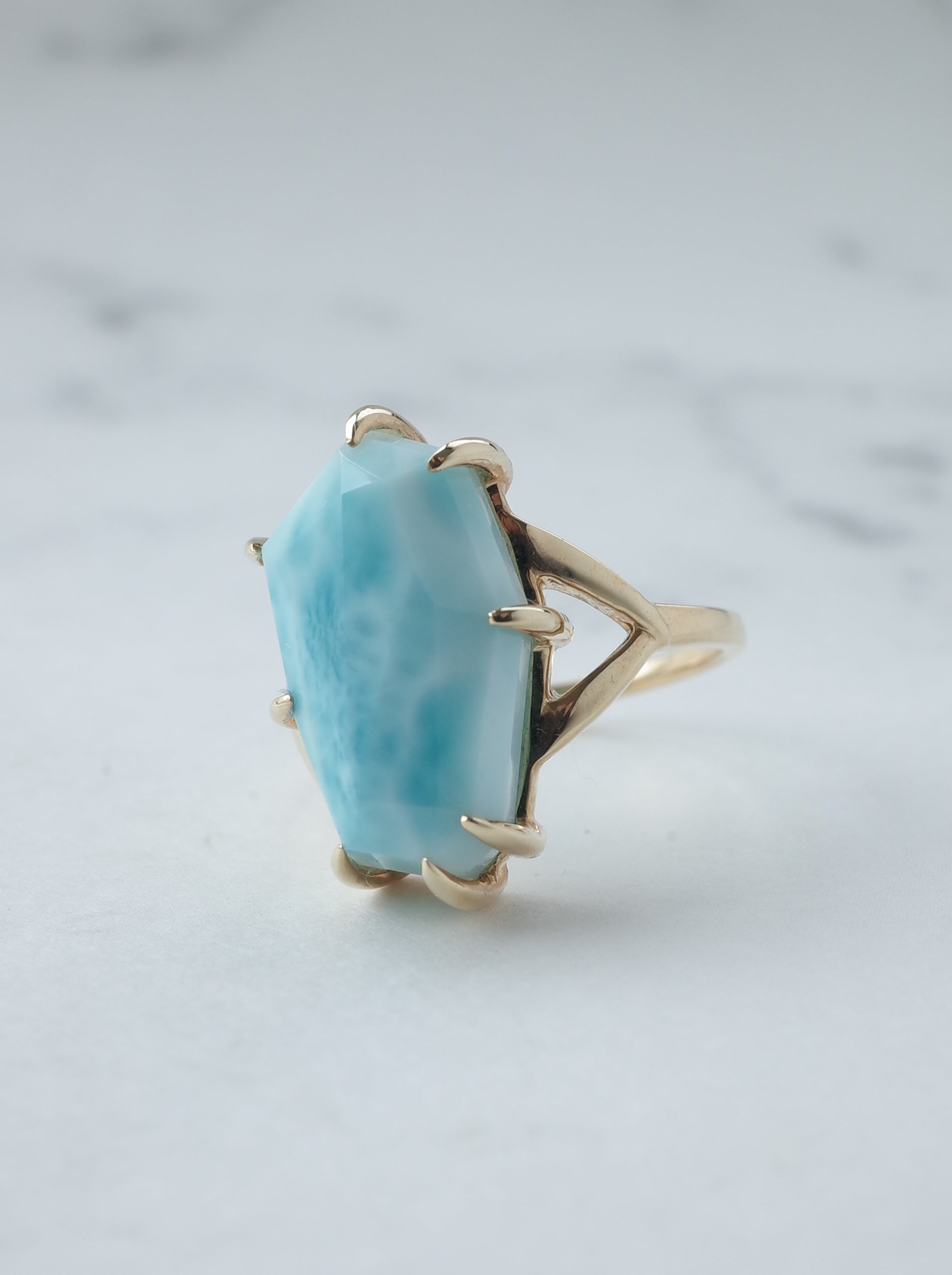 ラリマー (ブルーペクトライト) にランダムなカットを施した、モダンなフォルムが魅力のリングです。石そのものがまるで浅瀬の海を覗き込んでいるようですが、カットを施すことで水面に反射した日差しの煌めきまでもが感じられるようになりました。
