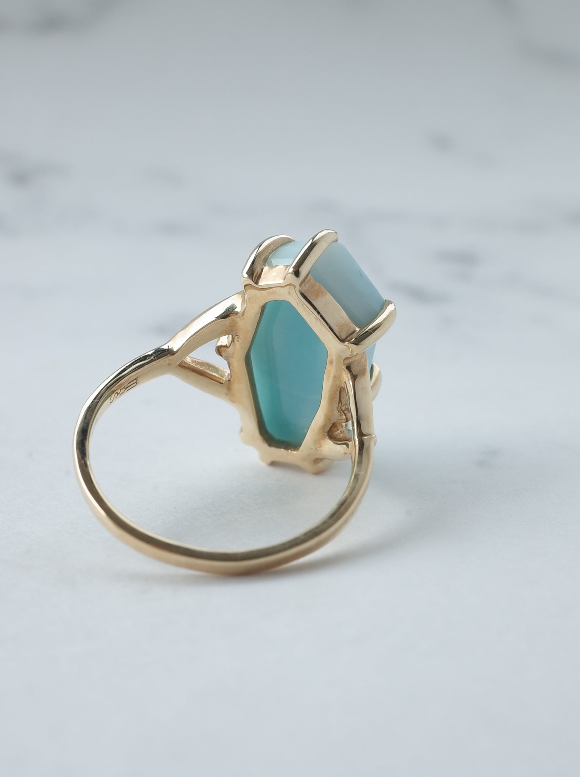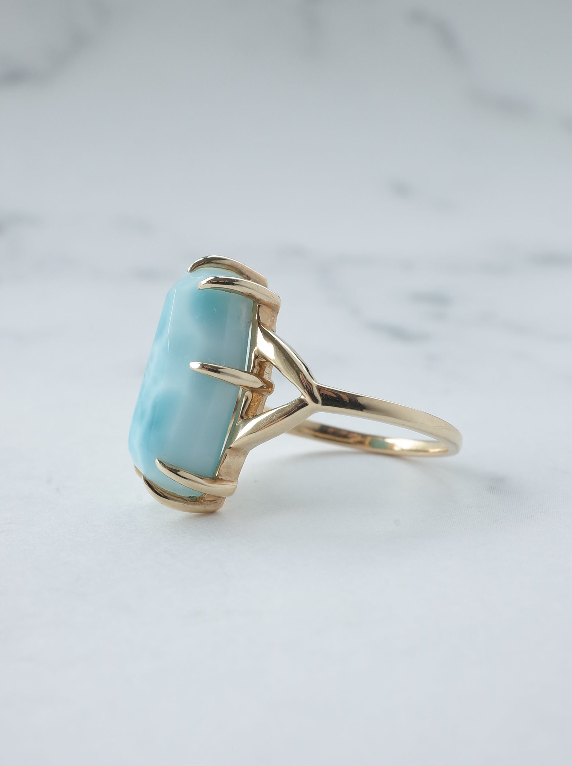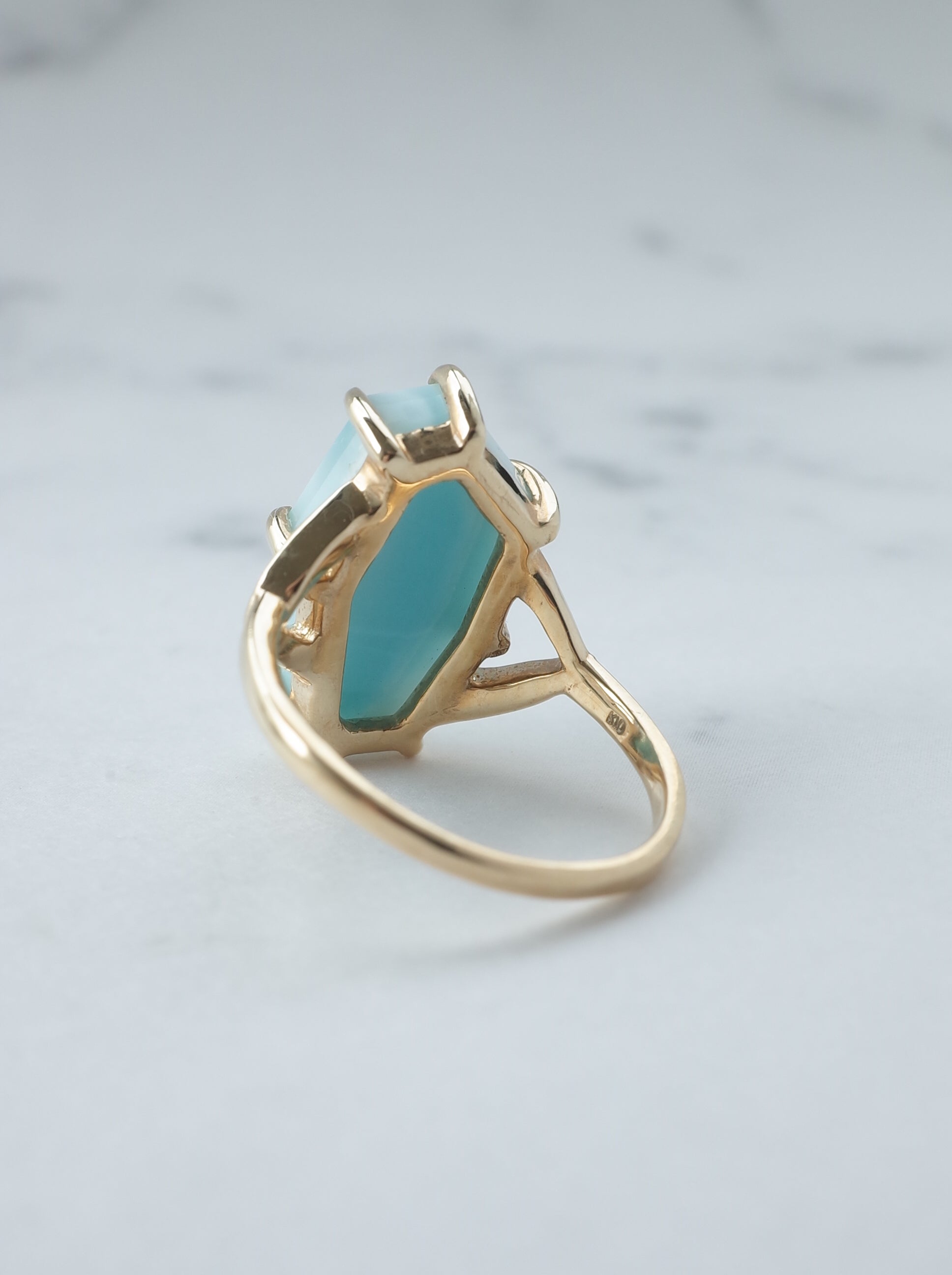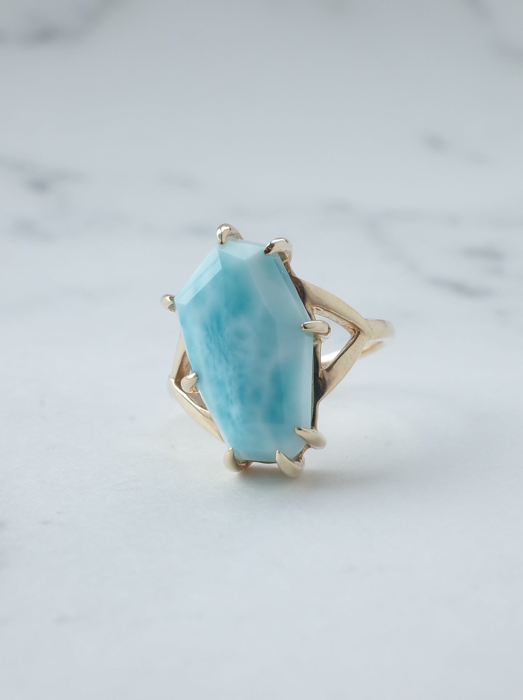 ラリマー (ブルーペクトライト) にランダムなカットを施した、モダンなフォルムが魅力のリングです。石そのものがまるで浅瀬の海を覗き込んでいるようですが、カットを施すことで水面に反射した日差しの煌めきまでもが感じられるようになりました。