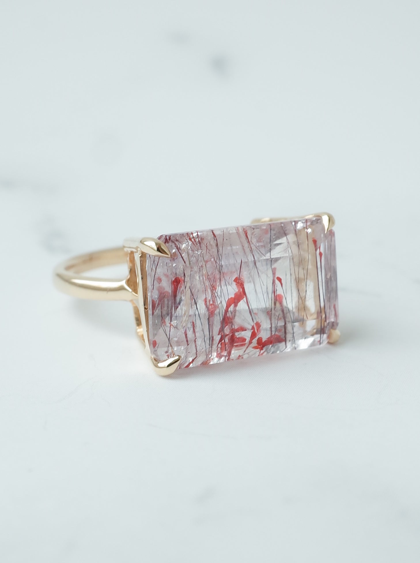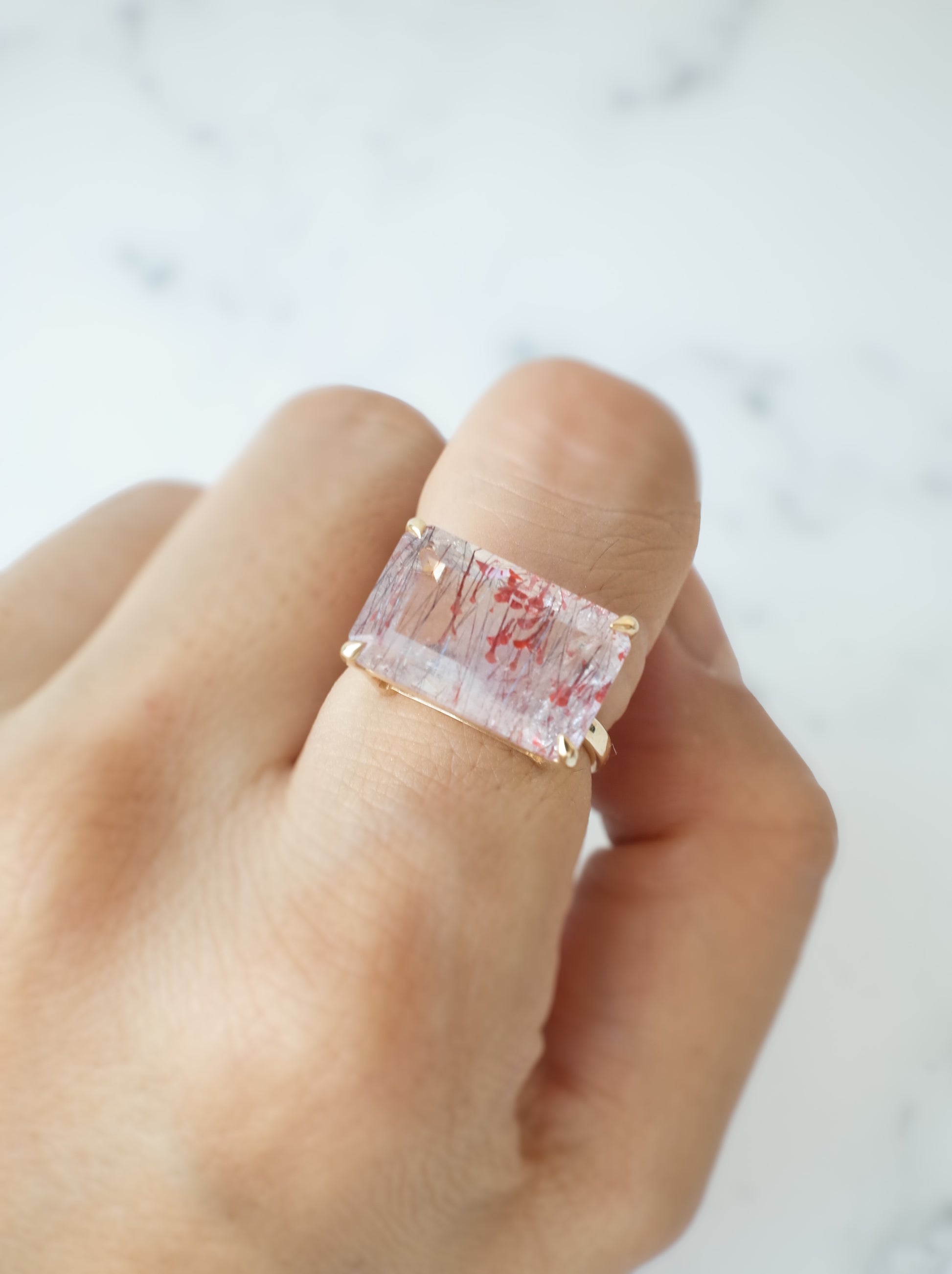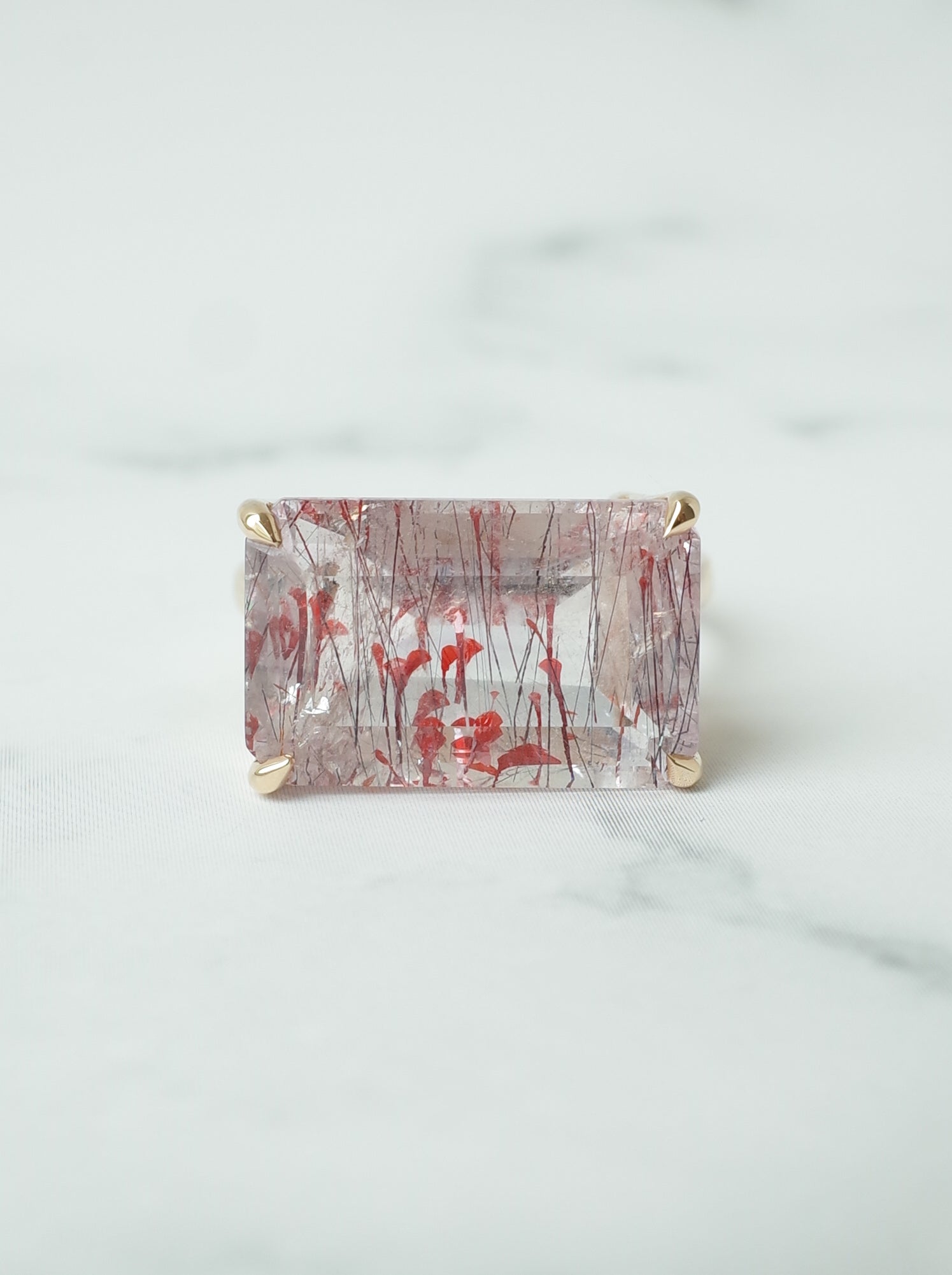 クォーツに内包された真っ赤なレピドクロサイトが宙を舞うような姿が魅力の一点。MOEMI SUGIMURA で人気の天然石です。ぜひお手元でキラキラとさせながらお楽しみください。