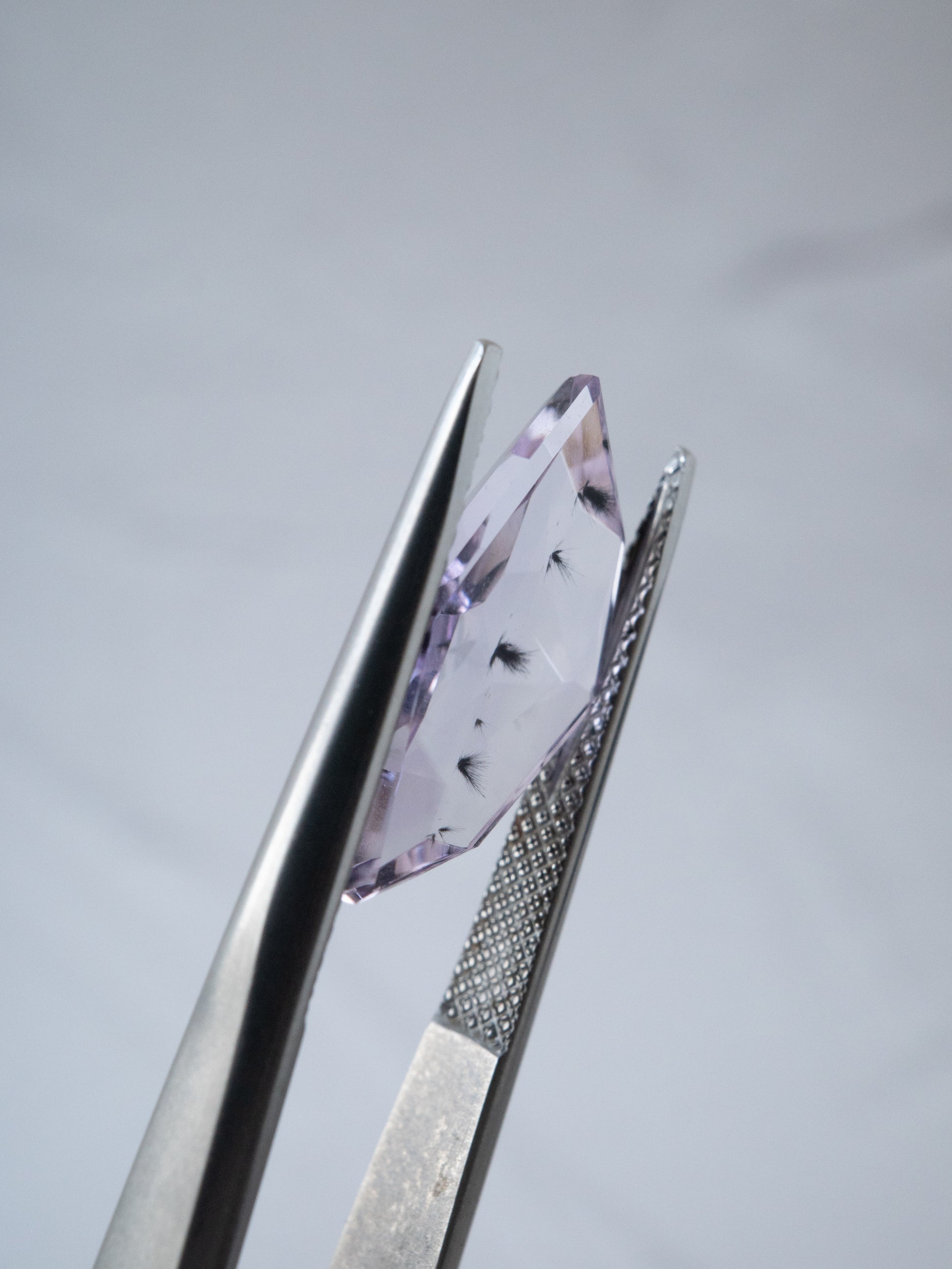 山梨県甲府市に伝統的に伝わる「手磨り」という技法は、高度な器具を使わずに手先の感覚のみで石を研磨していく昔ながらの研磨方法。計算された機械的なカットよりも臨機応変な対応ができるため、インクルージョンの魅力を最大限引き出せる手法でもあります。