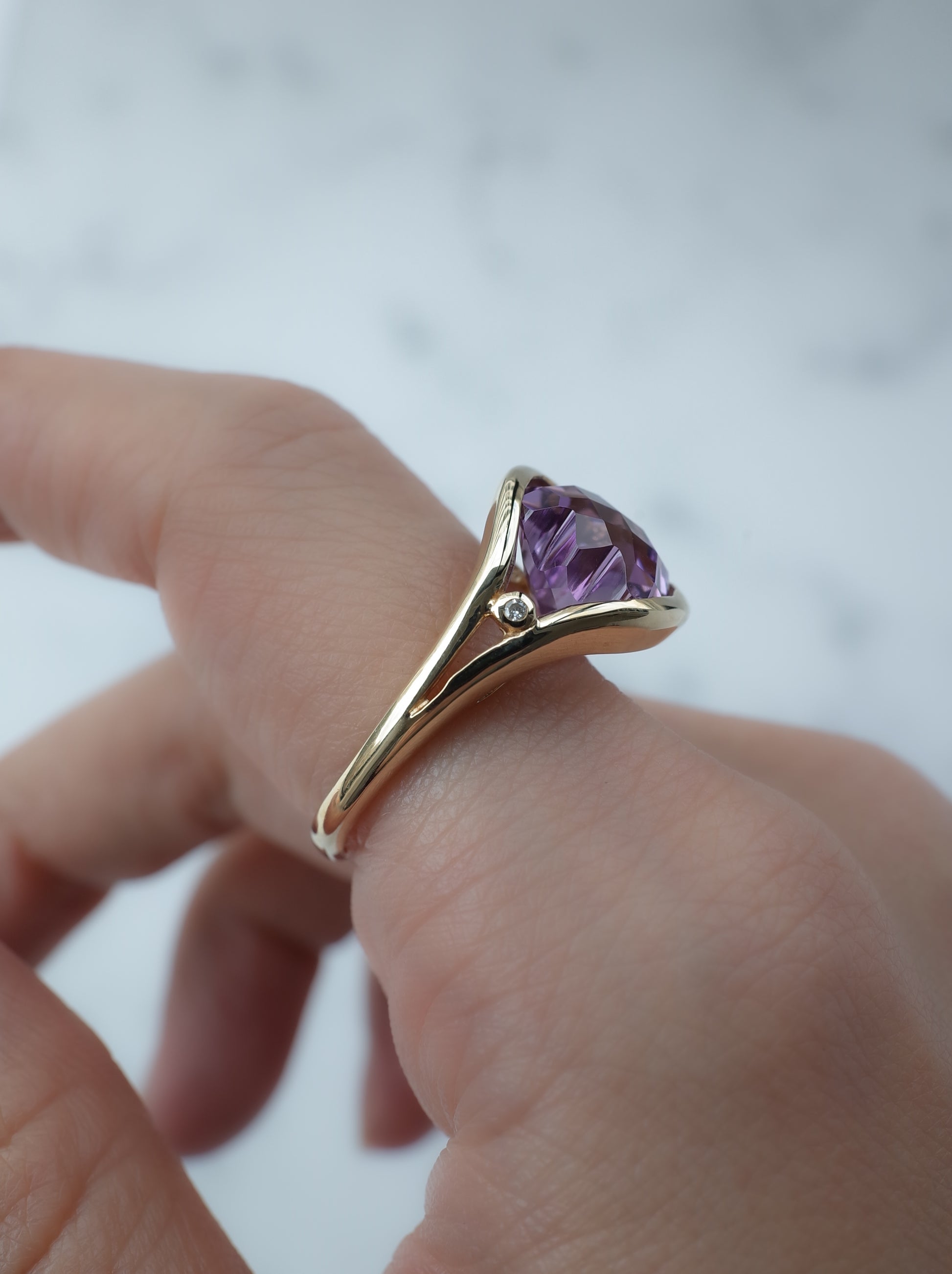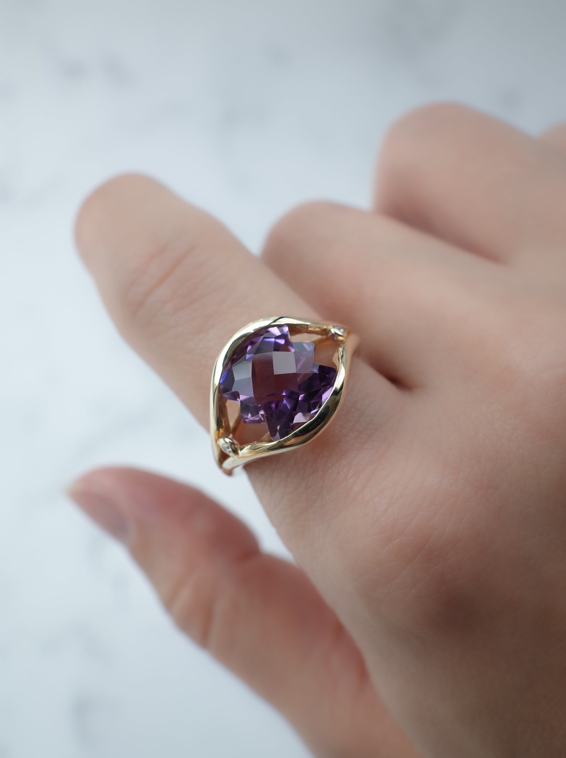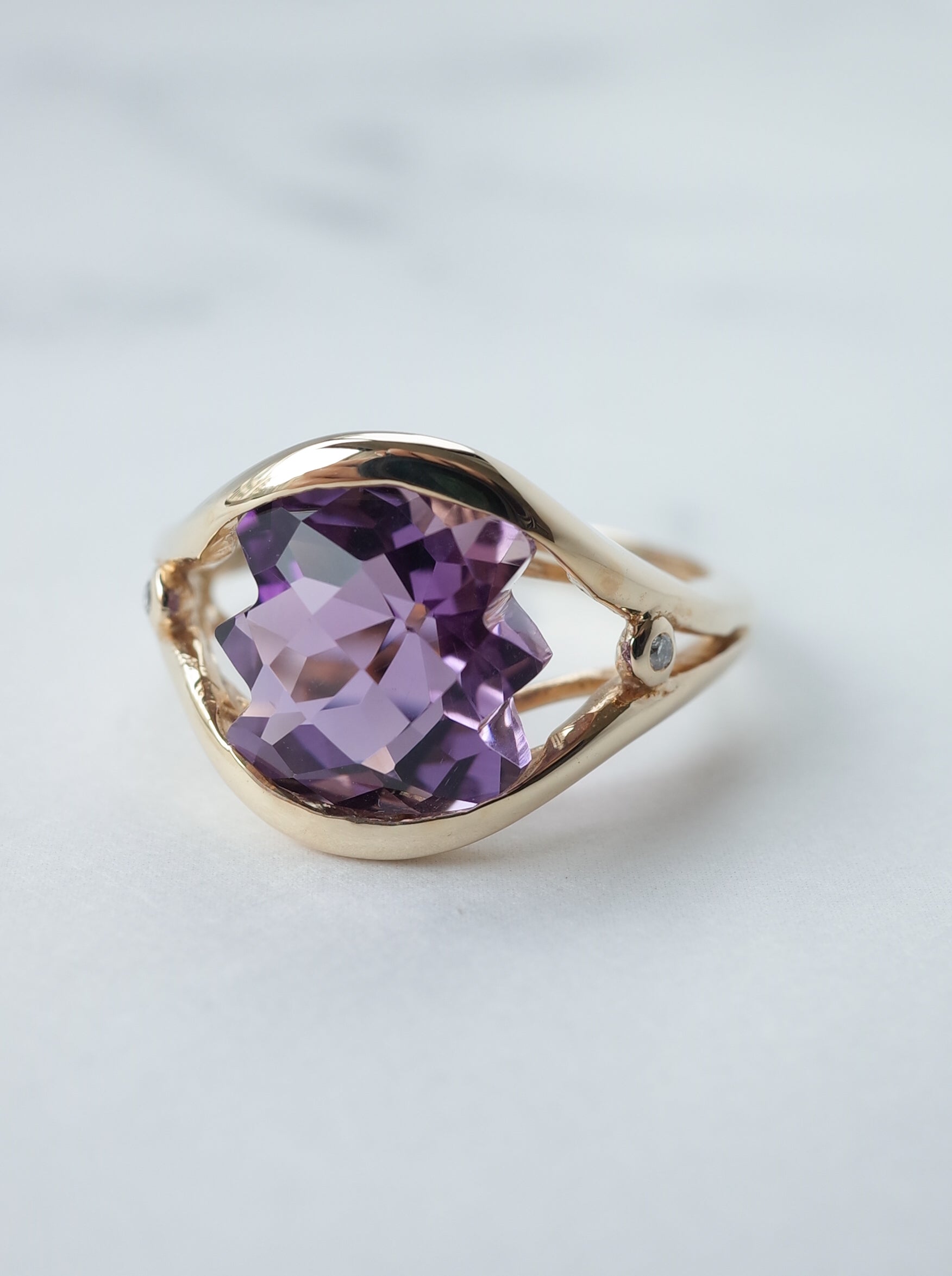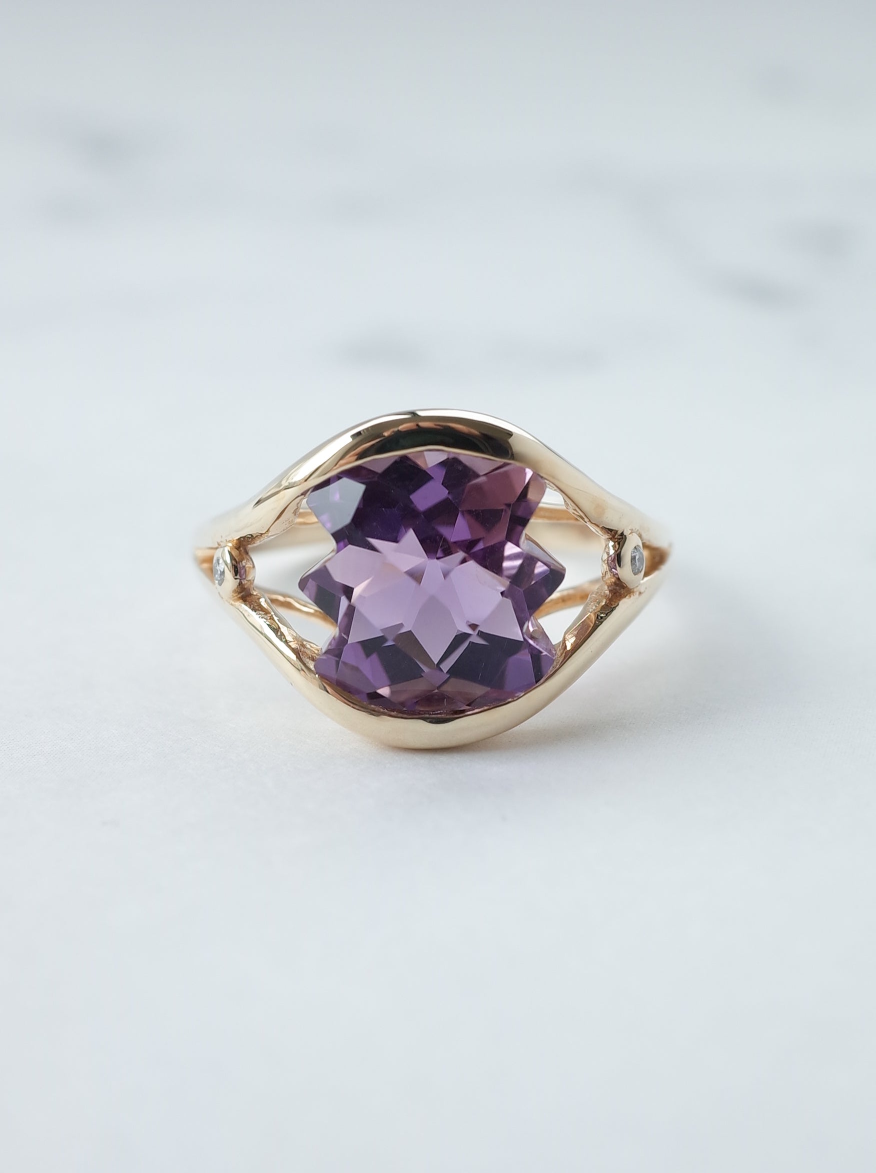 両端がギザギザに切り込まれた珍しいカットのアメシスト。表面はチェッカーカットが施され、面白い石のシルエットをより引き立たせてくれています。