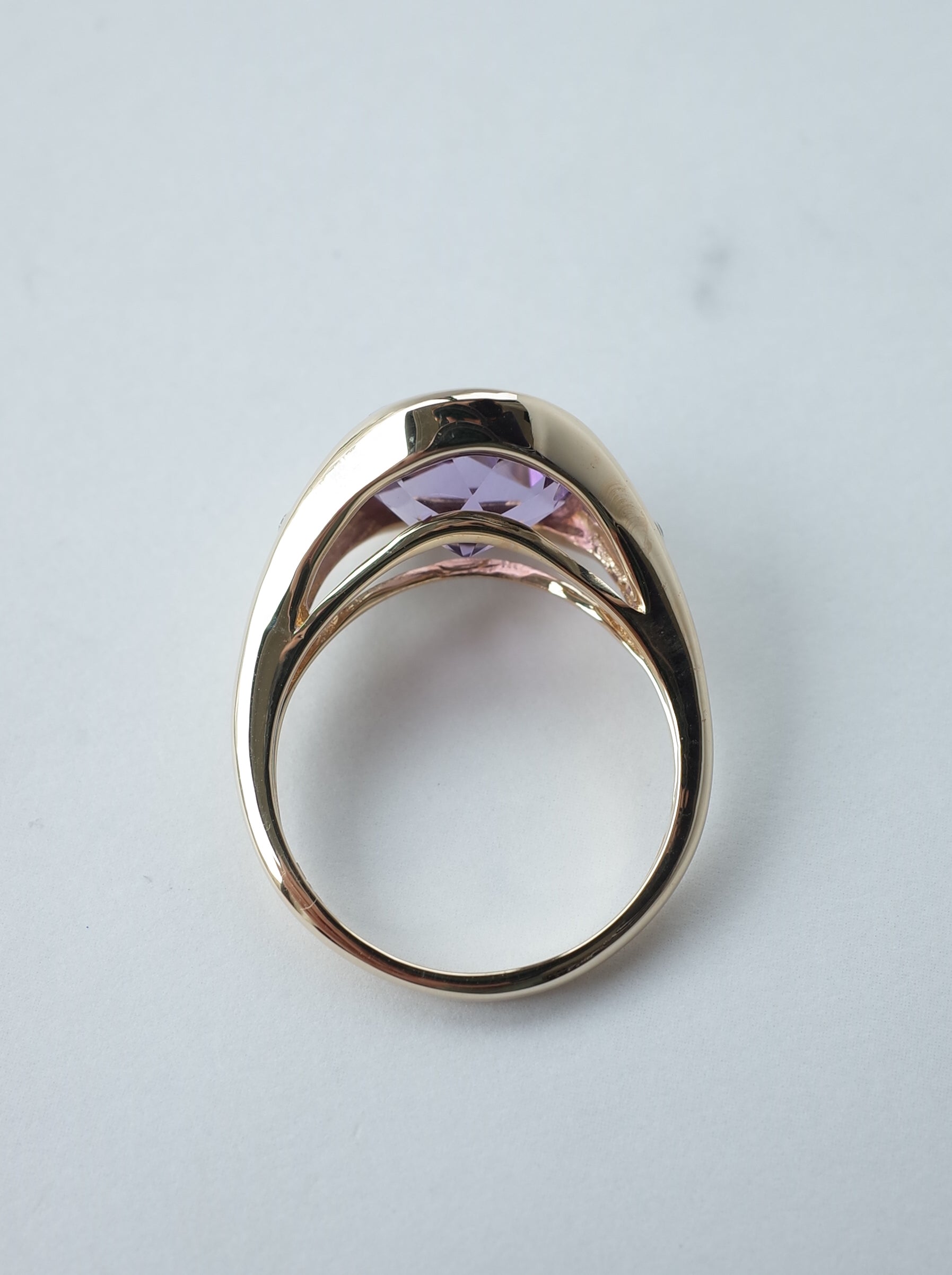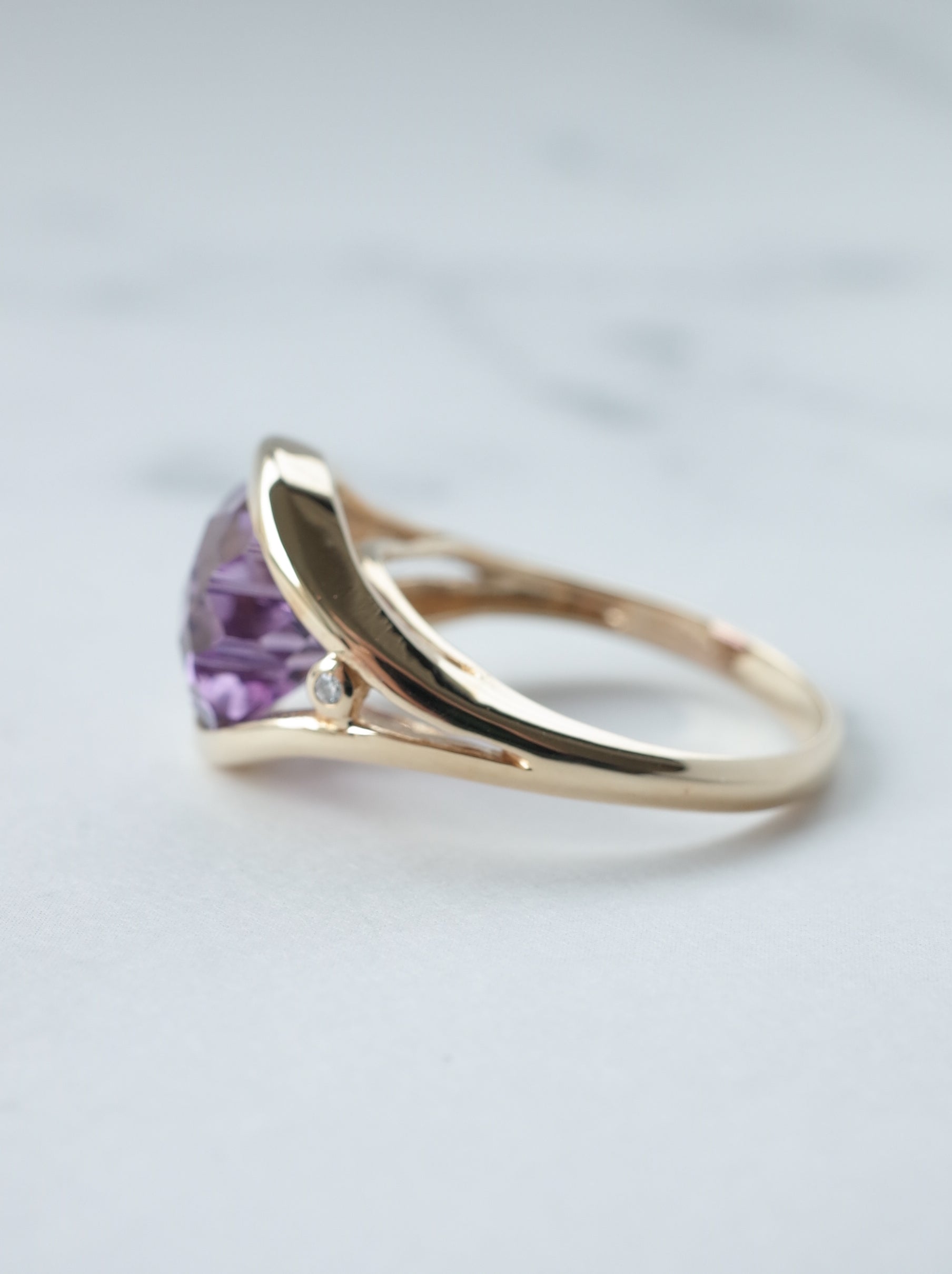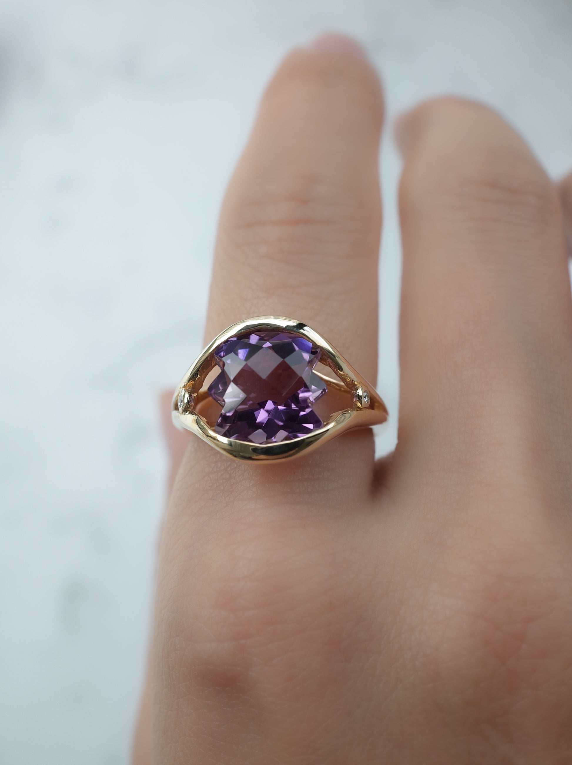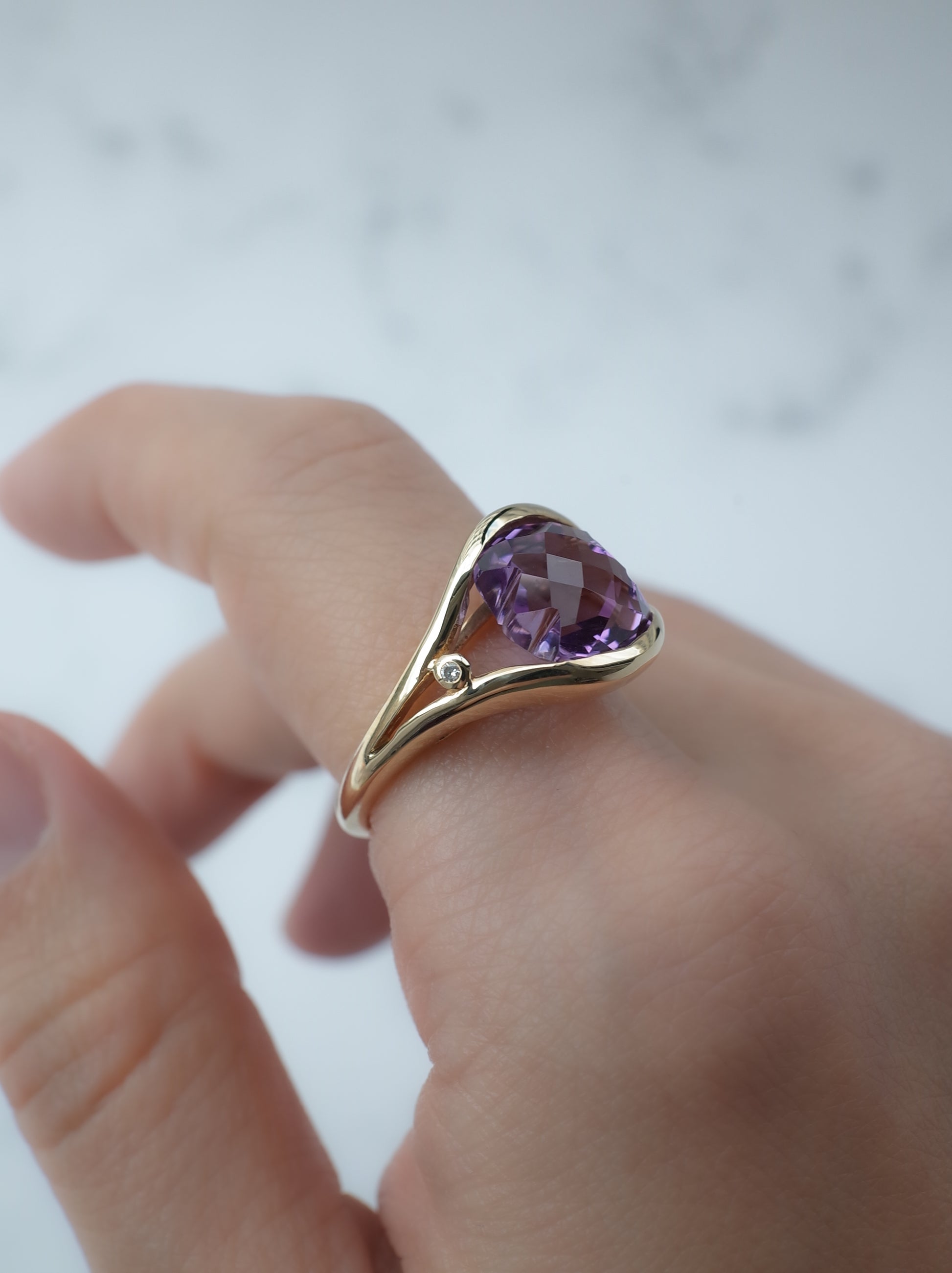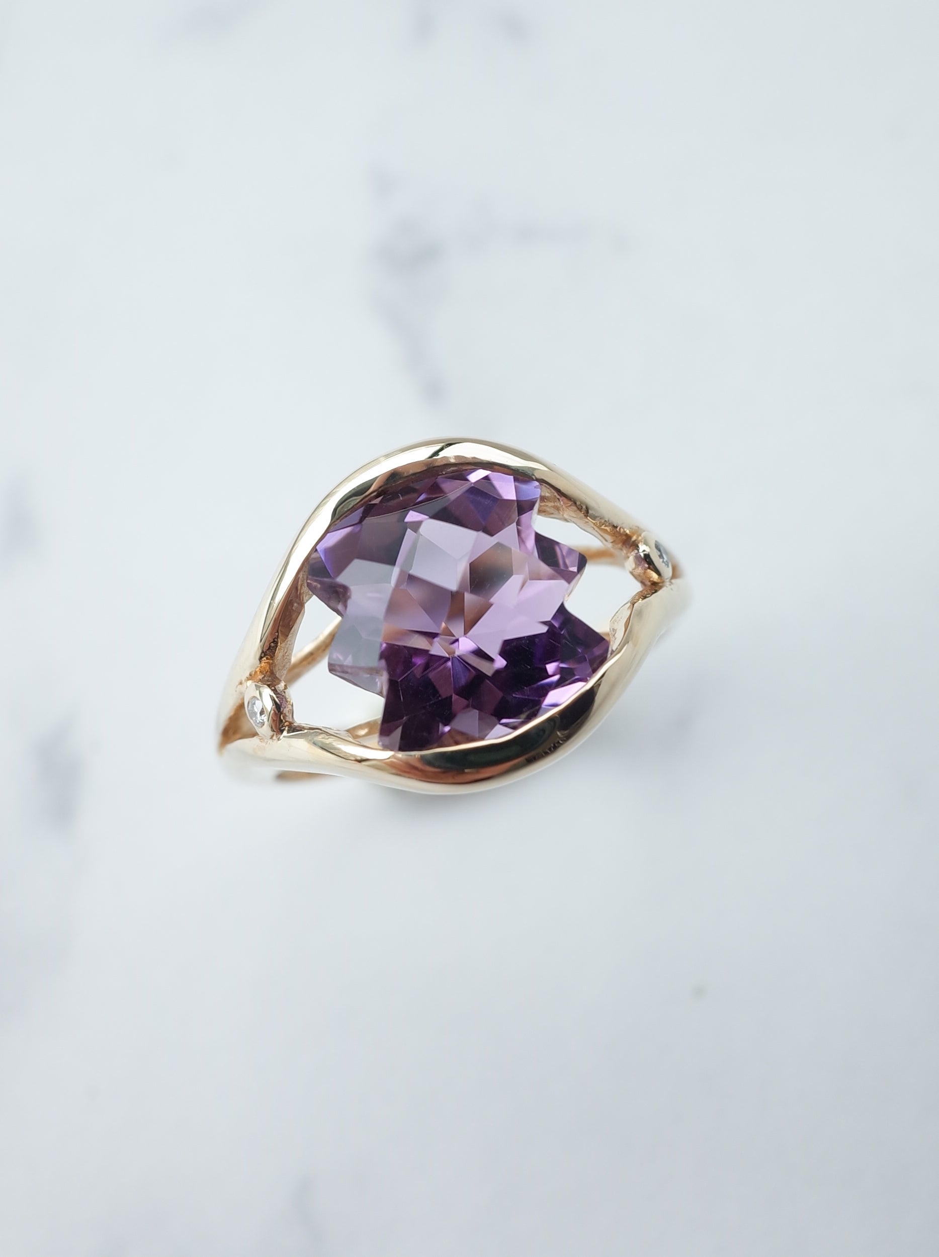両端がギザギザに切り込まれた珍しいカットのアメシスト。表面はチェッカーカットが施され、面白い石のシルエットをより引き立たせてくれています。