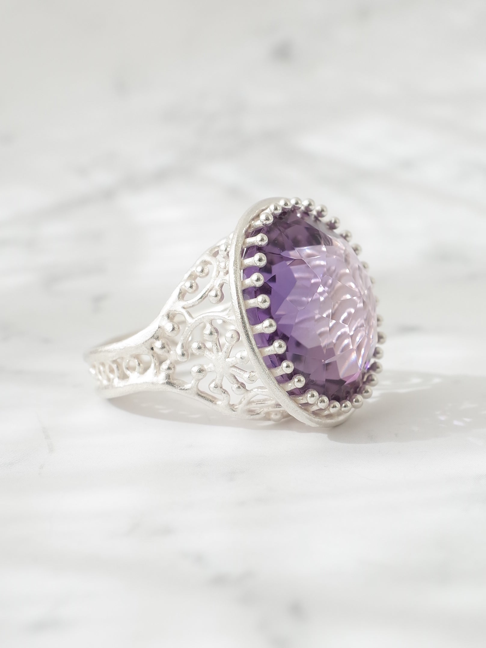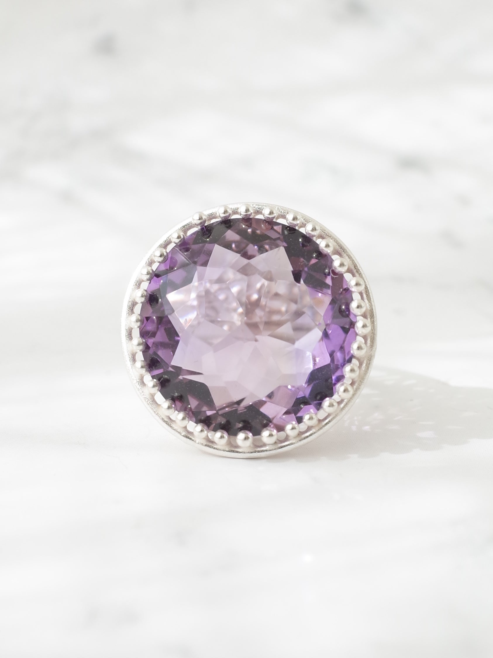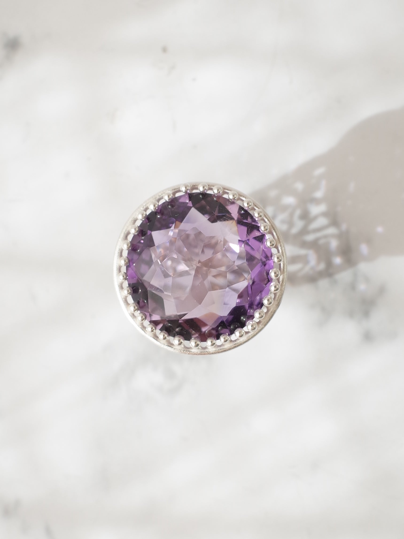 美く高貴な紫色が特徴のアメシストを使い、周囲に細かなミルグレイン装飾が施された、シンプルで存在感のあるシルバーリングです。使用しているルースは、元々両面が表に使えるようにカットされており、手元でより一際美しく煌めきます。