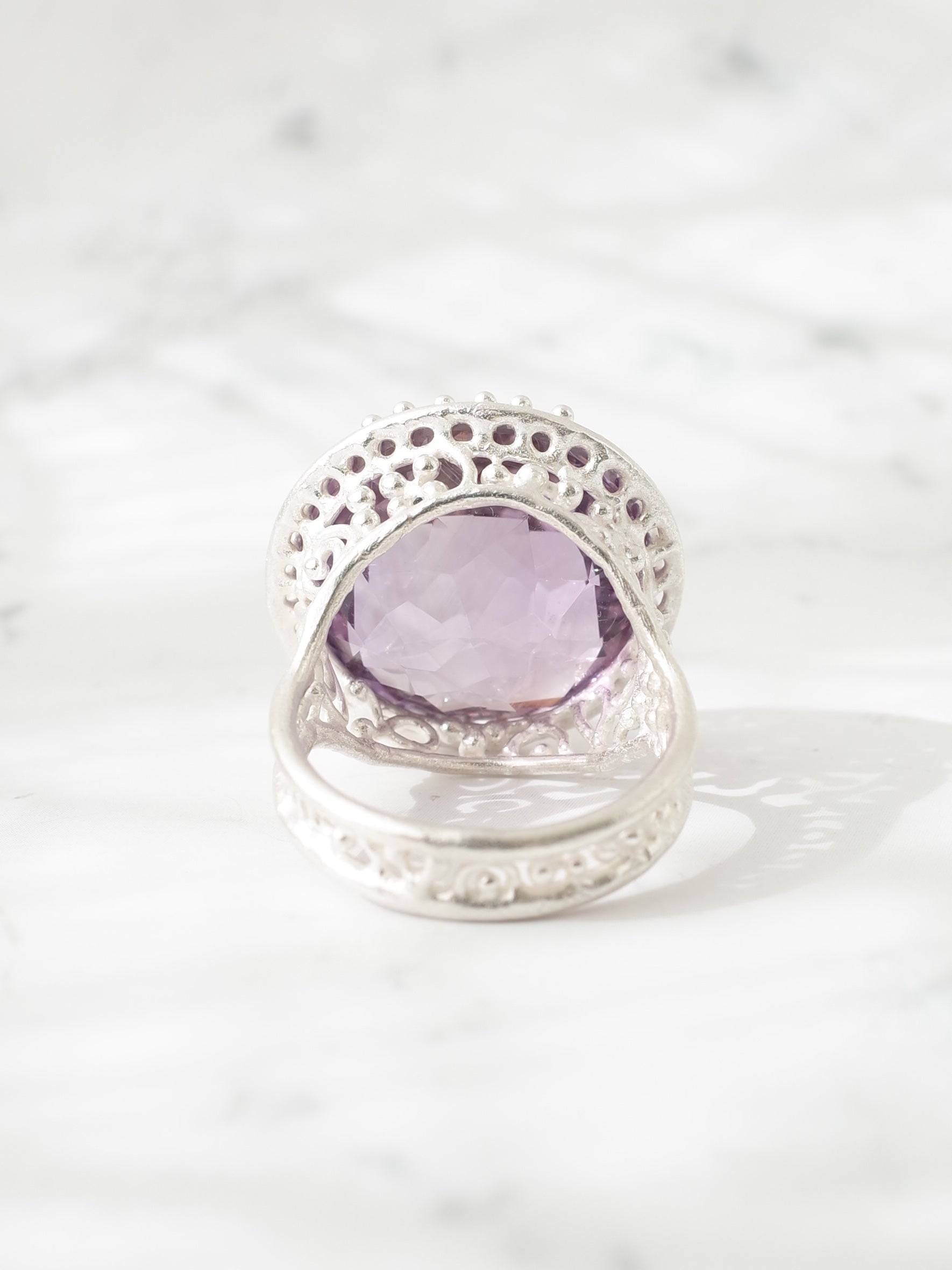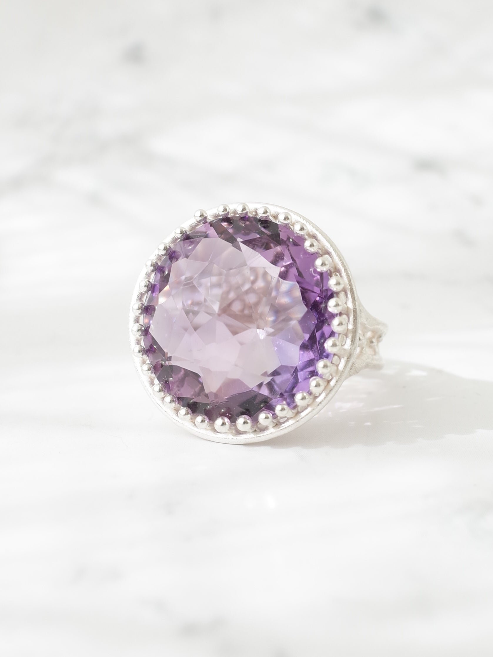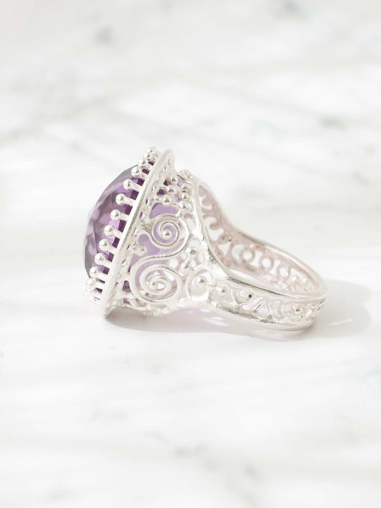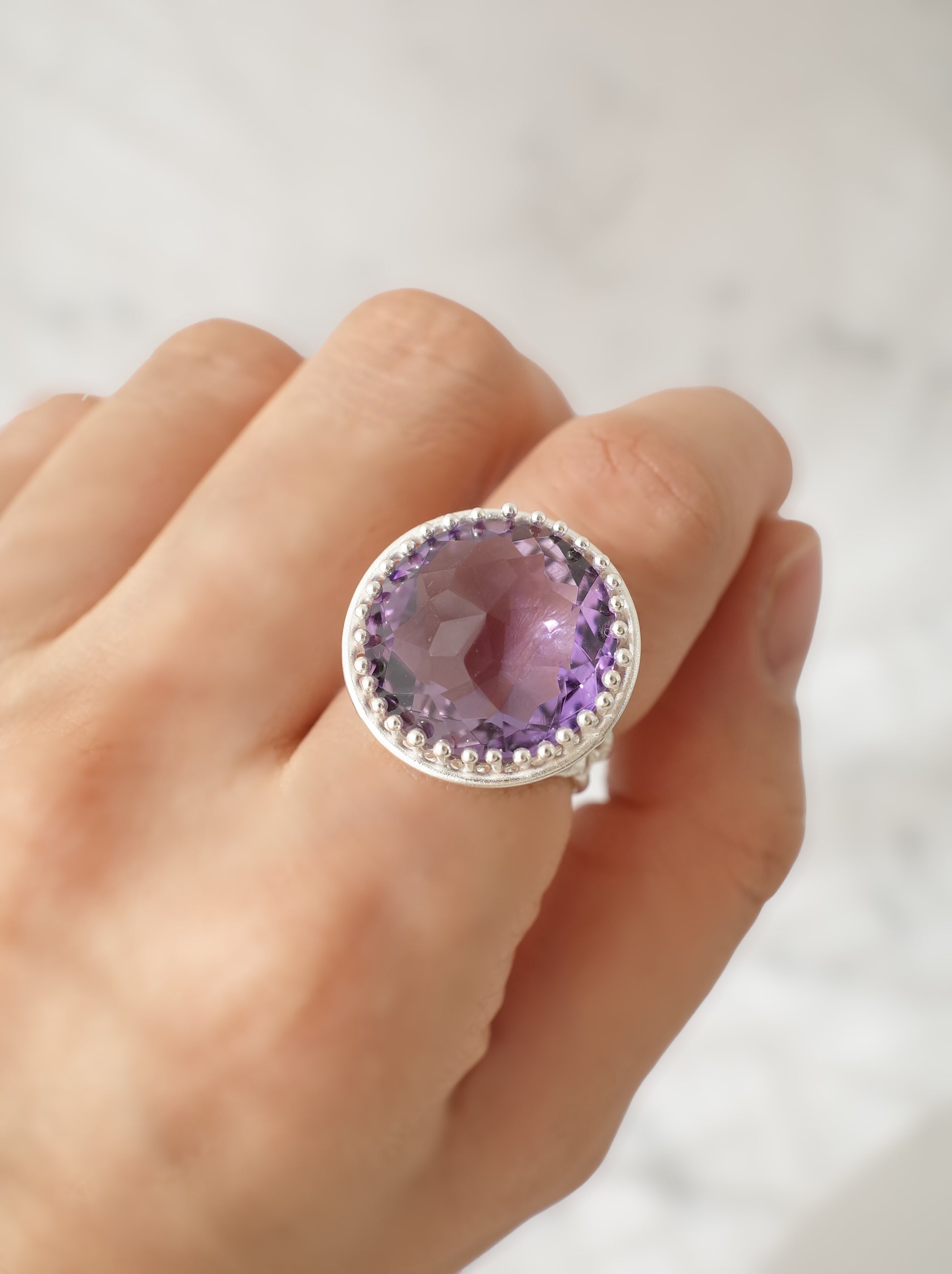 美く高貴な紫色が特徴のアメシストを使い、周囲に細かなミルグレイン装飾が施された、シンプルで存在感のあるシルバーリングです。使用しているルースは、元々両面が表に使えるようにカットされており、手元でより一際美しく煌めきます。