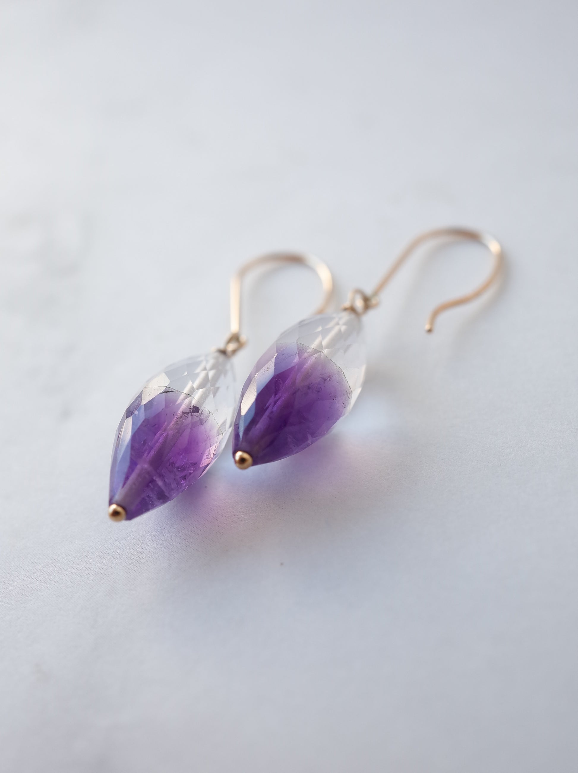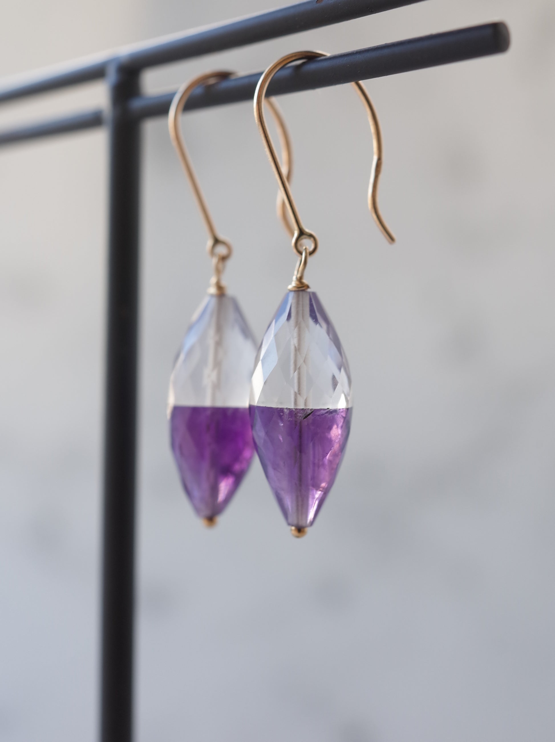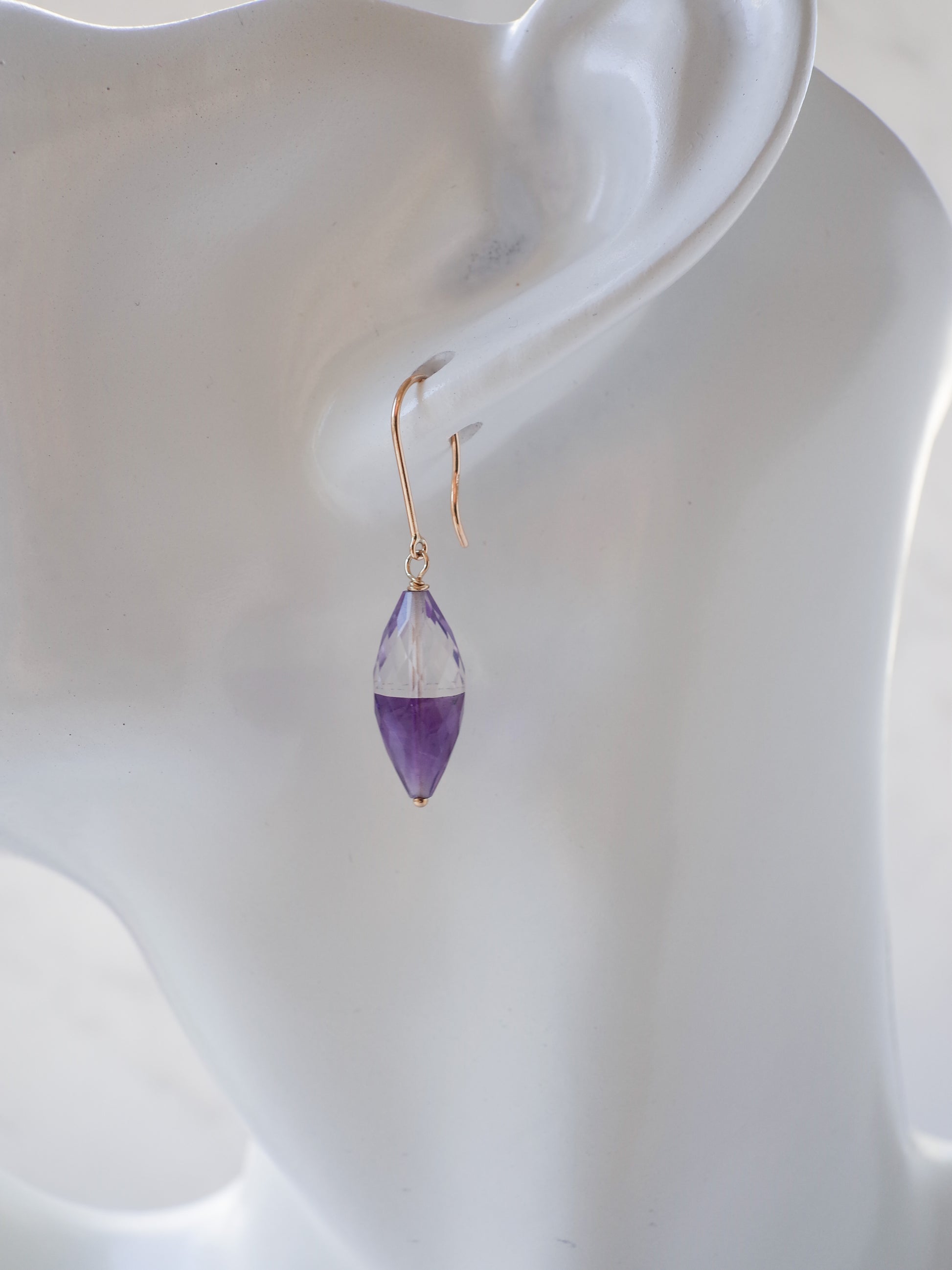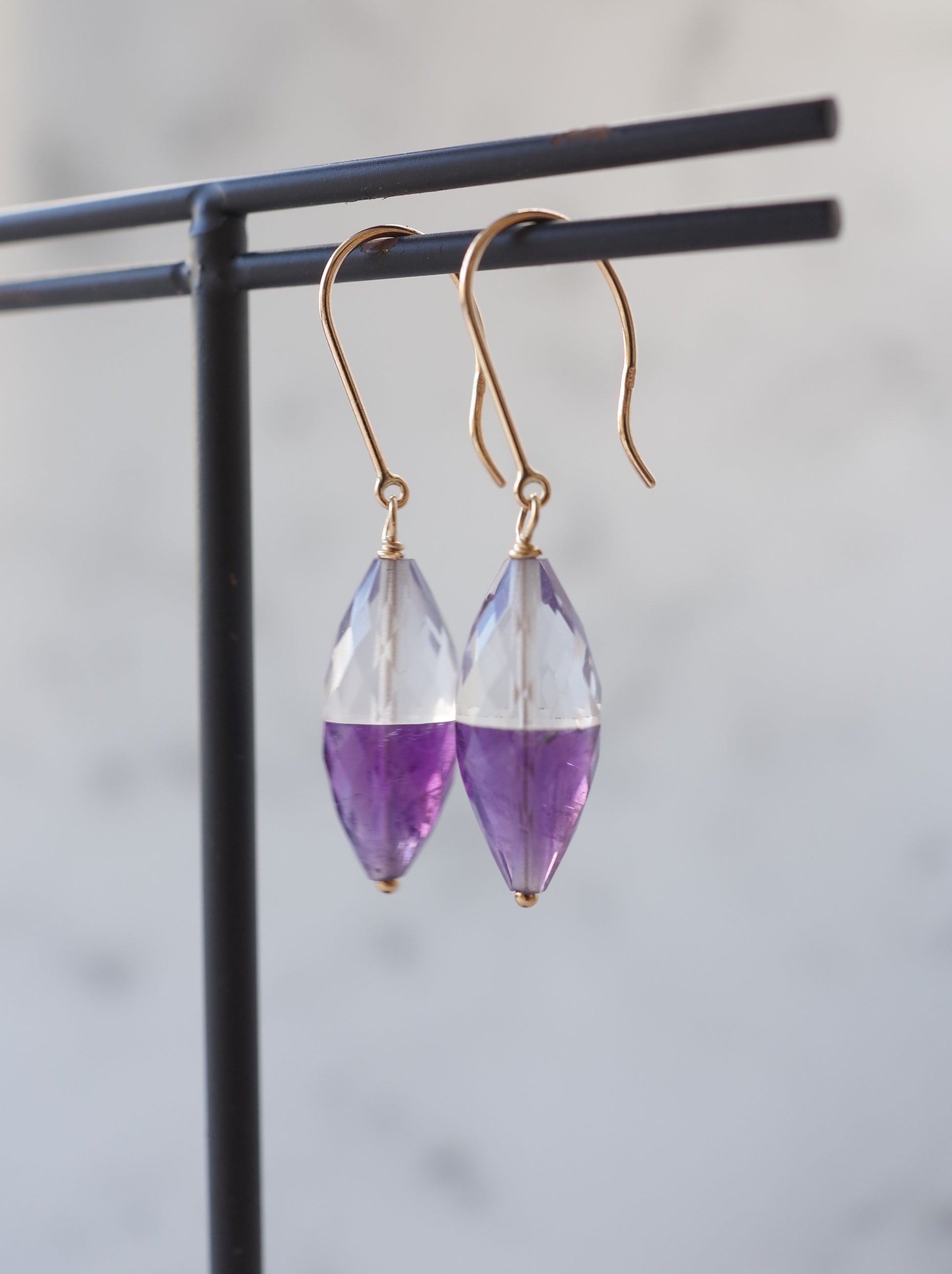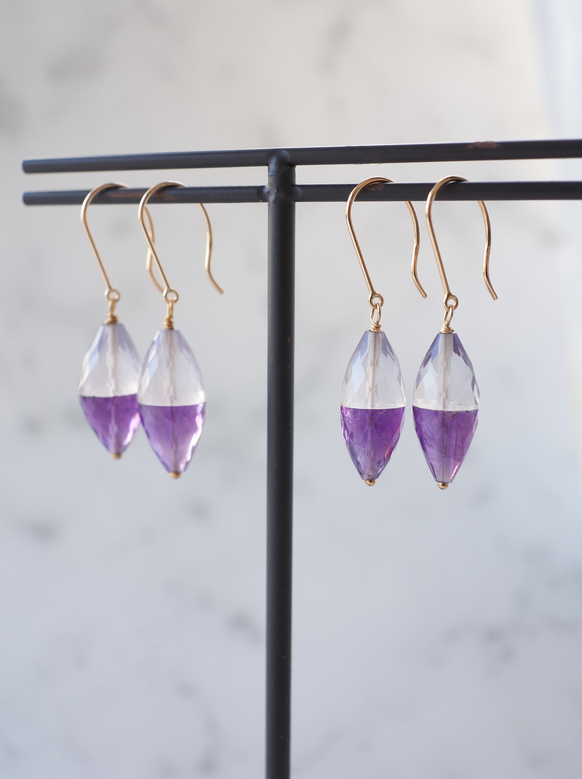 はっきりと別れた紫色とクリアなコントラストがモダンで美しいこちらのピアスに使用されているのは、アメシストと無色透明の水晶を貼り合わせたダブレットストーン。天然に生まれるグラデーションのようなバイカラーとは違って、人の手が加えられたパッキリとしたクールなラインが特徴的です。是非ファッションのアクセントにお楽しみください。