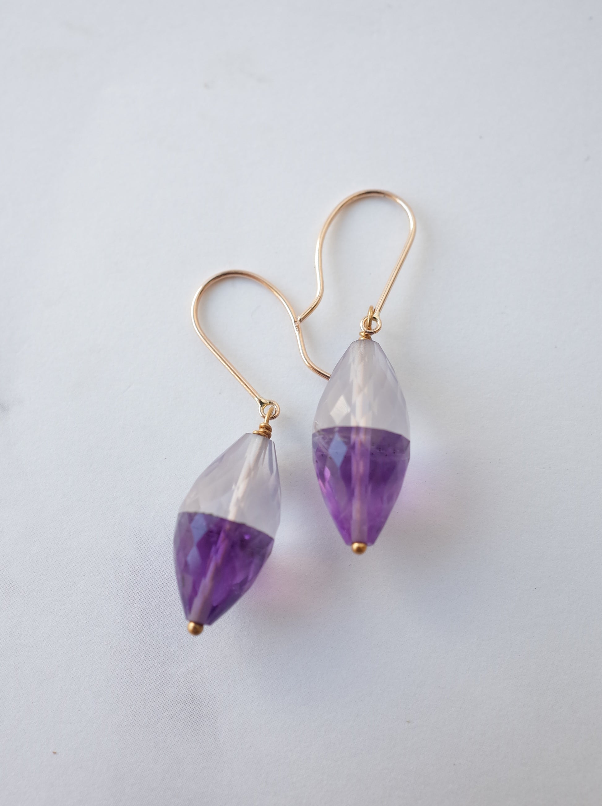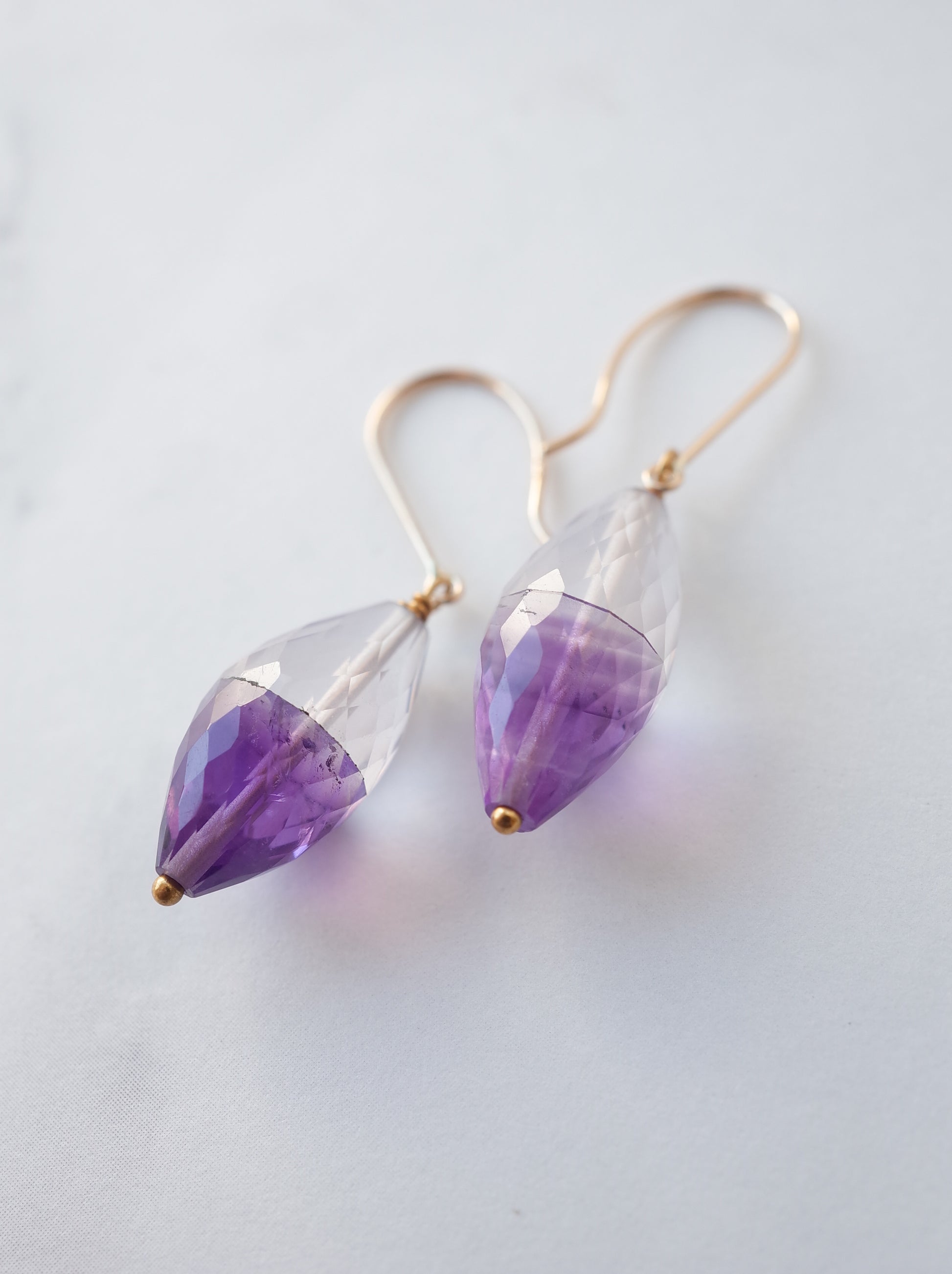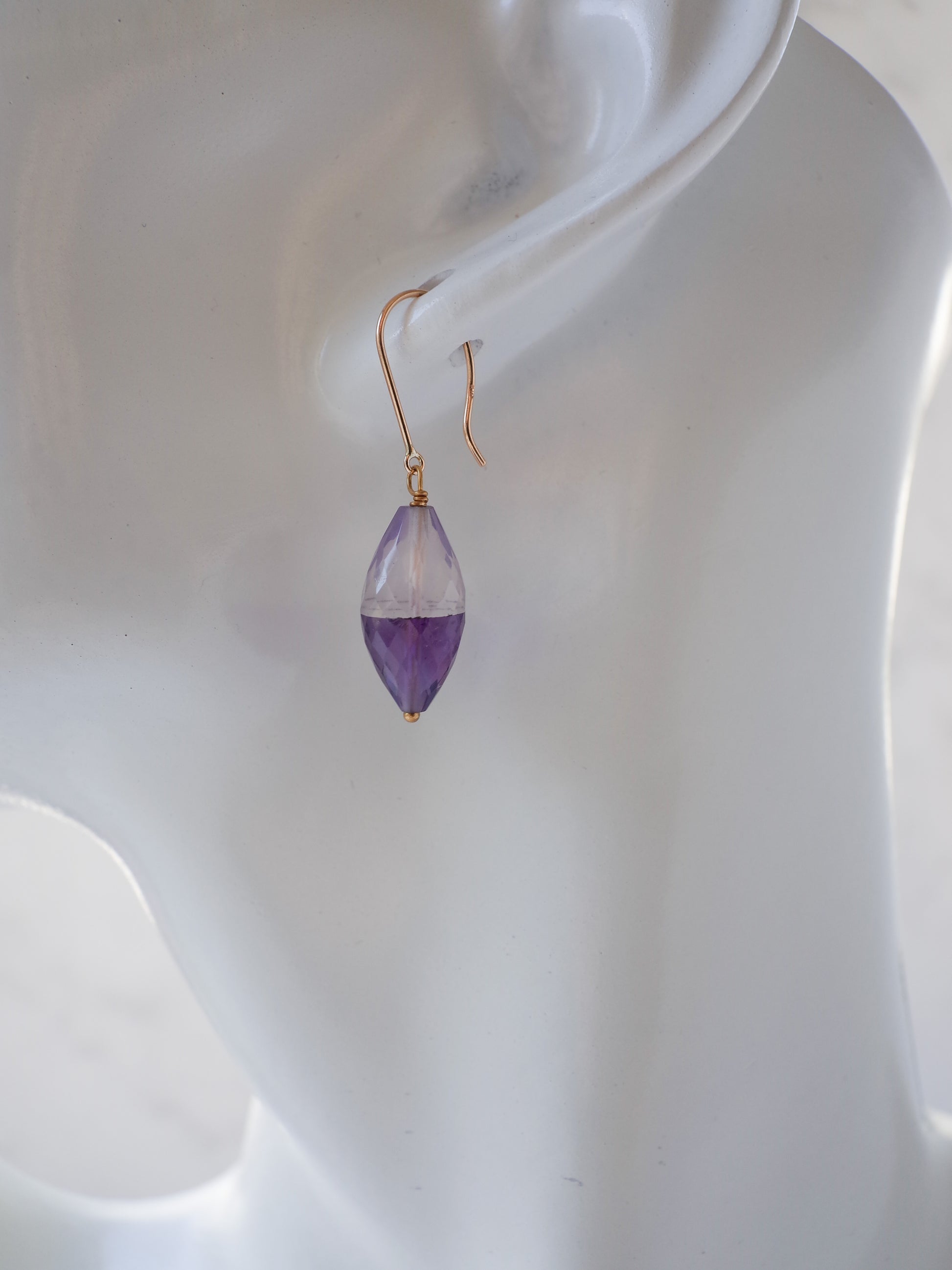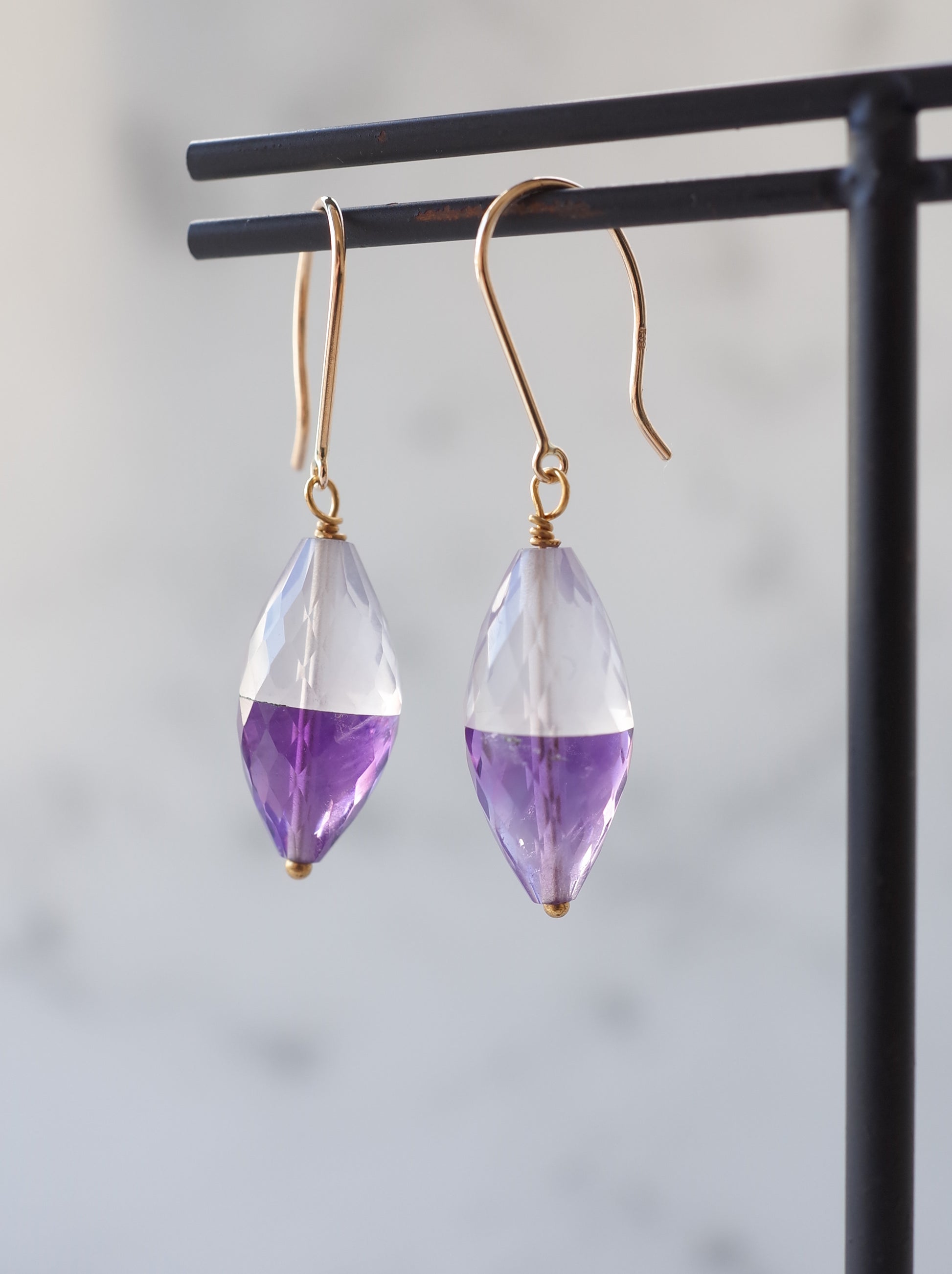 はっきりと別れた紫色とクリアなコントラストがモダンで美しいこちらのピアスに使用されているのは、アメシストと無色透明の水晶を貼り合わせたダブレットストーン。天然に生まれるグラデーションのようなバイカラーとは違って、人の手が加えられたパッキリとしたクールなラインが特徴的です。是非ファッションのアクセントにお楽しみください。