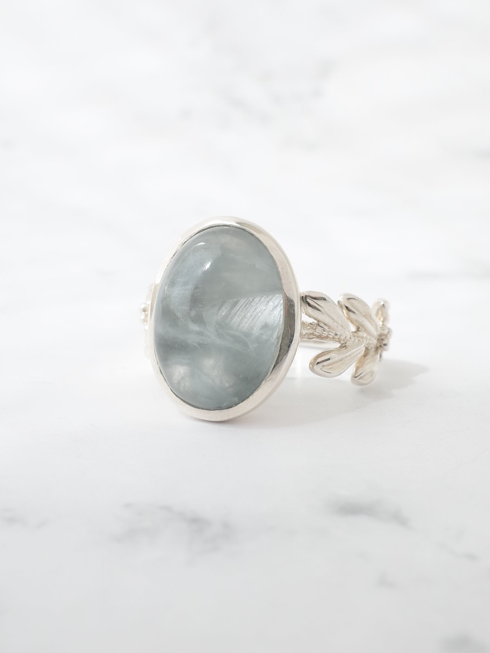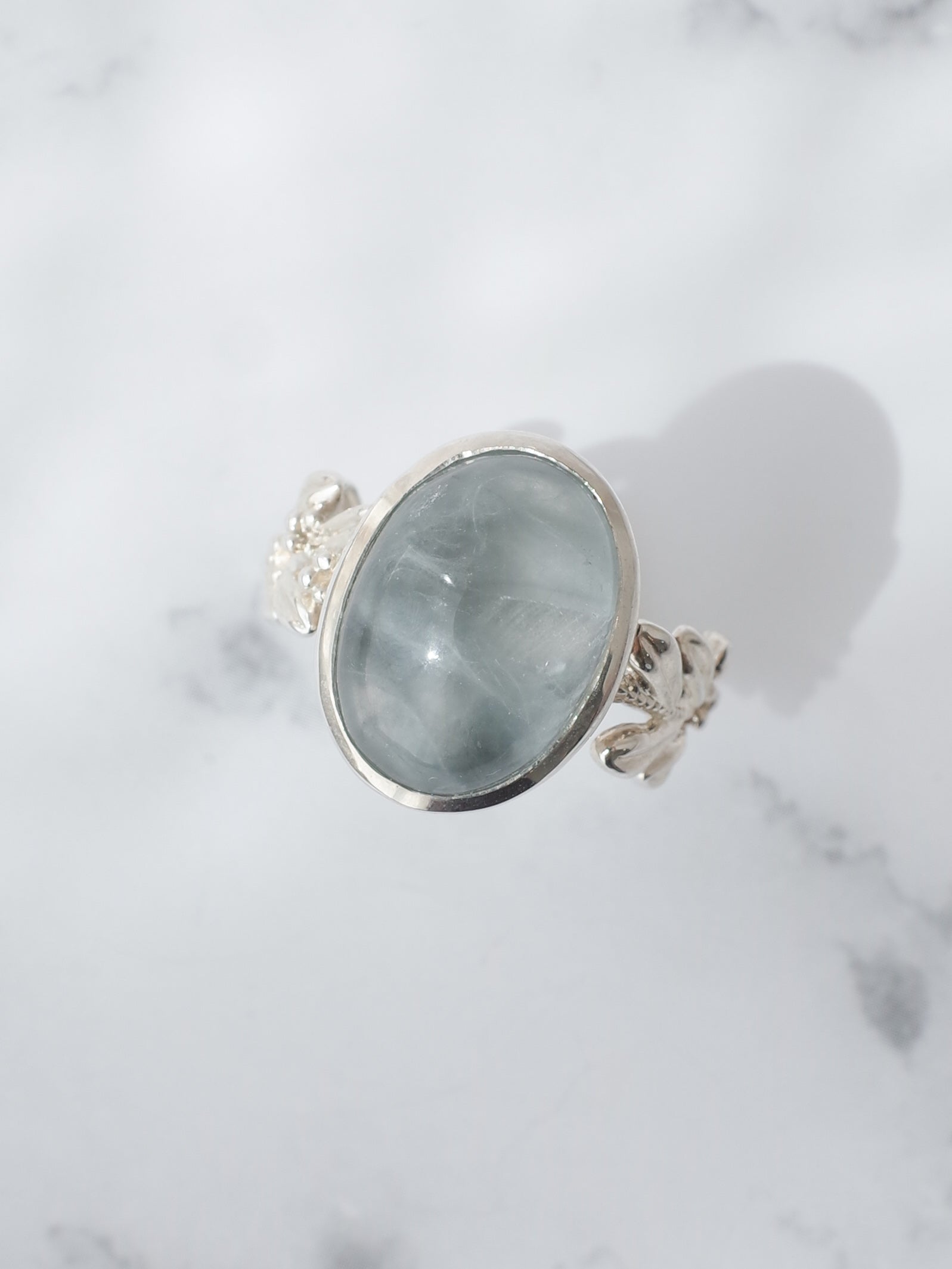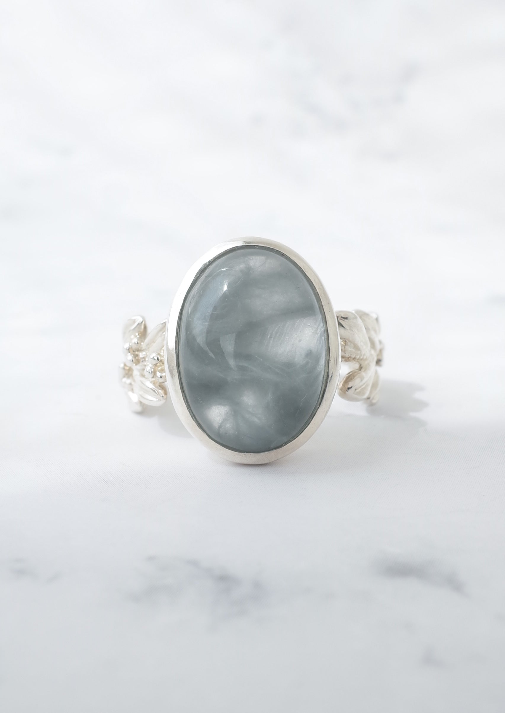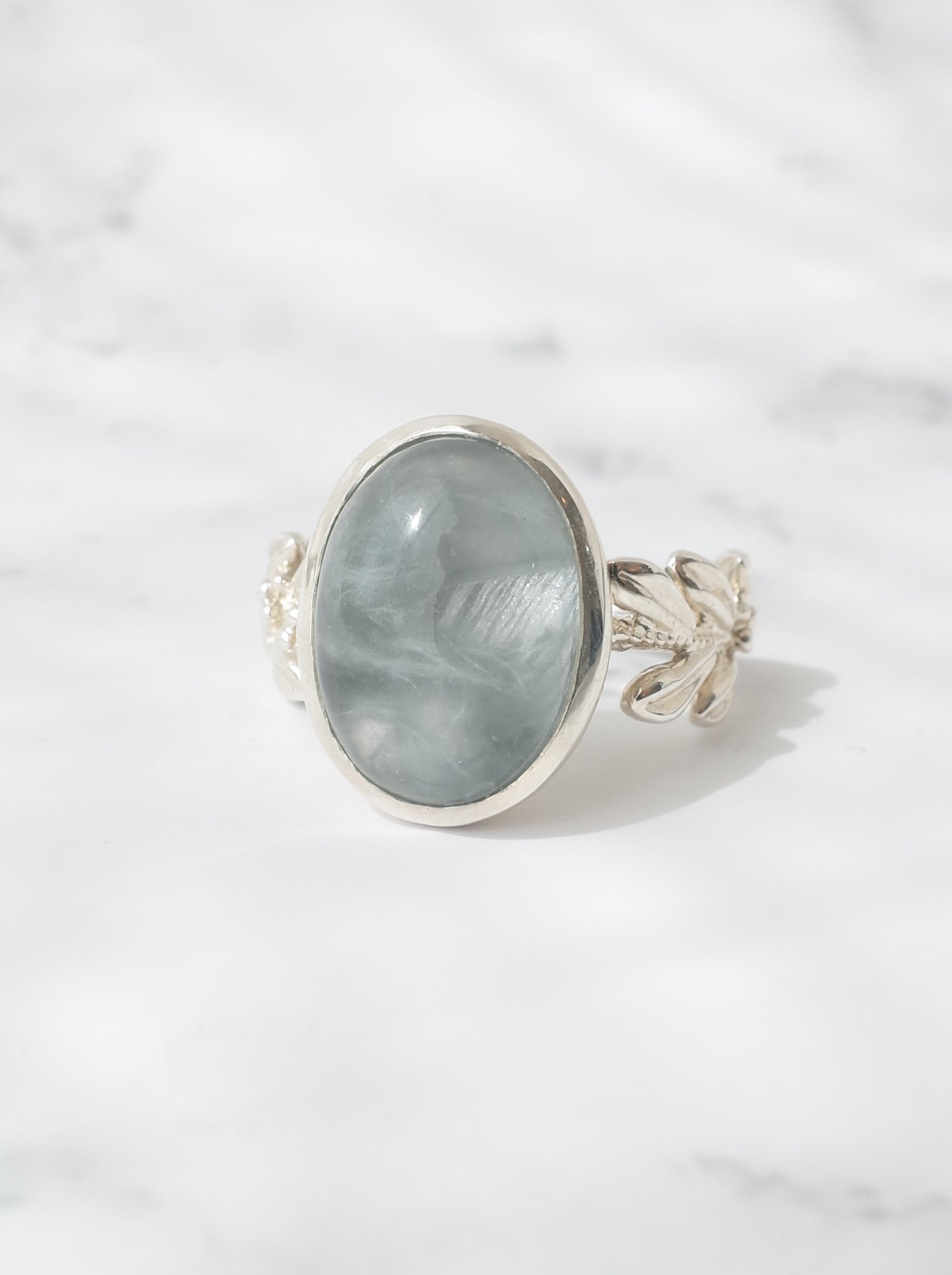 独特な色合いのふわふわとした繊維状のインクルージョンが魅力的なアンフィボールインクォーツのリング。一般的に白〜暖色が多い天然石ですが、こちらはシックなブルーグレーの色合いで、内部に水晶の結晶が見られる珍しいタイプです。