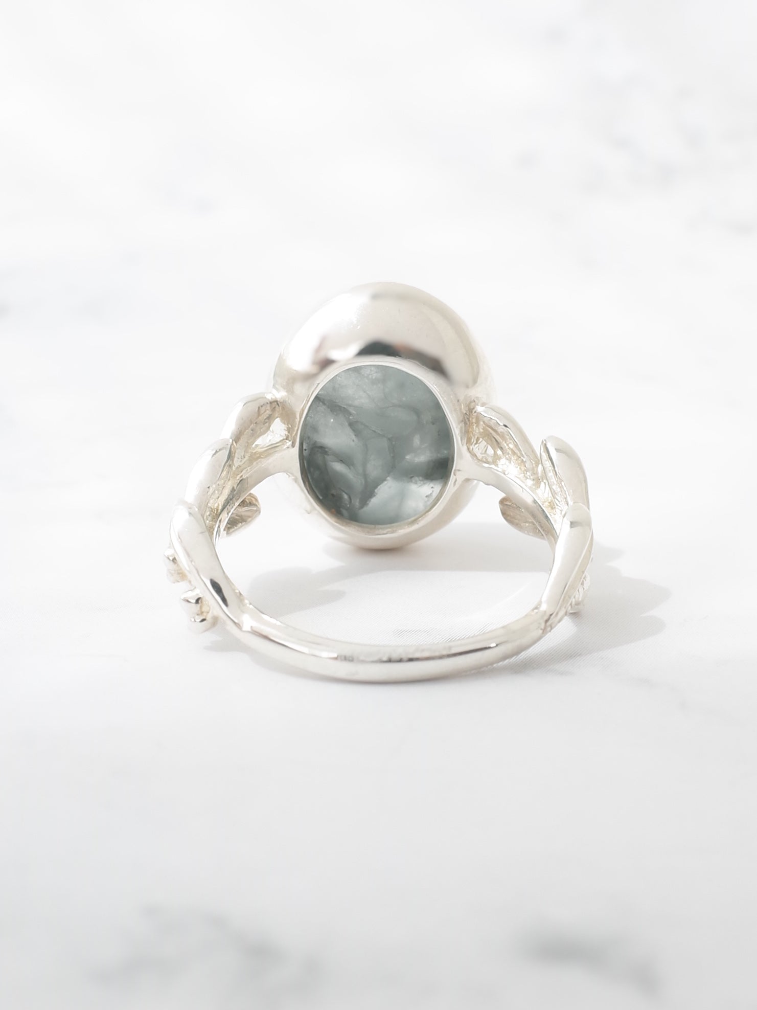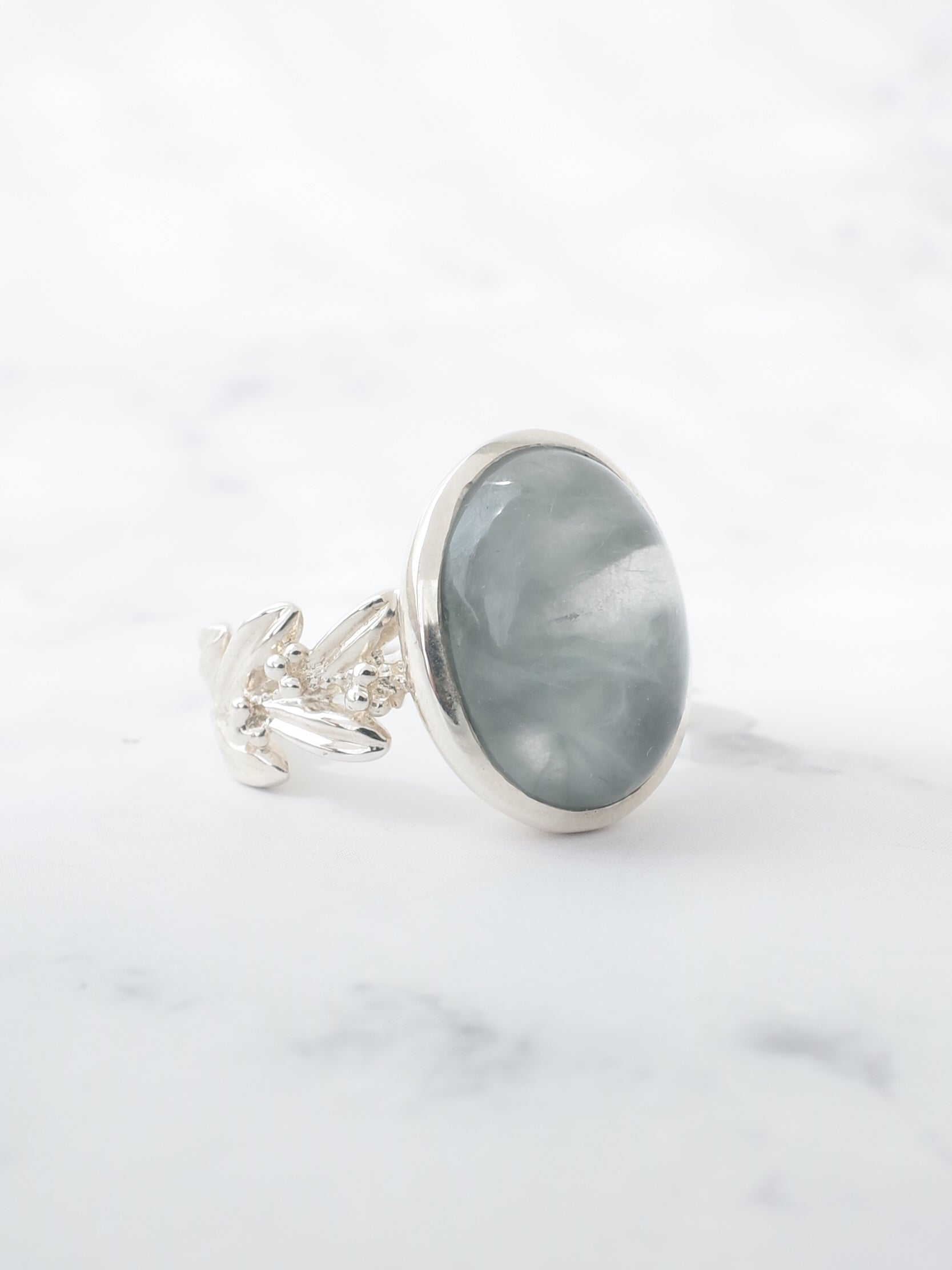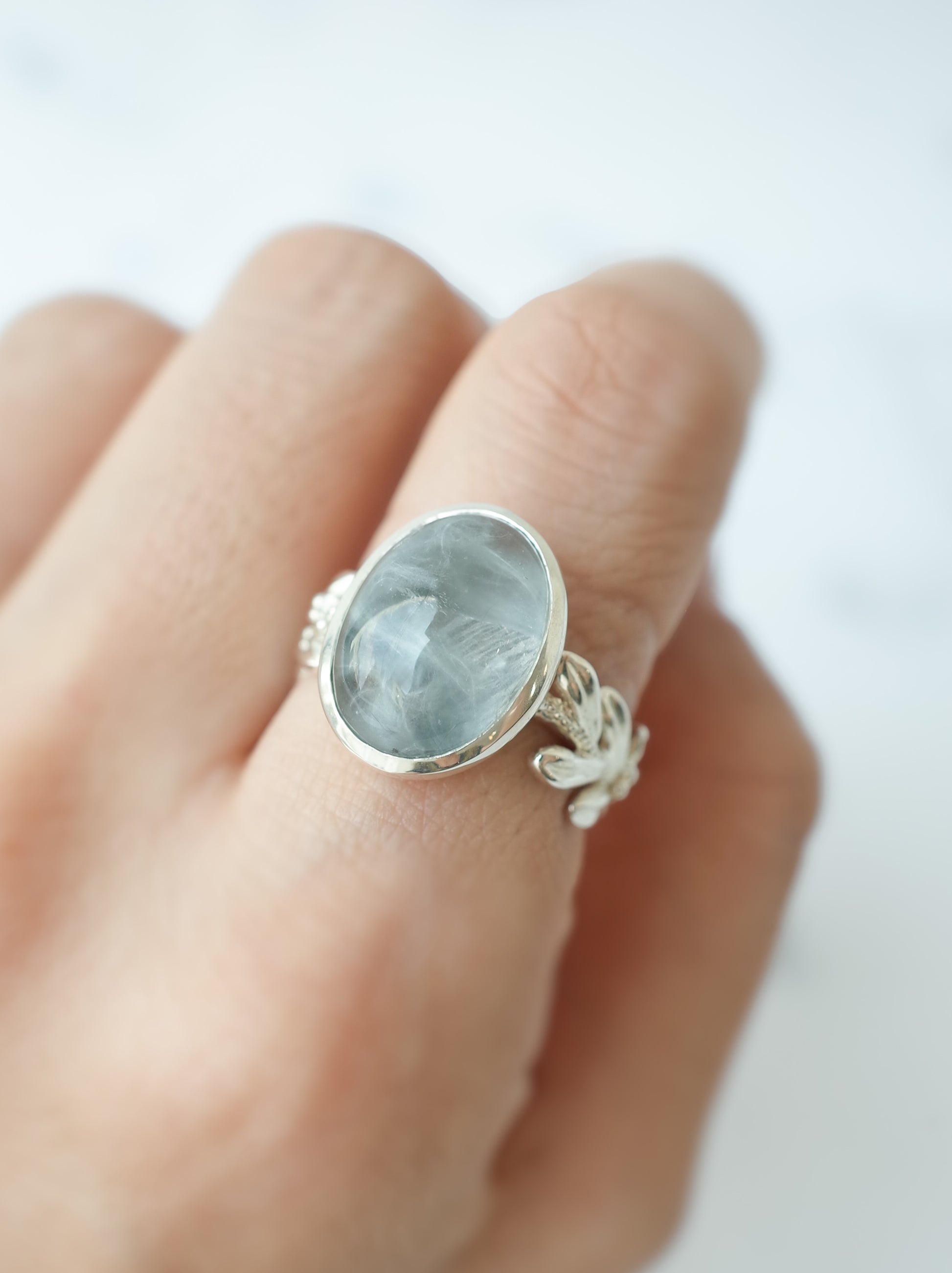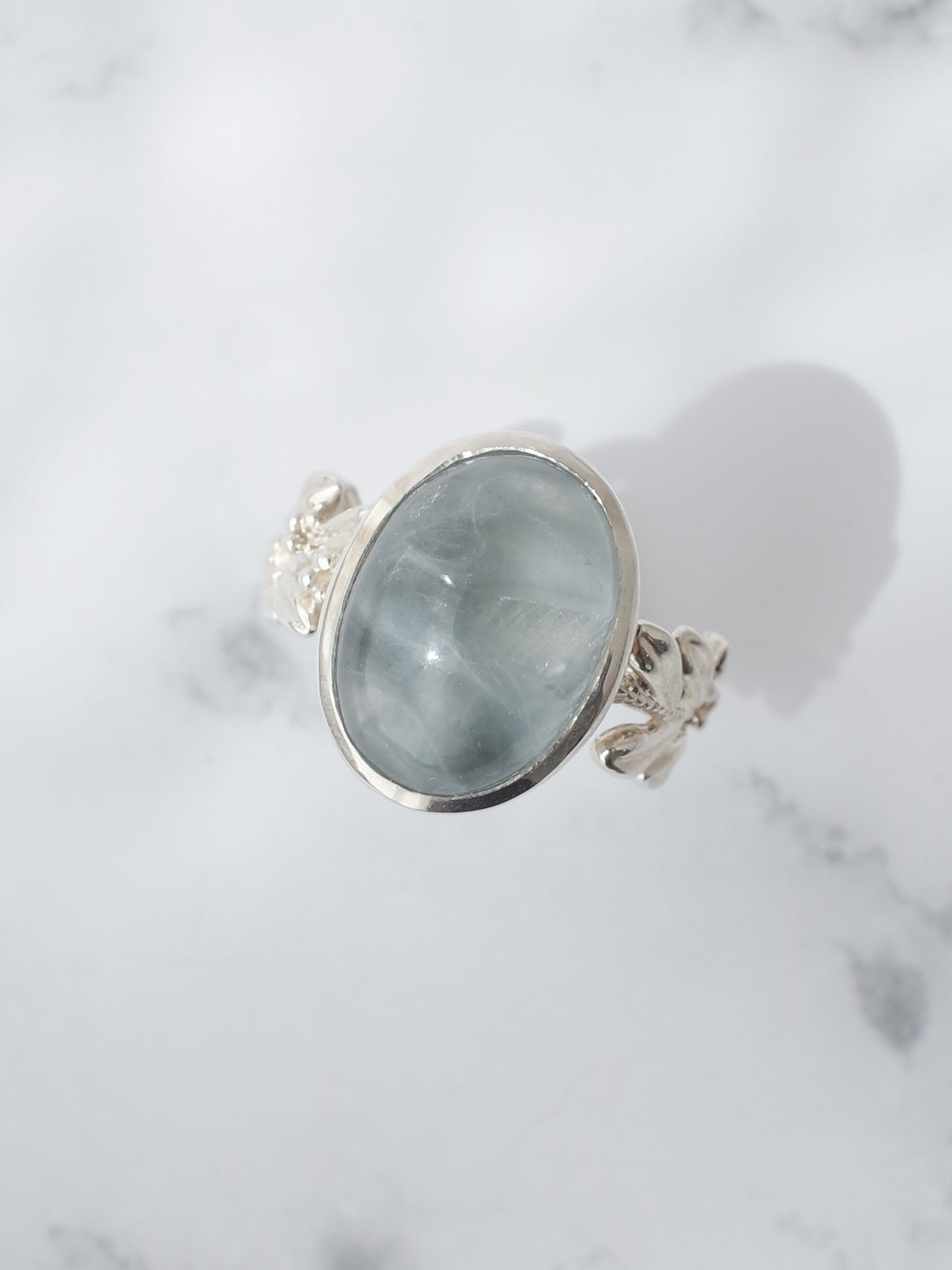 独特な色合いのふわふわとした繊維状のインクルージョンが魅力的なアンフィボールインクォーツのリング。一般的に白〜暖色が多い天然石ですが、こちらはシックなブルーグレーの色合いで、内部に水晶の結晶が見られる珍しいタイプです。