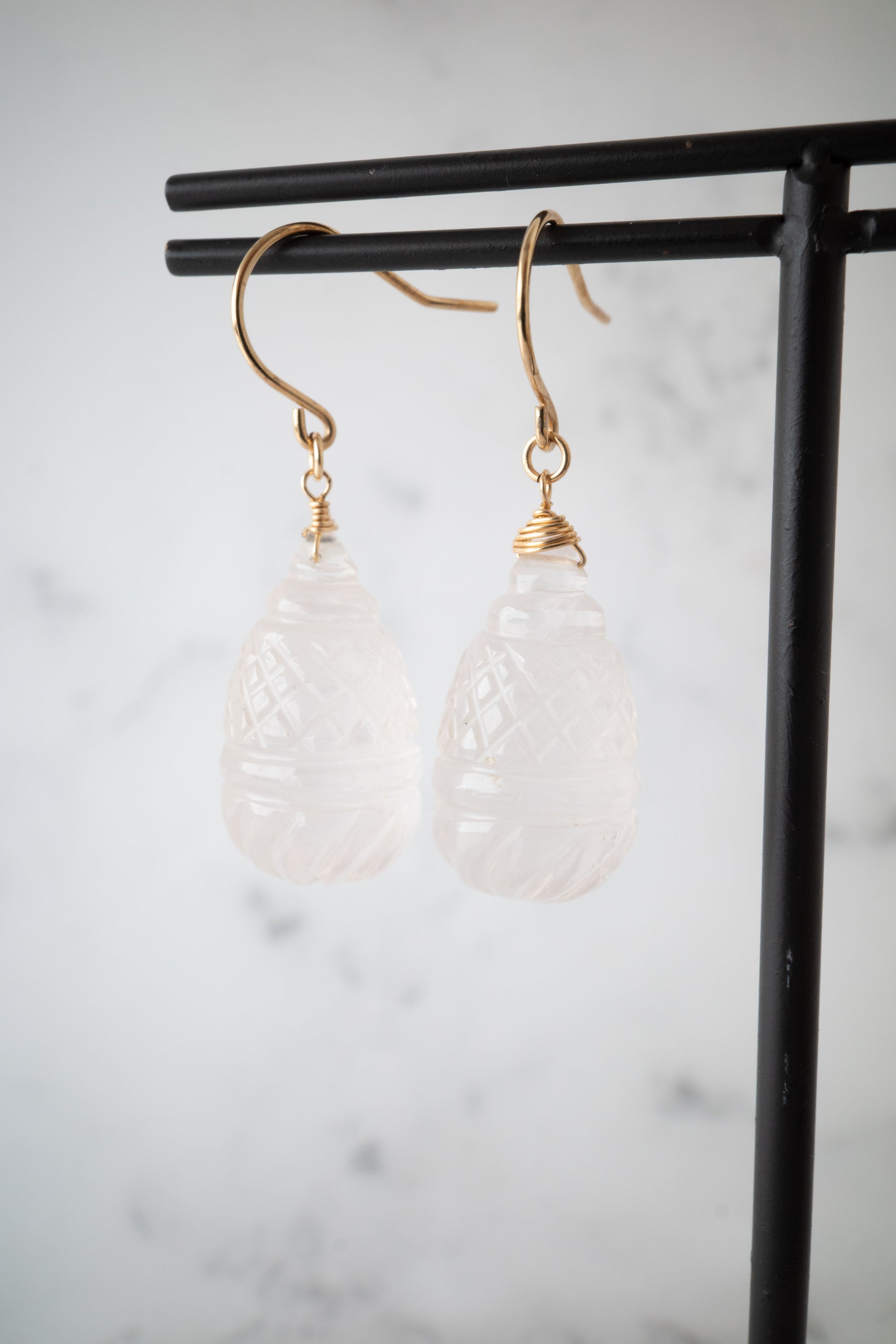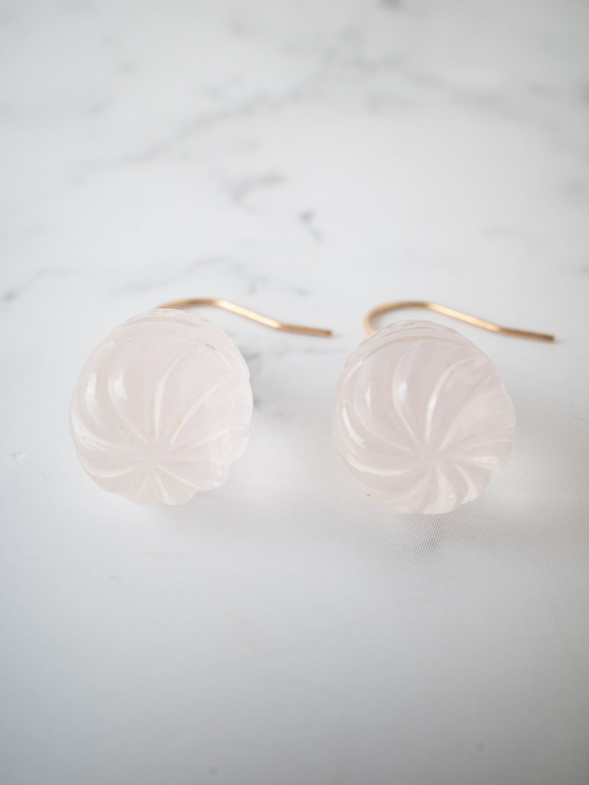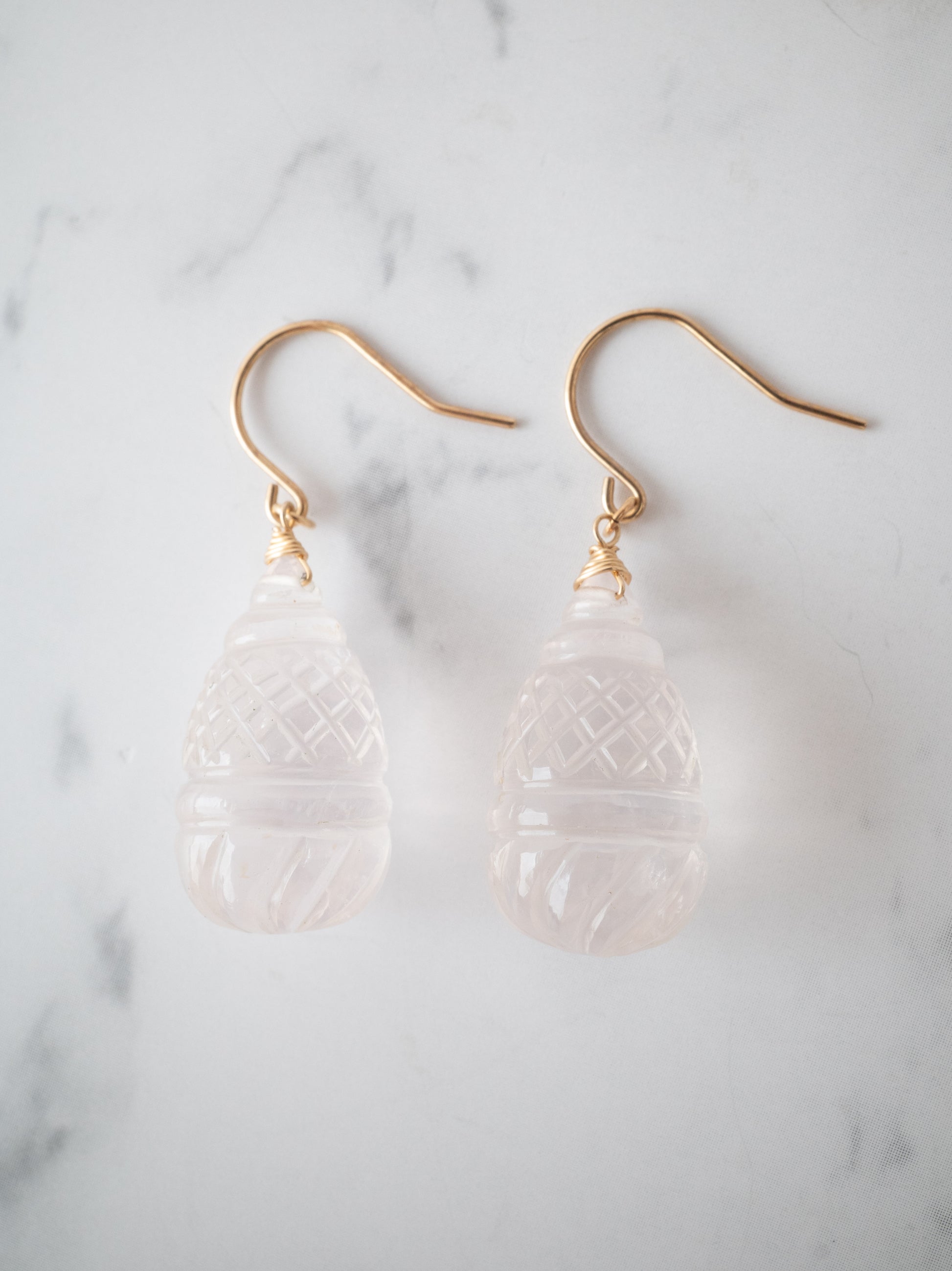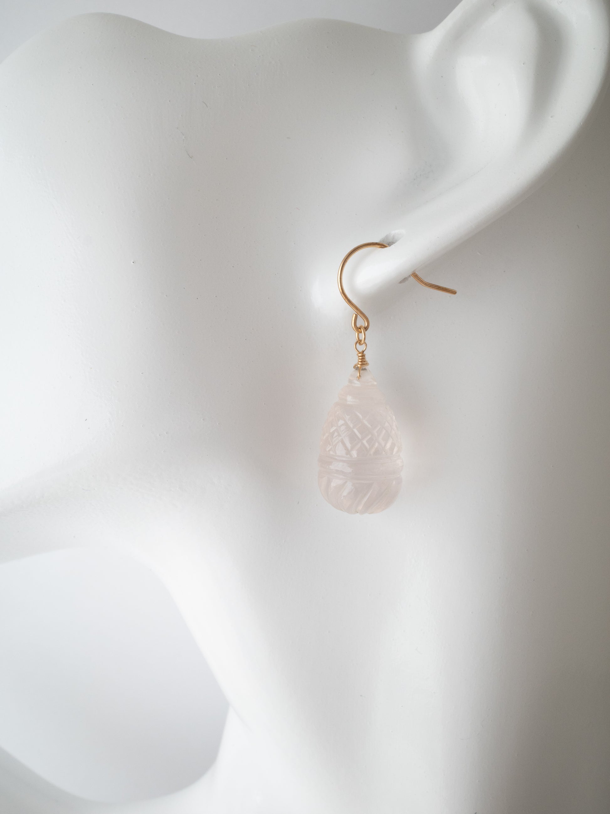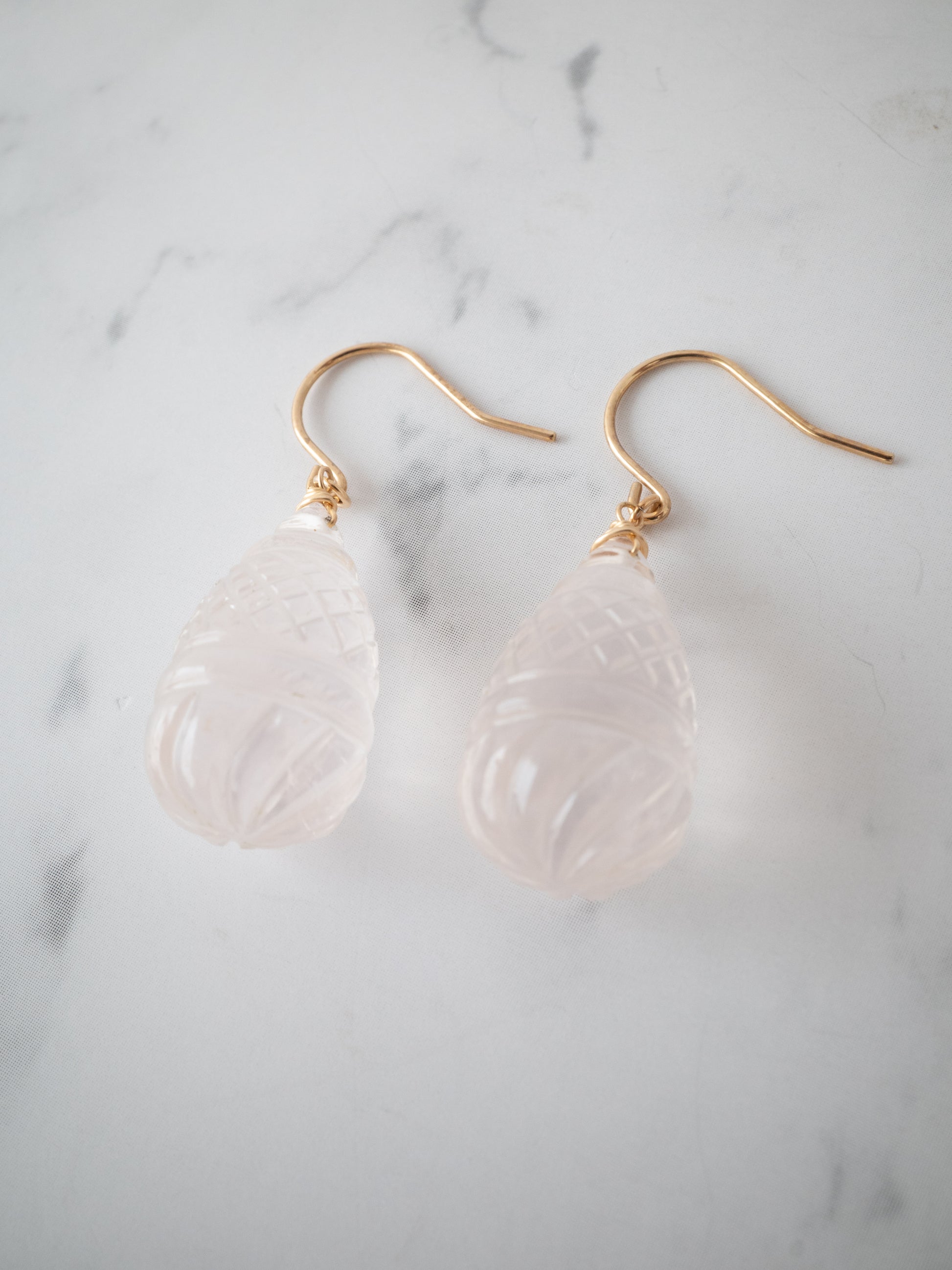 インドの伝統的模様を天然石に彫り入れたピアスシリーズ。シンプルなフックタイプのドロップピアスですが、独特のムガールパターンや、カービングによる陰影が、さりげない個性を演出してくれます。