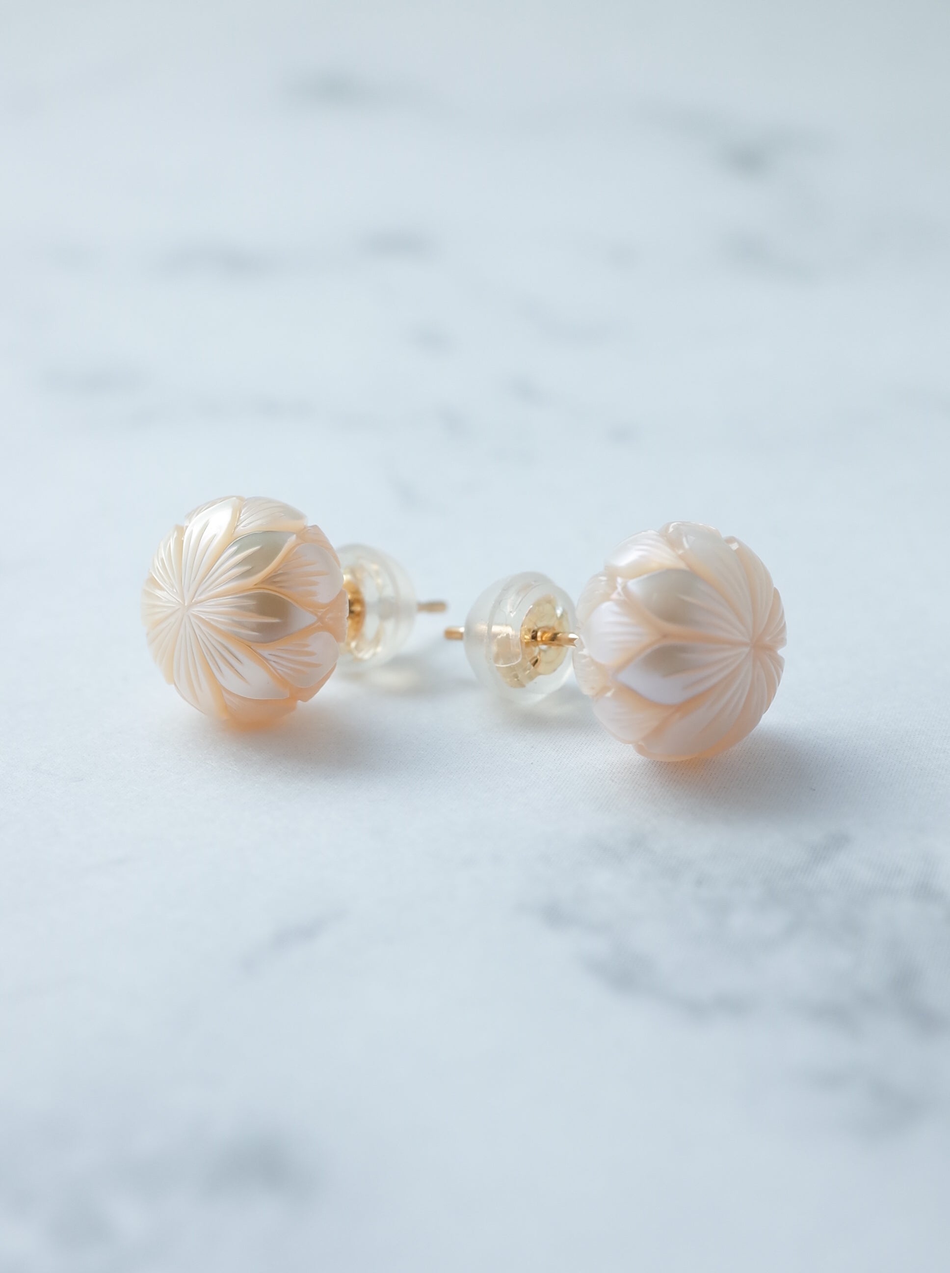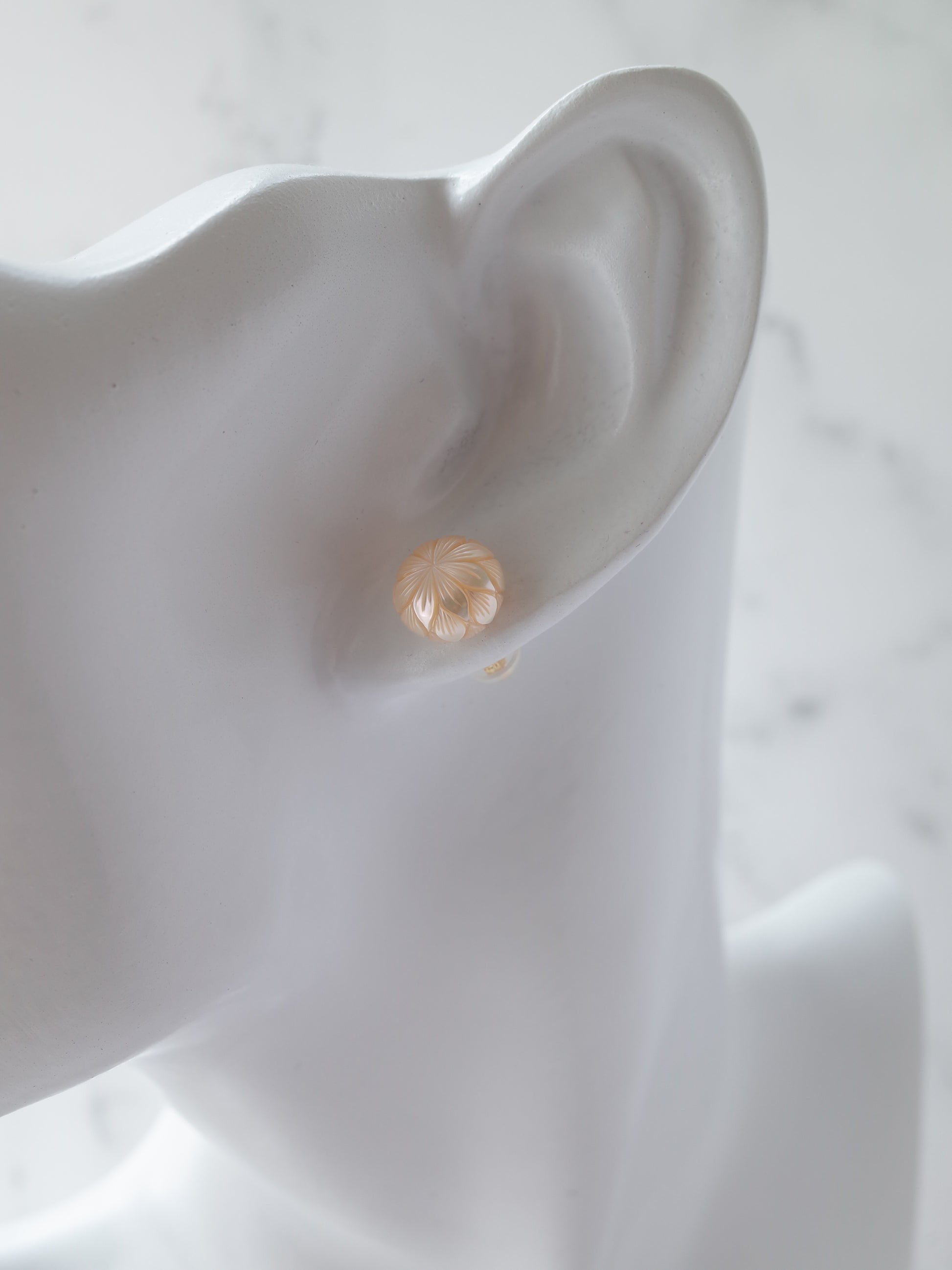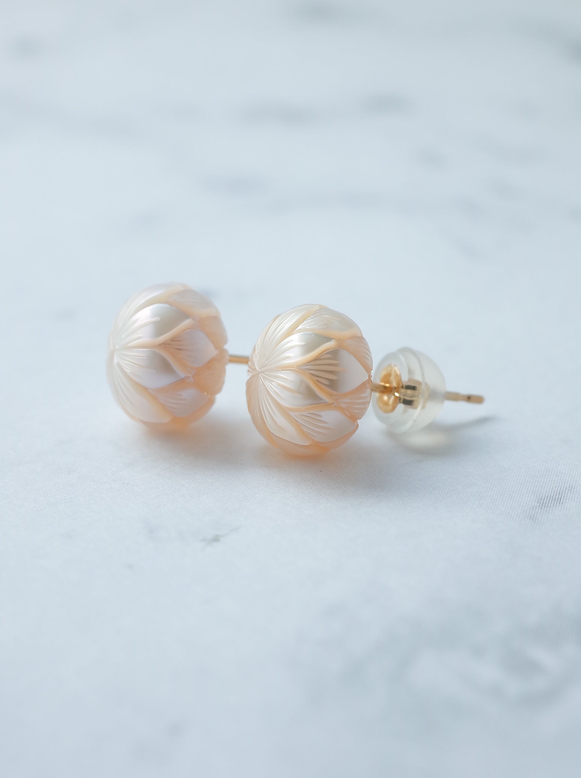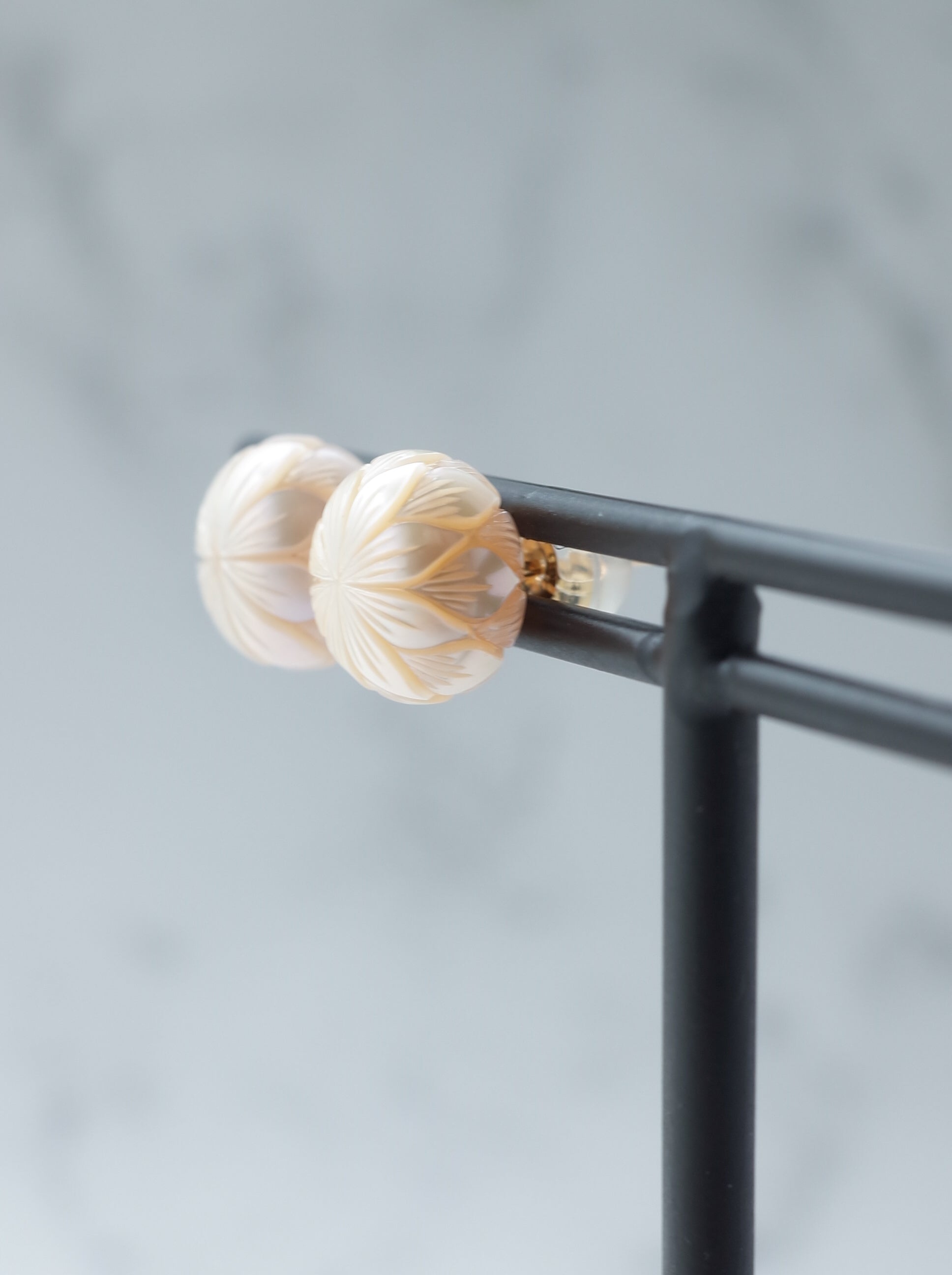 こちらはアメリカ人のアーティストが彫り模様を施した淡水パールのピアス。ありきたりになりがちな真珠の一粒ピアスにちょっと花を添えるアイテムです。