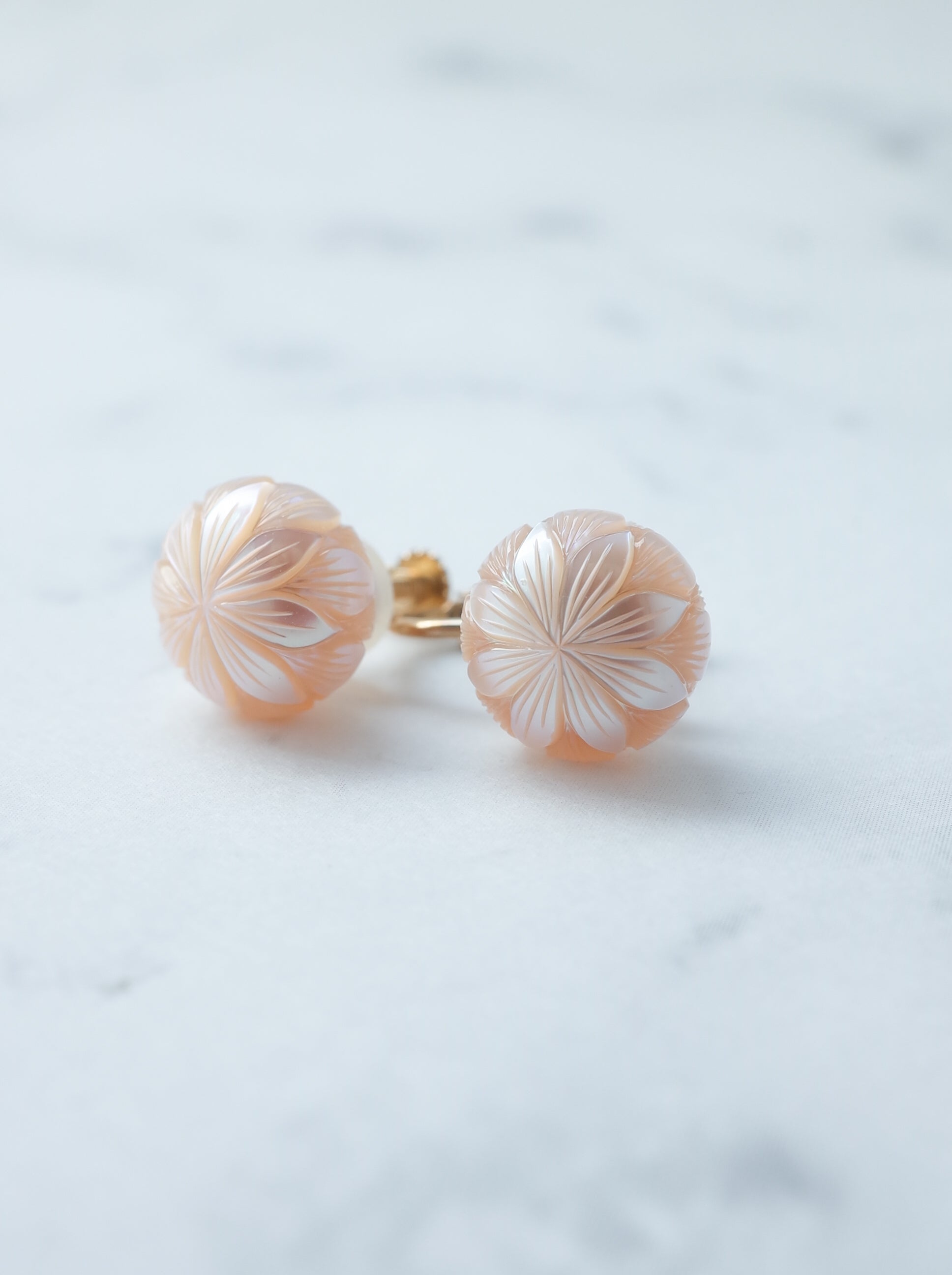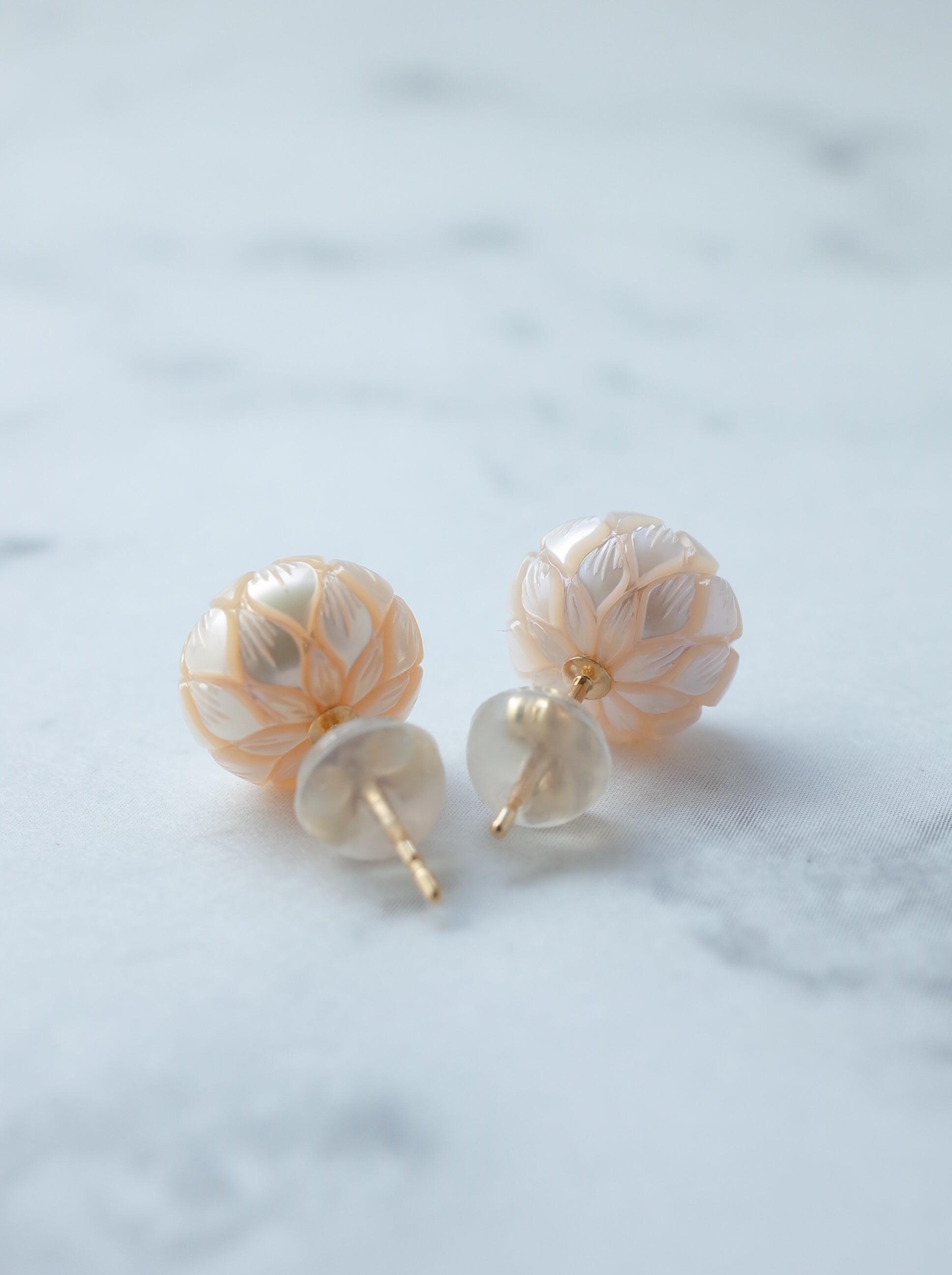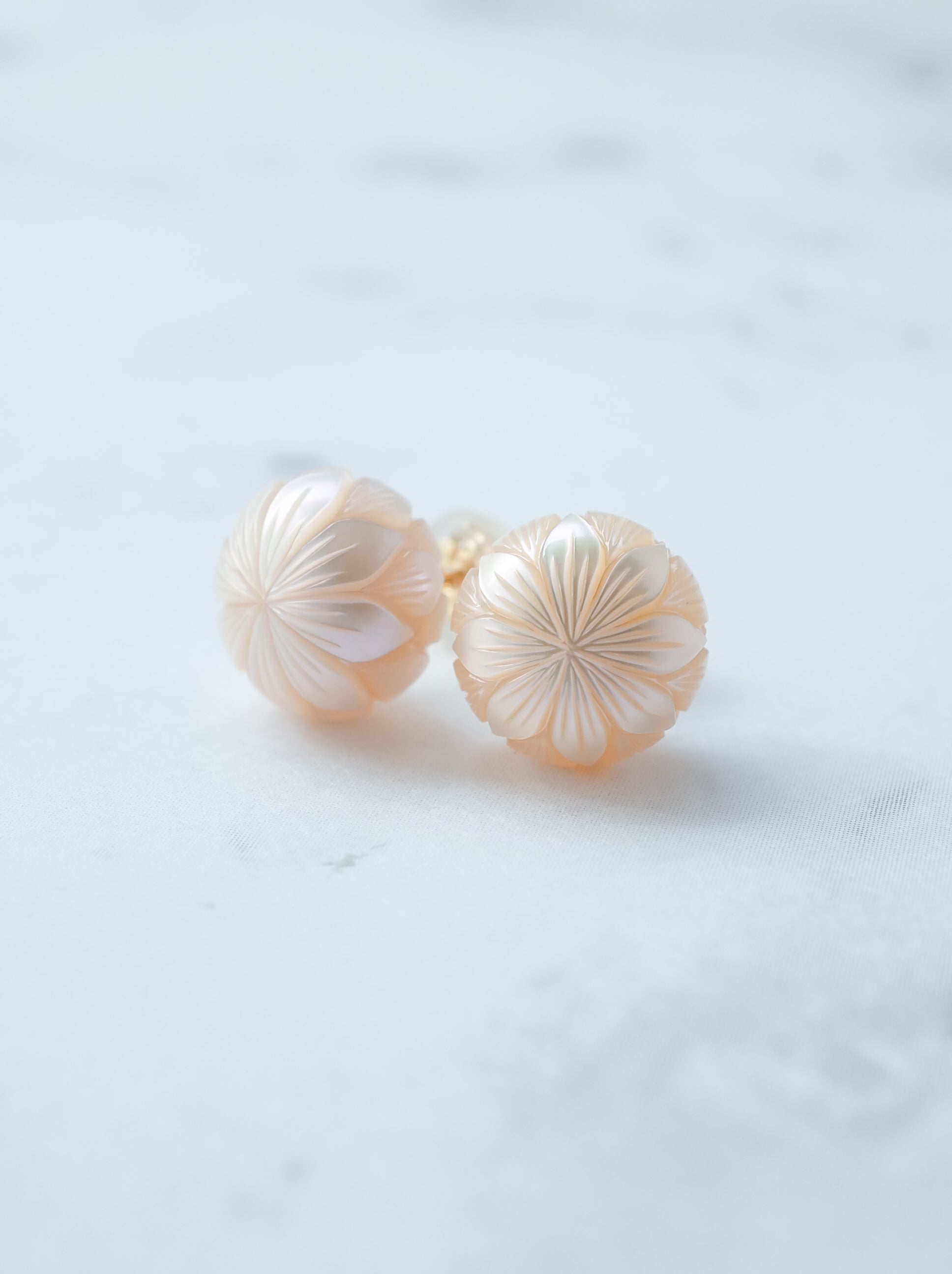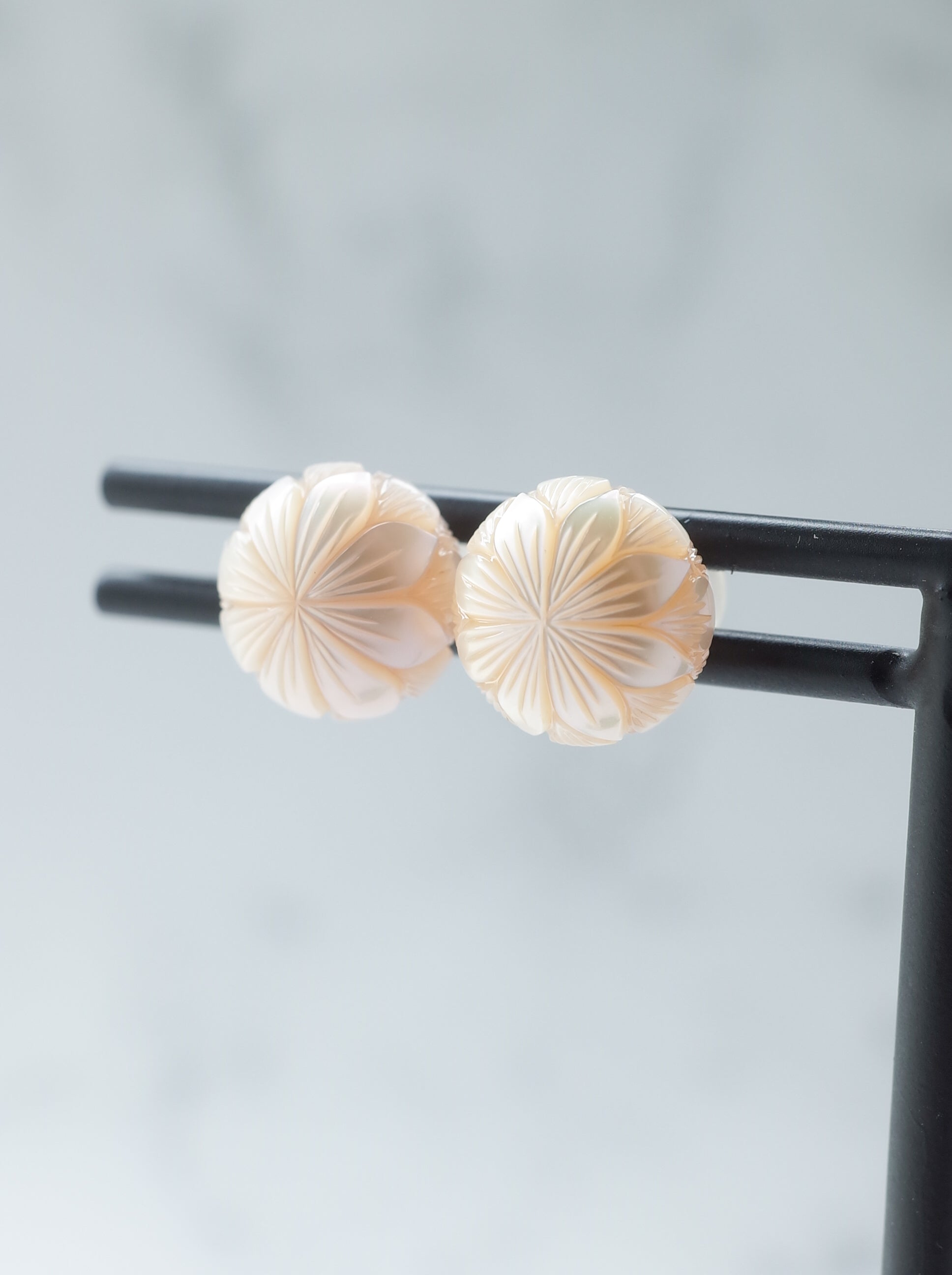 こちらはアメリカ人のアーティストが彫り模様を施した淡水パールのピアス。ありきたりになりがちな真珠の一粒ピアスにちょっと花を添えるアイテムです。