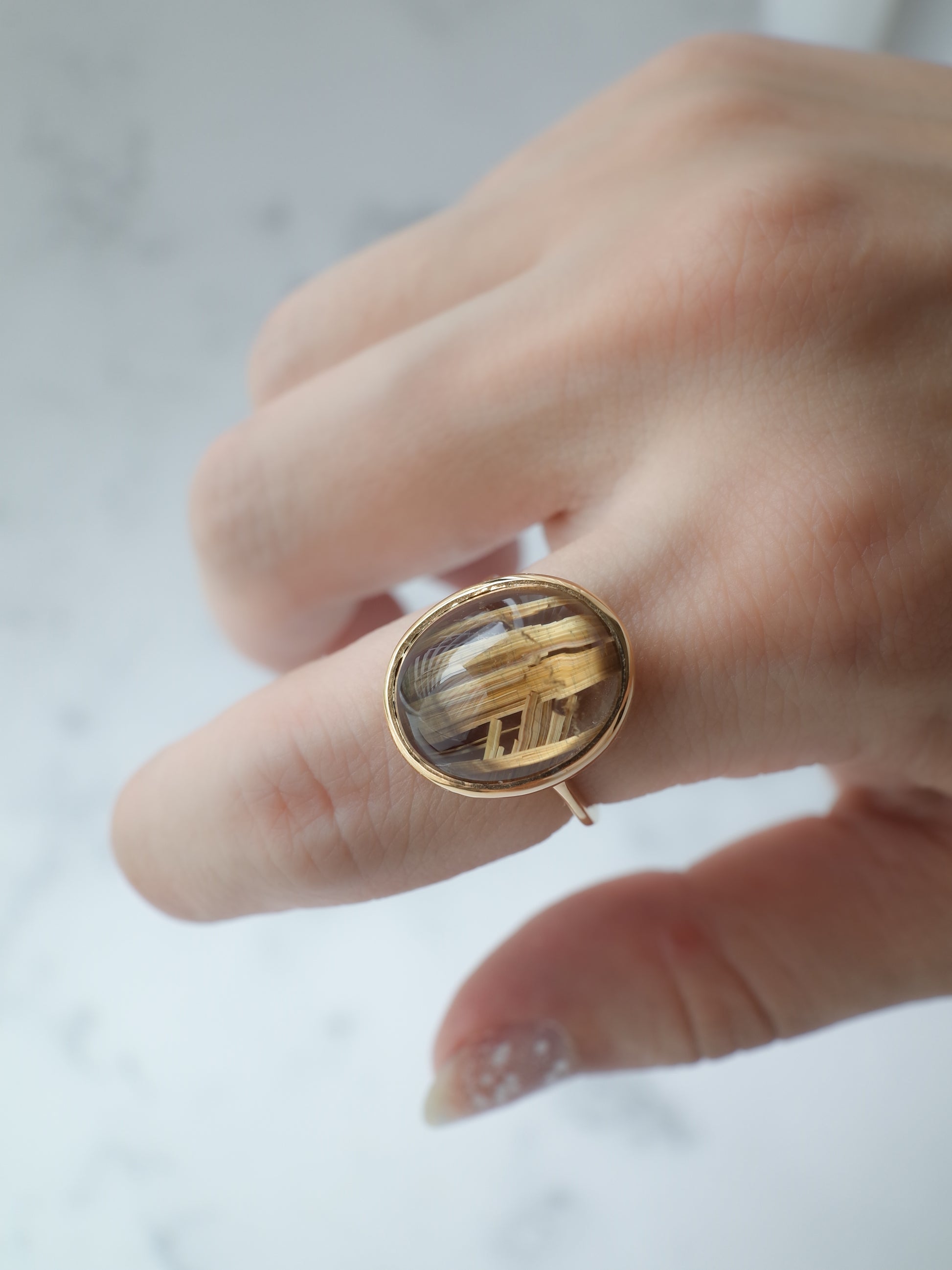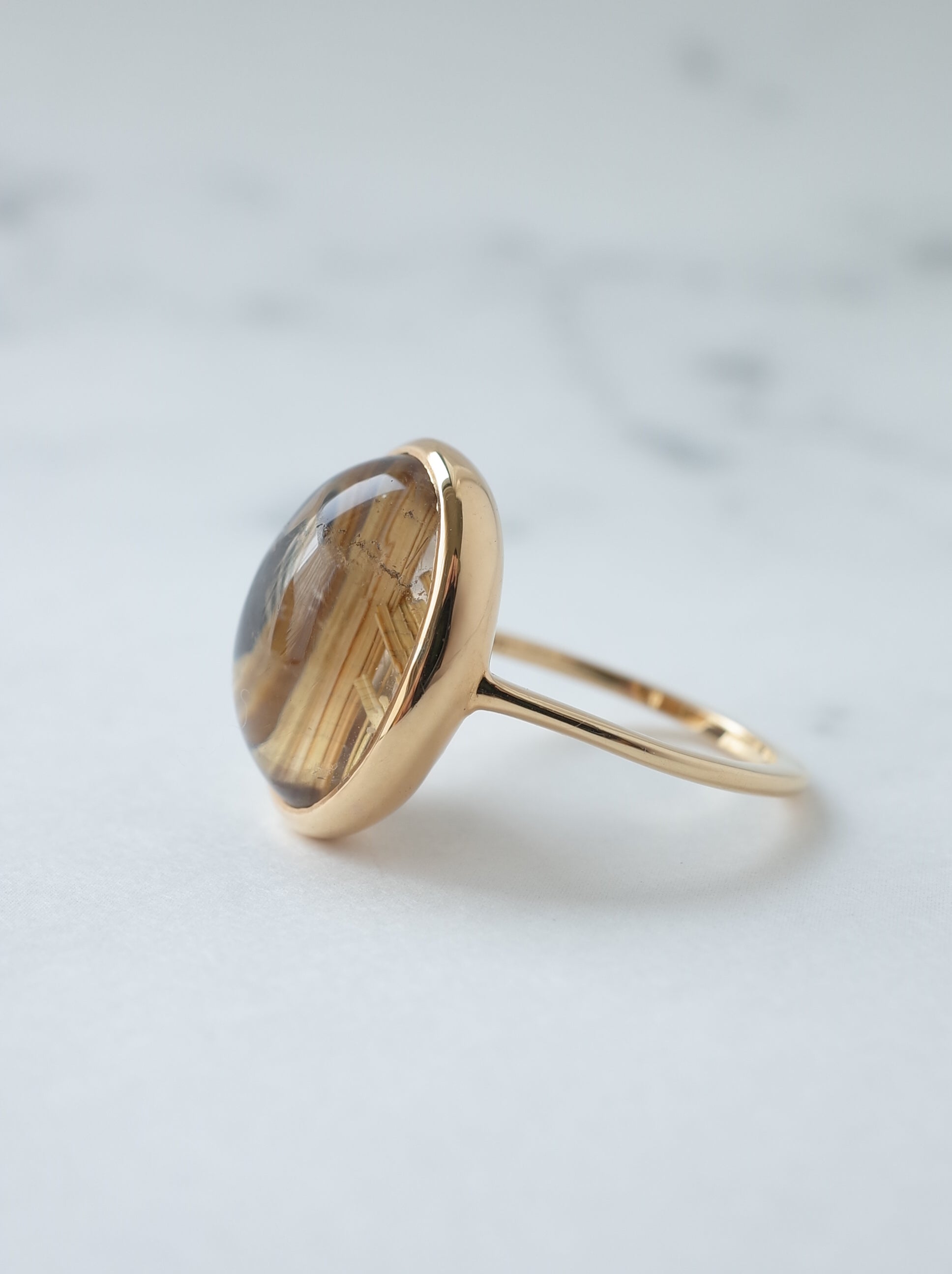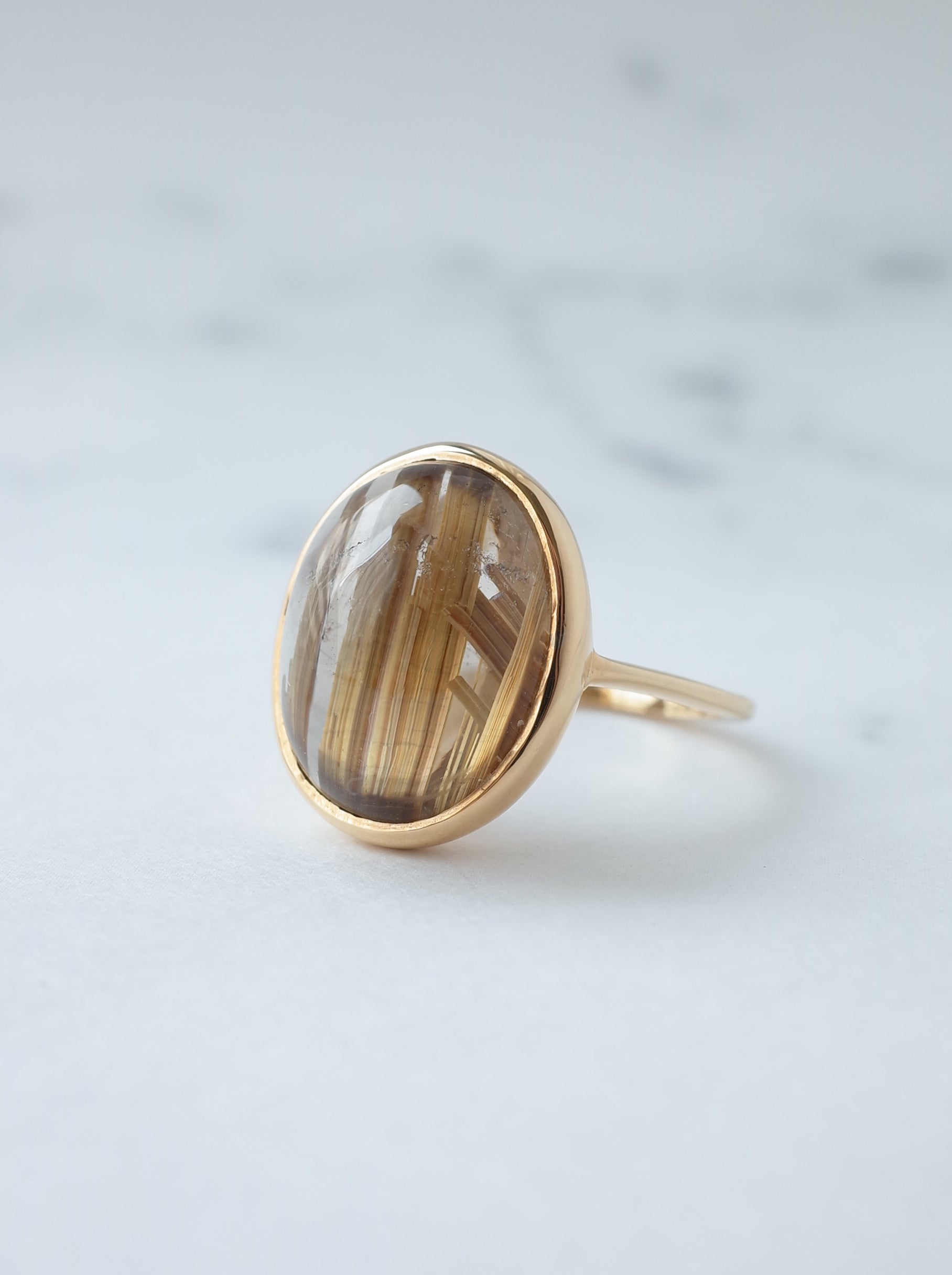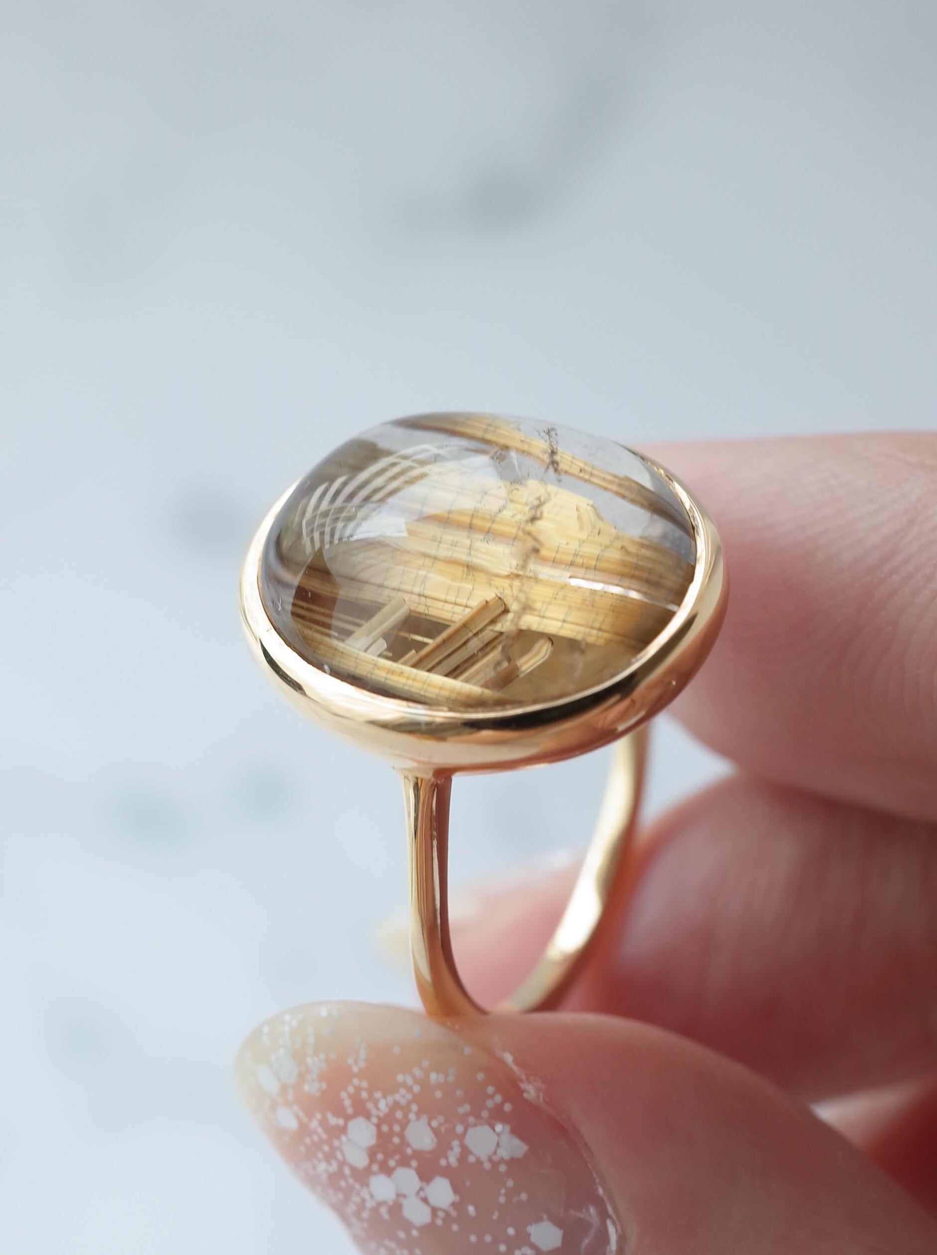 贅沢な金色の光沢が、指輪を動かす度に反射するキャッツアイルチル。ファッションリングとしてだけでなく、金運のお守りとしてよく知られたこの石は、経営者の方、金融関係の方、お金を貯めたい方にも非常に人気があります。こちらは地金もK18を使用しています。