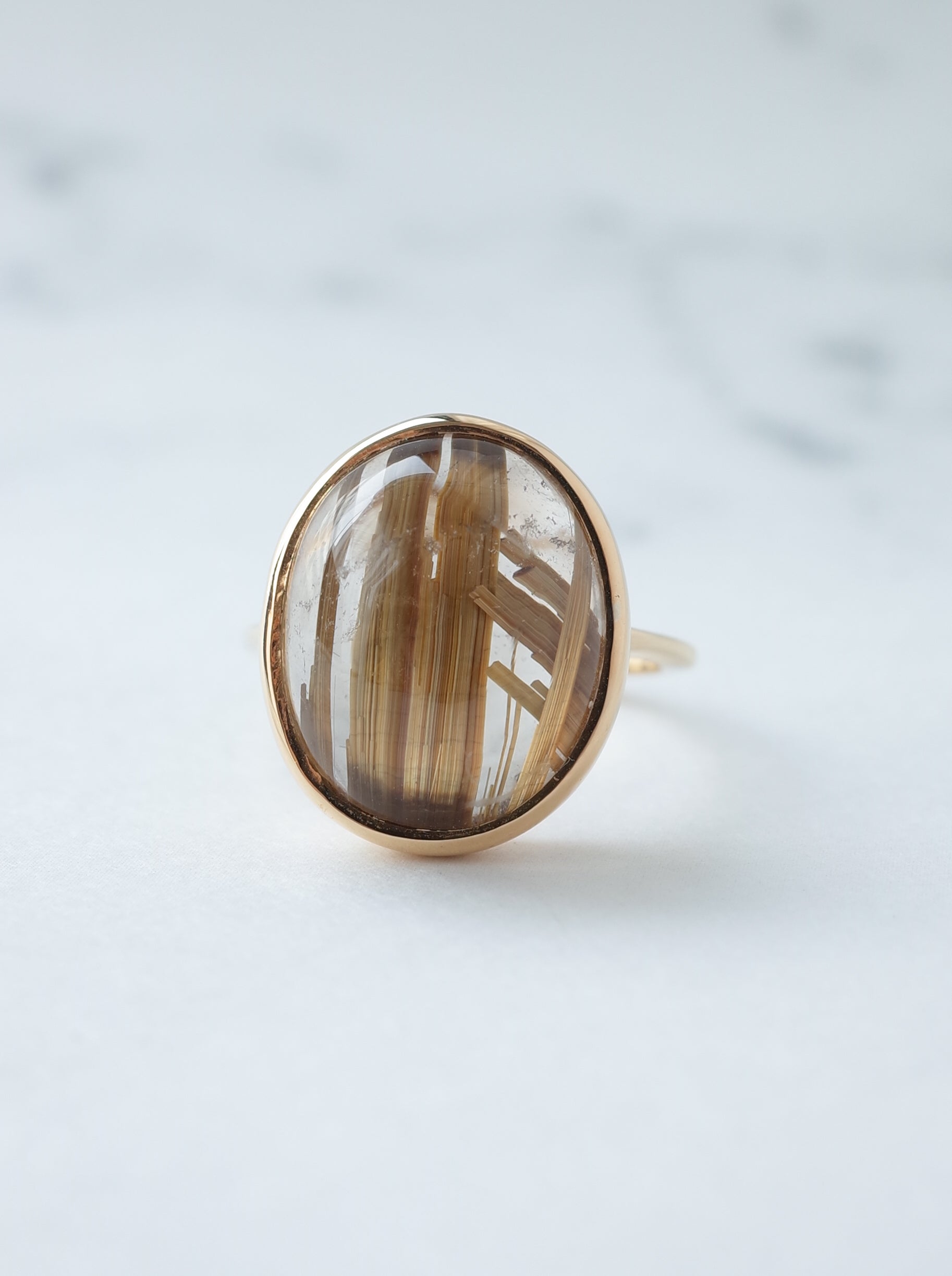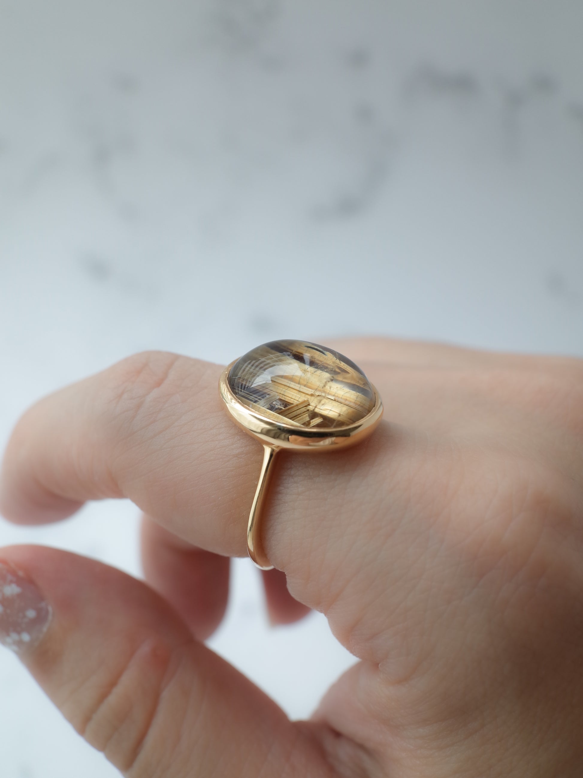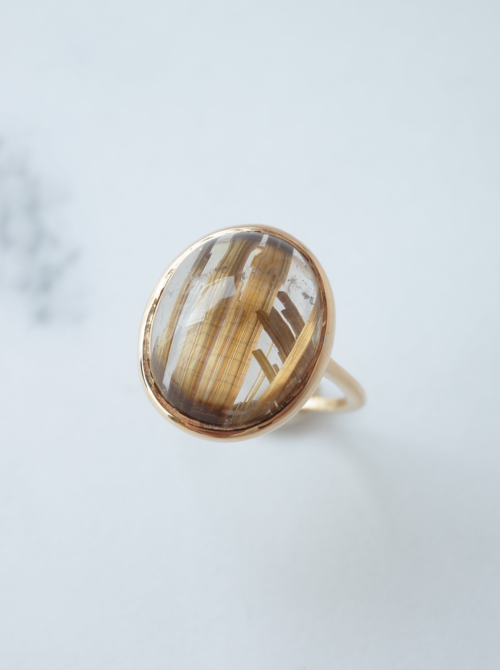 贅沢な金色の光沢が、指輪を動かす度に反射するキャッツアイルチル。ファッションリングとしてだけでなく、金運のお守りとしてよく知られたこの石は、経営者の方、金融関係の方、お金を貯めたい方にも非常に人気があります。こちらは地金もK18を使用しています。