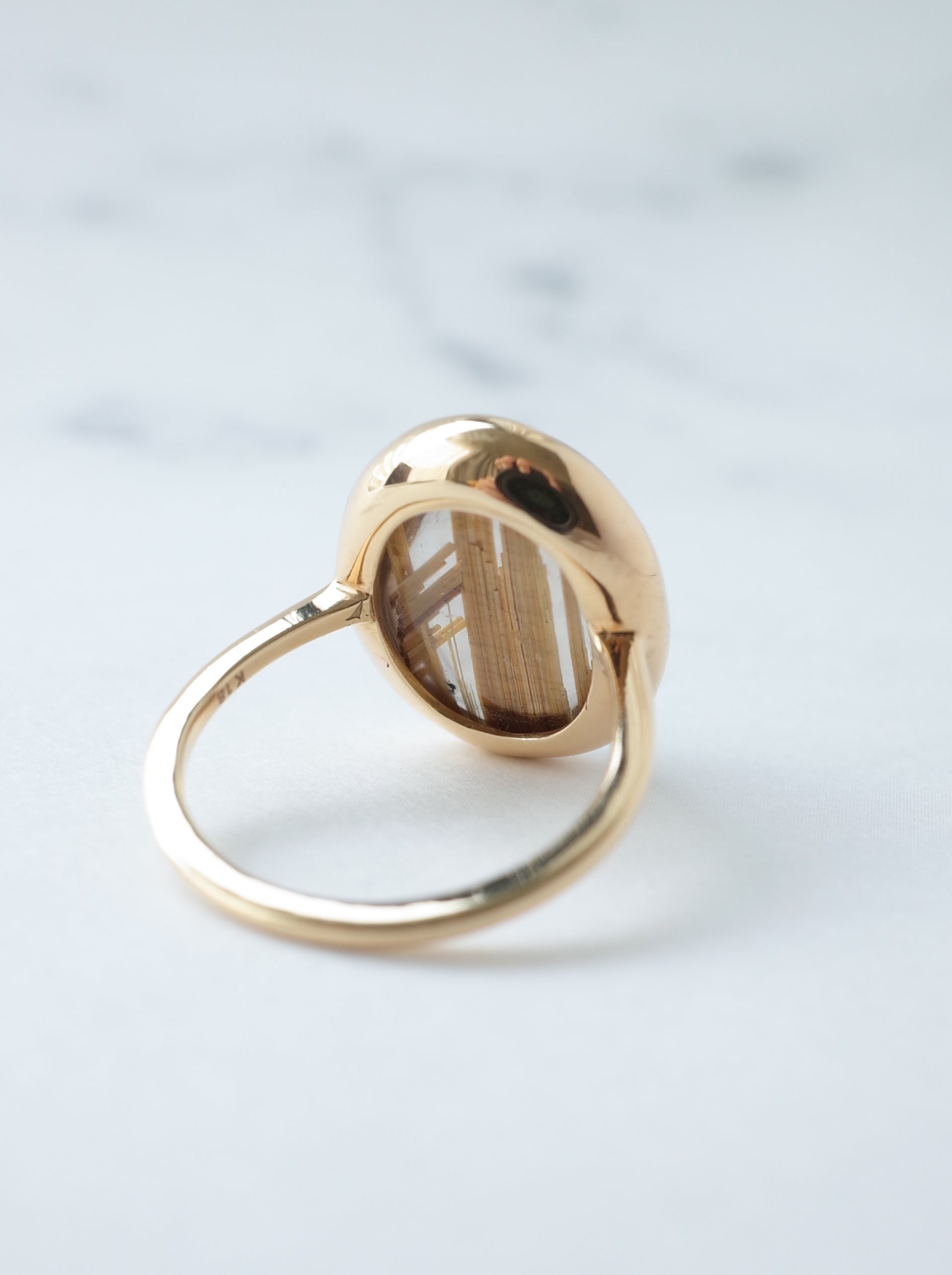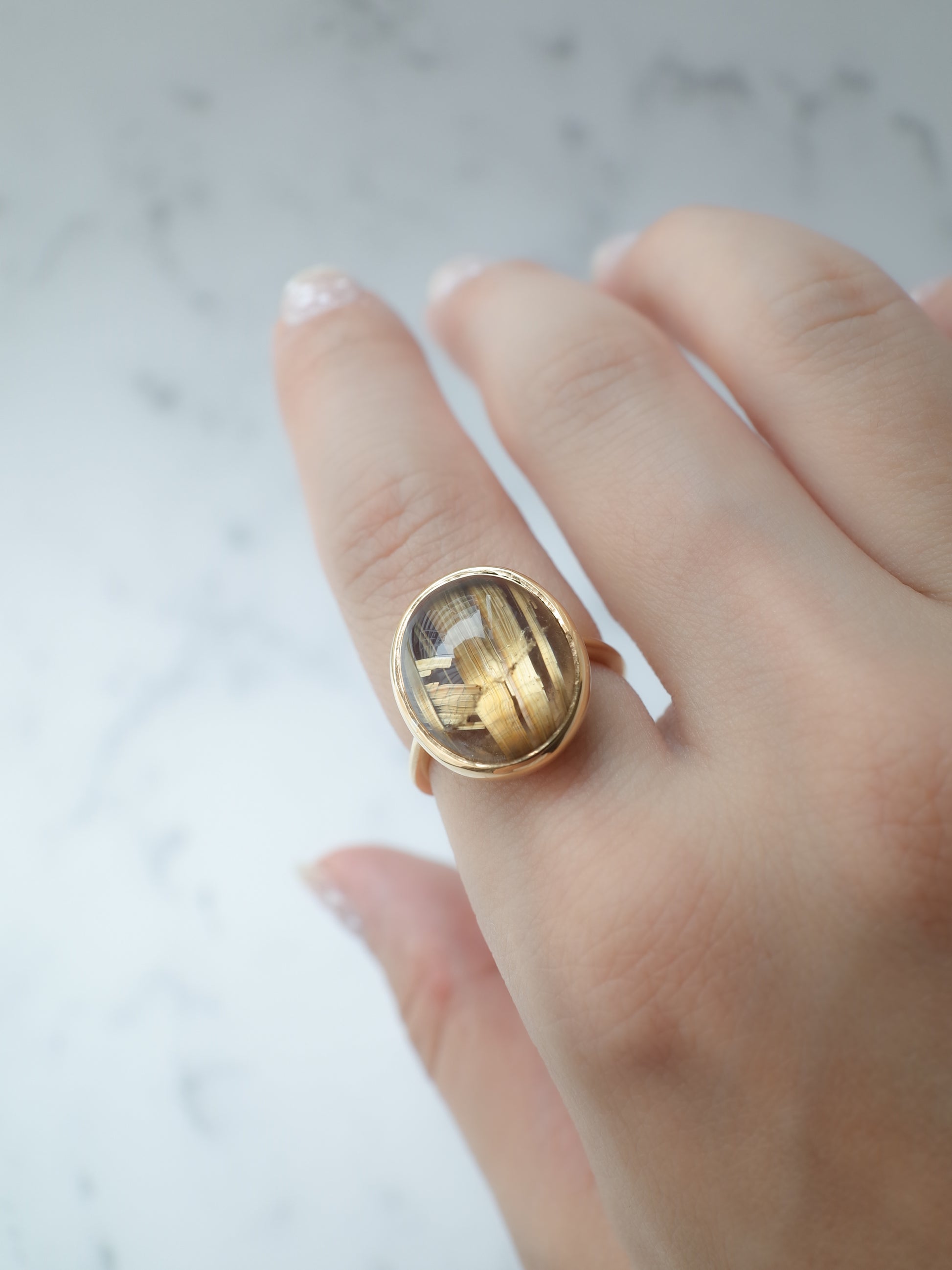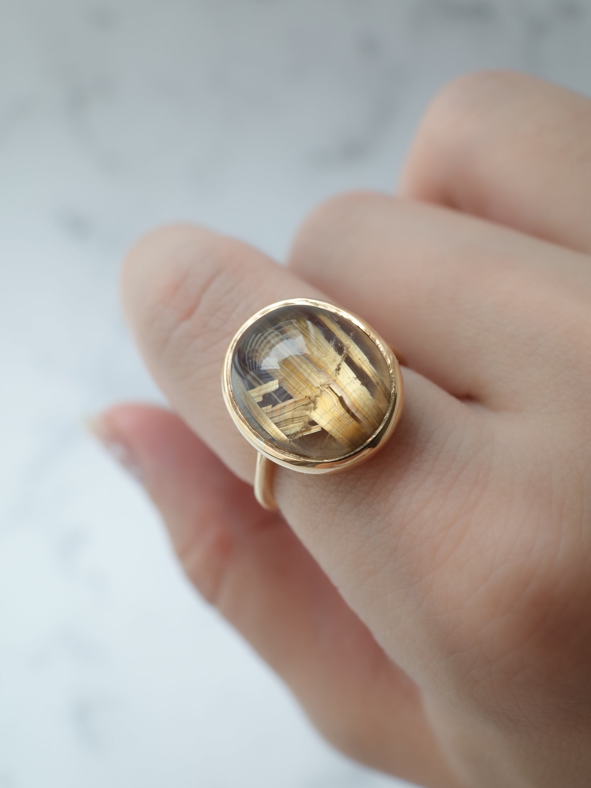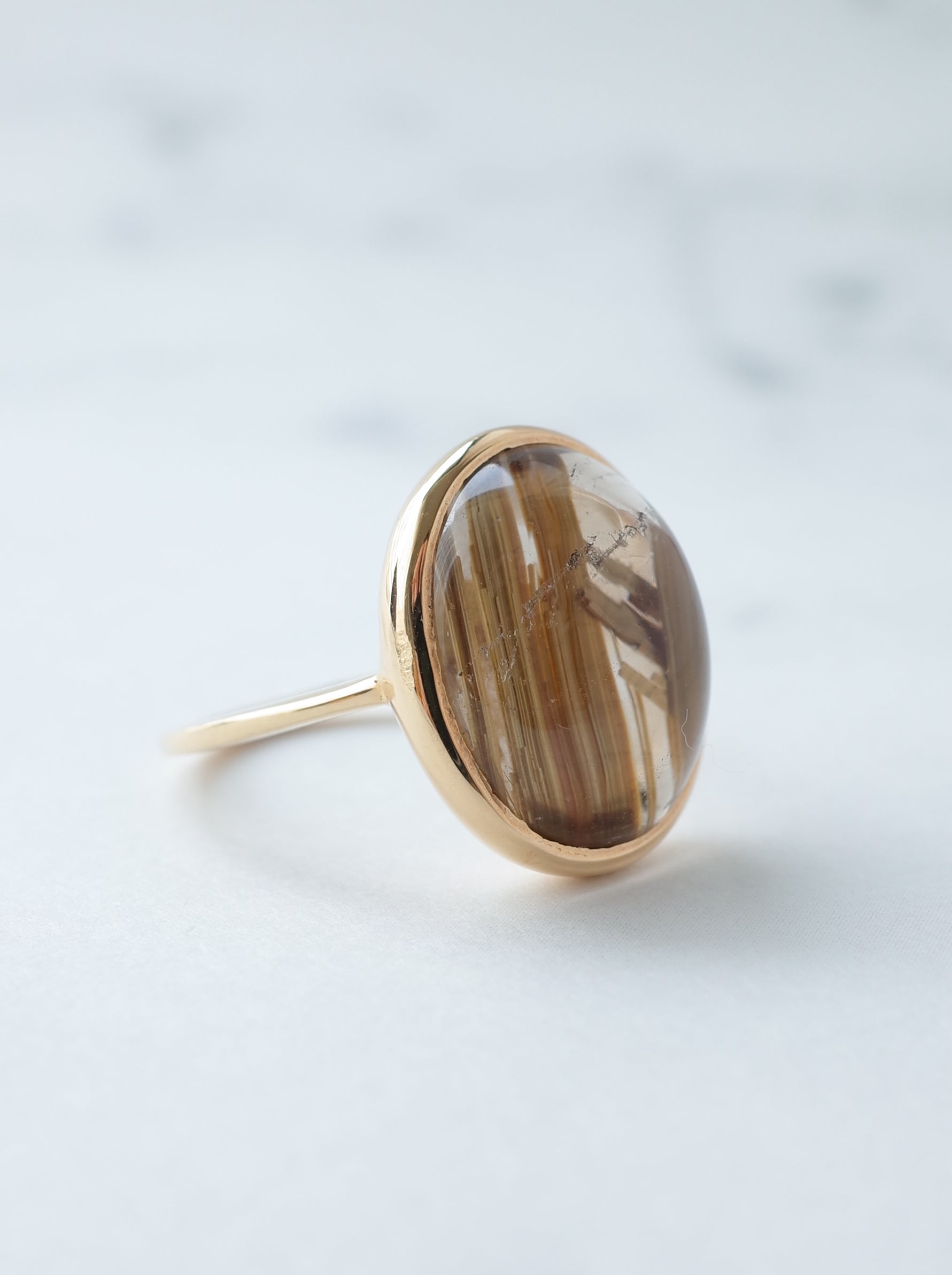贅沢な金色の光沢が、指輪を動かす度に反射するキャッツアイルチル。ファッションリングとしてだけでなく、金運のお守りとしてよく知られたこの石は、経営者の方、金融関係の方、お金を貯めたい方にも非常に人気があります。こちらは地金もK18を使用しています。