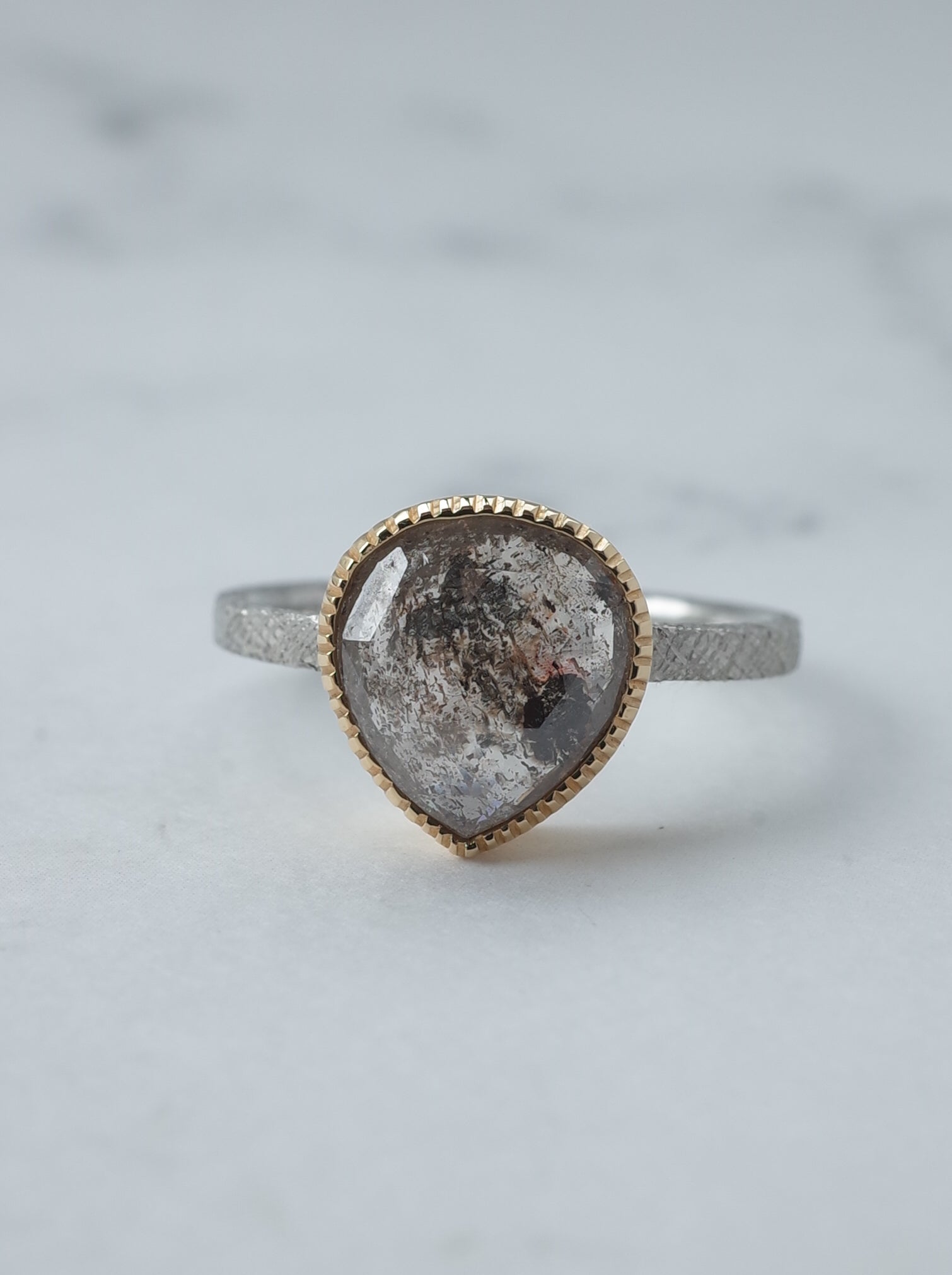 クールで個性的なソルトアンドペッパーダイヤモンド。インクルージョンやカーボンが多く入ることで、一般的なダイヤモンドとは違った魅力があります。