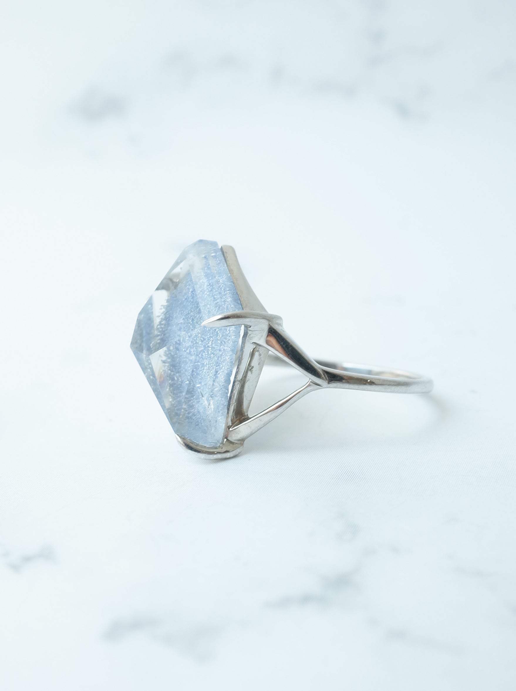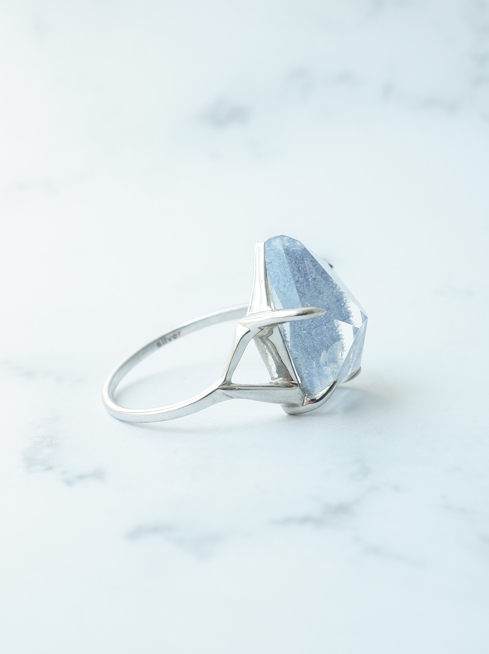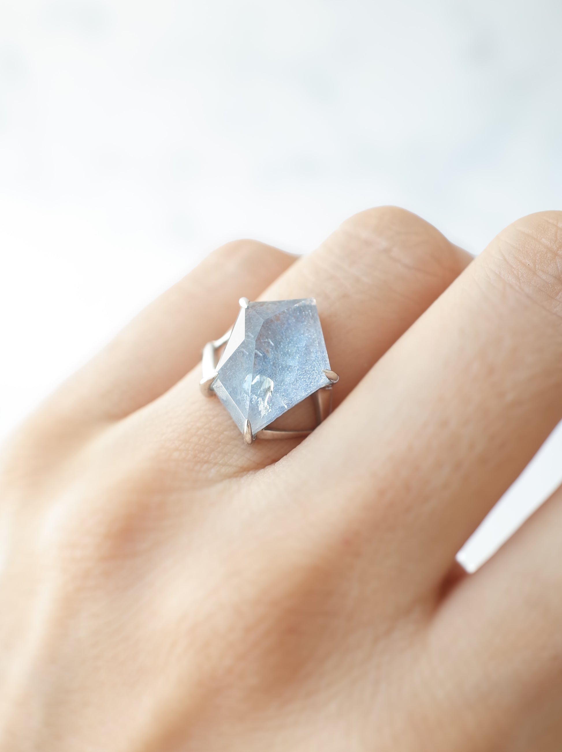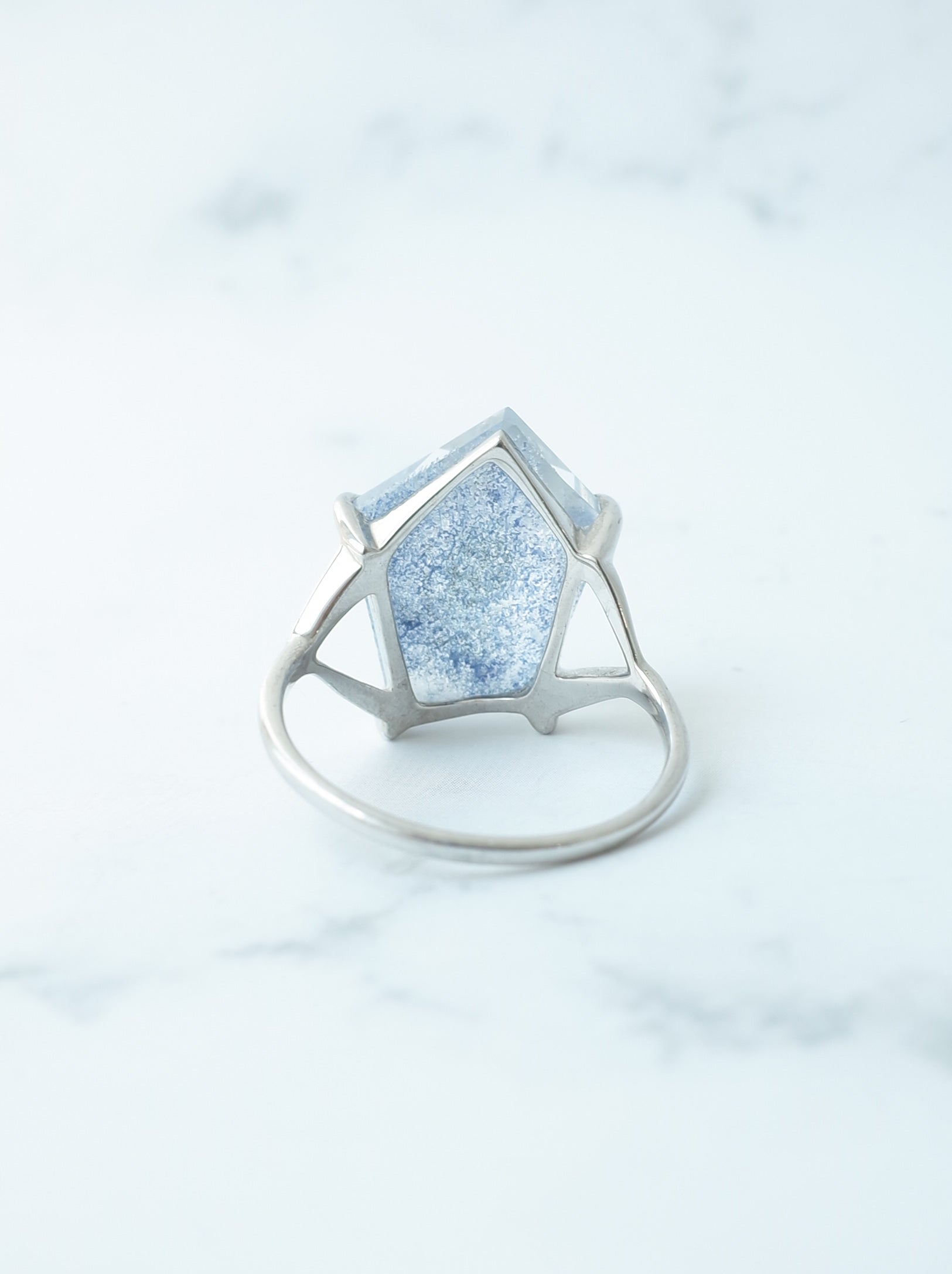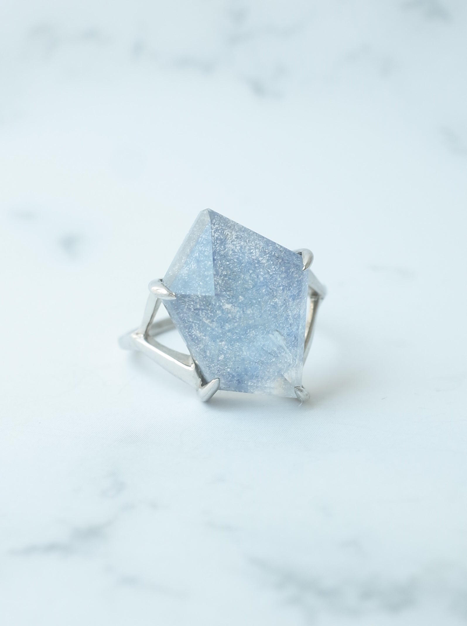 青い花畑のような繊細なインクルージョンが魅力のデュモルチェライトインクォーツを、ランダムなカットでモダンに仕上げました。