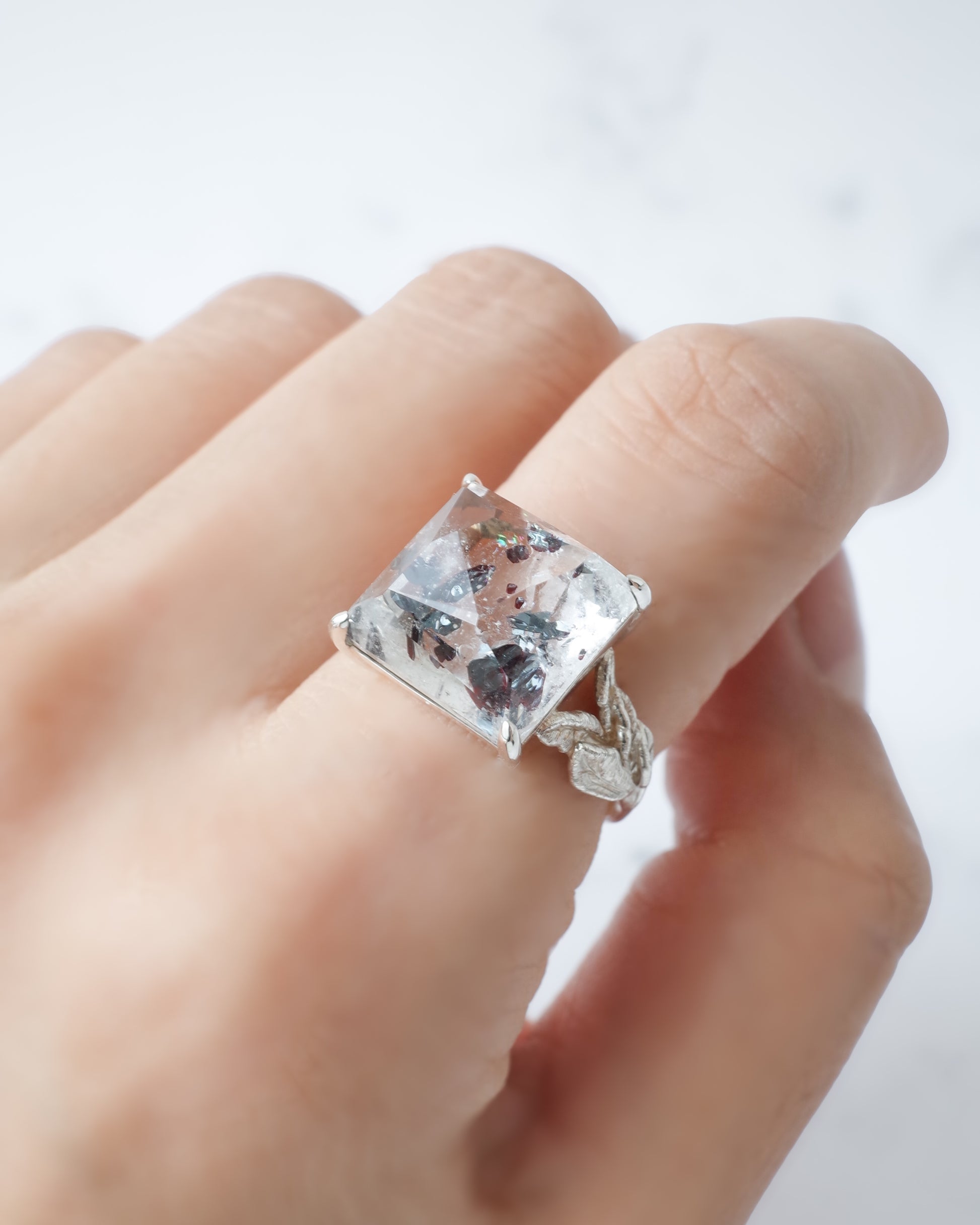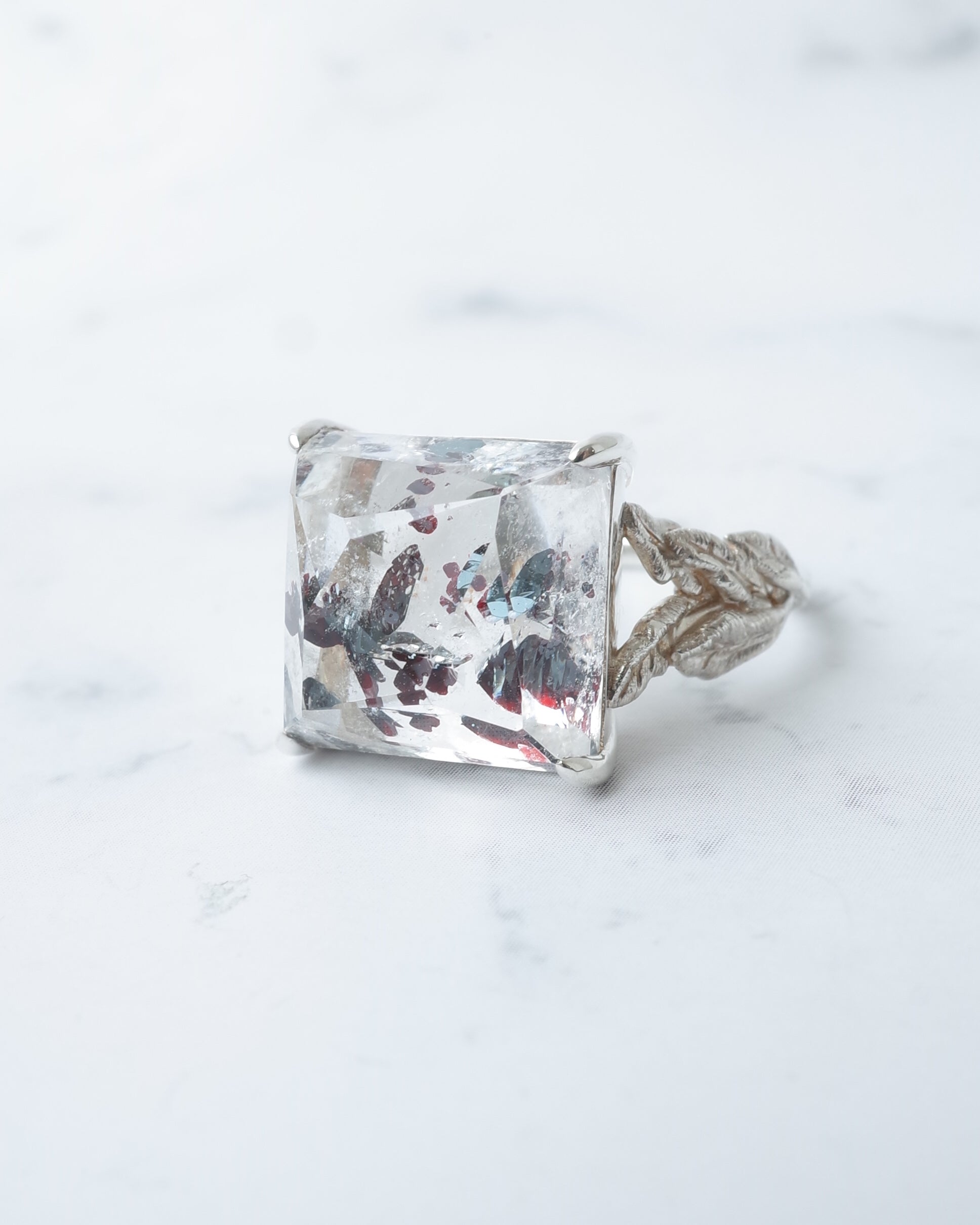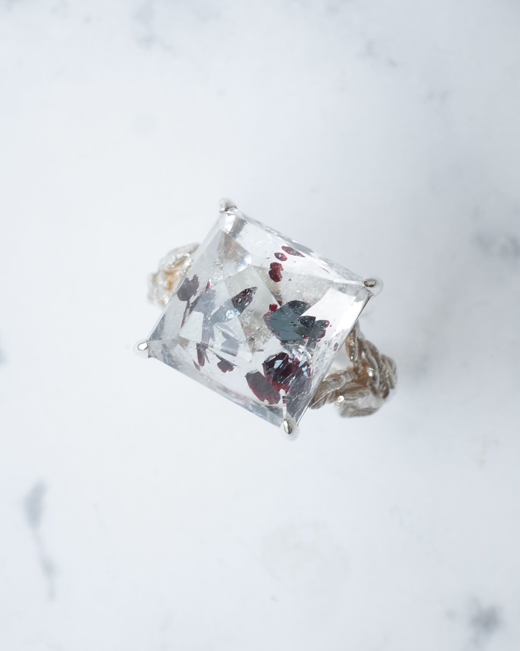 赤と黒のヘマタイトが花びらのように舞うヘマタイトインクォーツ。光沢のあるインクルージョンの反射と、カットの反射が掛け合わさり、手元でキラキラと煌めきます。