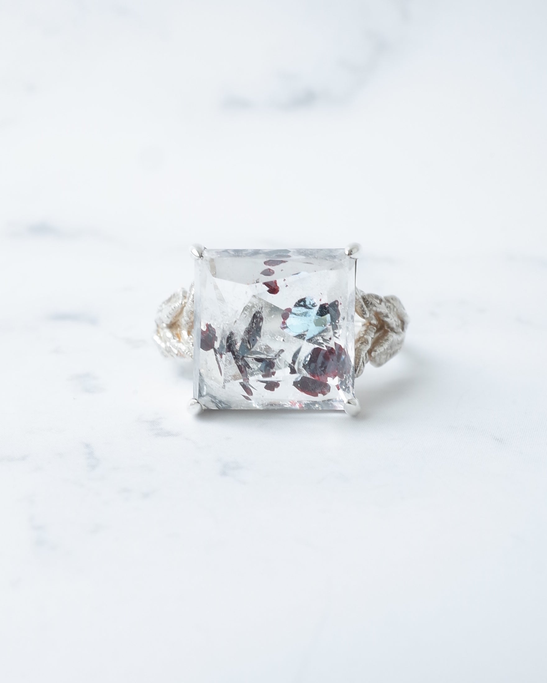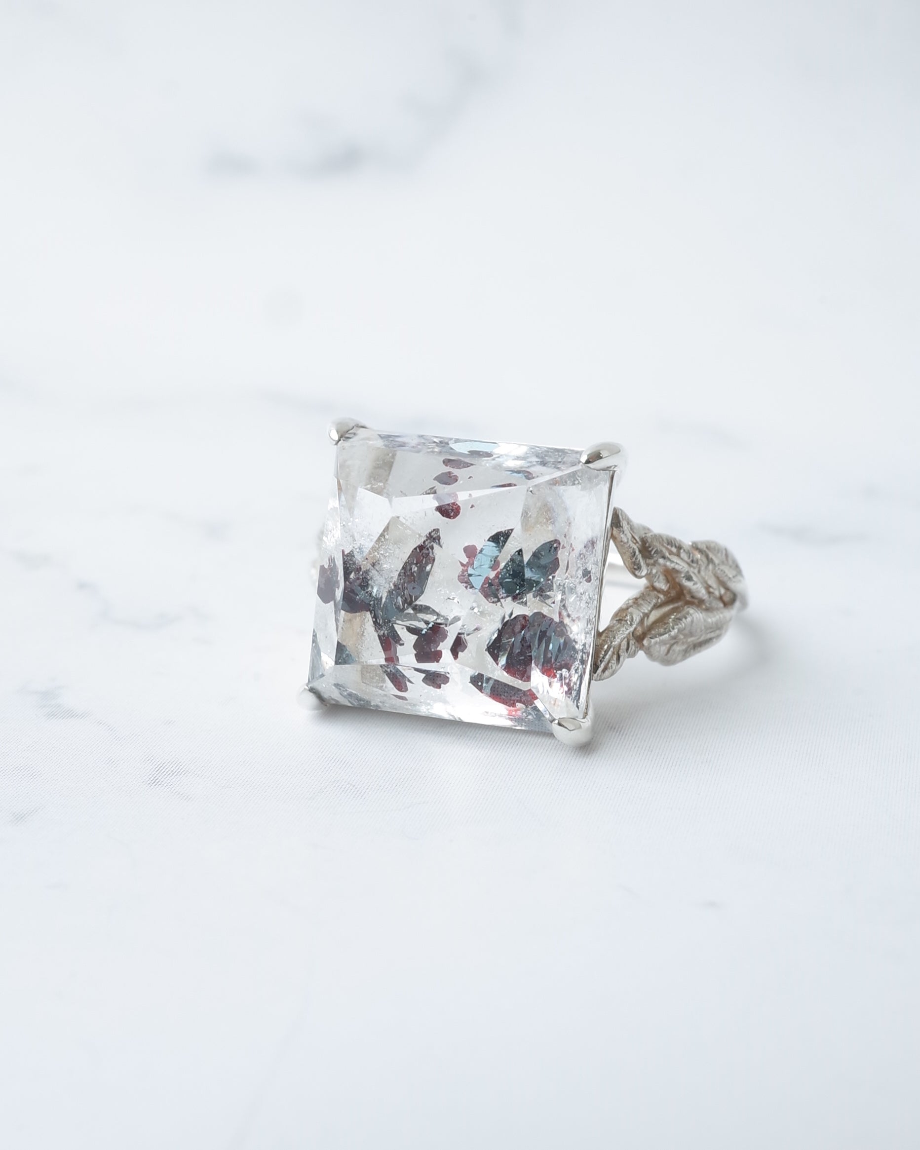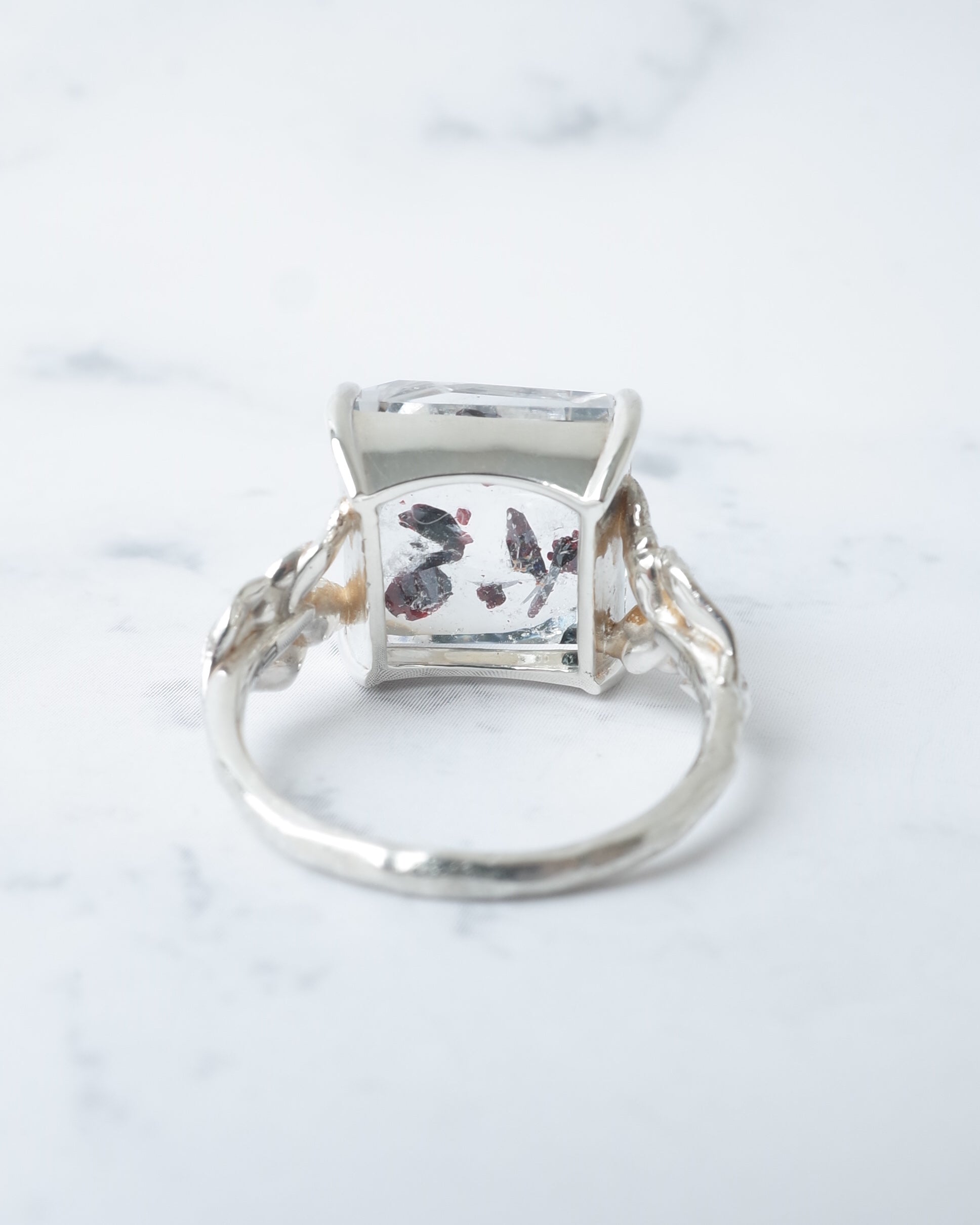 赤と黒のヘマタイトが花びらのように舞うヘマタイトインクォーツ。光沢のあるインクルージョンの反射と、カットの反射が掛け合わさり、手元でキラキラと煌めきます。