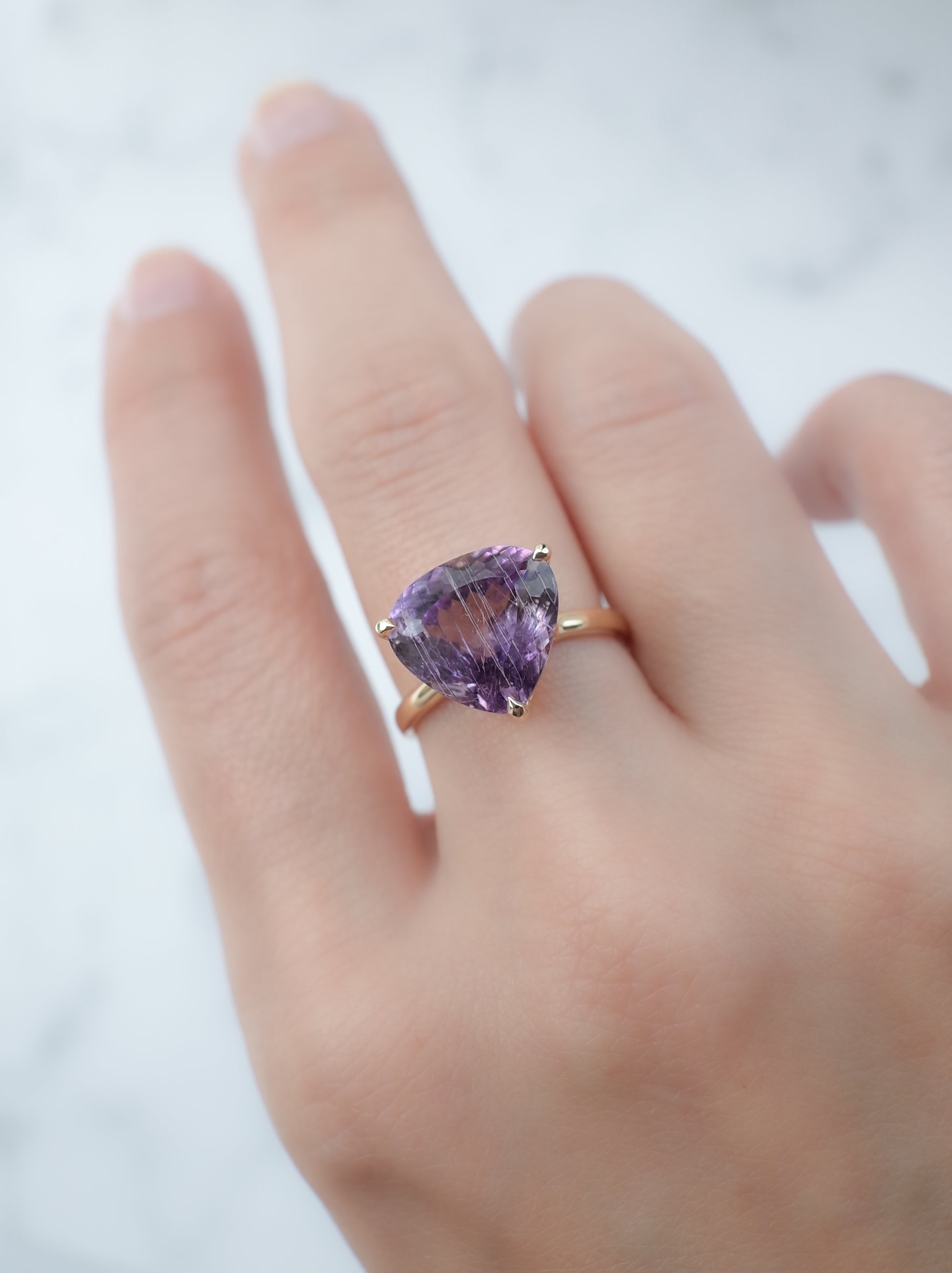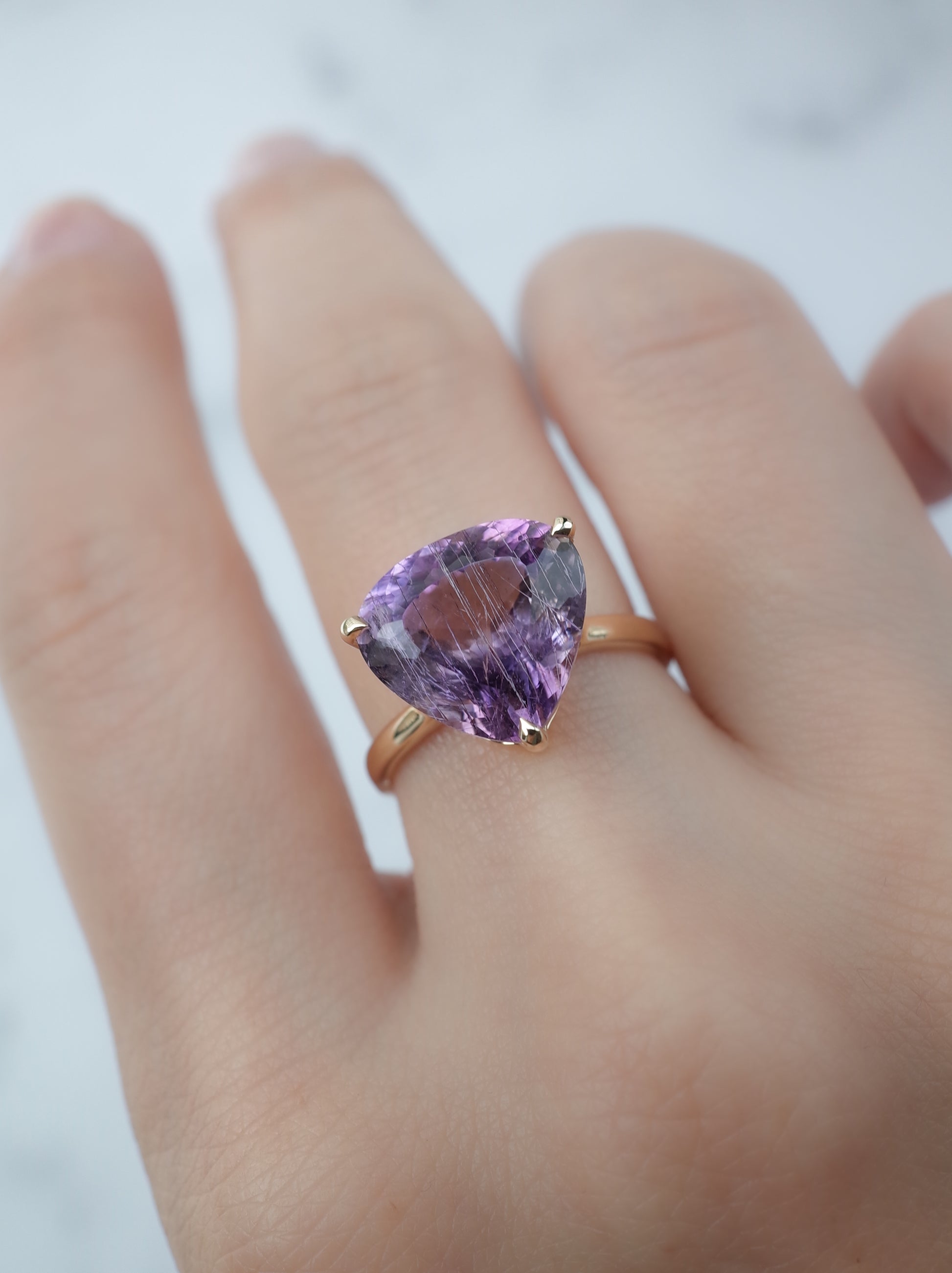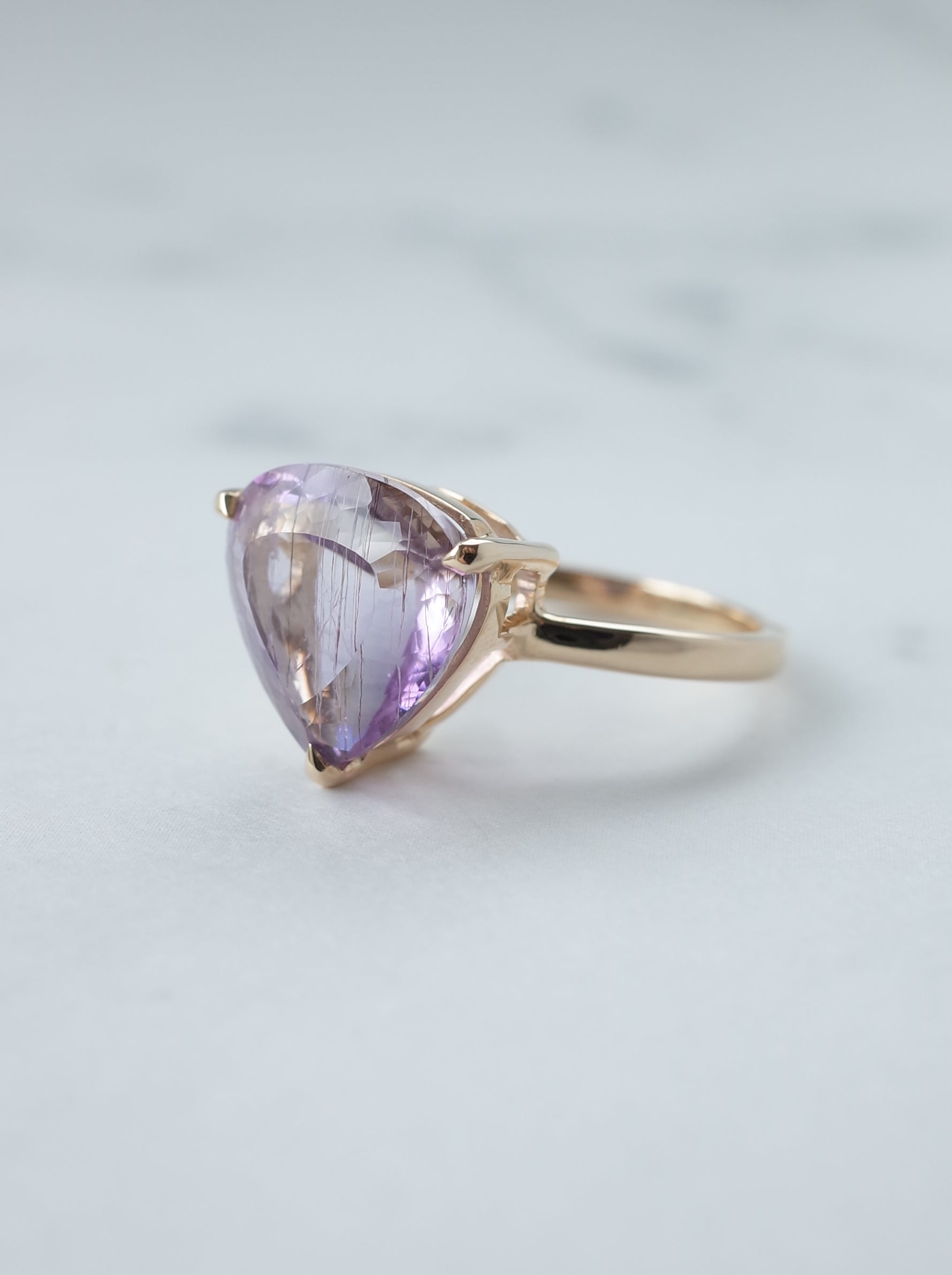 2月の誕生石アメシスト。同じ紫色の宝石でもインクルージョンの種類や入り方で個性も様々です。こちらは『ピンクアメシスト』との呼ばれるライトカラー。針状のインクルージョンが白く反射して、まるで光が差しているかのようにキラキラとします。春らしい色味でおすすめの一点です。