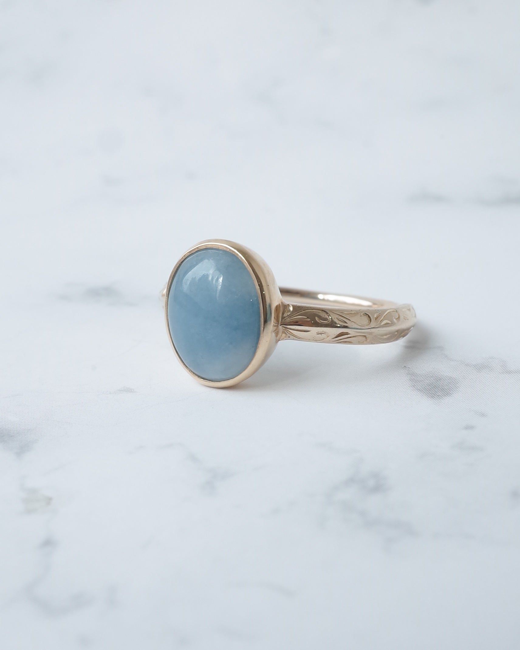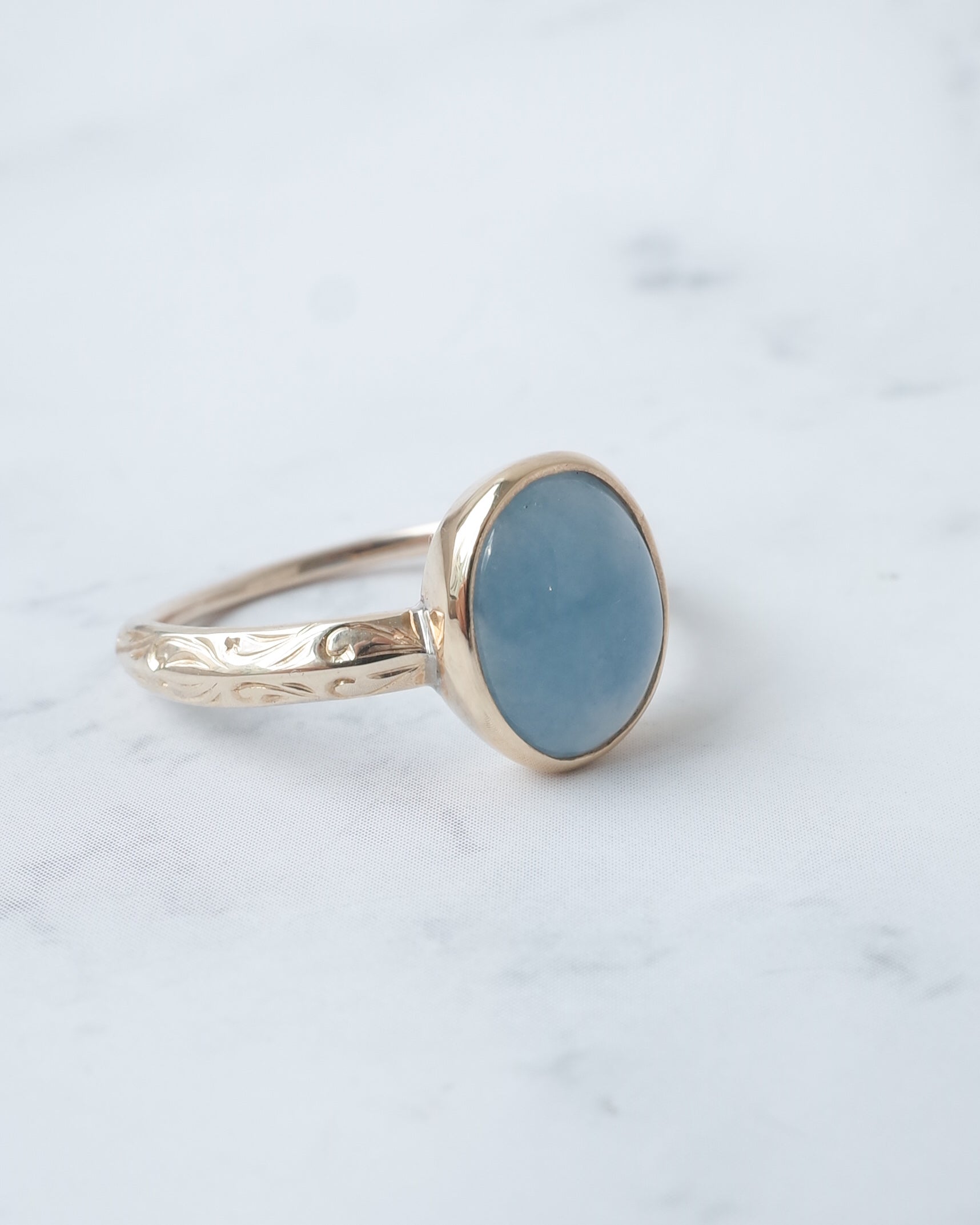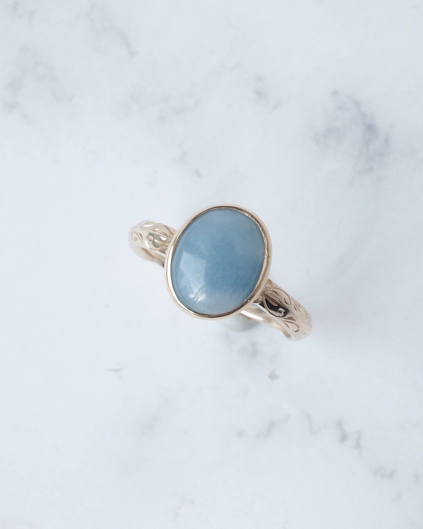 東洋の宝石「翡翠」に合わせたのは、花鳥風月をイメージたシノワズリーの彫り模様。ツタの様であったり、孔雀の羽根の様でもある、和彫りとも洋彫りとも言えないようなオリエンタルな雰囲気が、石の魅力を引き立てています。