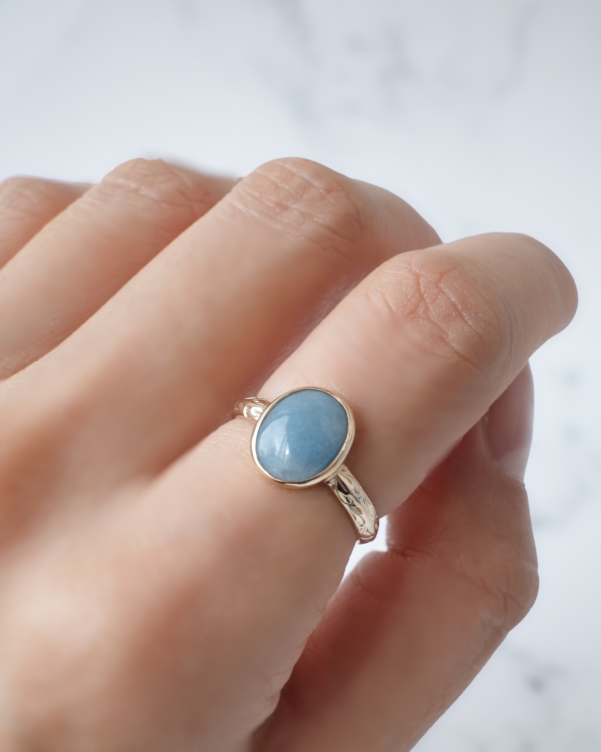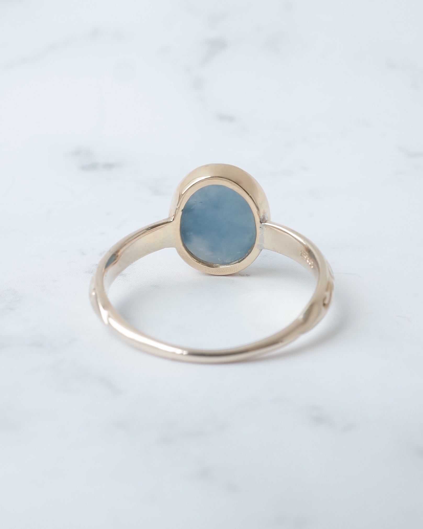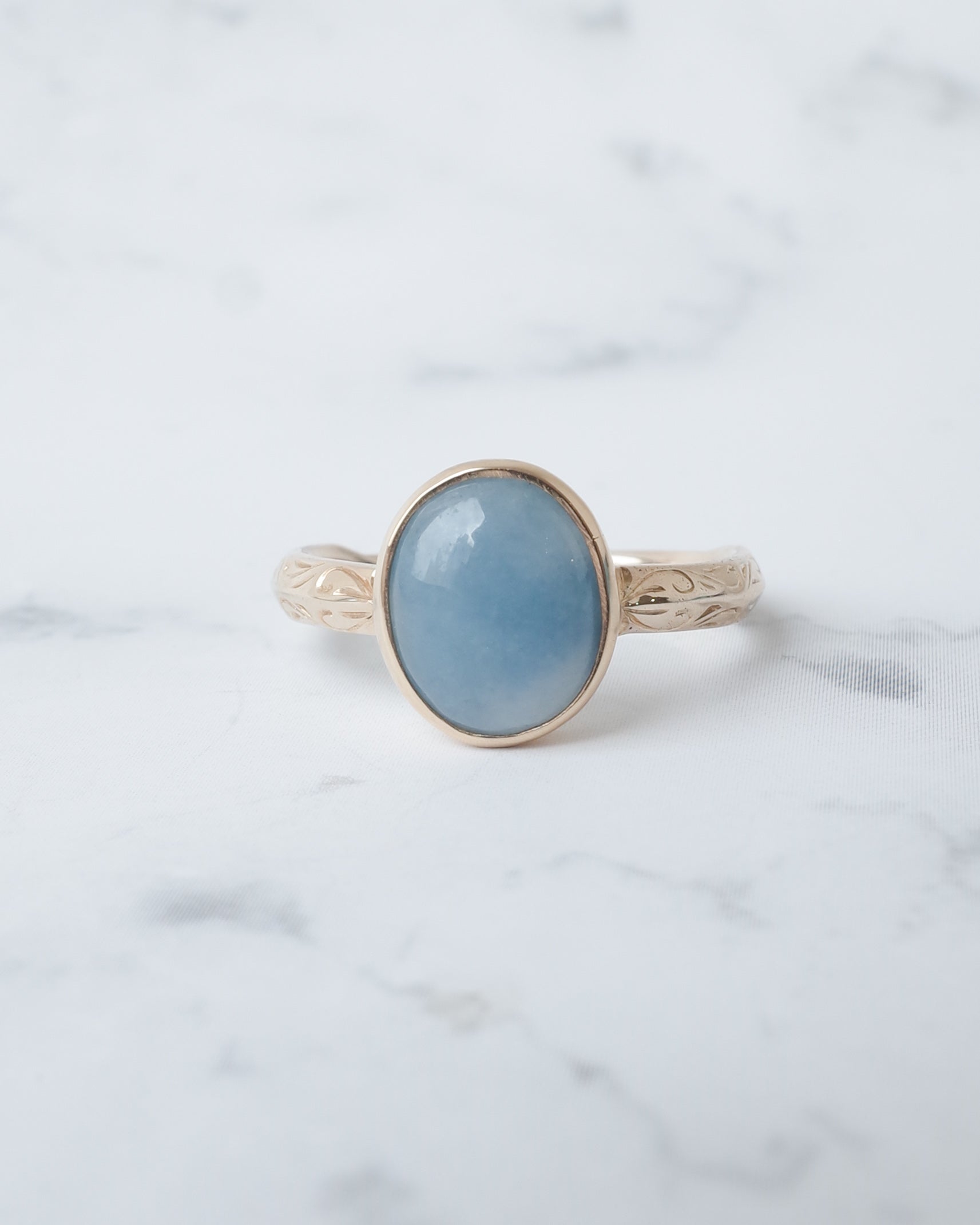 東洋の宝石「翡翠」に合わせたのは、花鳥風月をイメージたシノワズリーの彫り模様。ツタの様であったり、孔雀の羽根の様でもある、和彫りとも洋彫りとも言えないようなオリエンタルな雰囲気が、石の魅力を引き立てています。