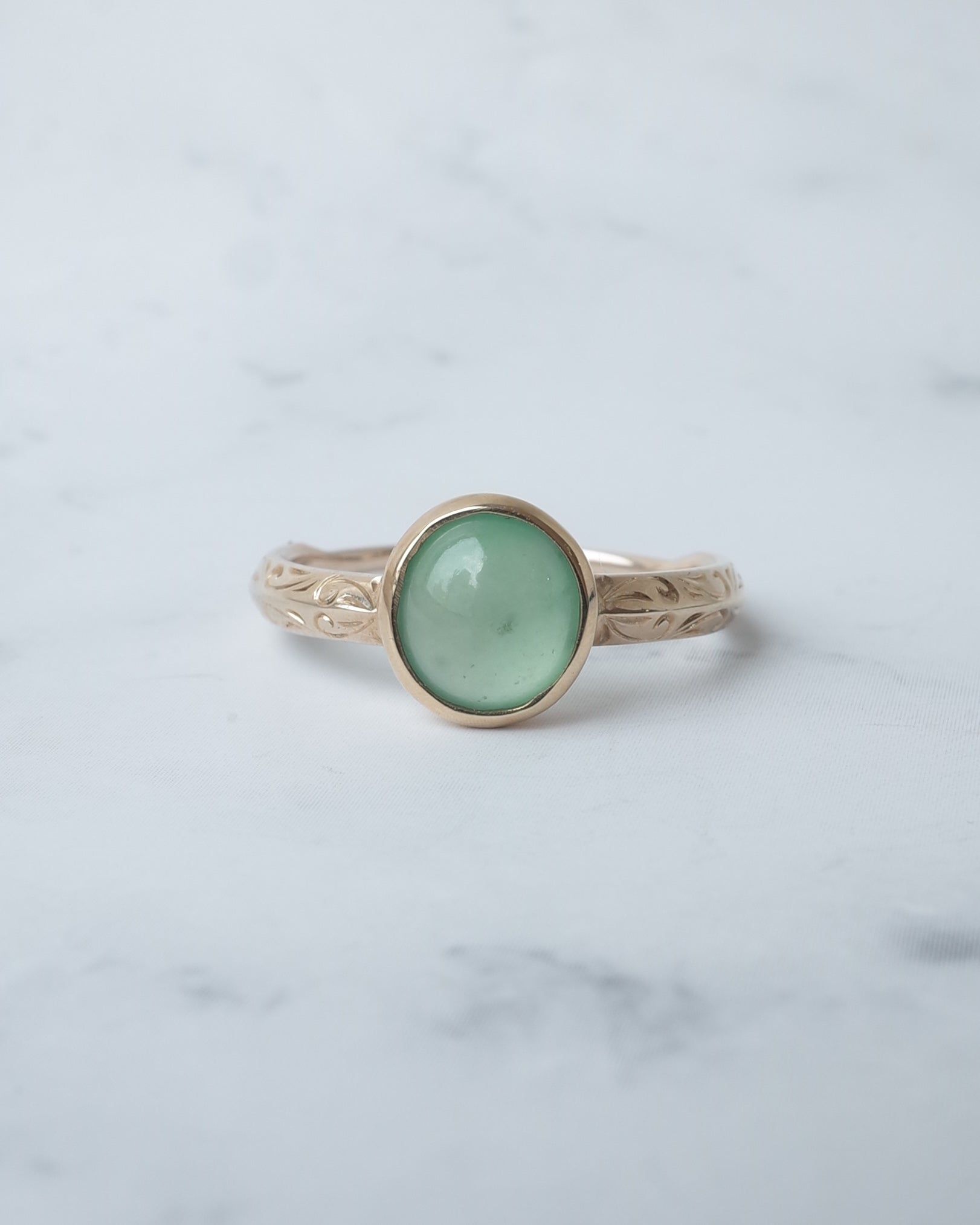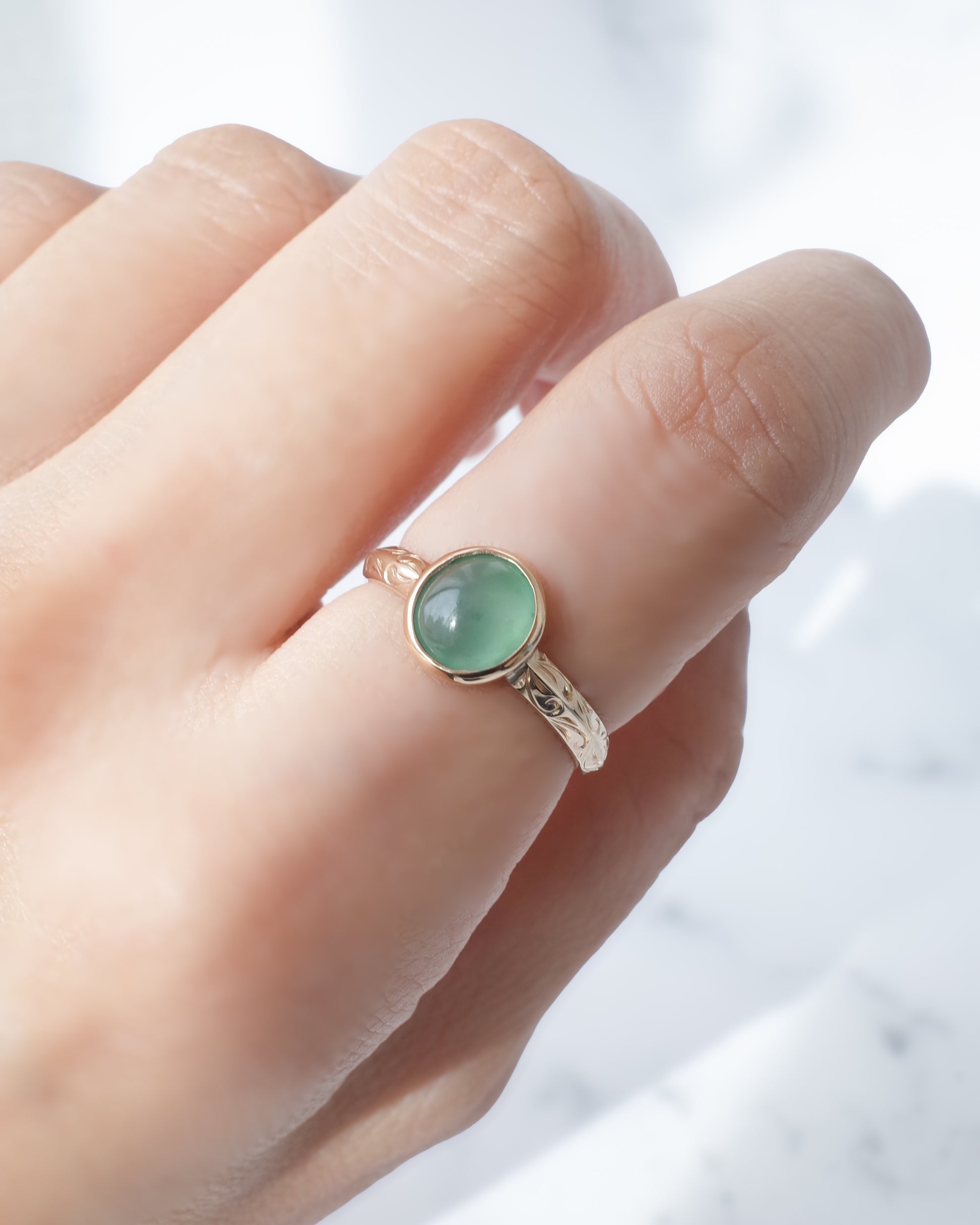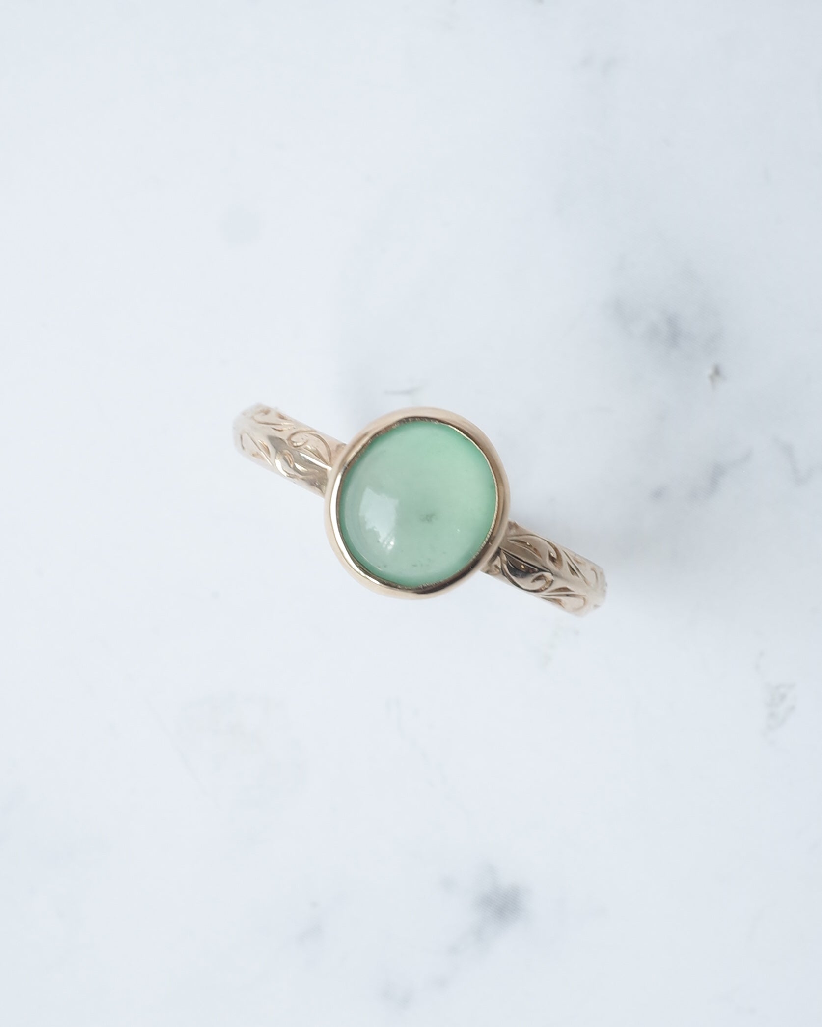 東洋の宝石「翡翠」に合わせたのは、花鳥風月をイメージたシノワズリーの彫り模様。ツタの様であったり、孔雀の羽根の様でもある、和彫りとも洋彫りとも言えないようなオリエンタルな雰囲気が、石の魅力を引き立てています。