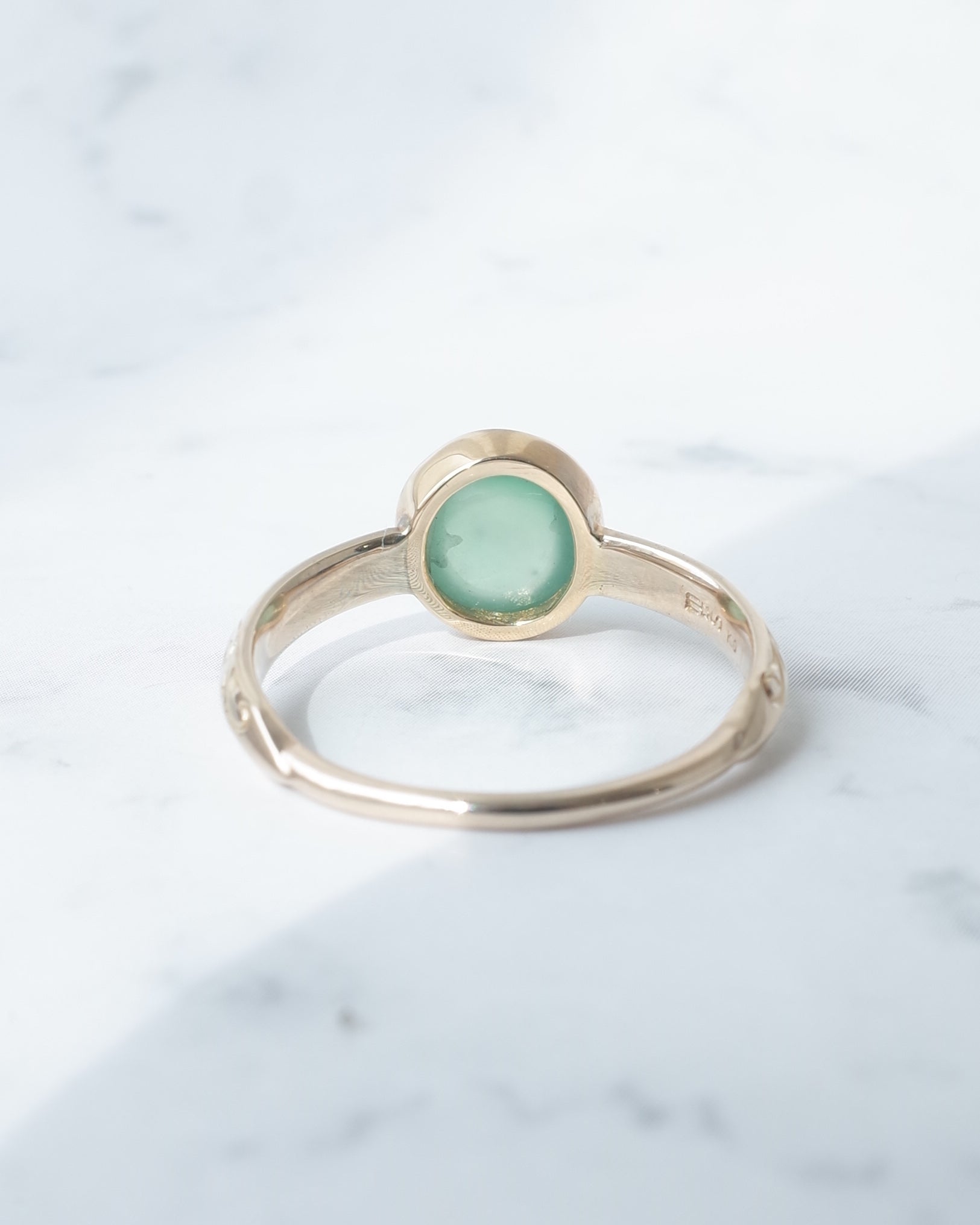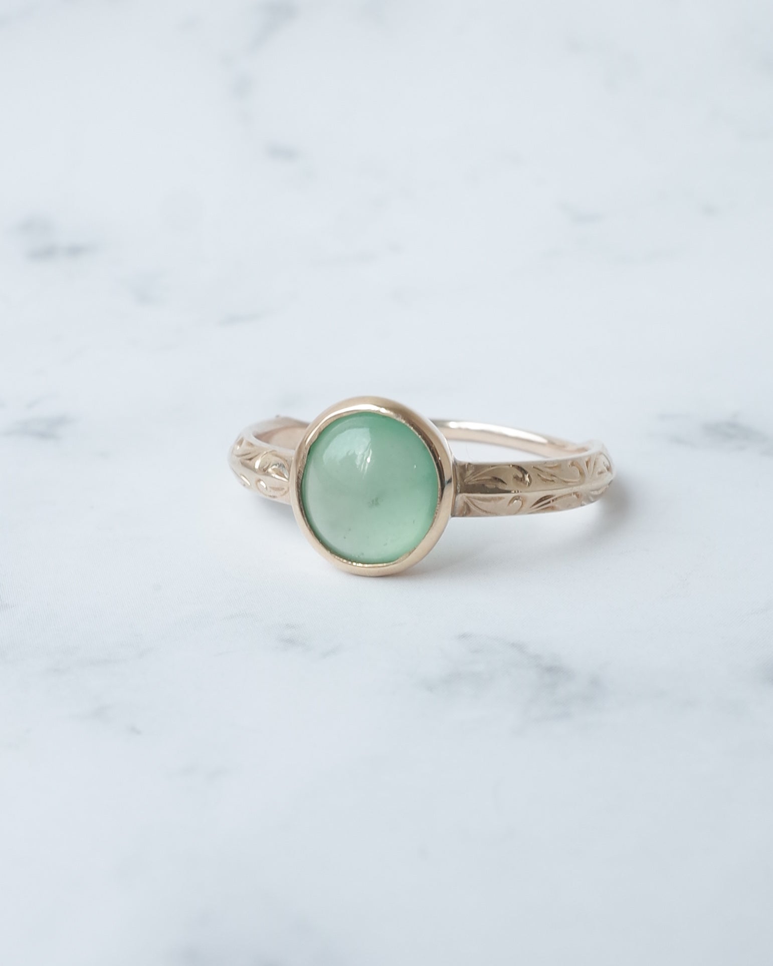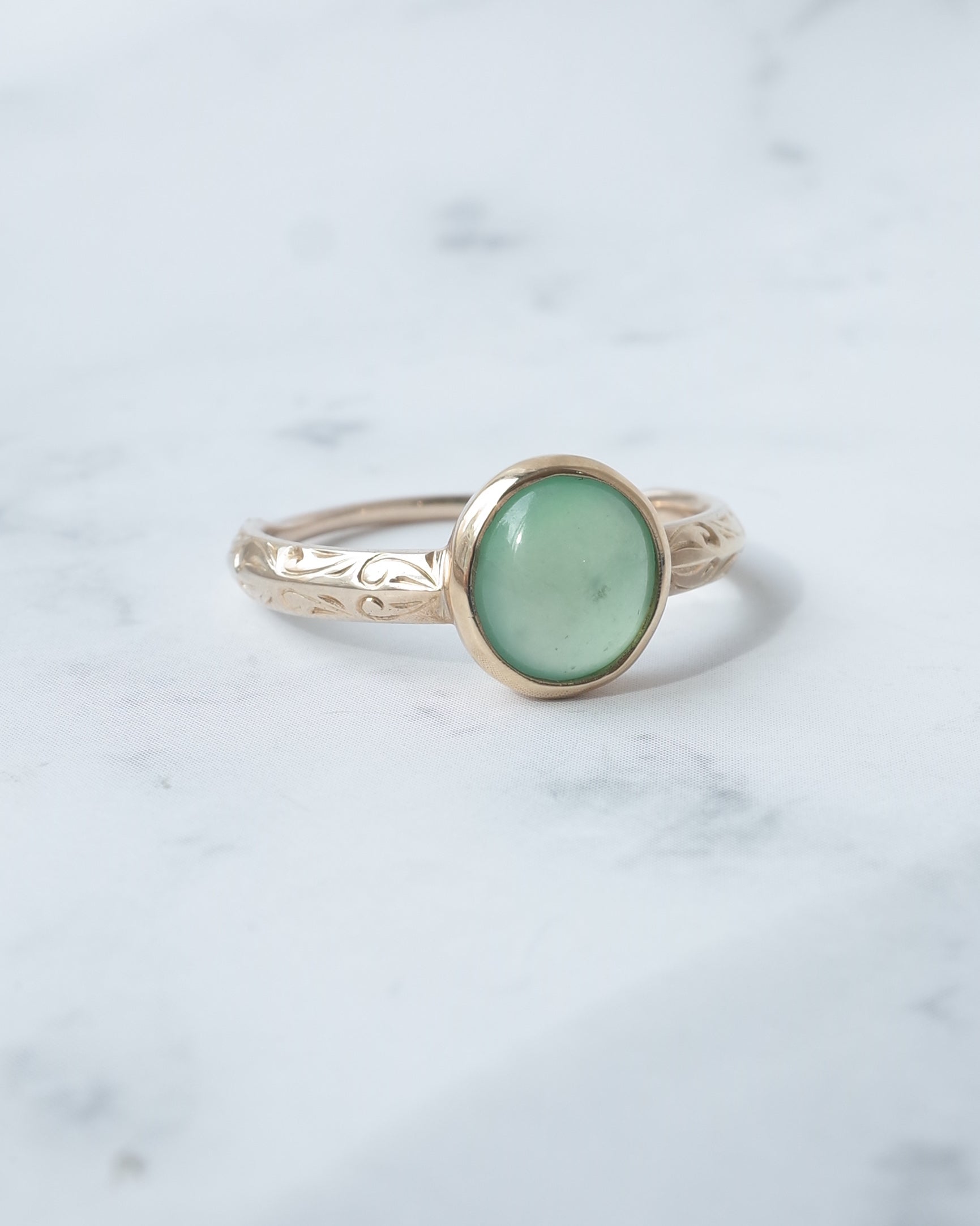 東洋の宝石「翡翠」に合わせたのは、花鳥風月をイメージたシノワズリーの彫り模様。ツタの様であったり、孔雀の羽根の様でもある、和彫りとも洋彫りとも言えないようなオリエンタルな雰囲気が、石の魅力を引き立てています。