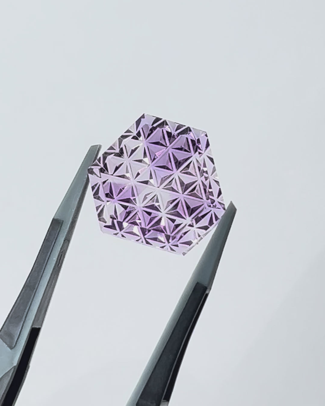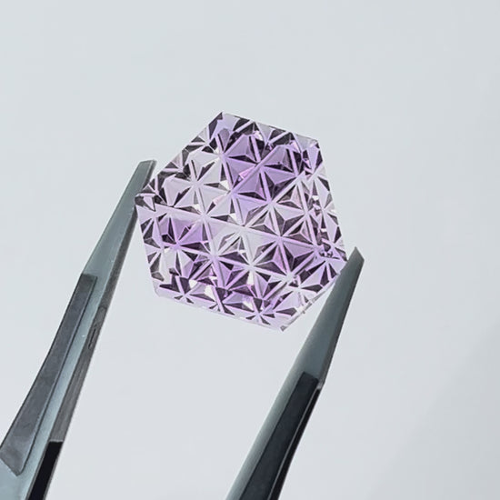 『甲州貴石切子』は、日本の伝統工芸である切子を宝石研磨に応用して生み出された、まさに日本の技術が誇る作品です。手がけているのは山梨県甲府市を拠点に活躍されている一級宝石研磨士のお二人。裏面の彫刻をジュエリークラフトの深澤陽一氏が、表面のファセットカットをシミズ貴石の清水幸雄が加工されています。どちらも「現代の名工」の名誉に輝く熟練の研磨職人さんです。