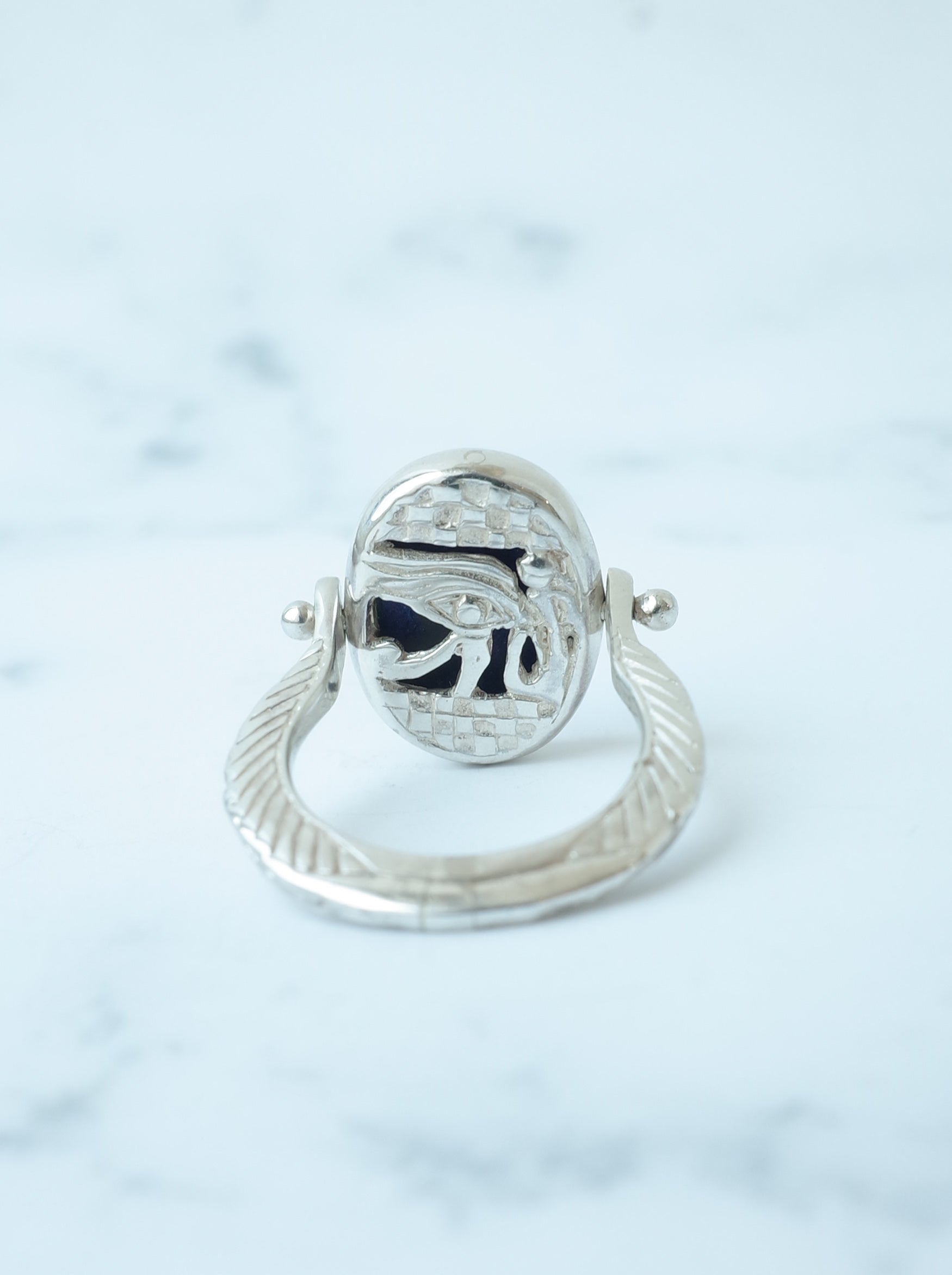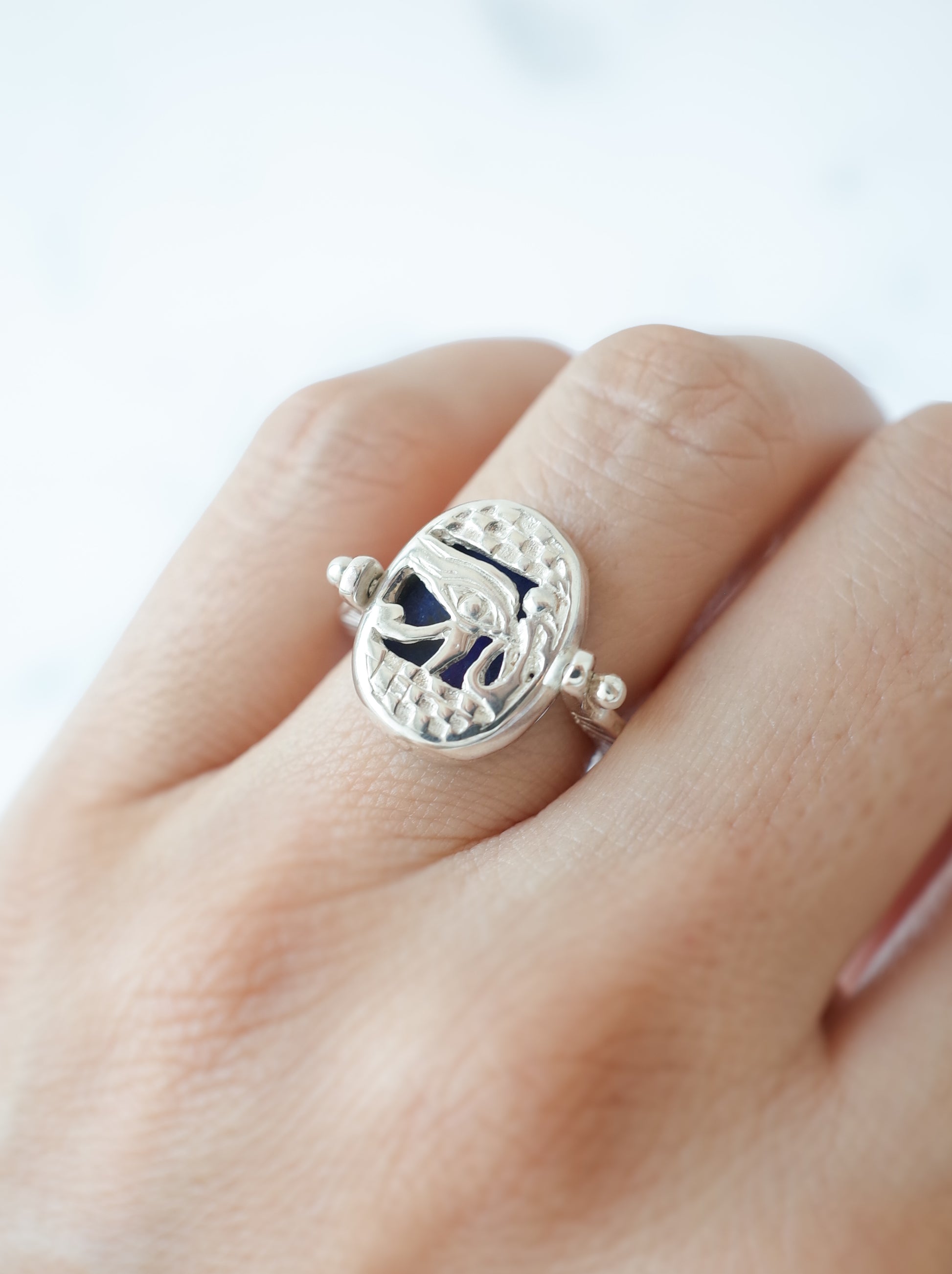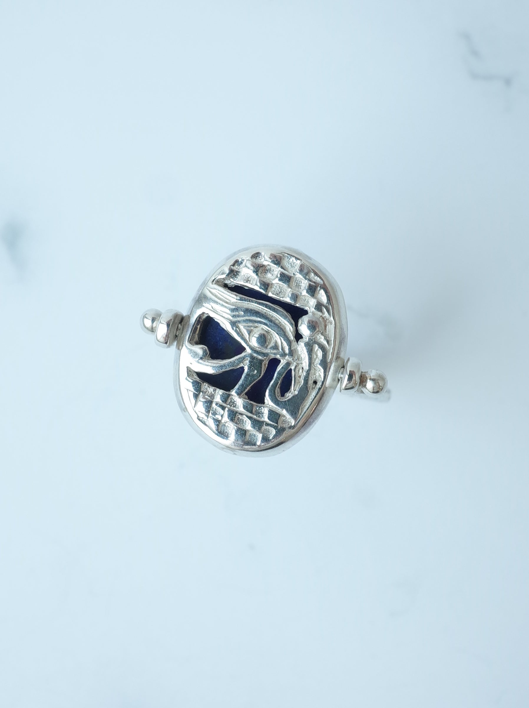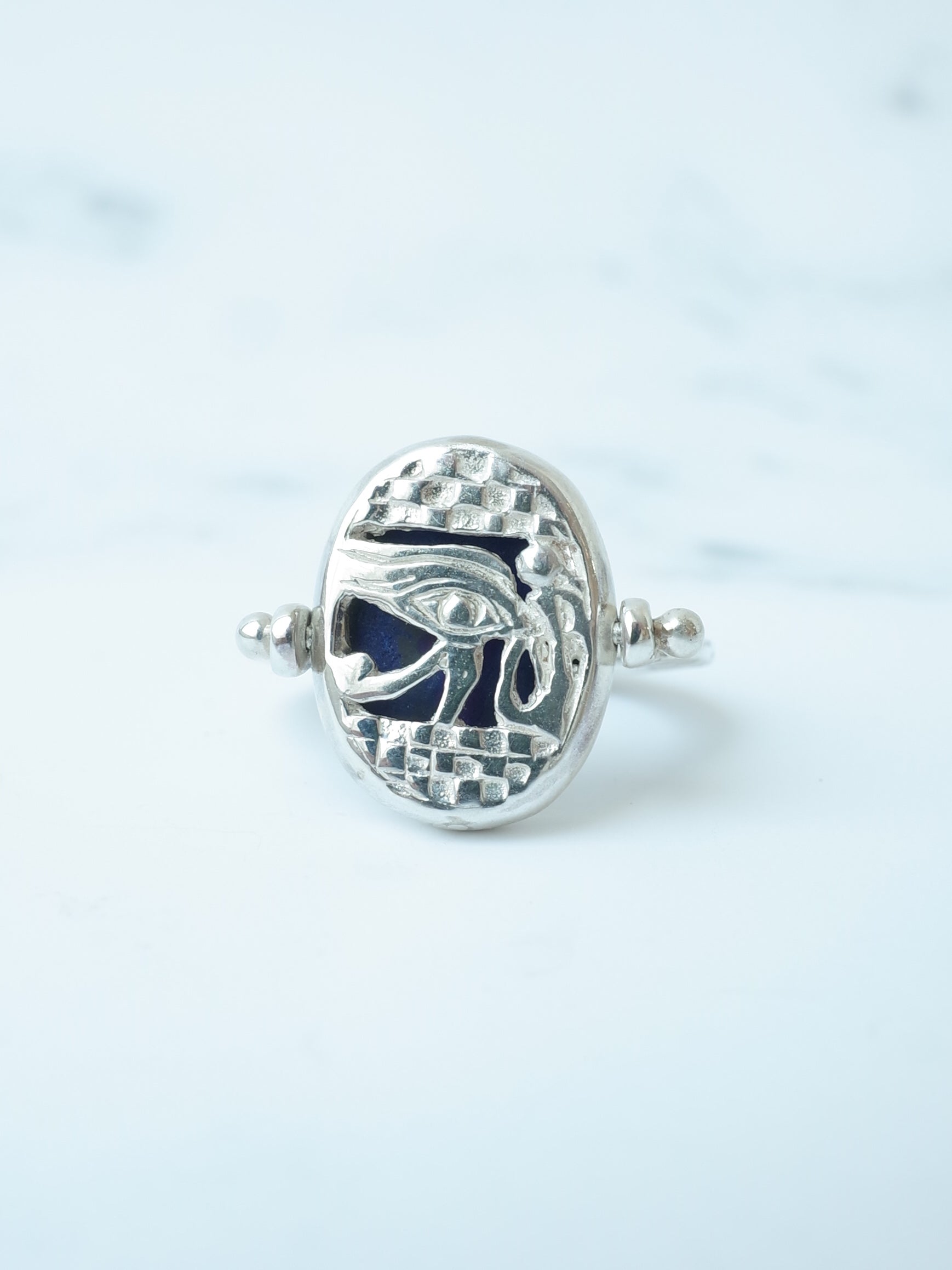 深い青色が美しいラピスラズリを、古代エジプトで魔除けや護符として使われてた「ホルスの目」のデザインでリバーシブルリングに仕立てました。