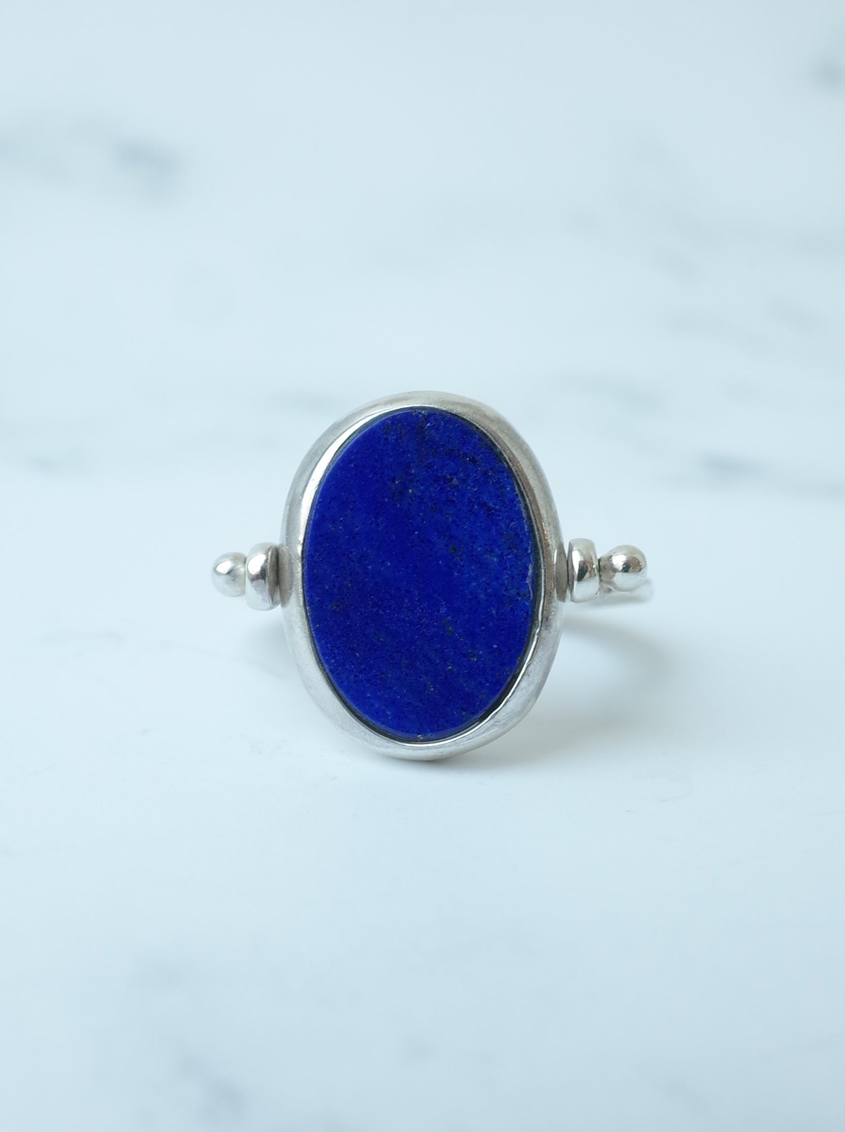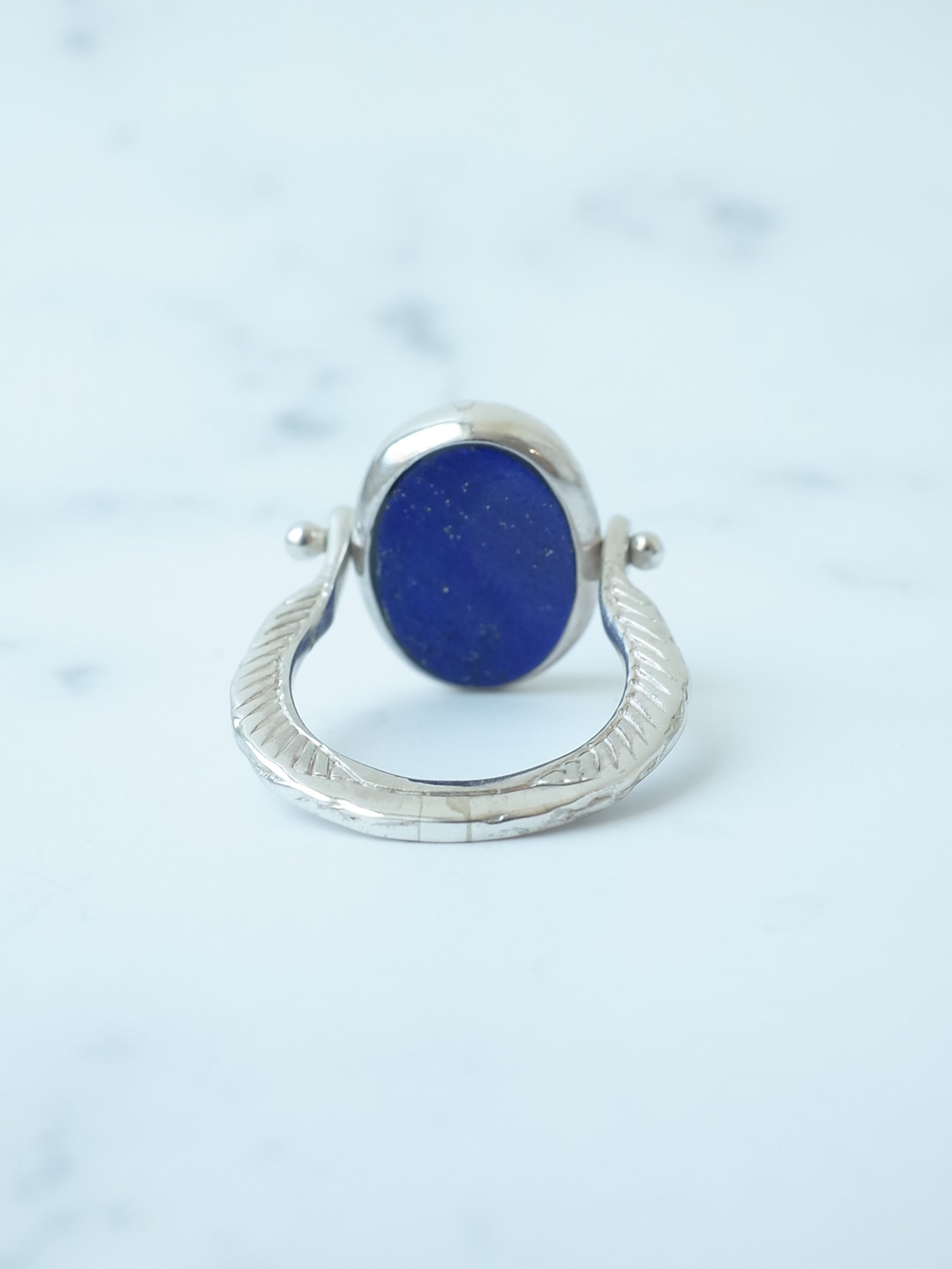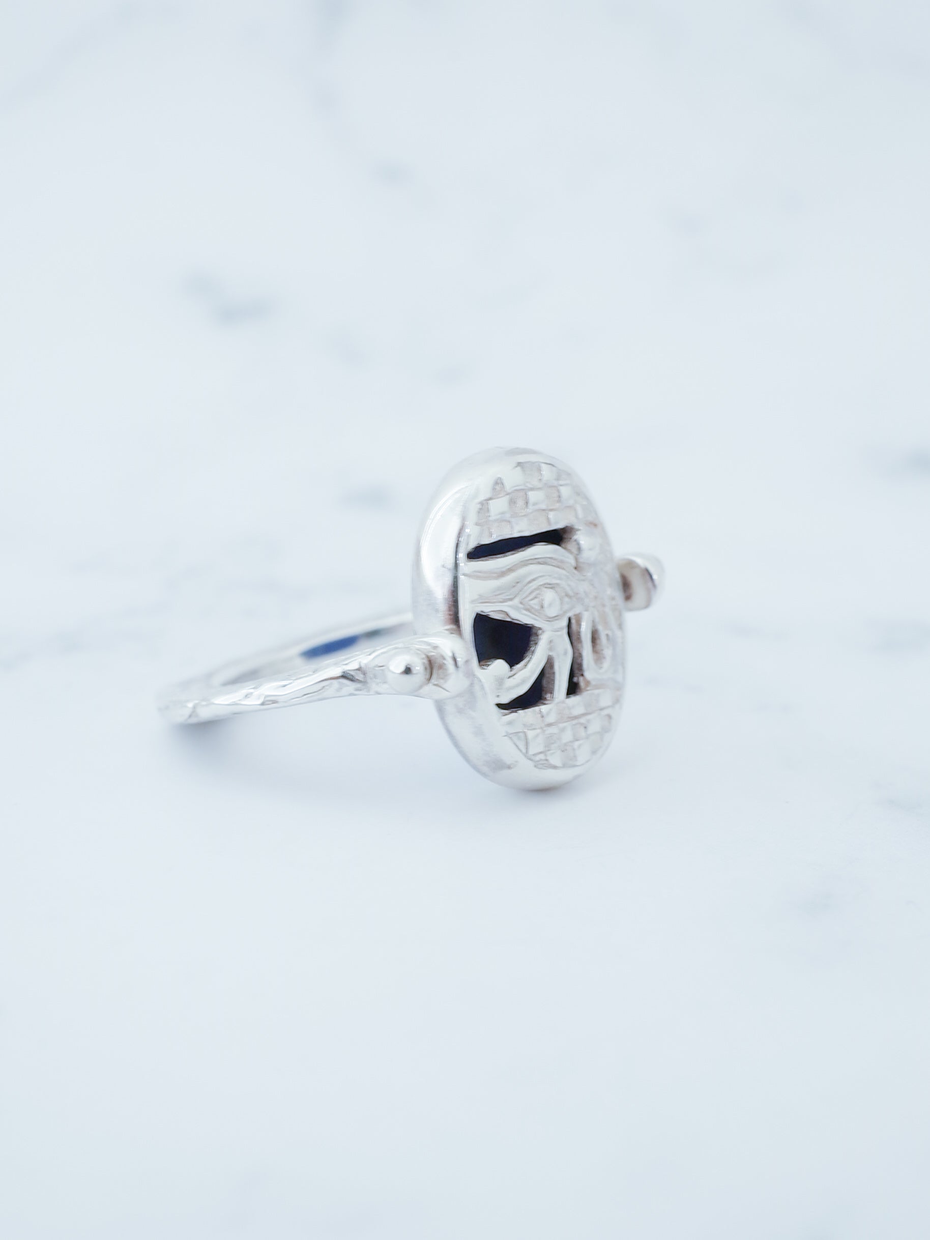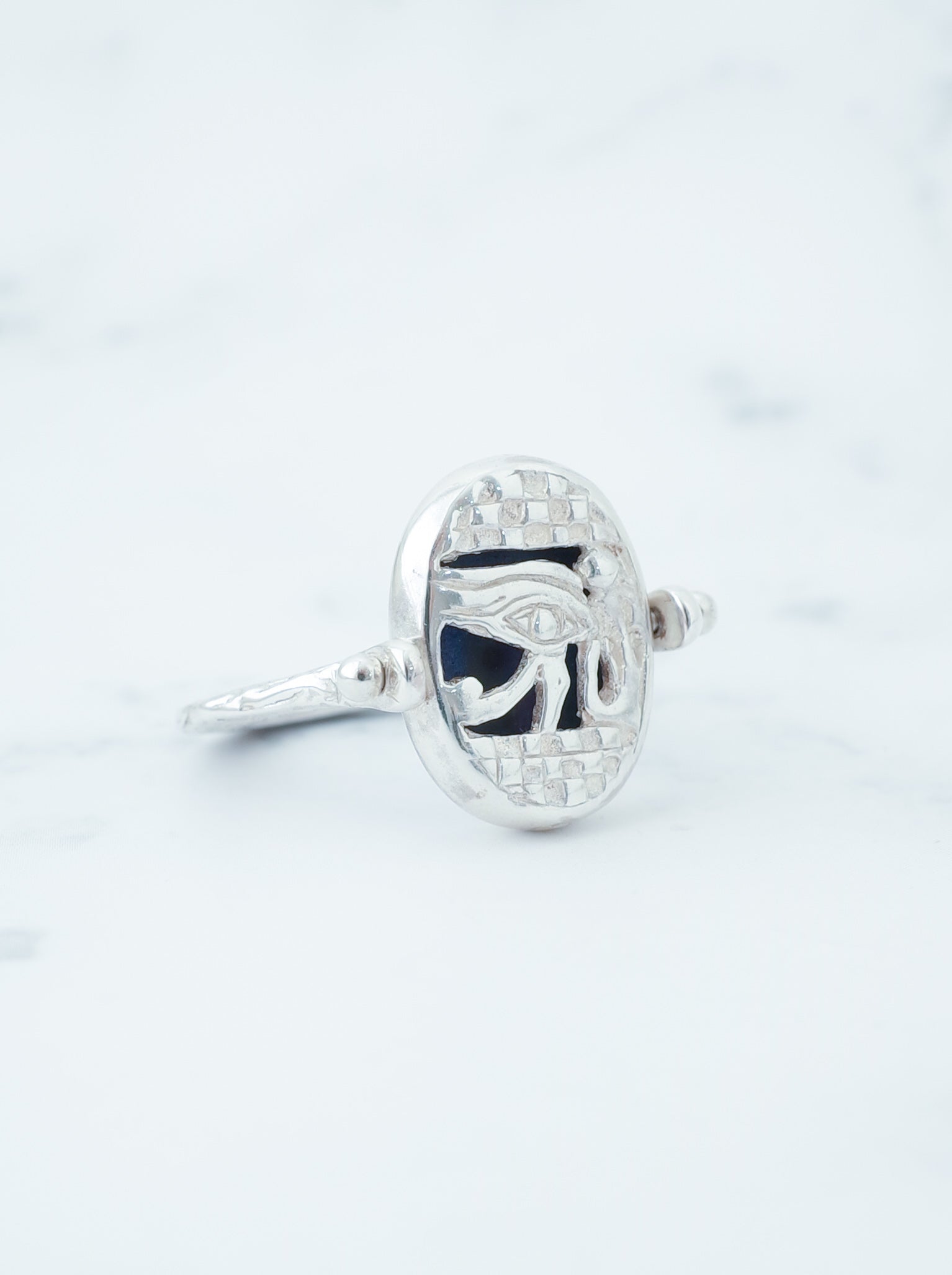 深い青色が美しいラピスラズリを、古代エジプトで魔除けや護符として使われてた「ホルスの目」のデザインでリバーシブルリングに仕立てました。