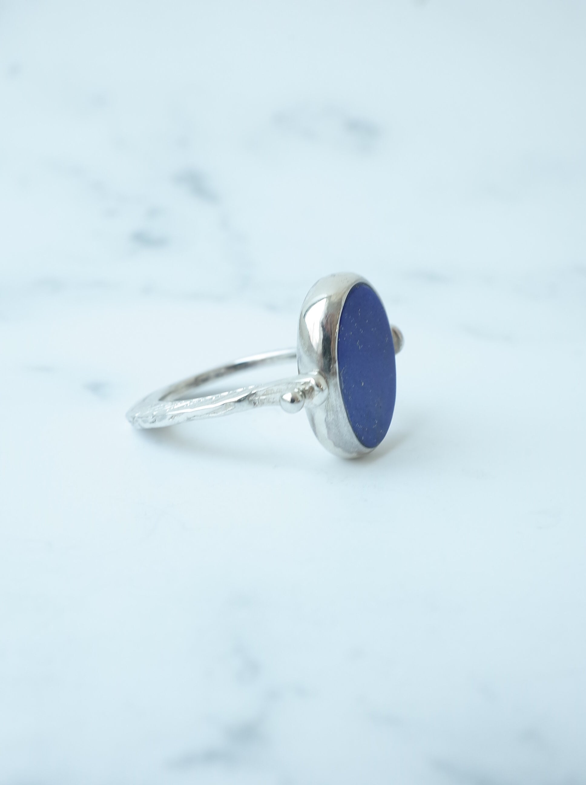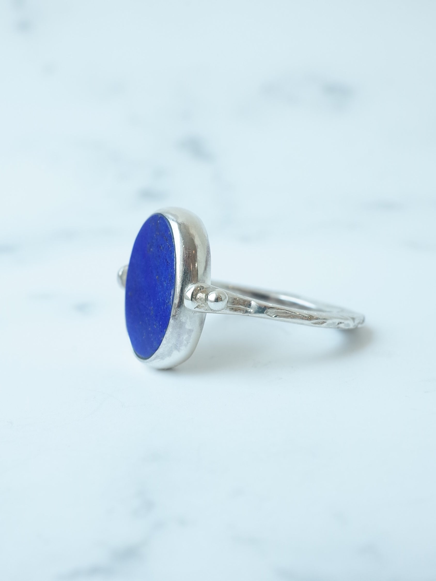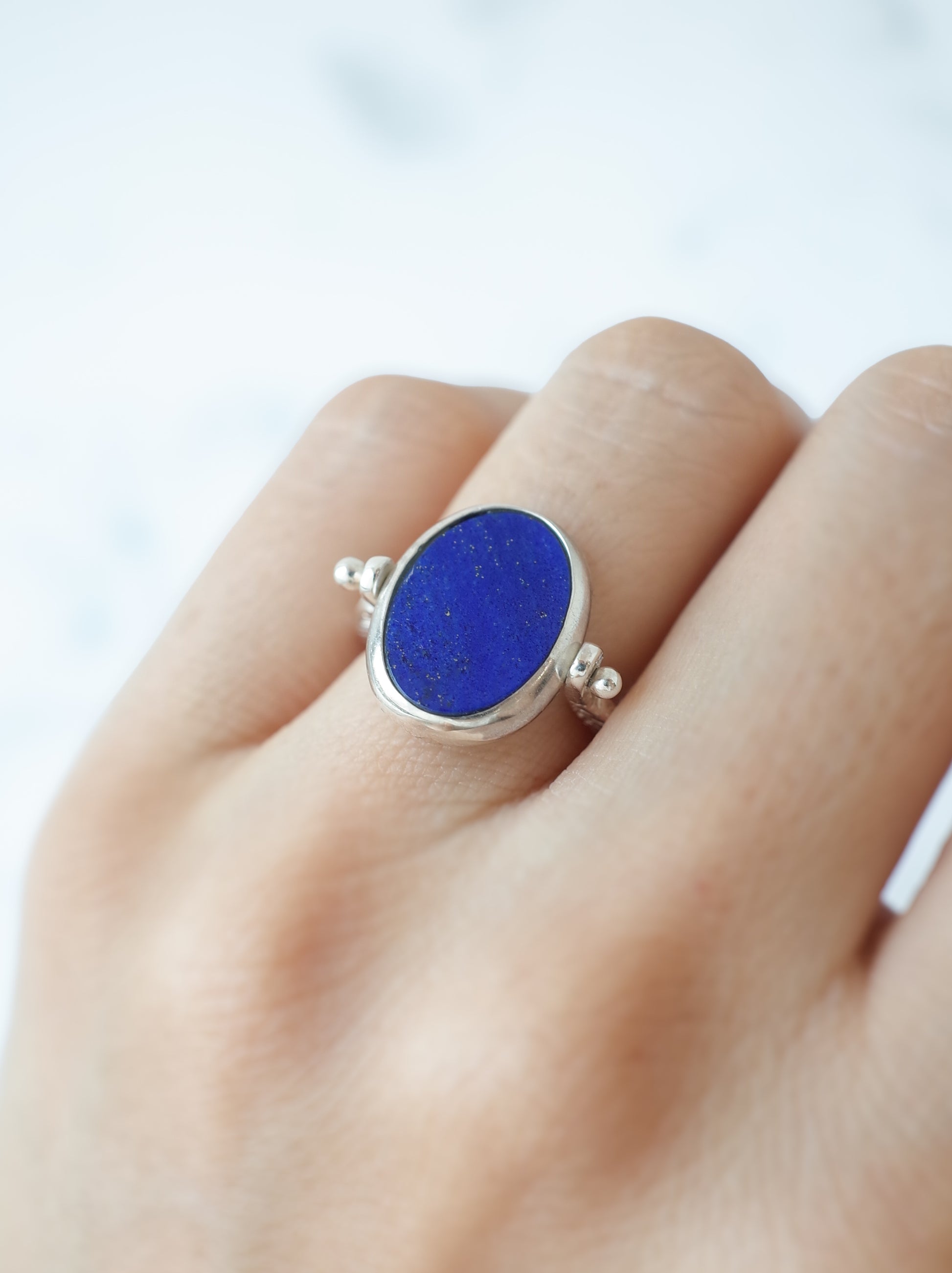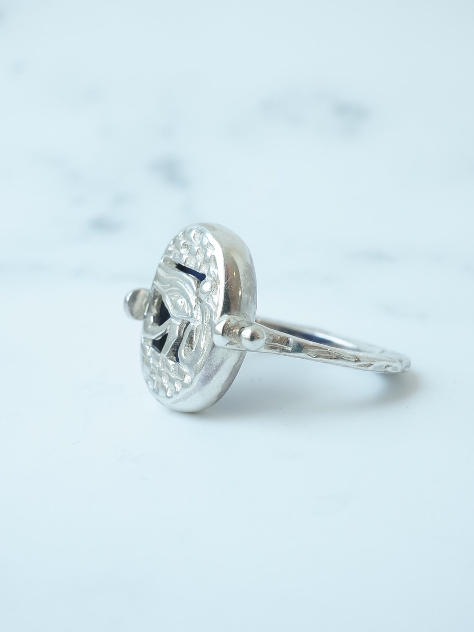 深い青色が美しいラピスラズリを、古代エジプトで魔除けや護符として使われてた「ホルスの目」のデザインでリバーシブルリングに仕立てました。