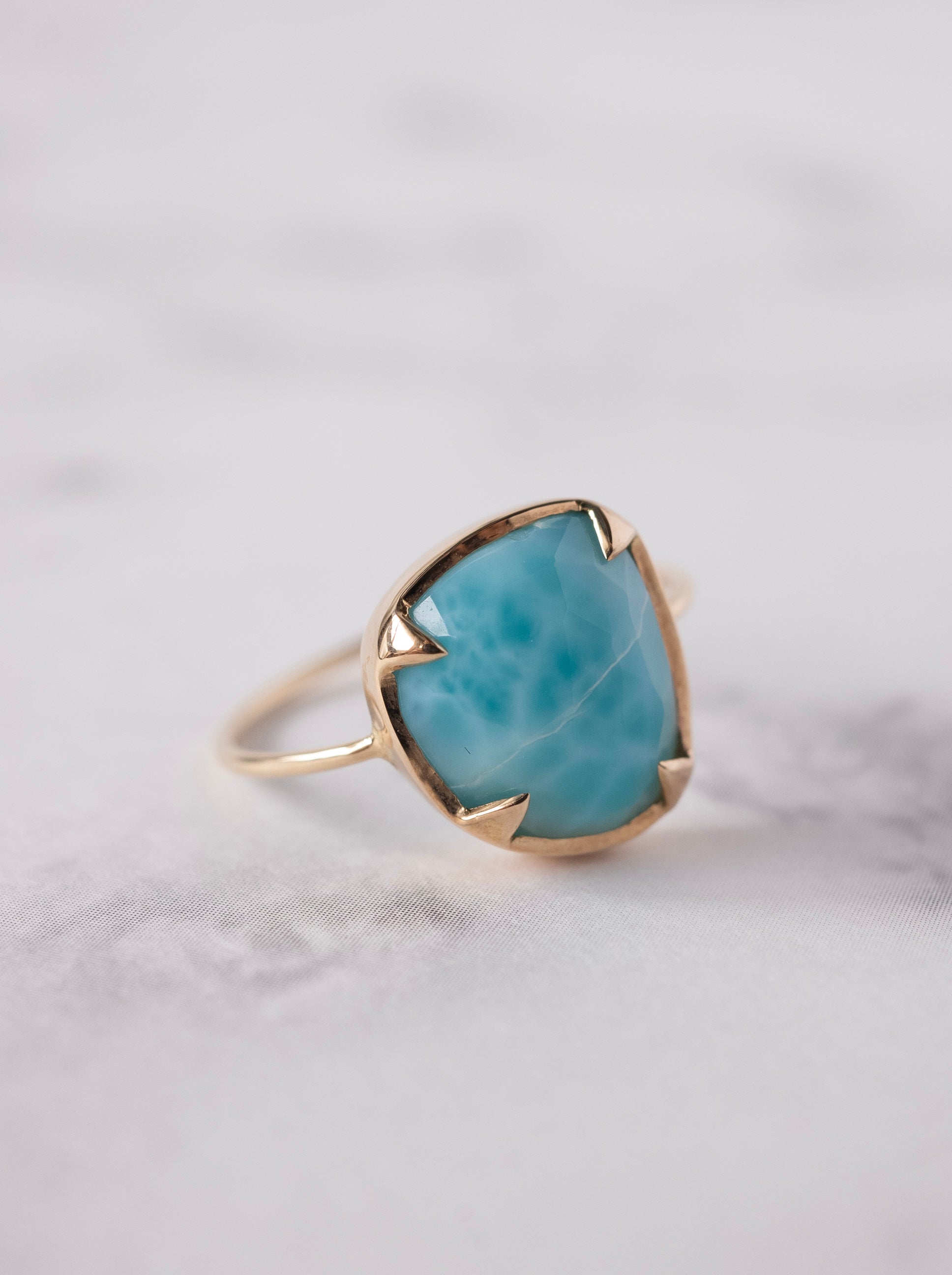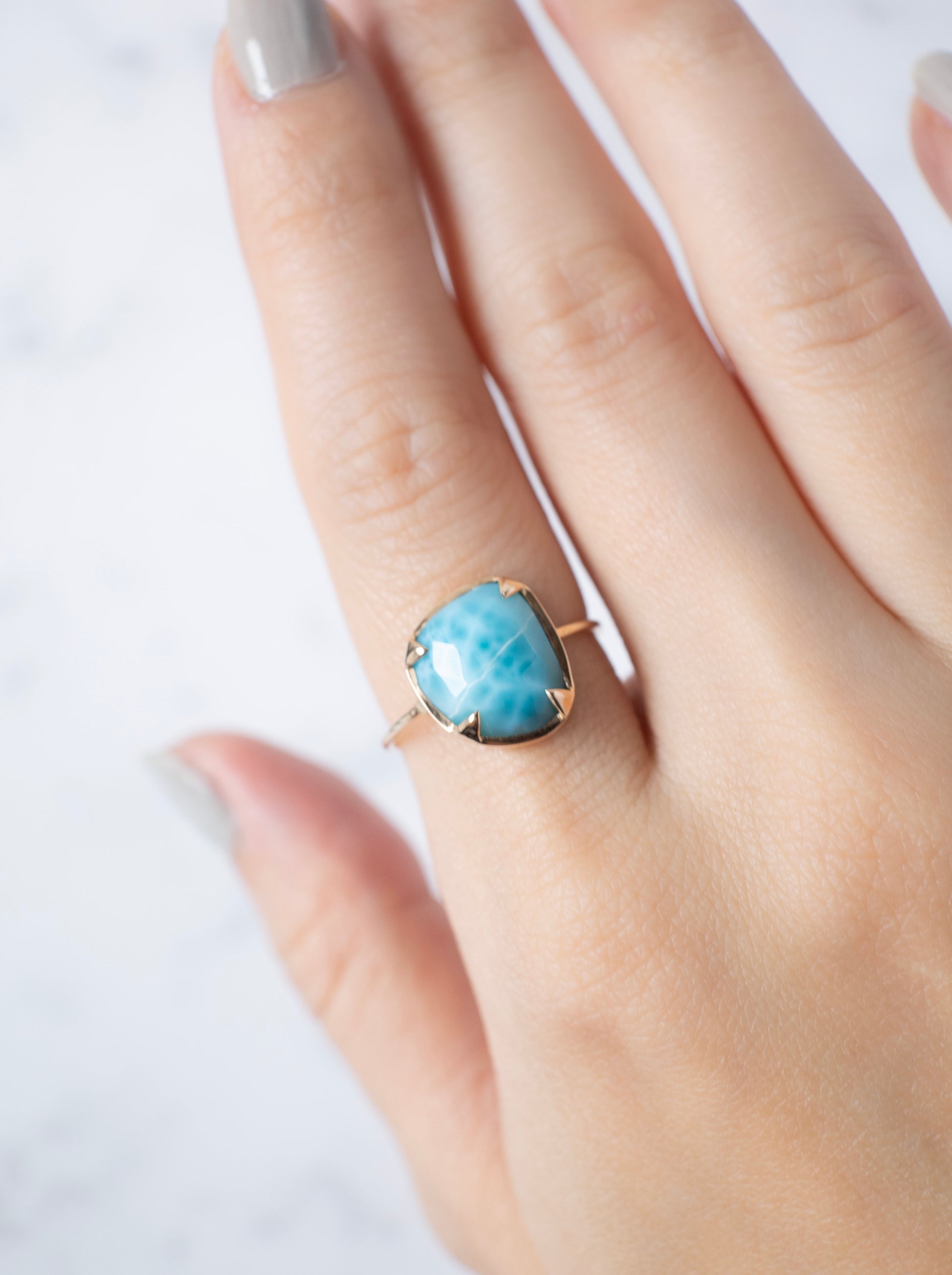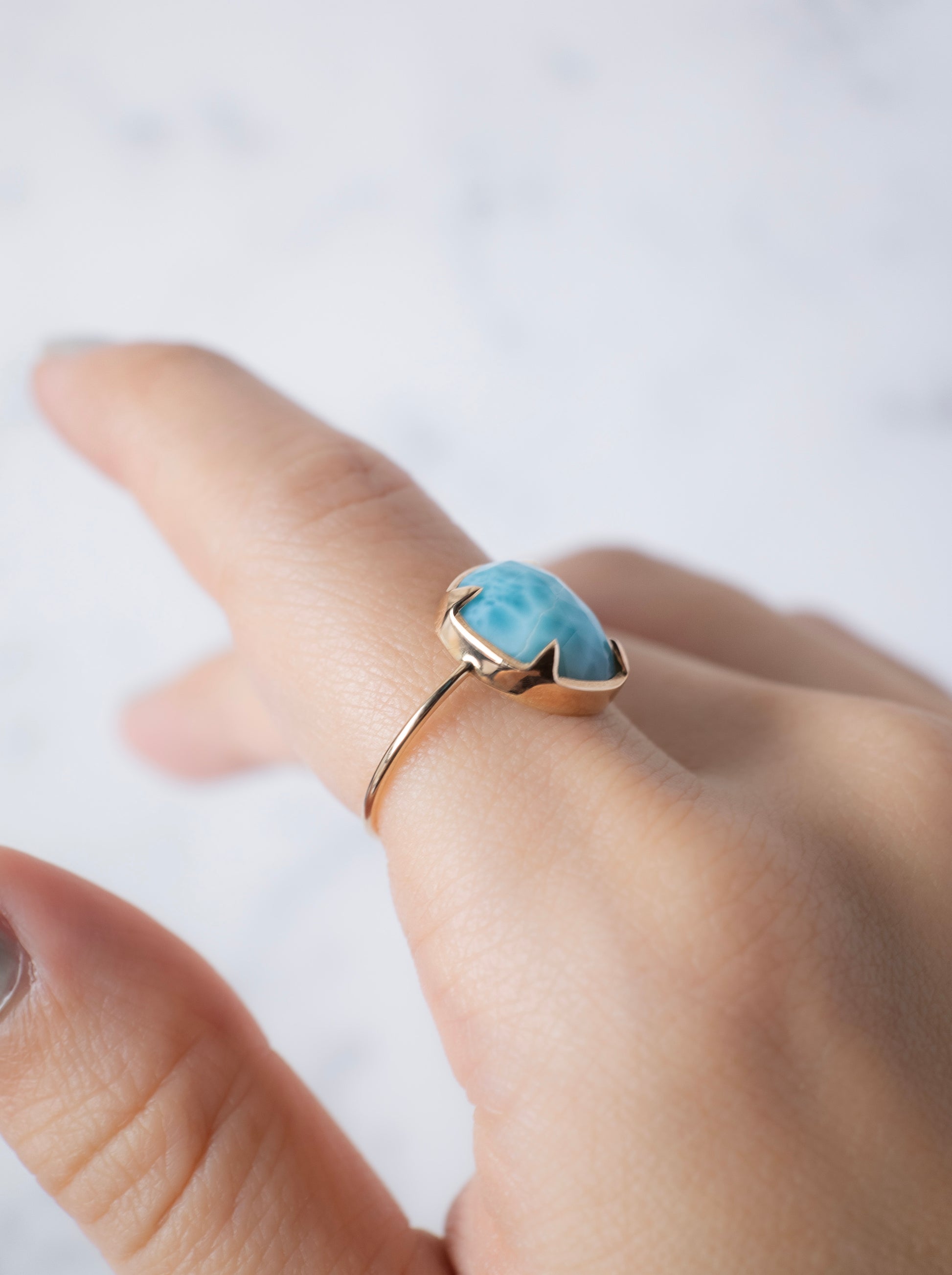 海を象徴するような天然石「ラリマー」のミニミニサイズのリングです。水面のような煌めきをプラスするように、表面にはファセットカットを施しました。小ぶりな石に合わせ、アームも細くデザインされていますので、カジュアルに使ったり重ね付けにもおすすめです。