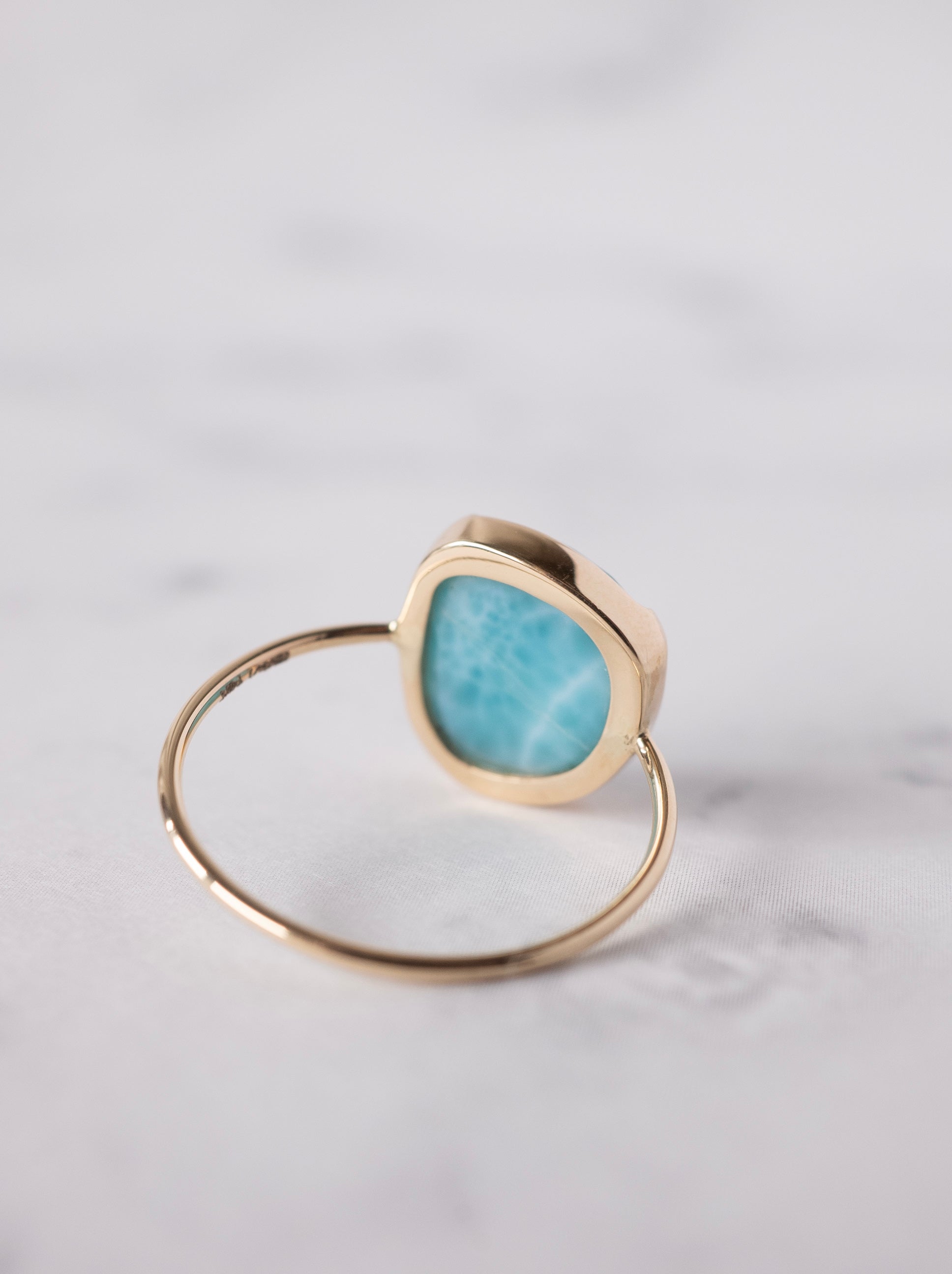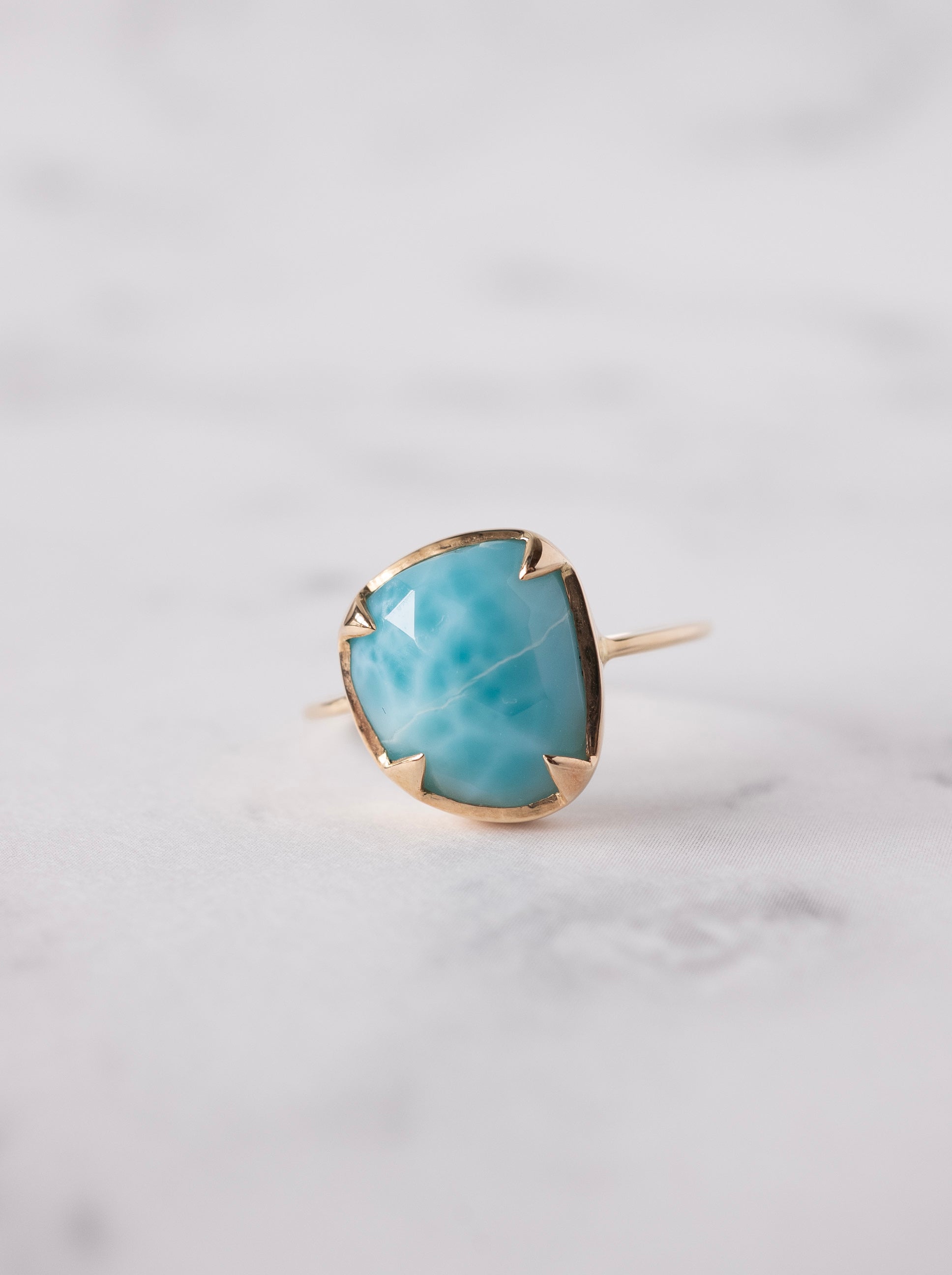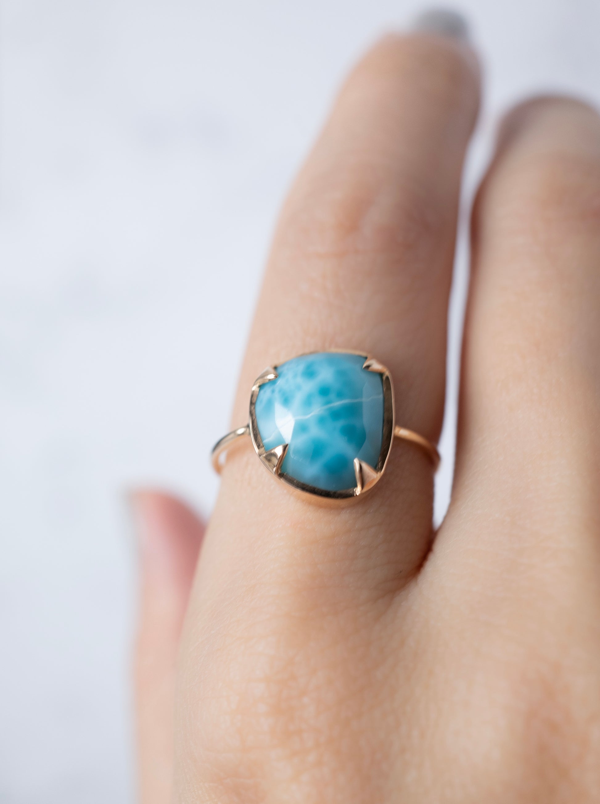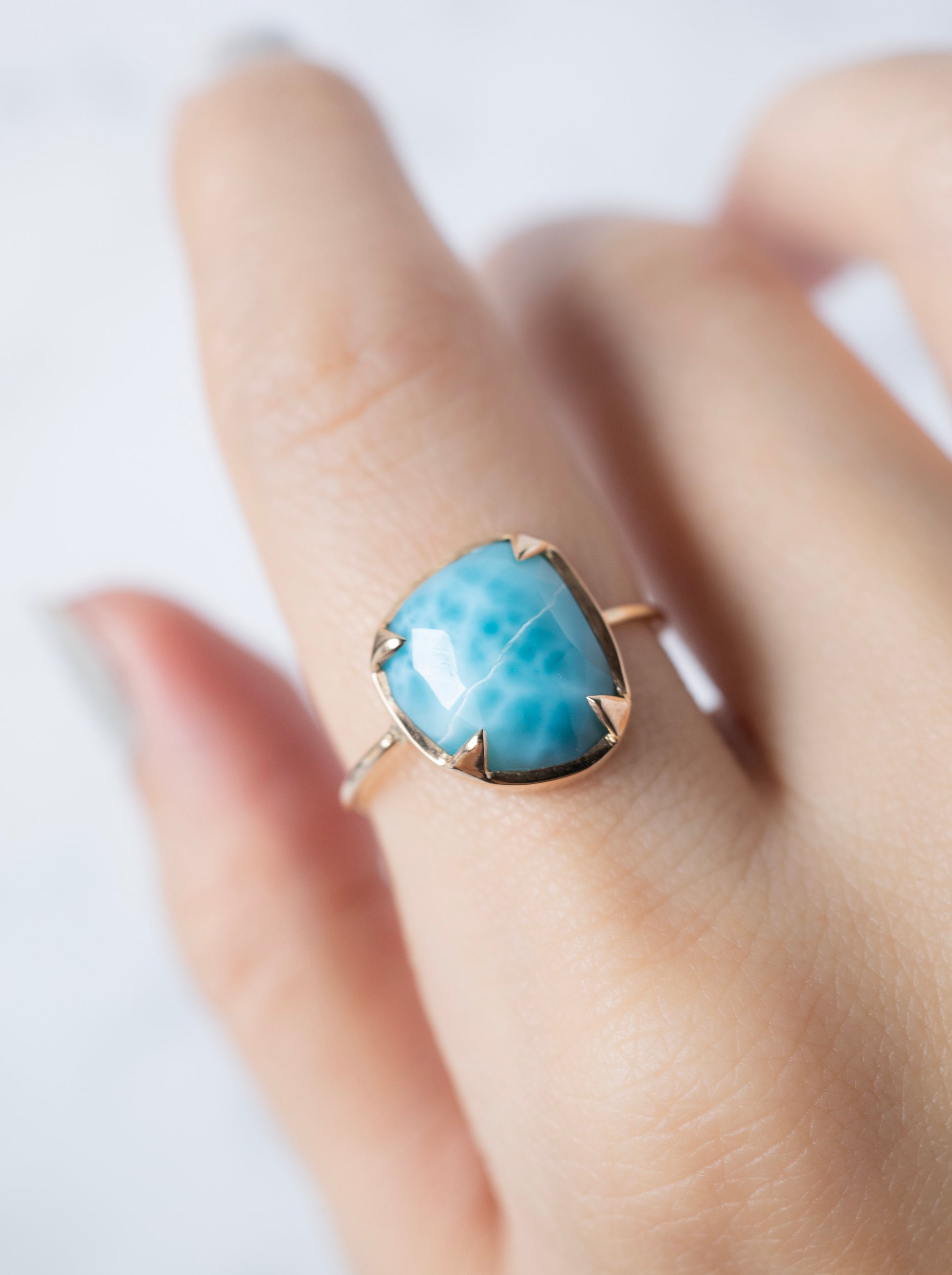 海を象徴するような天然石「ラリマー」のミニミニサイズのリングです。水面のような煌めきをプラスするように、表面にはファセットカットを施しました。小ぶりな石に合わせ、アームも細くデザインされていますので、カジュアルに使ったり重ね付けにもおすすめです。