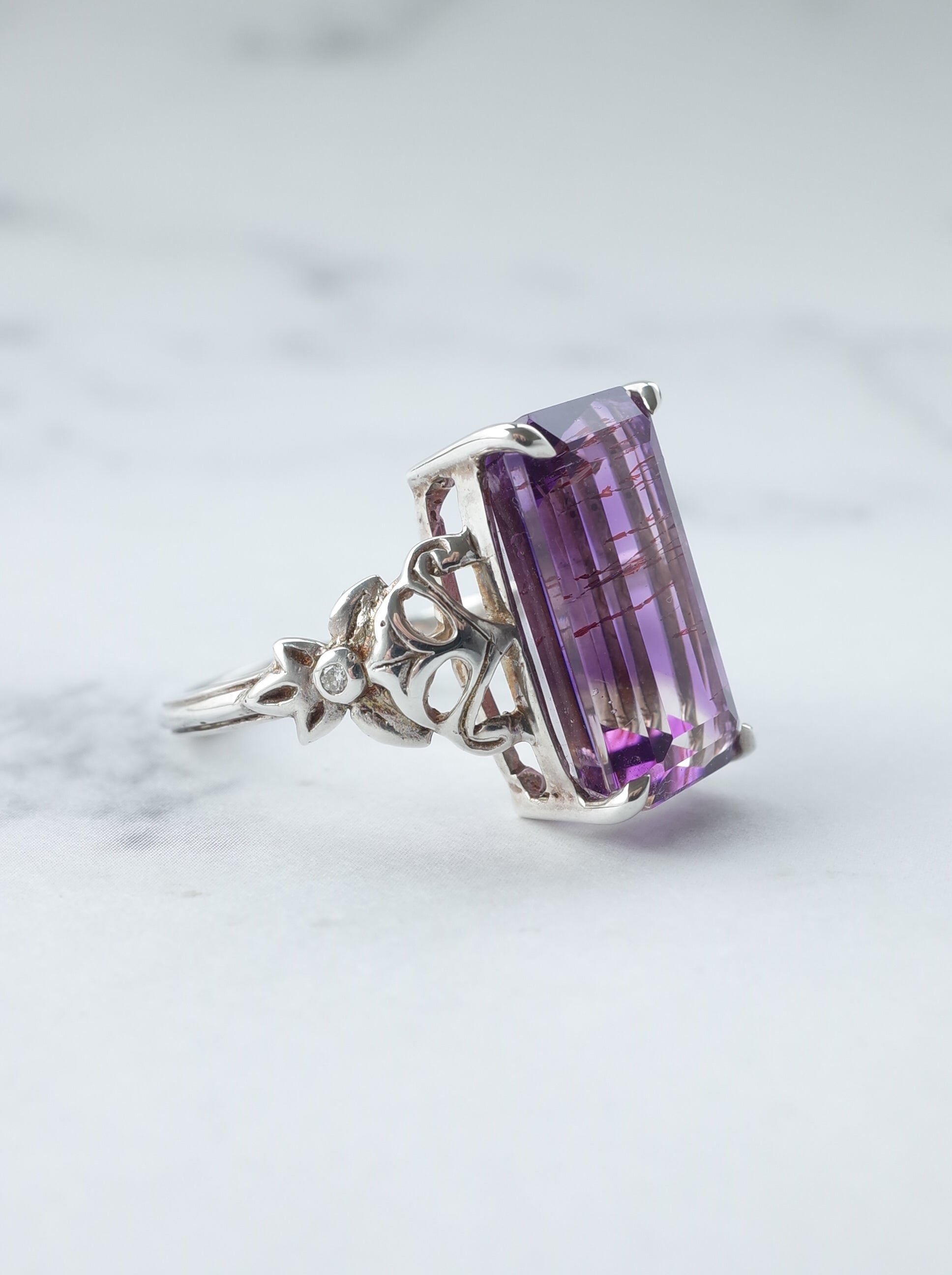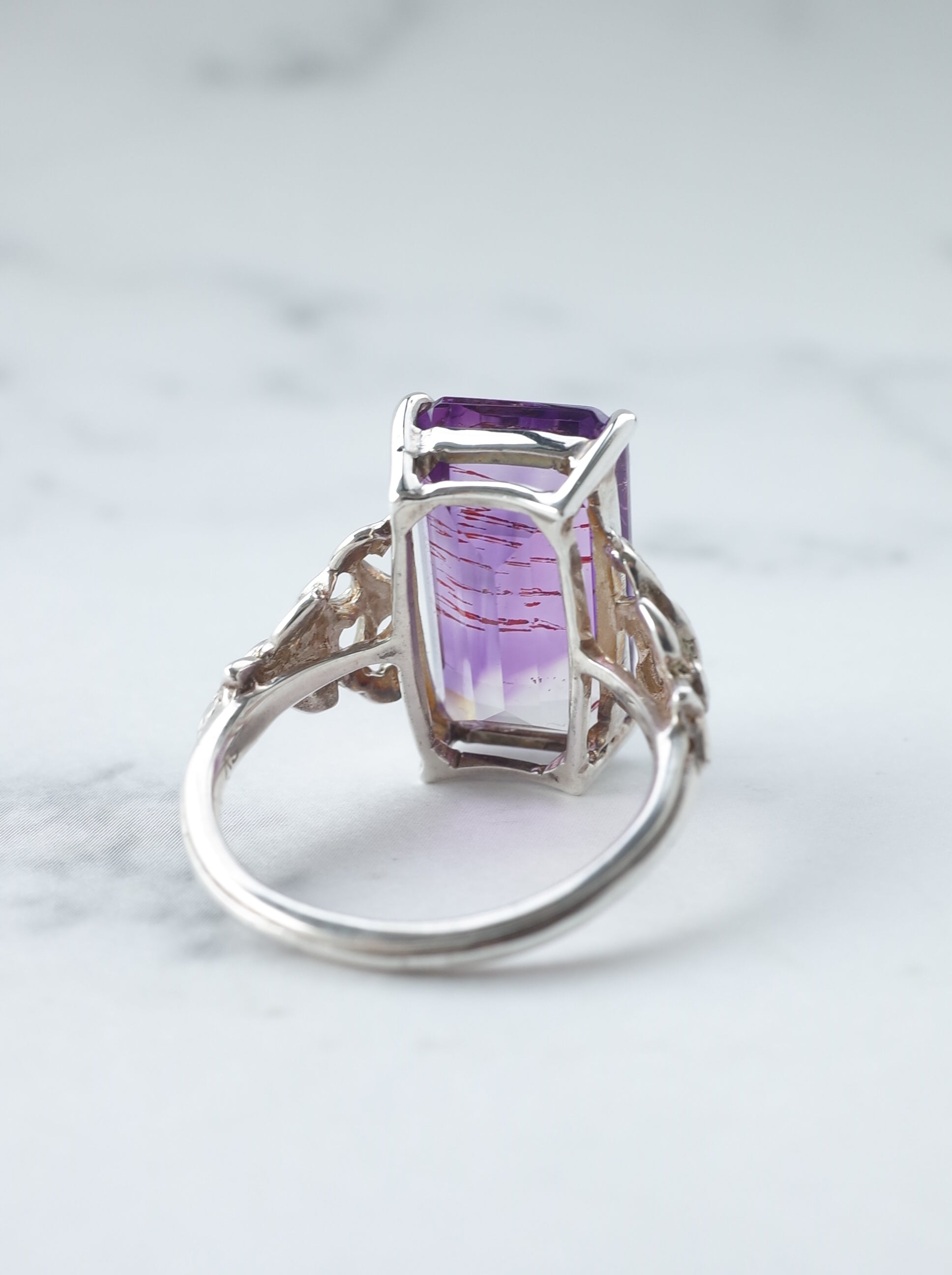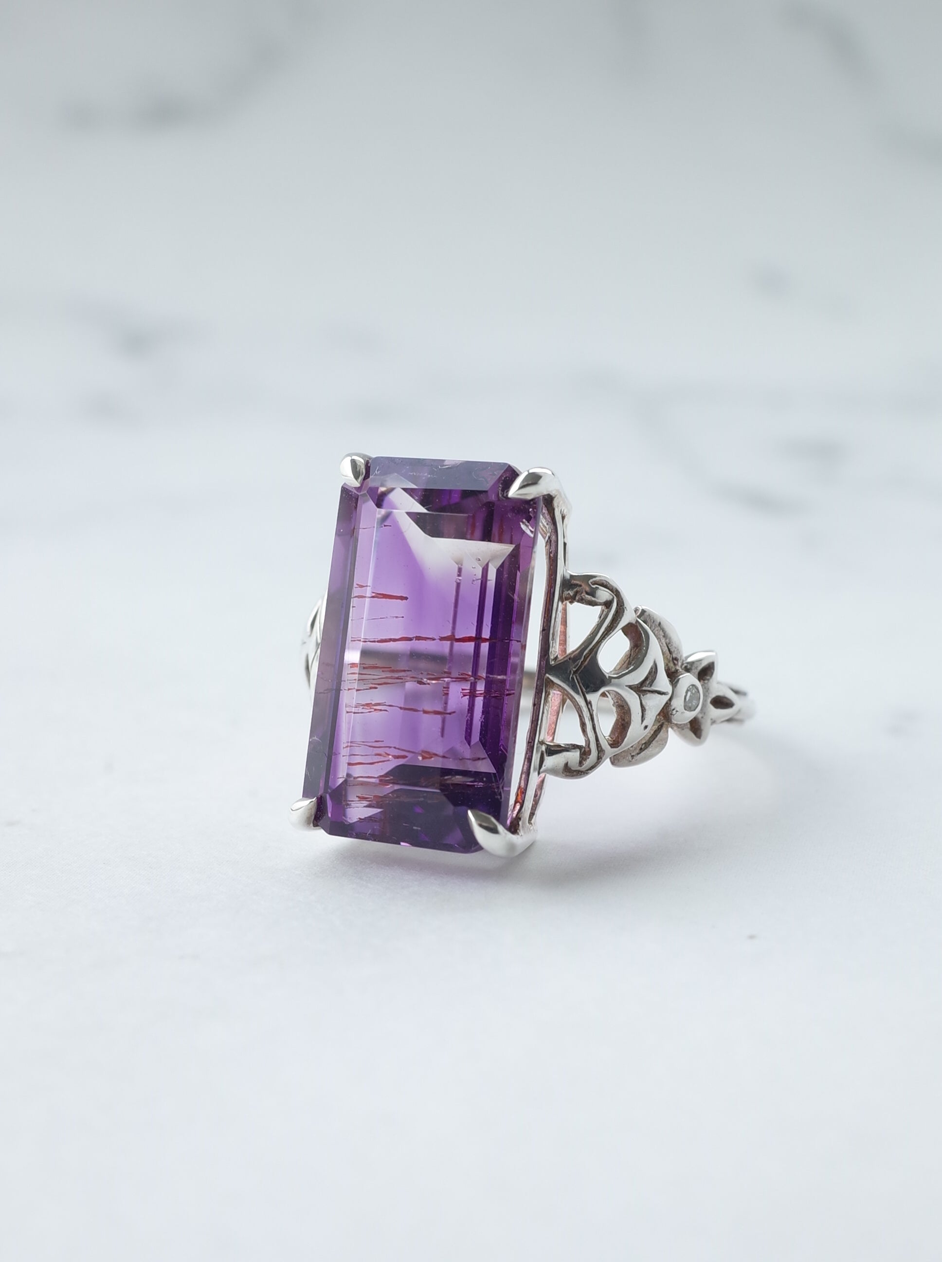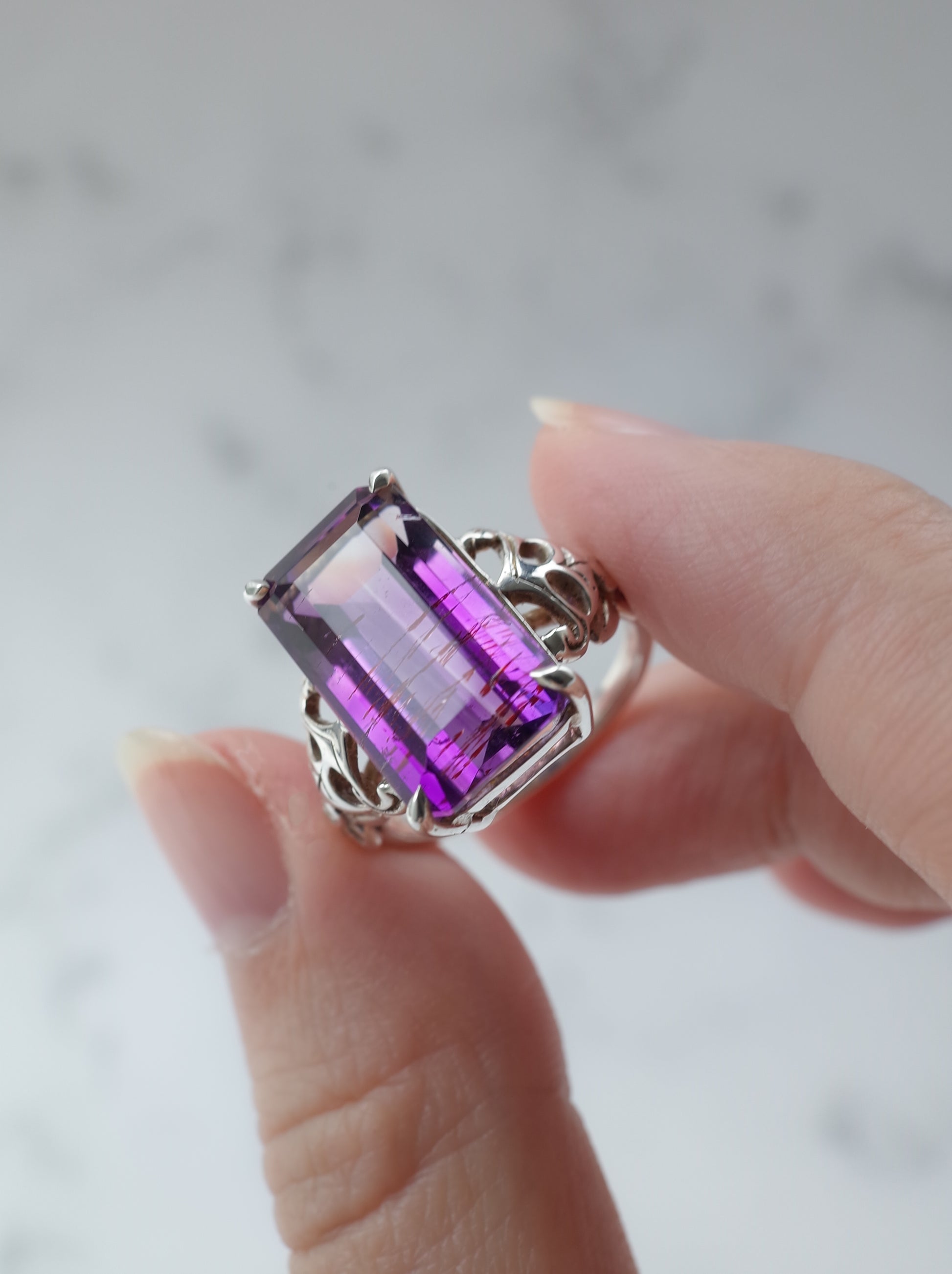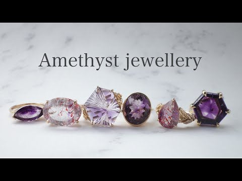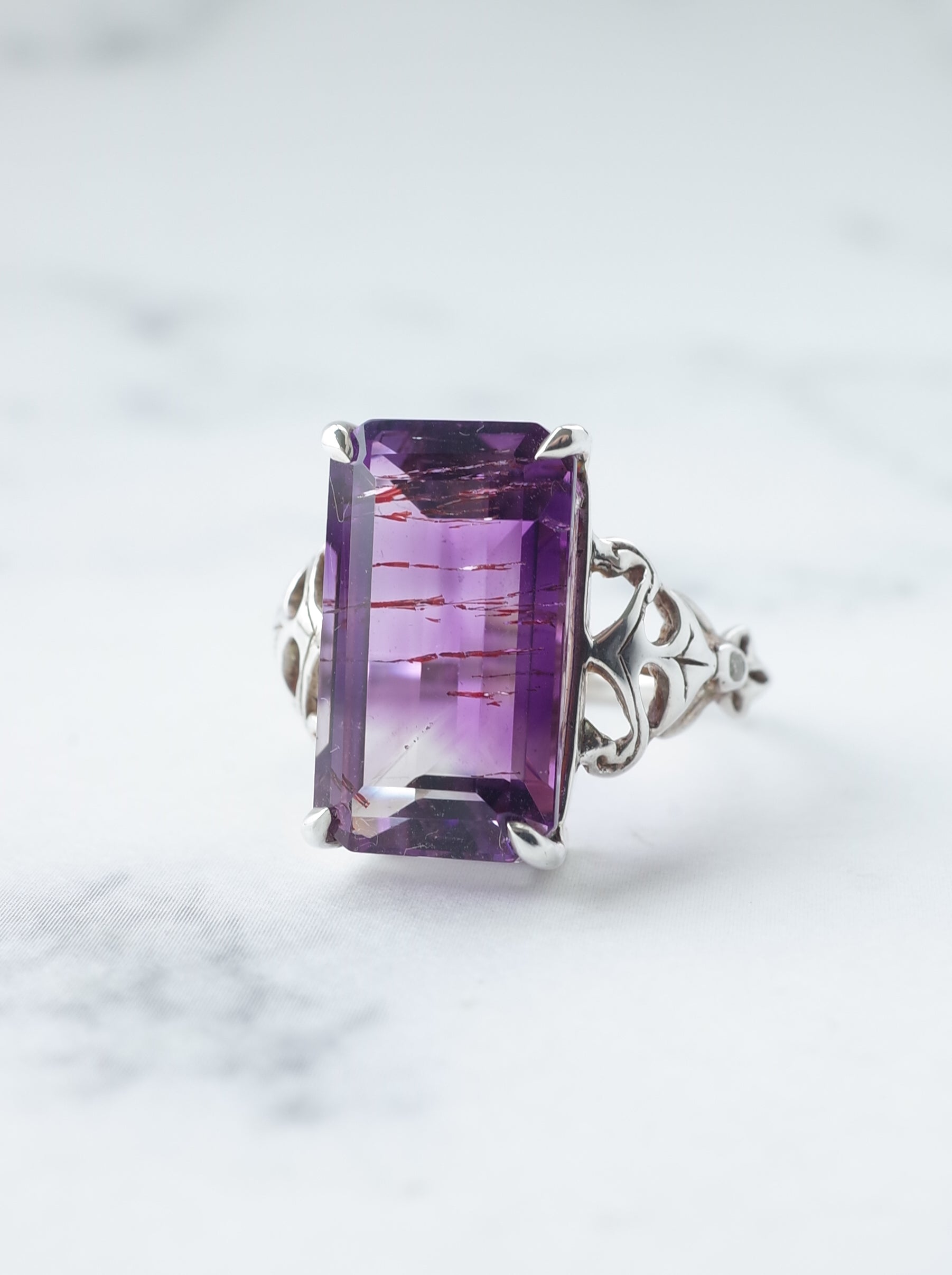2月の誕生石アメシスト。同じ紫色の宝石でもインクルージョンの種類や入り方で個性も様々です。こちらは赤色のレピドクロサイトを内包したタイプ。アームはタイの寺院の装飾から着想を得たデザインです。色がグラデーションしていく美しさと、きらりと光る内包物の煌めきをお楽しみください。