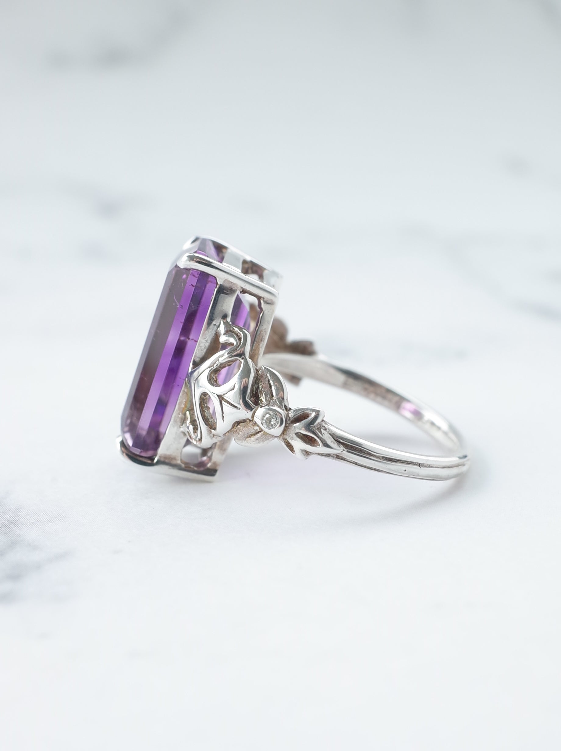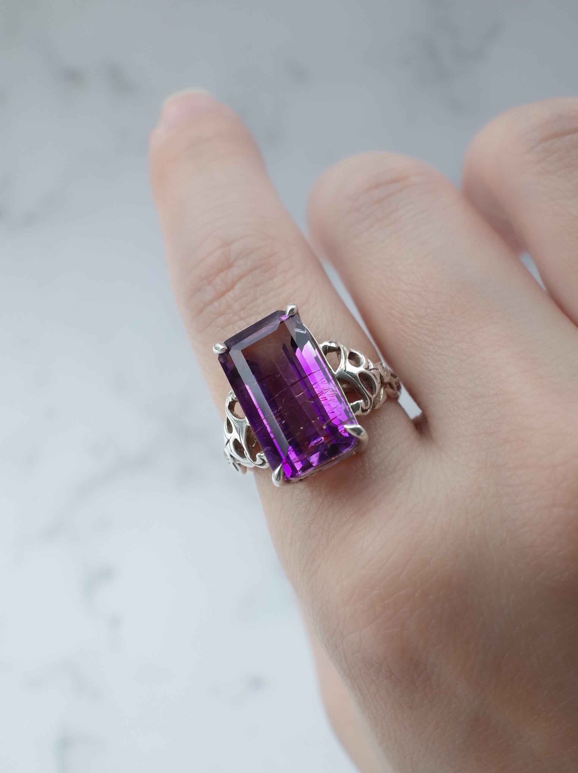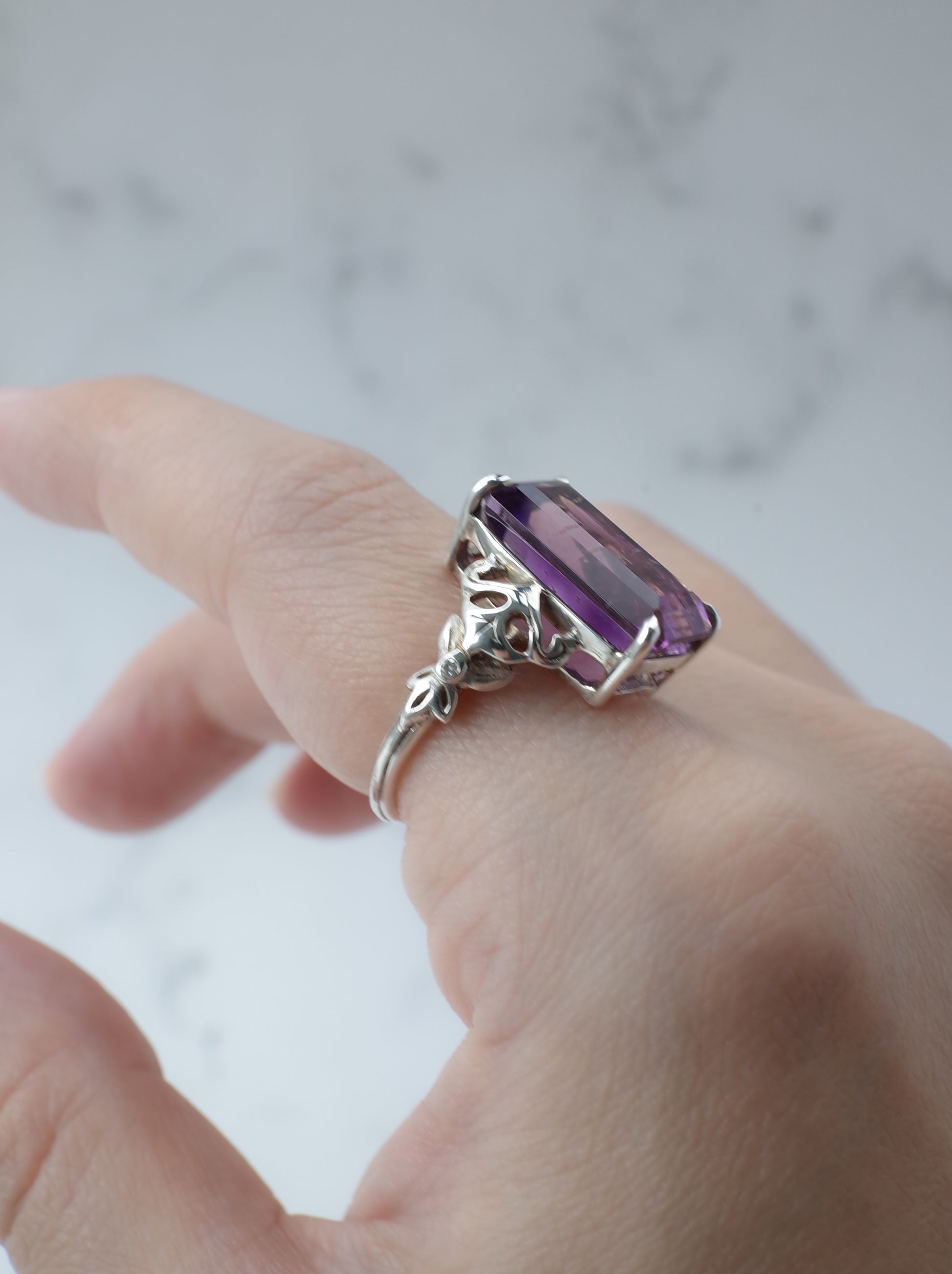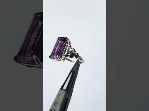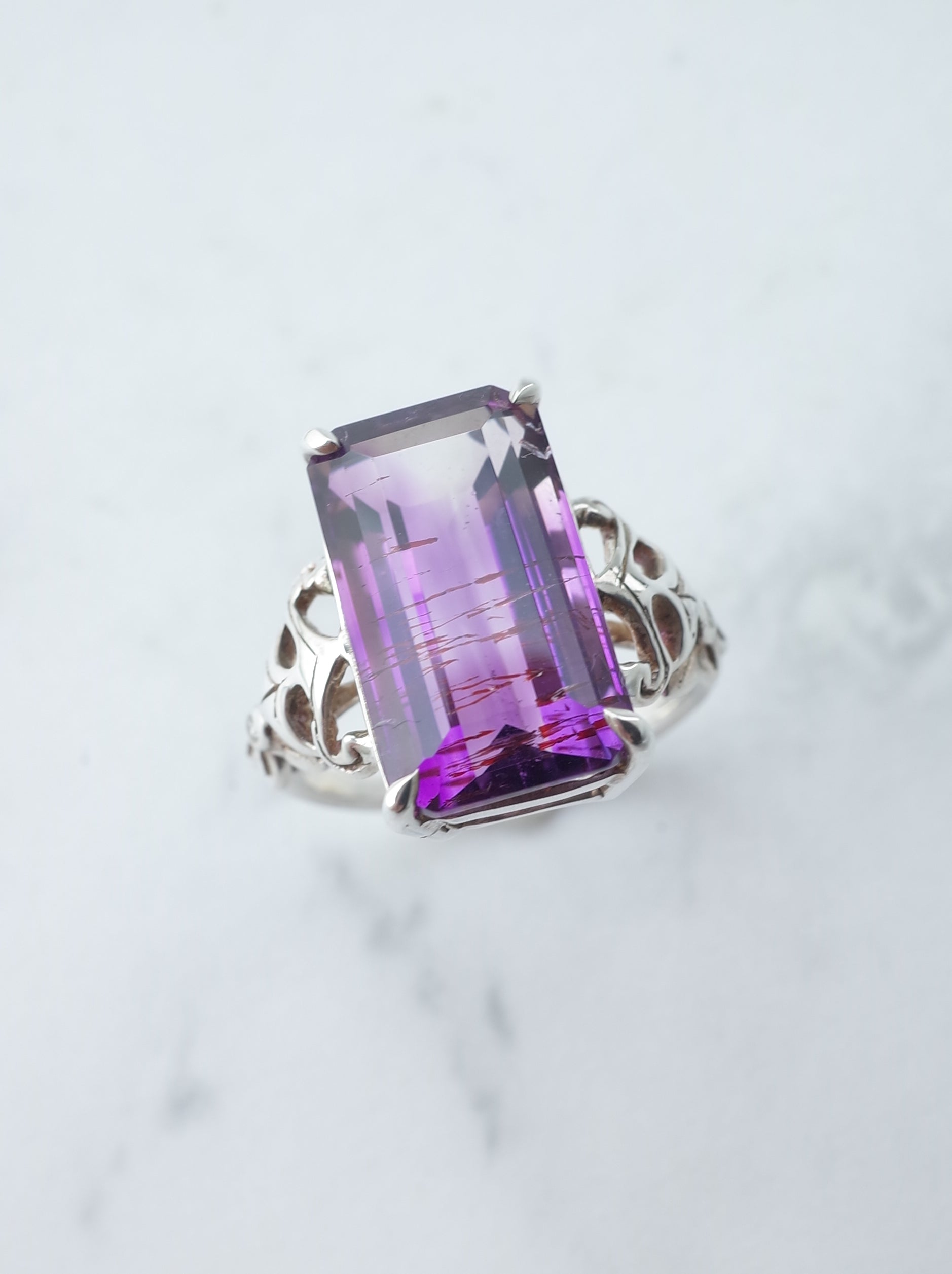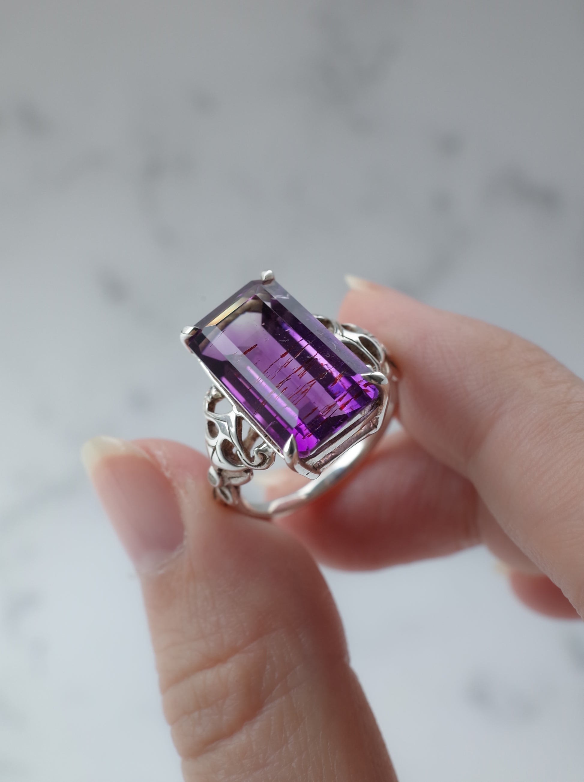 2月の誕生石アメシスト。同じ紫色の宝石でもインクルージョンの種類や入り方で個性も様々です。こちらは赤色のレピドクロサイトを内包したタイプ。アームはタイの寺院の装飾から着想を得たデザインです。色がグラデーションしていく美しさと、きらりと光る内包物の煌めきをお楽しみください。
