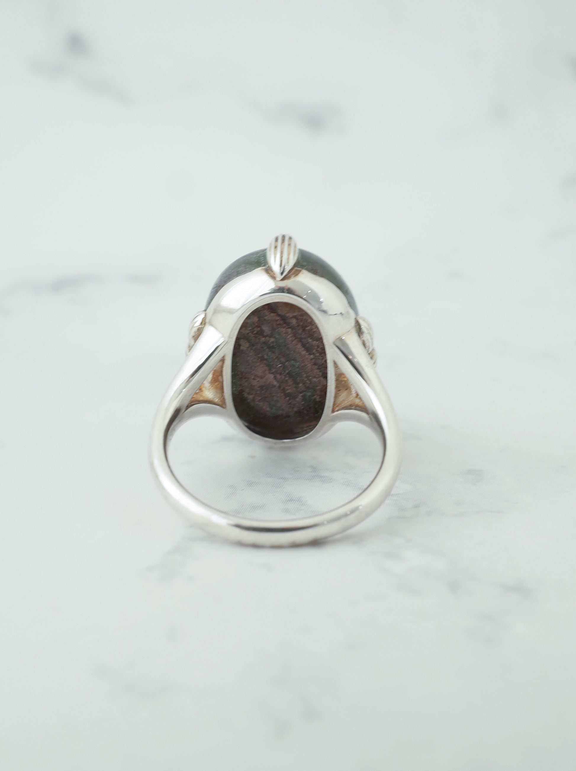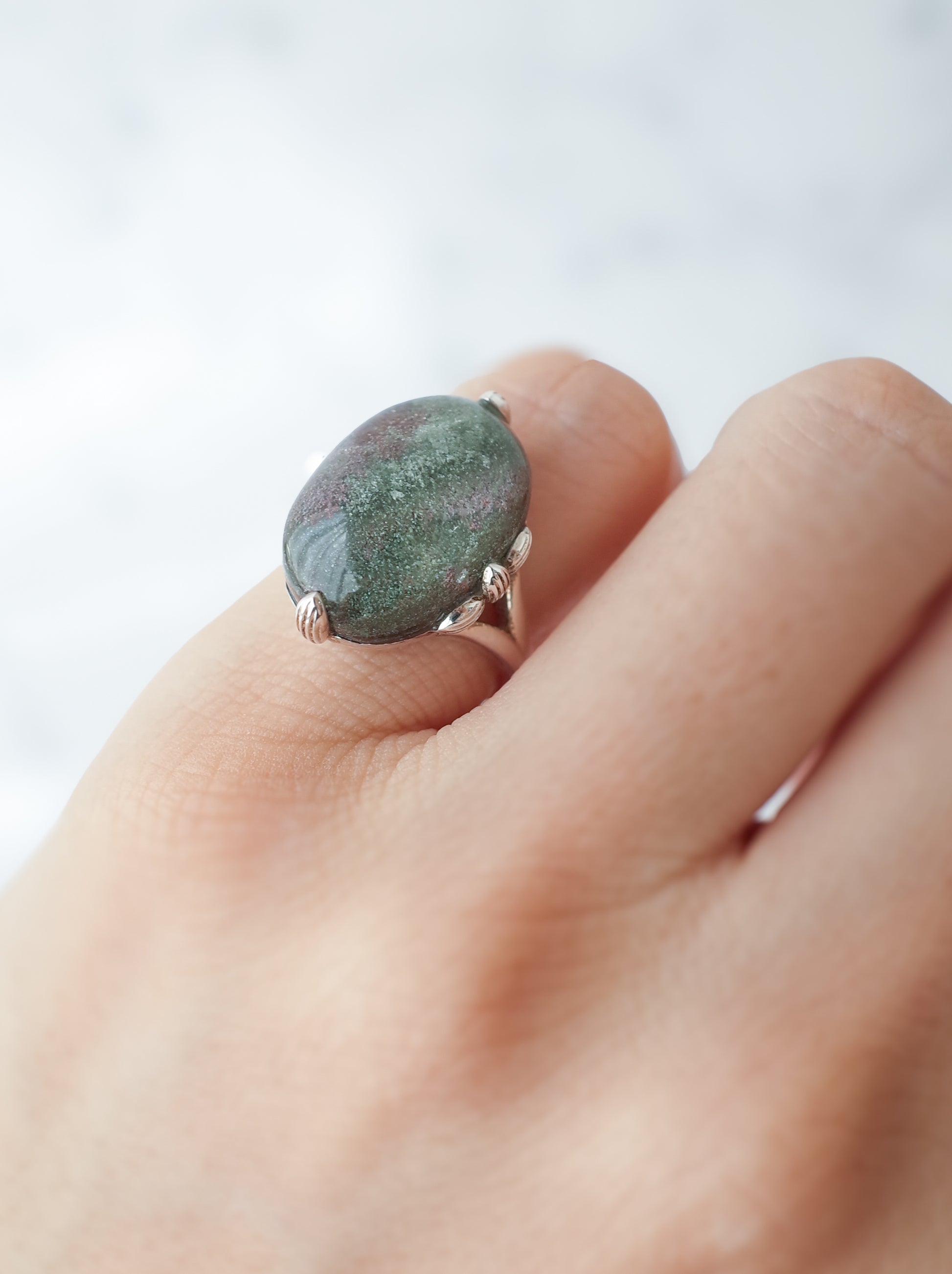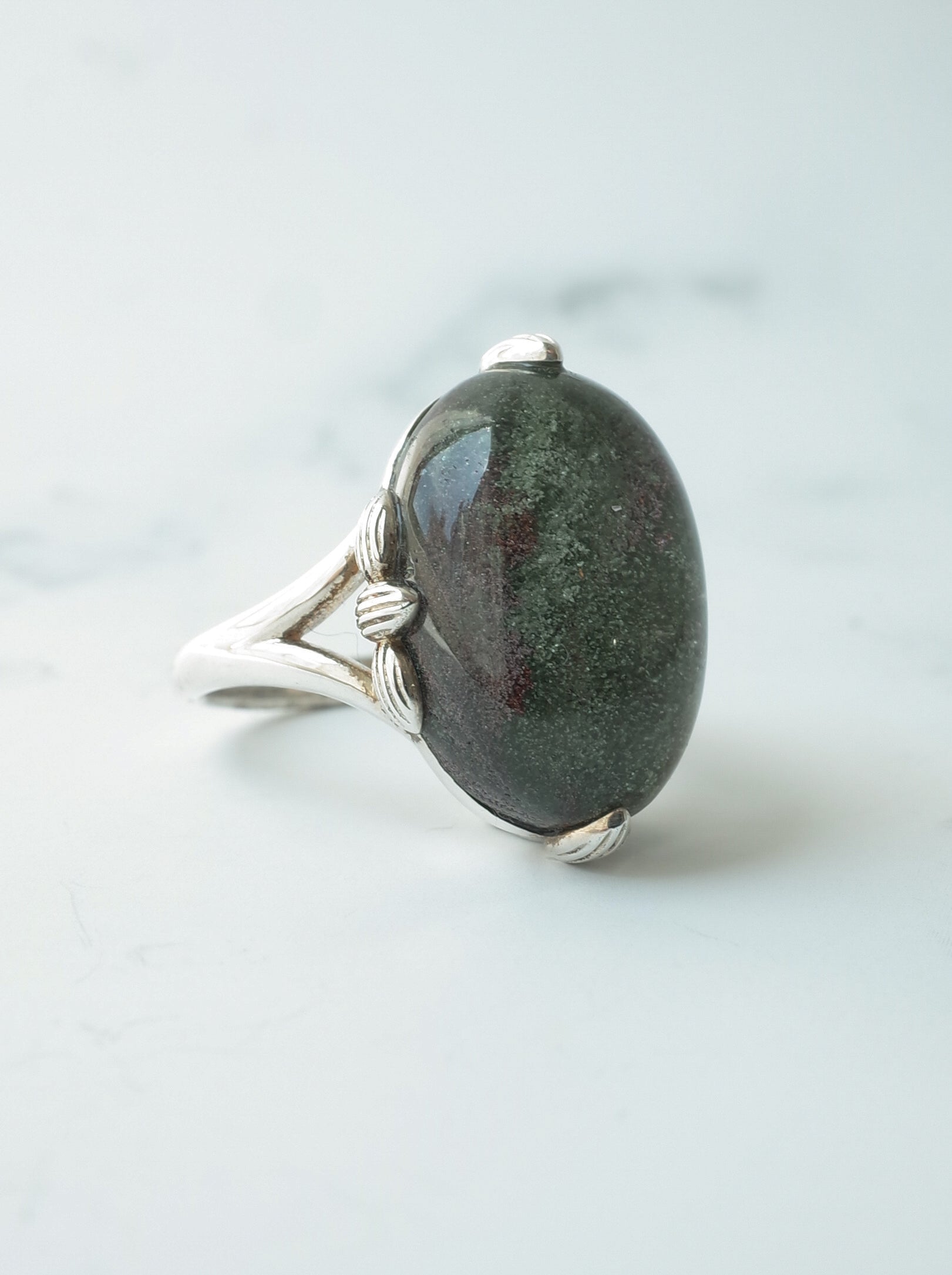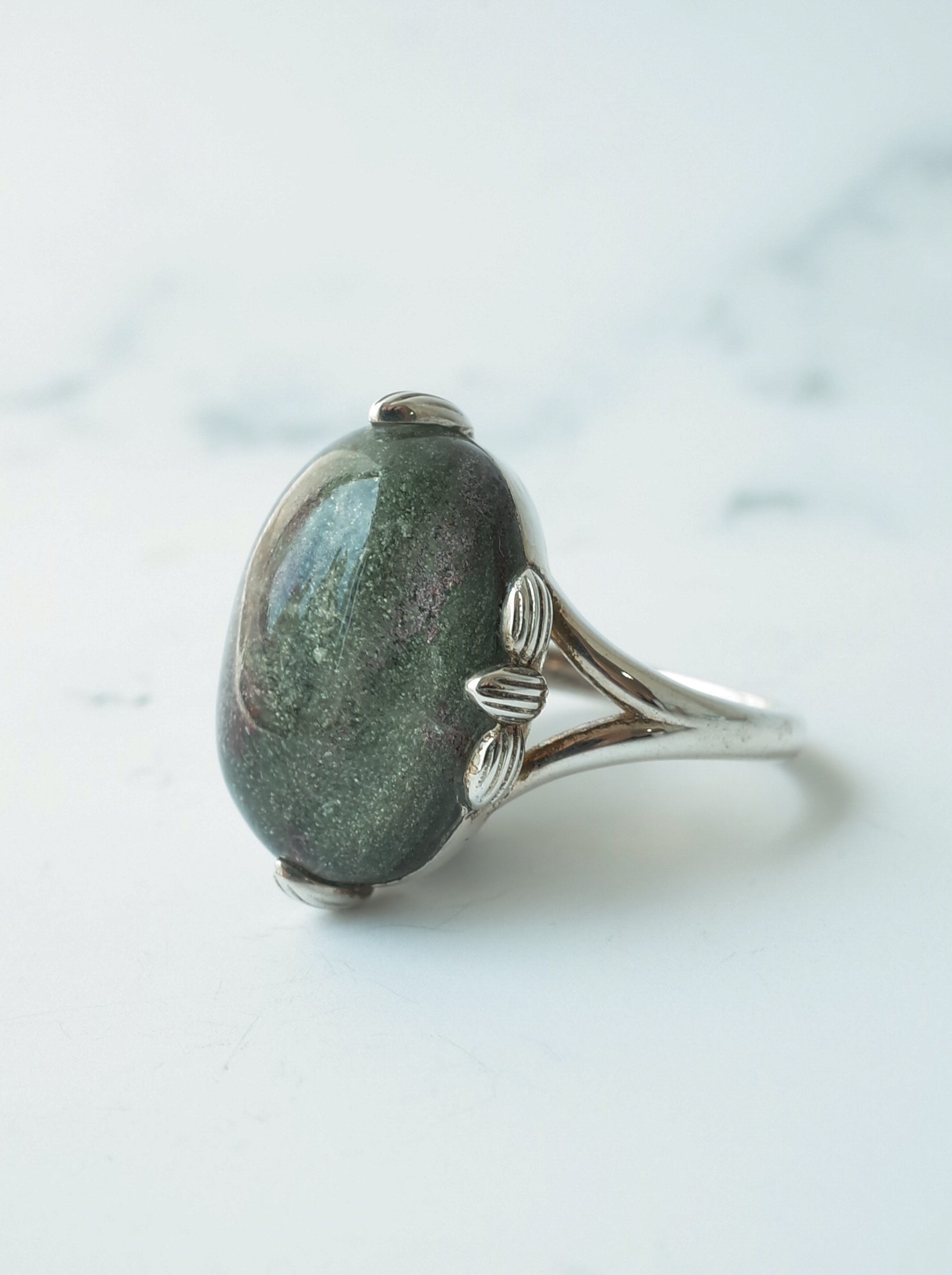 ナチュラルな雰囲気が魅力のガーデンクォーツを、蓮の花のデザインで包んだ「ロータスリング」。石を留める爪の部分が葉っぱの形になっていたり、石の景色をサイドからも楽しめるようになっています。シルバーの経年変化で葉の葉脈の模様がはっきりと出ると、より素敵な雰囲気の指輪になります。