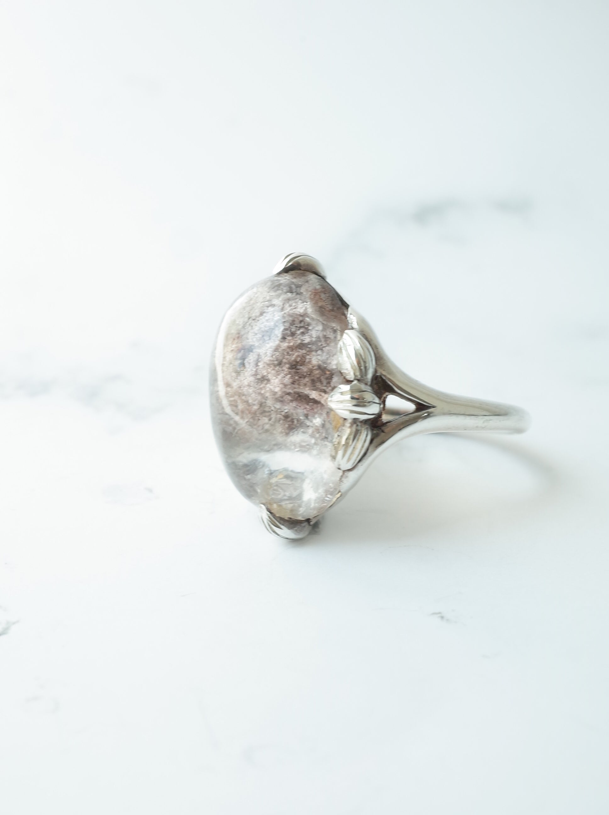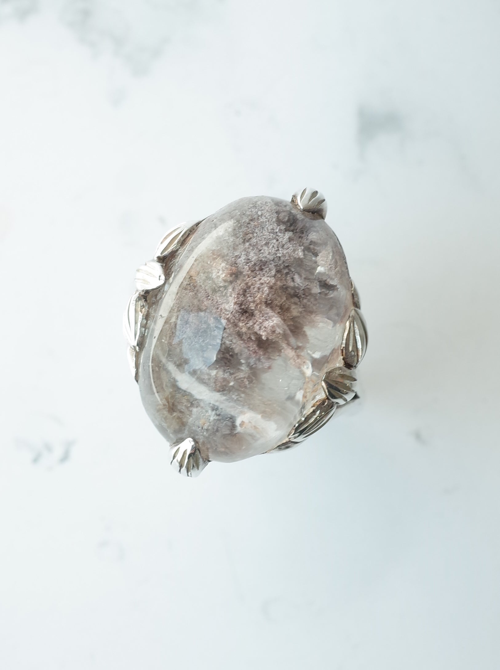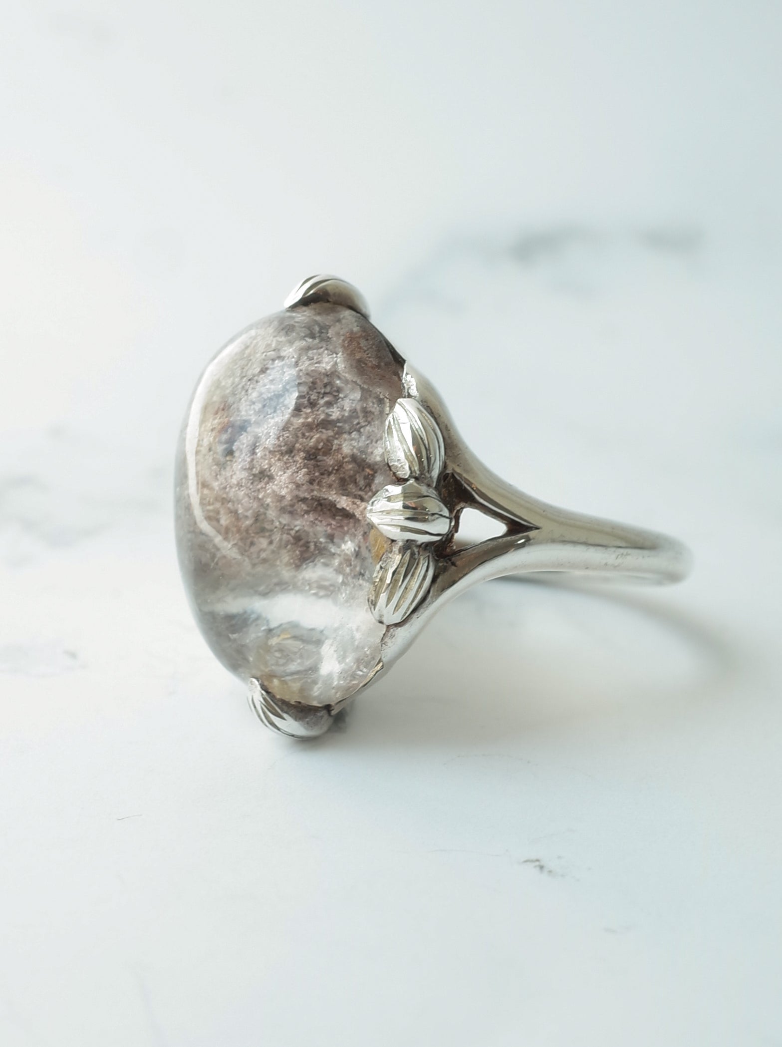 ナチュラルな雰囲気が魅力のガーデンクォーツを、蓮の花のデザインで包んだ「ロータスリング」。石を留める爪の部分が葉っぱの形になっていたり、石の景色をサイドからも楽しめるようになっています。シルバーの経年変化で葉の葉脈の模様がはっきりと出ると、より素敵な雰囲気の指輪になります。