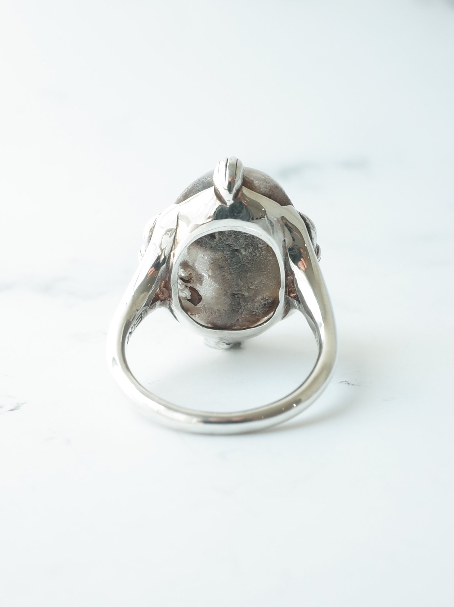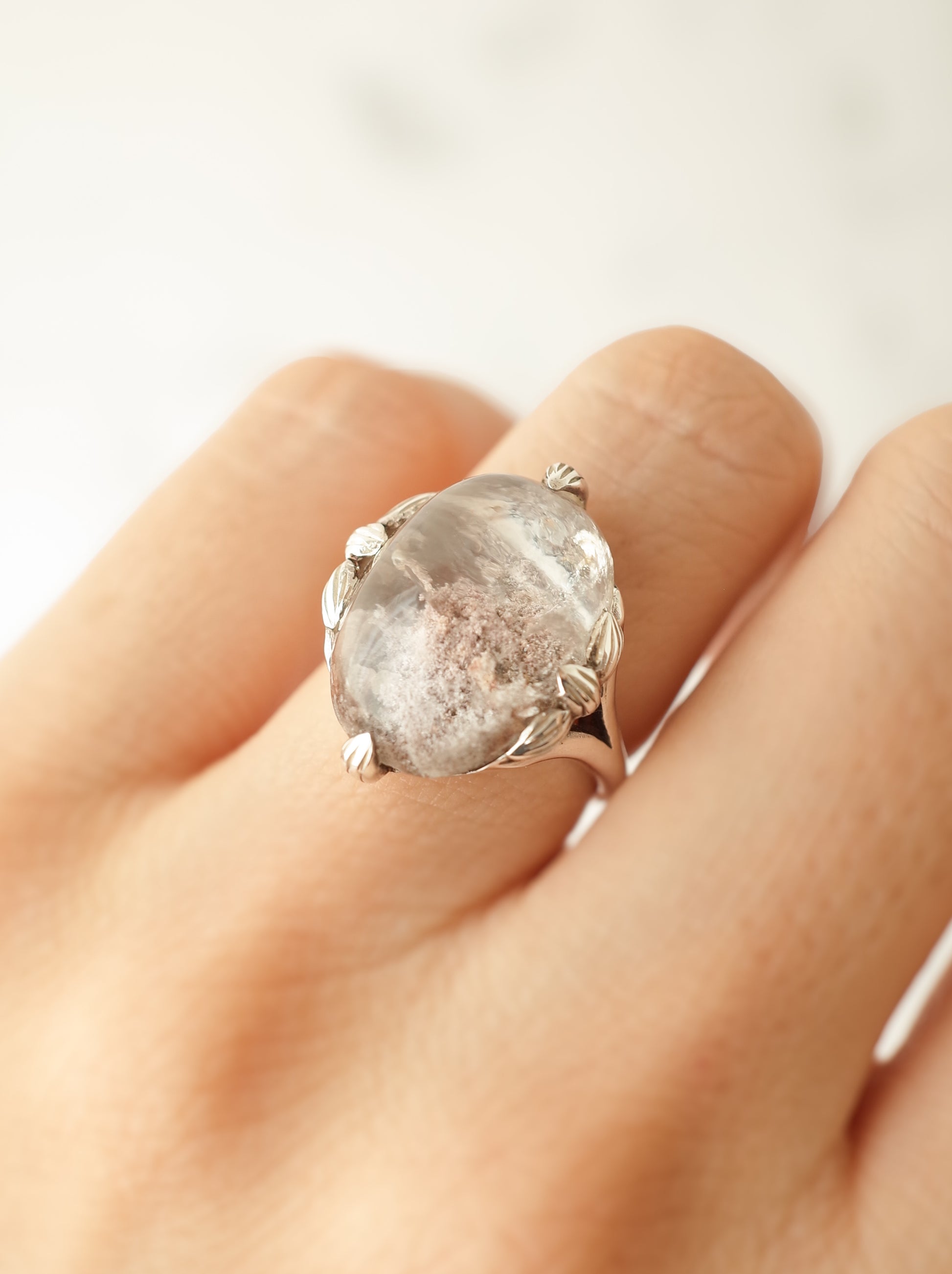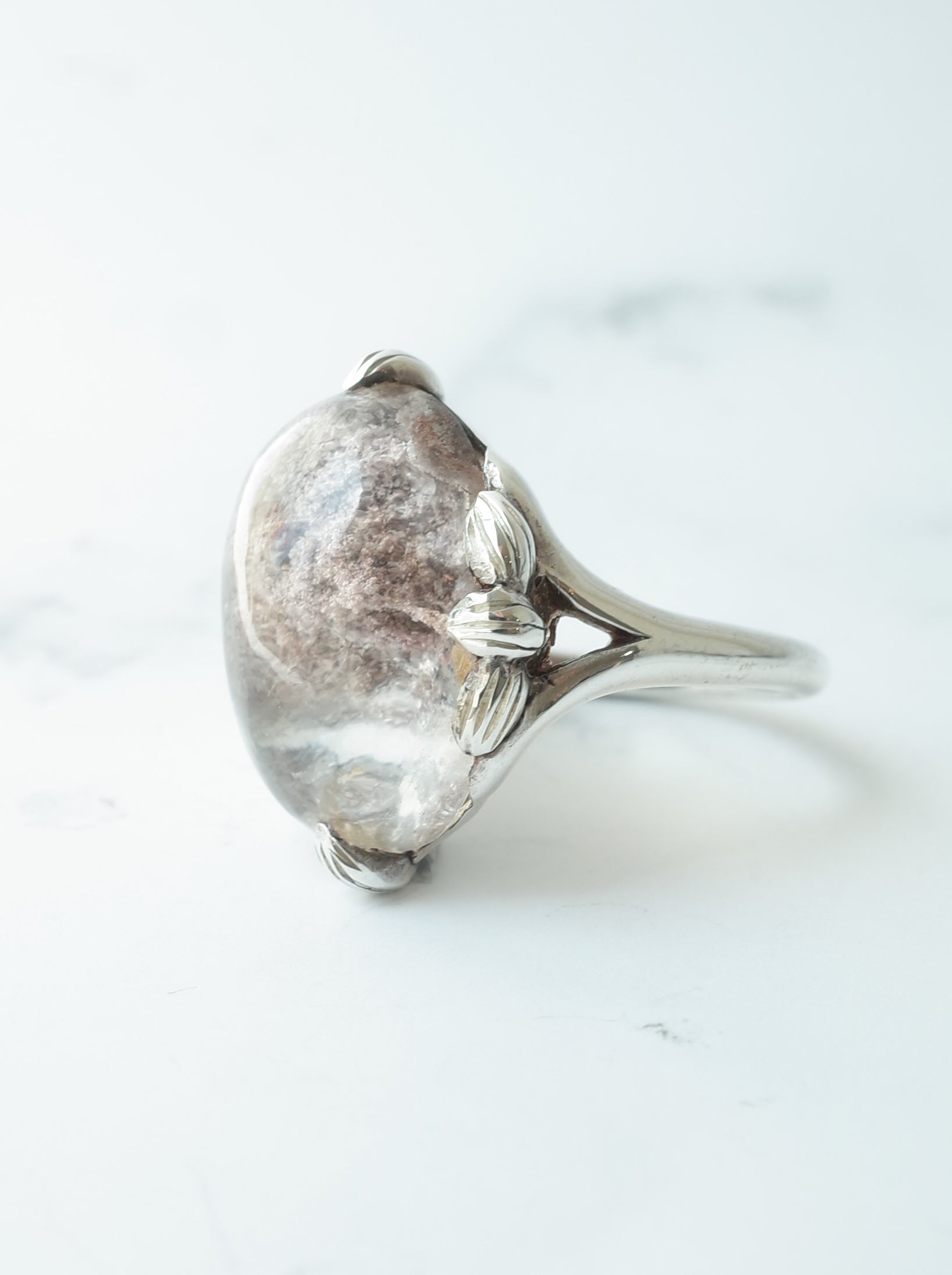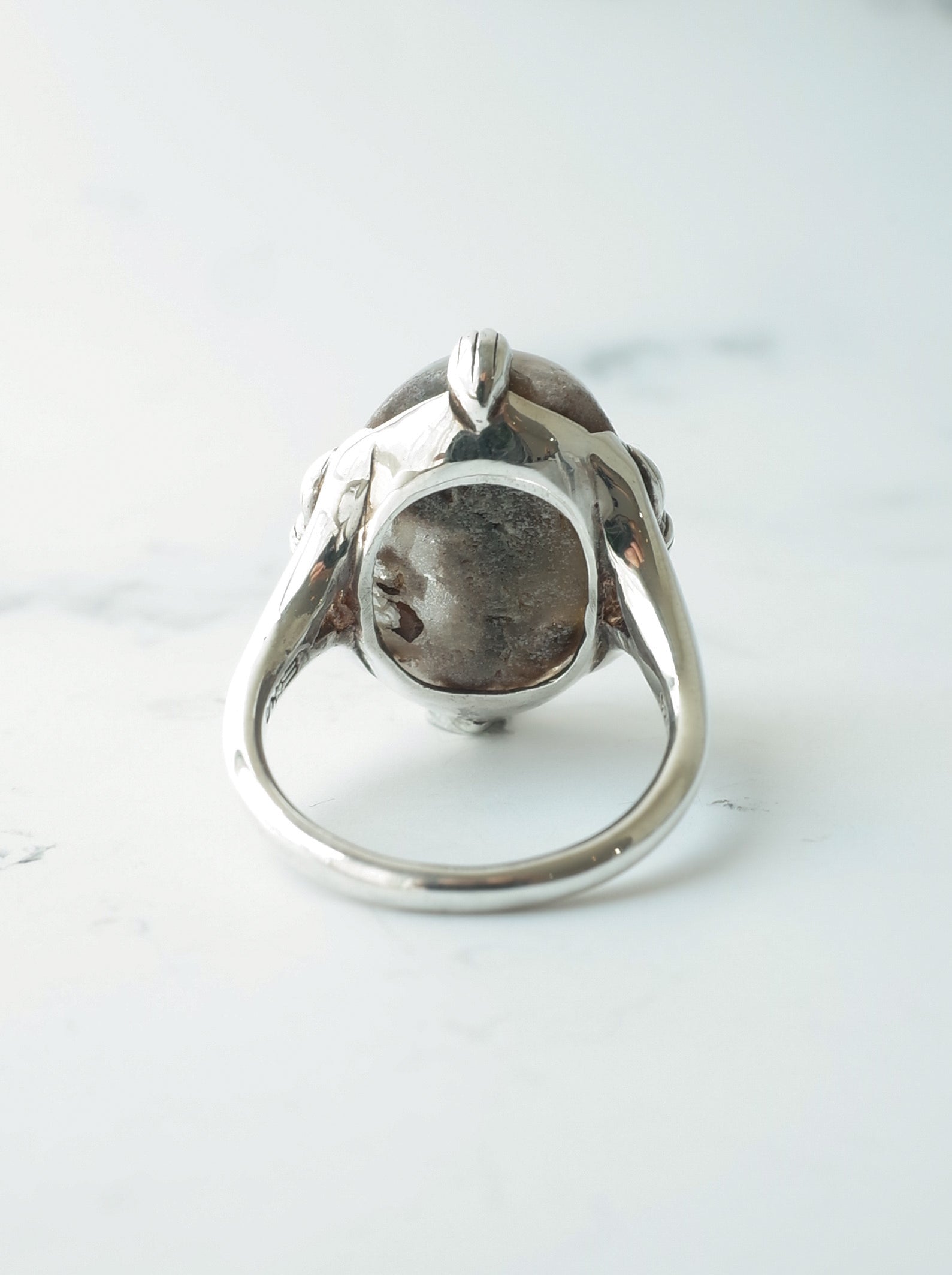 ナチュラルな雰囲気が魅力のガーデンクォーツを、蓮の花のデザインで包んだ「ロータスリング」。石を留める爪の部分が葉っぱの形になっていたり、石の景色をサイドからも楽しめるようになっています。シルバーの経年変化で葉の葉脈の模様がはっきりと出ると、より素敵な雰囲気の指輪になります。