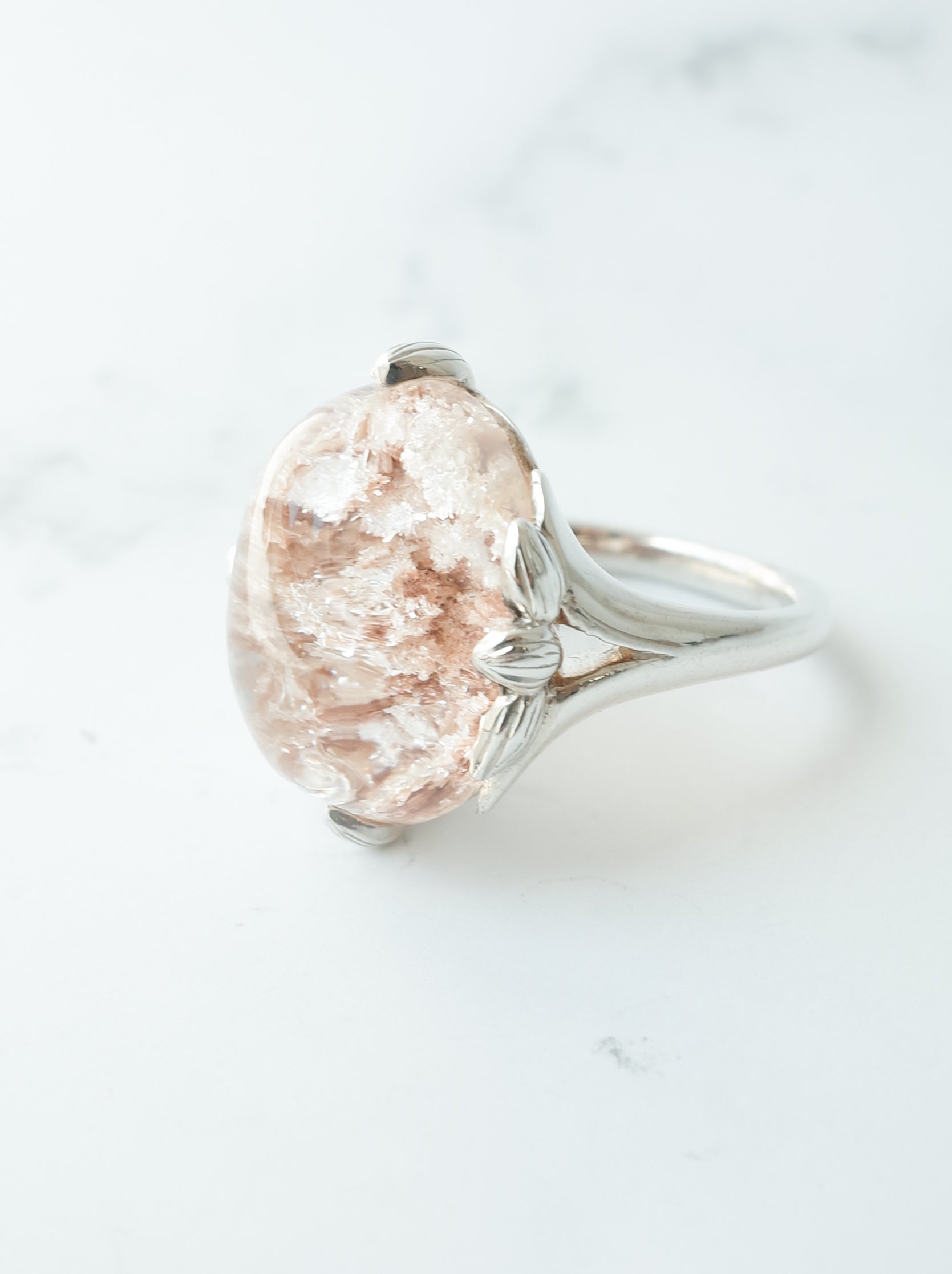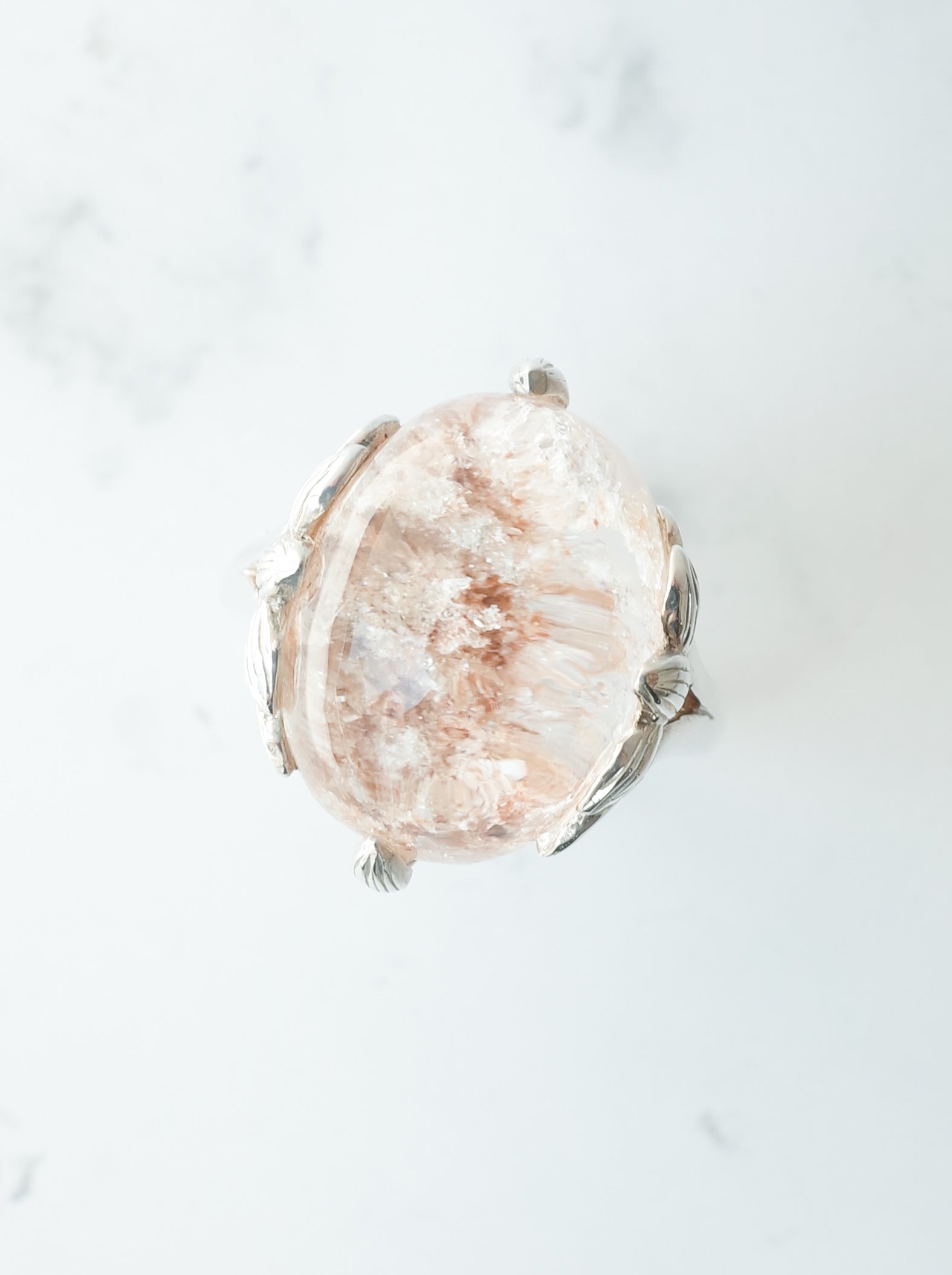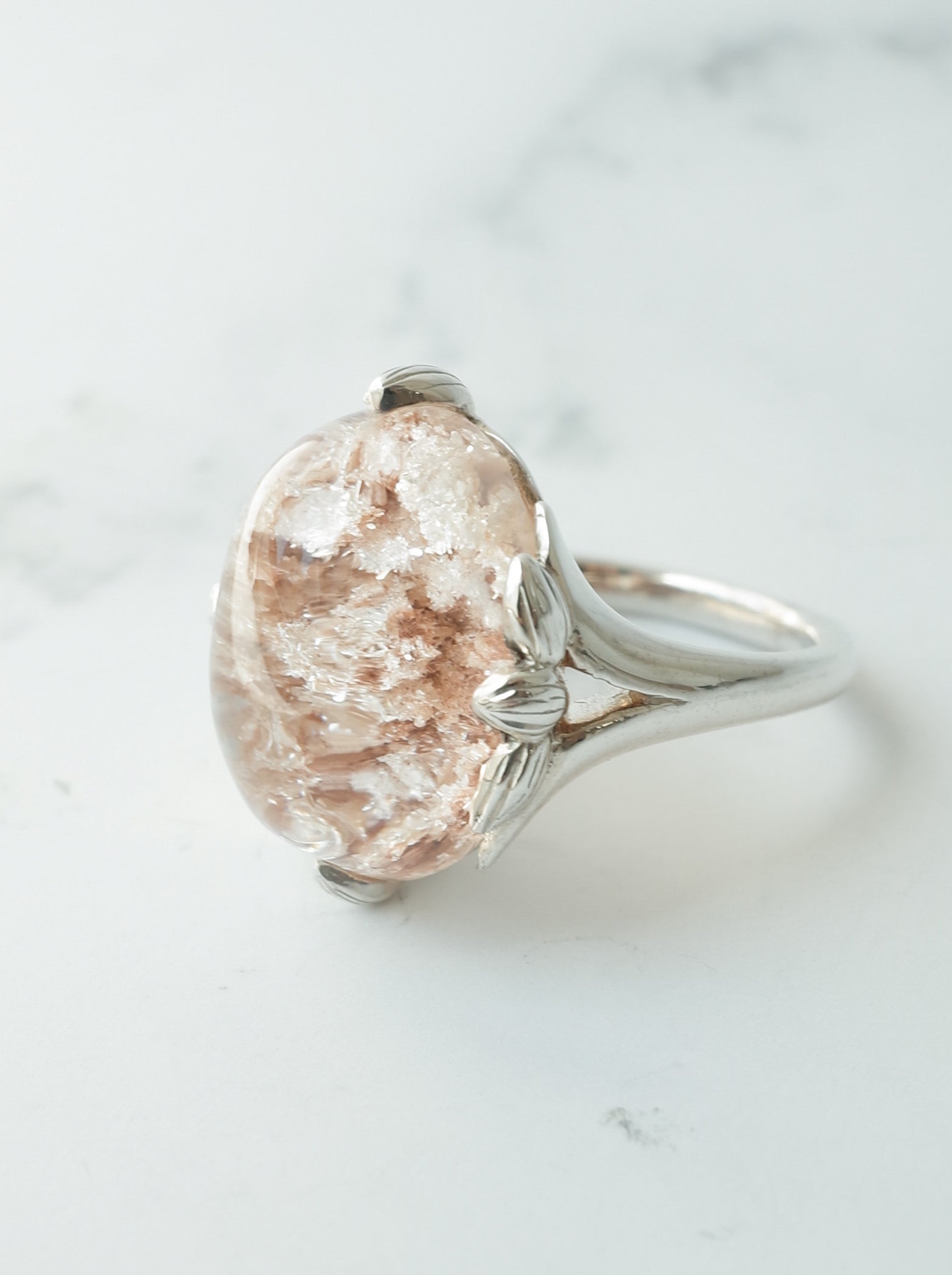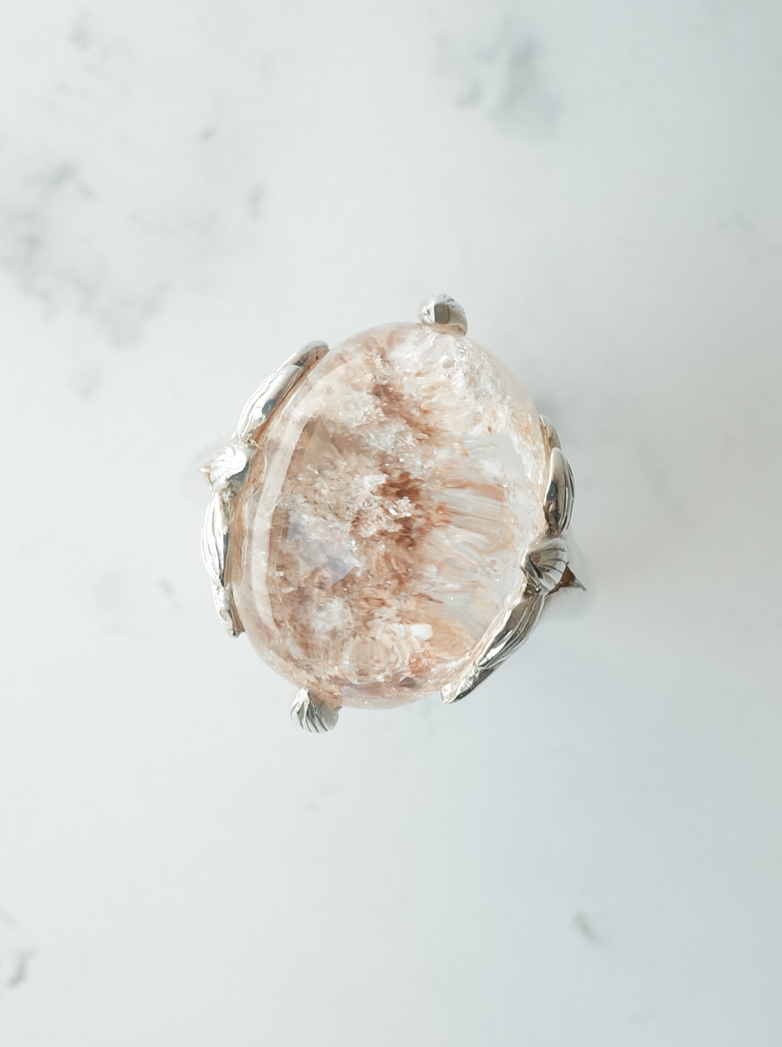 ナチュラルな雰囲気が魅力のガーデンクォーツを、蓮の花のデザインで包んだ「ロータスリング」。石を留める爪の部分が葉っぱの形になっていたり、石の景色をサイドからも楽しめるようになっています。シルバーの経年変化で葉の葉脈の模様がはっきりと出ると、より素敵な雰囲気の指輪になります。