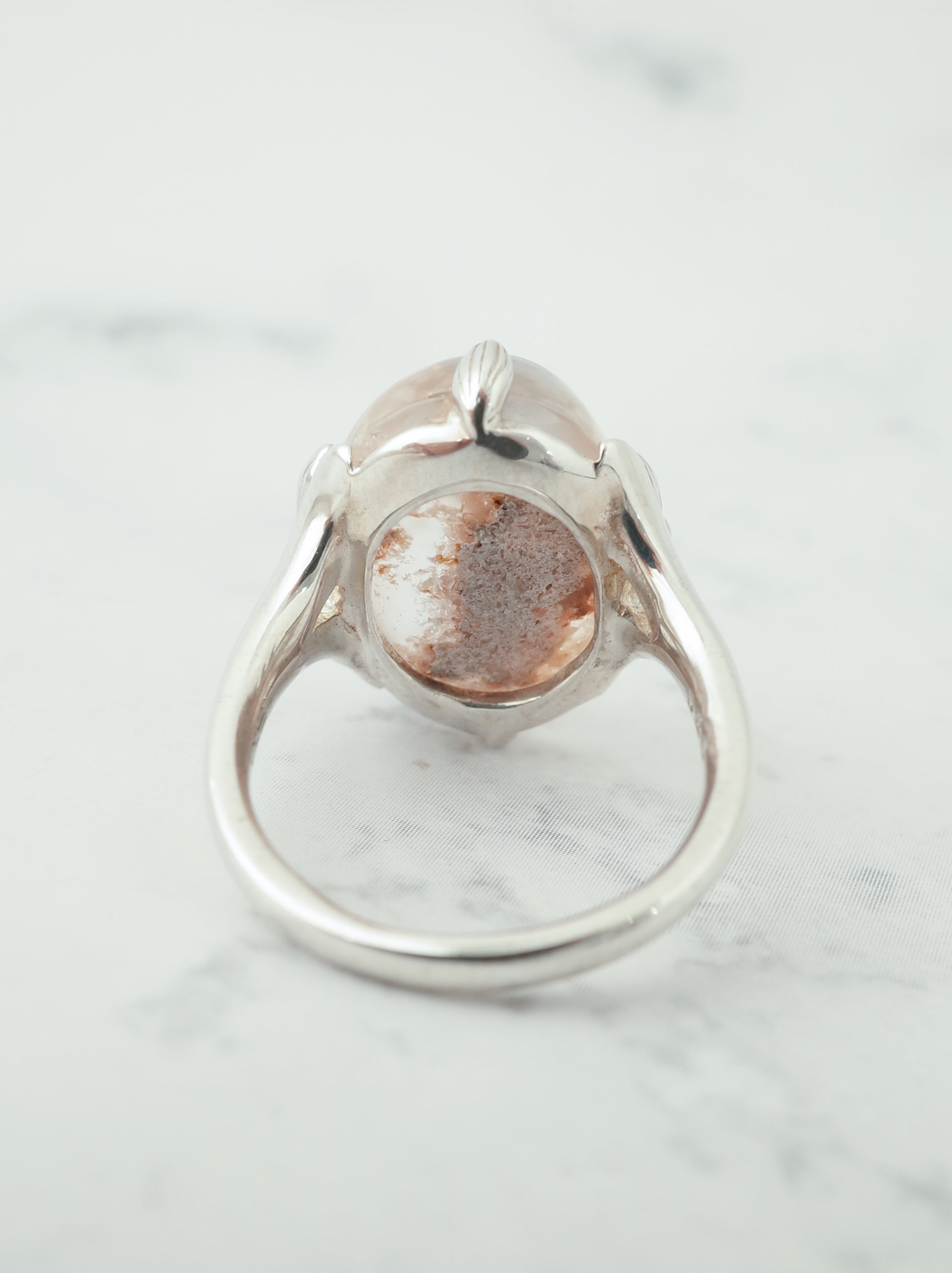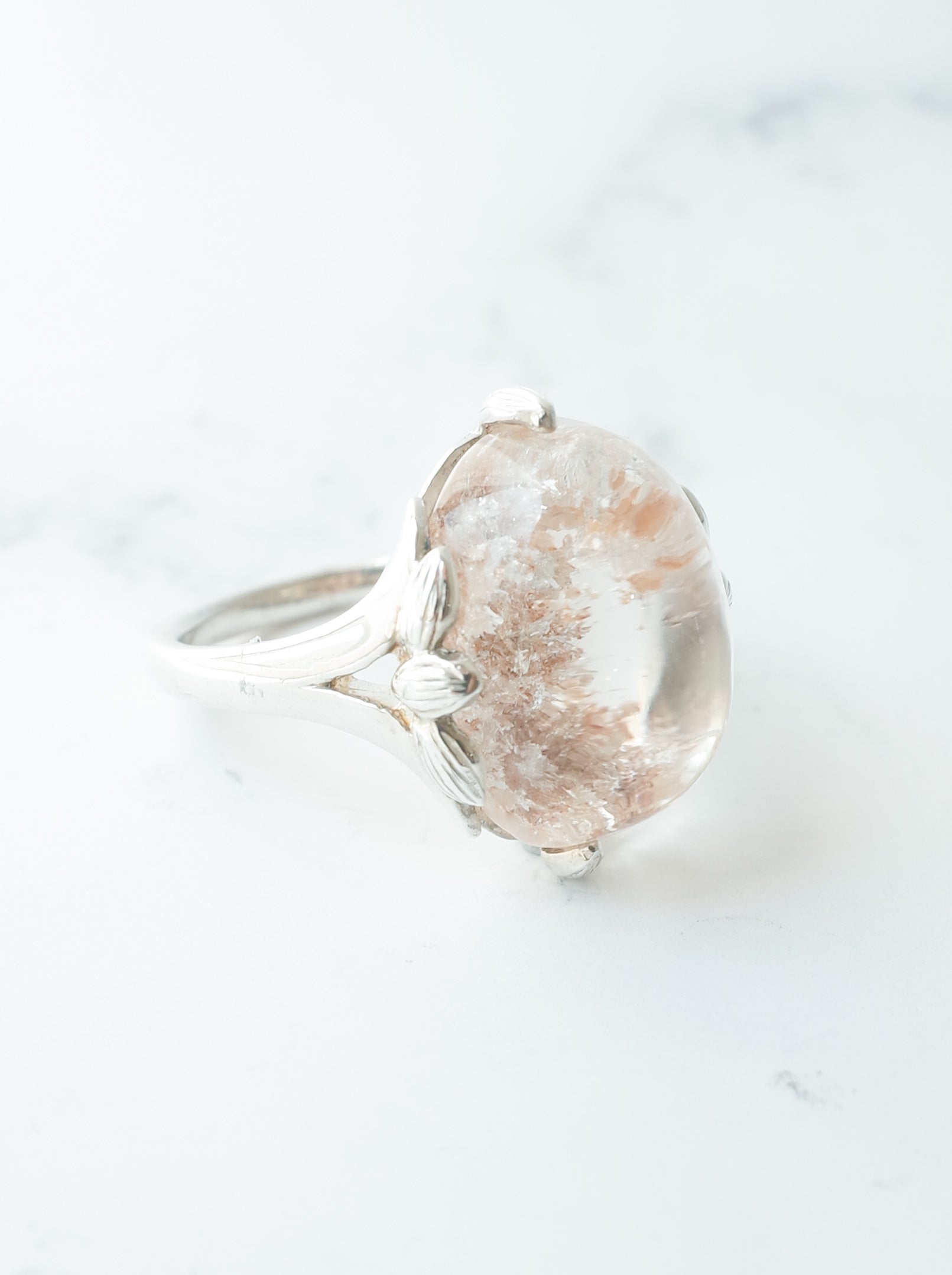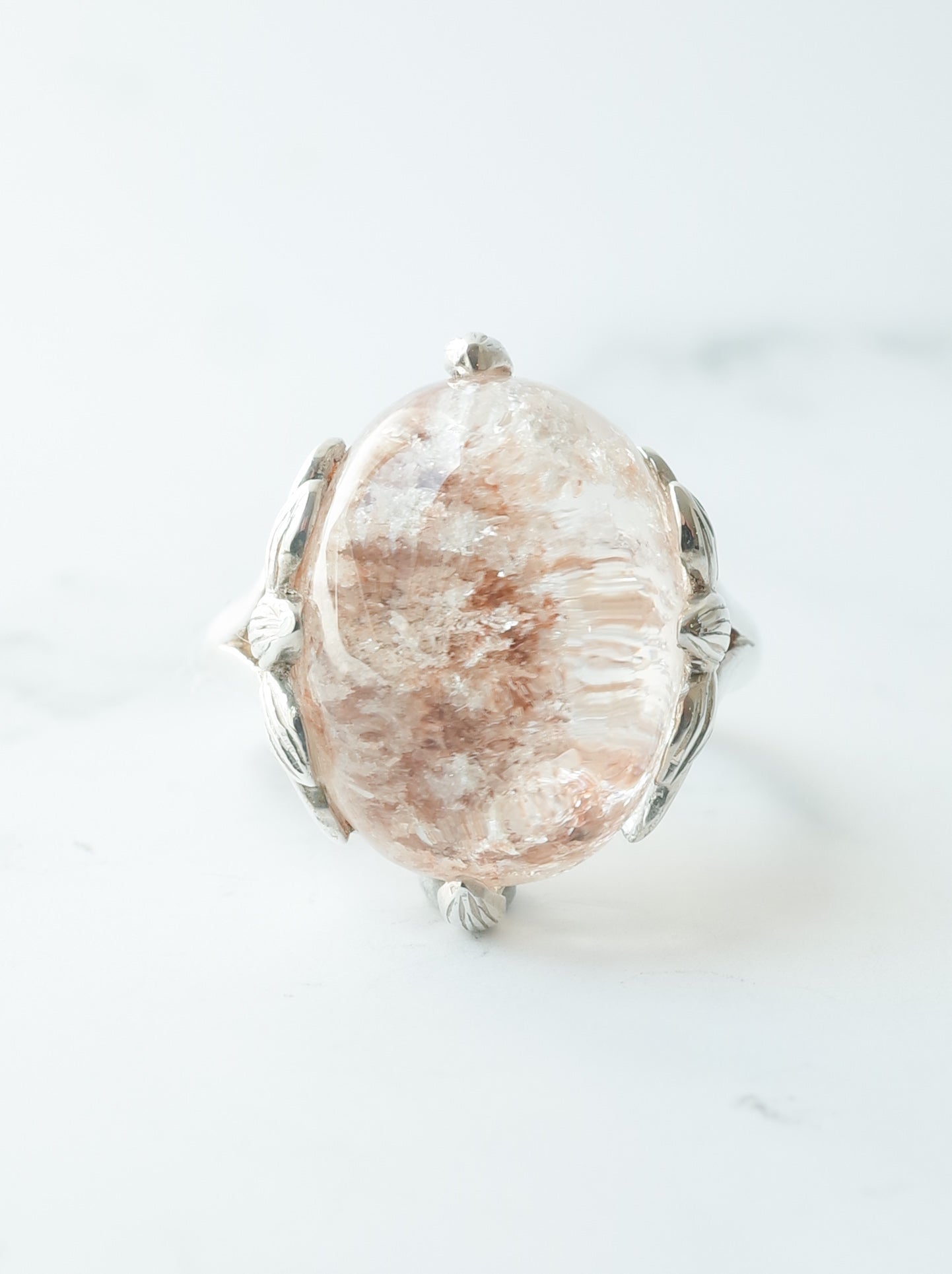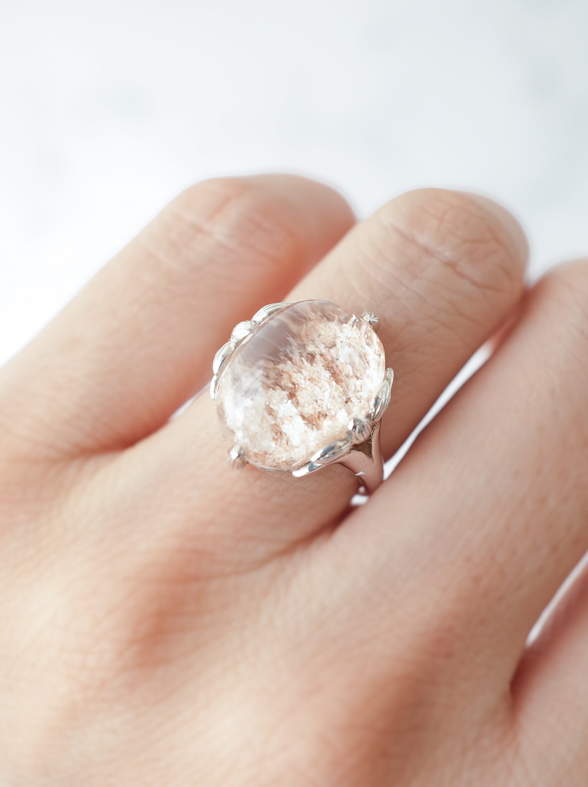ナチュラルな雰囲気が魅力のガーデンクォーツを、蓮の花のデザインで包んだ「ロータスリング」。石を留める爪の部分が葉っぱの形になっていたり、石の景色をサイドからも楽しめるようになっています。シルバーの経年変化で葉の葉脈の模様がはっきりと出ると、より素敵な雰囲気の指輪になります。